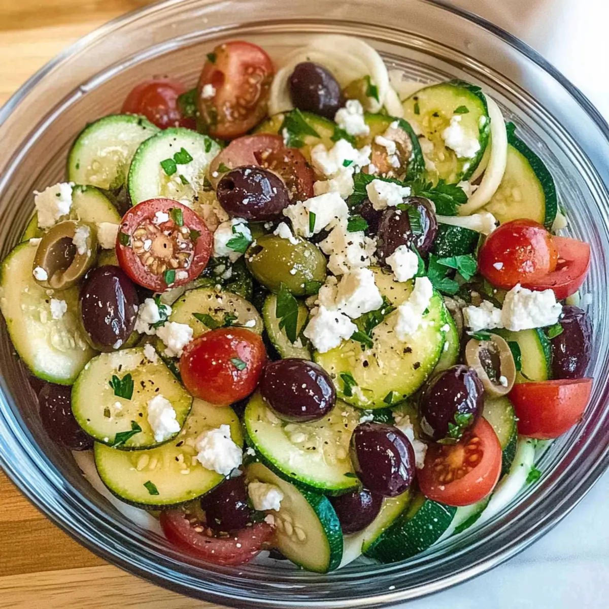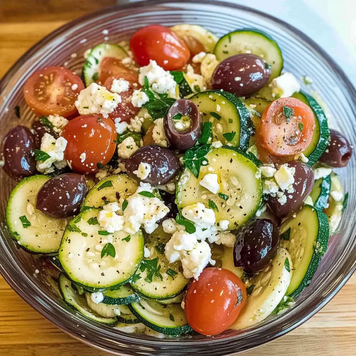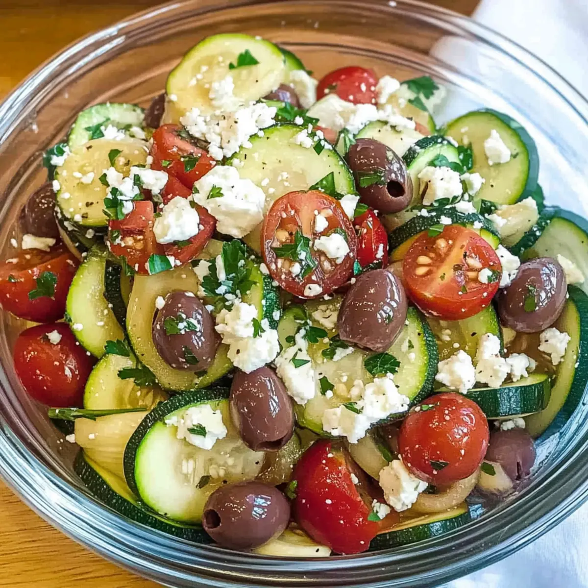 As I sliced the zucchini into delicate ribbons, the vibrant colors of fresh vegetables danced before my eyes, promising a delightful dish to be enjoyed. This Greek Zucchini Salad reimagines a classic favorite, creating a refreshing and gluten-free option that’s perfect for any occasion. Packed with the tangy goodness of feta, briny olives, and a zesty homemade dressing, this salad is a quick and easy way to elevate your summer gatherings or weeknight meals. It’s not just a feast for the eyes; it’s also an opportunity to indulge in wholesome ingredients that offer a healthy twist on traditional fare. Trust me, with its light crunch and explosive flavors, this salad will have everyone asking for seconds. Ready to dive into a bowl of vibrant goodness? Why is Greek Zucchini Salad a Must-Try? Refreshingly Unique: This Greek Zucchini Salad takes a classic dish and adds a delicious twist with tender zucchini ribbons, transforming the ordinary into the extraordinary. Vibrant Flavor Explosion: The combination of tangy feta, briny olives, and zesty dressing brings a burst of flavor that will excite your taste buds. Quick and Easy Preparation: With simple steps, you’ll whip up this colorful dish in no time—perfect for busy nights or impromptu gatherings! Versatile Delight: Enjoy it as a light lunch, a side dish for grilled meats, or even as a refreshing appetizer. The possibilities are endless! Don’t forget to check out other delicious options like Crab Salad Refreshing and Quinoa Crunch Salad for more flavorful creations! Greek Zucchini Salad Ingredients For the Salad • Zucchini – Base of the salad, providing a fresh, crunchy texture; use smaller, tender zucchini for best results. • Red Onion – Adds sharpness and flavor; substitute with green onions for a milder taste. • Cherry Tomatoes – Provide sweetness and juiciness; grape tomatoes or any favorite variety can be substituted. • Feta Cheese – Adds creaminess and a salty punch to the salad; crumbled goat cheese can be used as a non-dairy option. • Kalamata Olives – Introduce briny flavors that enhance the dish; black olives are a viable substitution. • Fresh Parsley – Offers a fresh aroma and color; substituting with basil or oregano can change the flavor profile. For the Dressing • Kosher Salt – Essential for sweating the zucchini to remove moisture. • Olive Oil – Provides richness and flavor in the dressing; high-quality extra virgin is recommended. • Apple Cider Vinegar – Contributes acidity and brightness to the dressing; white vinegar can also be a substitute. • Dried Oregano – Adds herby notes; fresh oregano can be used for a more vibrant flavor. • Ground Pepper – For seasoning; fresh cracked pepper will give a bolder taste. • Lemon Juice – Enhances freshness; lime juice can be used if preferred. Step‑by‑Step Instructions for Greek Zucchini Salad Step 1: Sweat Zucchini Using a mandoline or Y-peeler, carefully slice the zucchini into 1/16-inch ribbons for the Greek Zucchini Salad. Place the zucchini ribbons in a colander and sprinkle them generously with kosher salt. Let them sweat for at least 30 minutes, allowing the salt to draw out excess moisture. Afterward, pat the zucchini dry with paper towels and transfer them to a large mixing bowl. Step 2: Prepare Dressing In a Pyrex or mixing bowl, combine ¼ cup of olive oil, 2 tablespoons of apple cider vinegar, 1 teaspoon of dried oregano, a pinch of kosher salt, ground pepper, and the juice of half a lemon. Whisk these ingredients together until well emulsified, creating a zesty dressing. Give it a taste and adjust the seasoning to your preference, setting it aside for the flavors to meld. Step 3: Assemble Salad In the bowl with the dried zucchini ribbons, add finely sliced red onion, halved cherry tomatoes, crumbled feta cheese, and pitted Kalamata olives. Toss everything gently to combine the vibrant ingredients well. Ensure the colorful veggies are evenly distributed among the zucchini for a visually appealing Greek Zucchini Salad. Step 4: Dress and Serve Pour the prepared dressing over the salad mixture, ensuring all components are coated. Toss gently again to combine, and taste to see if additional salt or pepper is needed. For a finishing touch, garnish with freshly chopped parsley before serving. Enjoy this fresh Greek Zucchini Salad immediately for maximum crunch and flavor. Make Ahead Options Preparing your Greek Zucchini Salad ahead of time is a game-changer for busy weeknights! You can sweat the zucchini up to 24 hours in advance, which helps maintain its crunchiness. Simply slice the zucchini, sprinkle with kosher salt, and allow it to sweat as directed. Store the dried ribbons in an airtight container in the refrigerator. Additionally, prepare the dressing up to 3 days ahead and keep it in the fridge to let the flavors meld beautifully. Just before serving, combine the prepped zucchini with the sliced red onion, cherry tomatoes, feta, and olives, then drizzle with dressing and toss lightly to ensure every ingredient is coated. Enjoy this fresh and vibrant salad with minimal effort! What to Serve with Greek Zucchini Salad? Elevate your meal with delightful pairings that beautifully complement the flavors in this fresh, vibrant salad. Grilled Chicken: Juicy, seasoned chicken adds a satisfying protein source while enhancing the Mediterranean theme of the meal. Lemon Herb Quinoa: Fluffy quinoa infused with lemon and herbs creates a wholesome texture contrast and will soak up the bright flavors. Stuffed Bell Peppers: The savory, cheesy filling of stuffed peppers provides a hearty option that pairs well with the lightness of the salad. Pita Bread with Hummus: Soft pita served with creamy hummus offers a delightful, fresh dip that rounds out this Mediterranean platter perfectly. Roasted Vegetables: Seasoned and caramelized vegetables add a warm, earthy element to your meal, balancing the freshness of the Greek Zucchini Sala