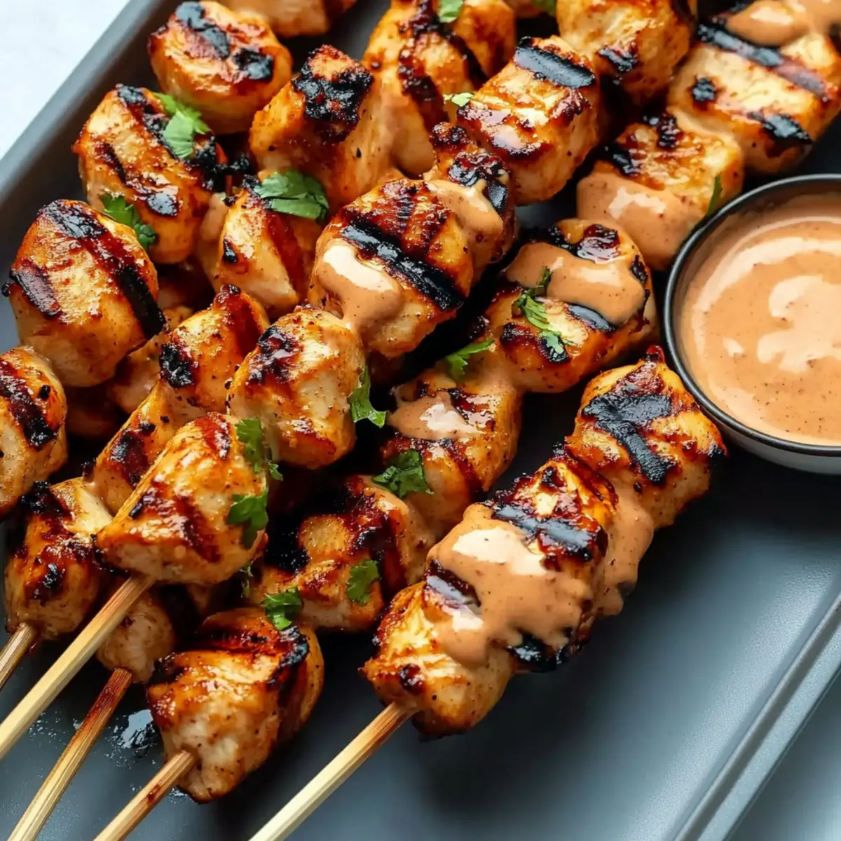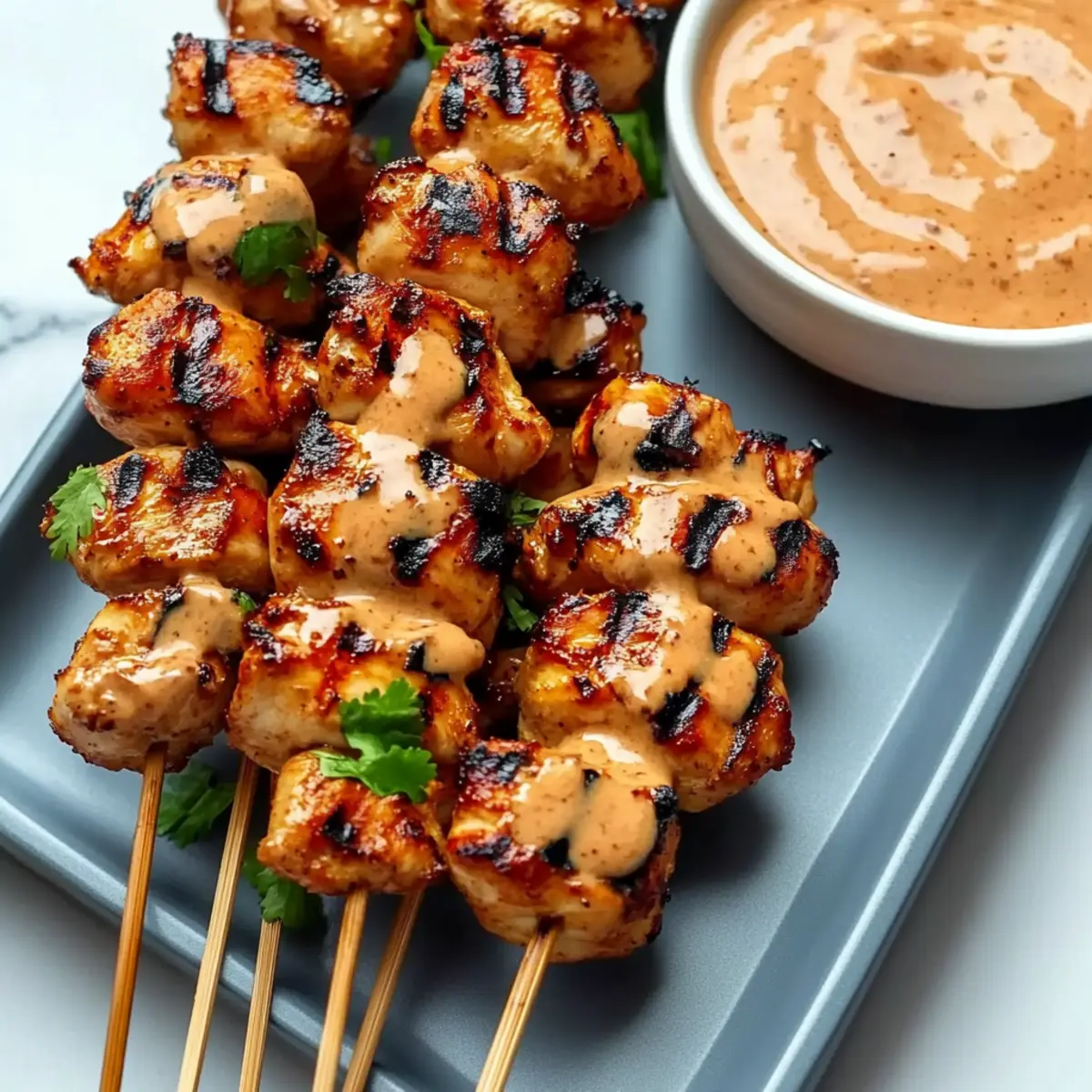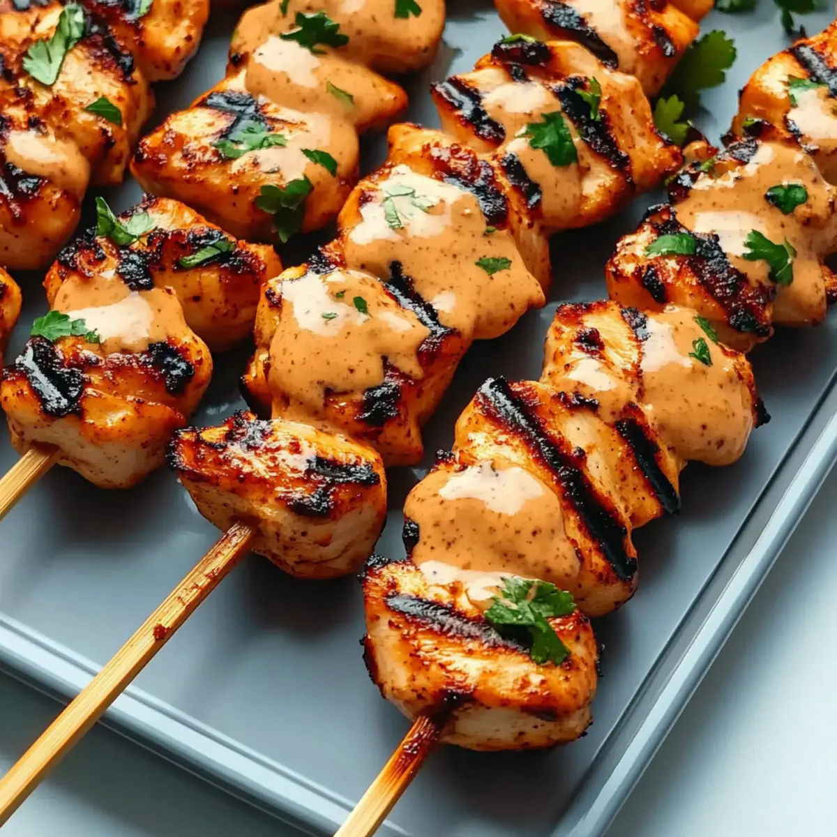 As I stood in my kitchen, the tantalizing aroma of marinated chicken wafted through the air, igniting my excitement for the evening’s feast. Today, I’m sharing my easy Grilled Bang Bang Chicken Skewers—a perfect recipe that balances spicy and sweet, making it a go-to for both casual family dinners and lively backyard barbecues. The best part? Not only are these skewers a joy to prepare, but they also please a wide range of palates! Whether you prefer chicken breasts for their lean tenderness or opt for juicy thighs for extra richness, this dish caters to your cravings. Plus, they’re quick enough to whip up on a busy weeknight yet stunning enough to impress guests at your next gathering. Are you ready to uncover the secret behind this crowd-pleasing delight? Why are these skewers a must-try? Flavorful Explosion: The delightful blend of spices in the marinade elevates simple chicken to gourmet status! Quick to Prepare: Whip these up in under 30 minutes—perfect for busy nights when you crave something extraordinary. Customizable Options: Feel free to swap in chicken thighs or even add colorful veggies like bell peppers to your skewers for a vibrant twist! Impressive Presentation: Grilled to perfection, these skewers not only taste amazing but also look beautiful on any platter, making them a guaranteed hit at gatherings. Versatile Pairings: They shine alongside coconut rice or a refreshing cucumber salad, so you can tailor your meal to suit any occasion. Dive deeper into homemade delights with Bang Bang Chicken for a variation everyone will love! Grilled Bang Bang Chicken Skewers Ingredients • Get ready to create flavor magic! For the Skewers Chicken Breasts or Thighs – Choose boneless, skinless cuts for even cooking; thighs offer a richer flavor. Smoked Paprika – This spice brings a delightful smokiness that enhances the chicken’s taste. Garlic Powder – A great option for ease, but fresh minced garlic can elevate the flavor. Onion Powder – This ingredient boosts the overall flavor profile for a savory kick. Salt – Essential for seasoning; it helps bring out all the other wonderful flavors. Black Pepper – Adds a bit of warmth and complements the sweetness of the Bang Bang sauce. For the Bang Bang Sauce Mayonnaise – Acts as the creamy base; you can swap for Greek yogurt for a lighter version. Sriracha – A must for that spicy kick; adjust according to your heat preference! Sweet Chili Sauce – Provides a sweet balance that enhances the overall sauce flavor. Honey – Adds a touch of sweetness to balance the heat perfectly. Lime Juice – Brightens the sauce and adds a zesty freshness to the mix. These Grilled Bang Bang Chicken Skewers will be the star of your next meal! Step‑by‑Step Instructions for Grilled Bang Bang Chicken Skewers Step 1: Marinate the Chicken Start by cutting your boneless, skinless chicken into 1-inch cubes. In a medium bowl, combine smoked paprika, garlic powder, onion powder, salt, black pepper, and half of the Bang Bang sauce. Add the chicken to the marinade and toss gently until well coated. Allow the chicken to marinate for at least 30 minutes at room temperature or up to 2 hours in the refrigerator for enhanced flavor. Step 2: Prepare the Skewers While the chicken marinates, soak wooden skewers in water for 20-30 minutes to prevent burning on the grill. This is an important step to ensure your skewers stay intact during cooking. Once soaked, drain and pat dry the skewers, readying them for threading the seasoned chicken pieces, keeping in mind that this will help achieve the perfect Grilled Bang Bang Chicken Skewers. Step 3: Assemble the Skewers After marinating, take the chicken and thread the cubes onto the soaked skewers, spacing them about an inch apart for even cooking. Aim for about 5-6 pieces per skewer, depending on their size. This spacing allows hot air to circulate around the chicken, promoting even grilling and enhancing those delicious flavors in your Grilled Bang Bang Chicken Skewers. Step 4: Preheat the Grill Preheat your grill to high heat, around 400-450°F (200-230°C). While the grill heats, brush the grates with oil to prevent sticking. A well-preheated grill will help achieve those beautiful char marks and lock in the juices, making your Grilled Bang Bang Chicken Skewers irresistibly tasty when they hit the flames. Step 5: Grill the Skewers Place the assembled skewers on the hot grill and cook for 3-4 minutes per side. Watch for a golden brown exterior and ensure the internal temperature reaches 165°F (74°C). Turn the skewers as needed to promote even cooking and a delightful char on all sides. This grilling step is essential to achieving the perfect balance of flavor and texture in your skewers. Step 6: Rest and Serve Once grilled to perfection, carefully remove the skewers from the grill and let them rest for 5 minutes. This step allows the juices to redistribute throughout the chicken, ensuring a moist bite. Before serving, brush the skewers with the reserved Bang Bang sauce for an extra layer of flavor on your Grilled Bang Bang Chicken Skewers, then enjoy with your favorite sides! What to Serve with Easy Grilled Bang Bang Chicken Skewers As you prepare to savor the spicy-sweet explosion of flavors from your skewers, imagine delightful side dishes that will elevate your meal even further. Coconut Rice: This creamy, subtly sweet rice offers a lovely contrast to the spicy chicken, creating a harmonious dining experience. Cucumber Salad: A refreshing and crunchy take, this salad cools the palate and adds a burst of brightness to your plate. Toss in some mint for an extra fresh note! Asian Coleslaw: Crunchy, tangy, and slightly sweet, this vibrant slaw complements the skewers beautifully while adding a satisfying texture. Roasted Vegetables: Caramelized veggies like bell peppers and zucchini bring depth and color to your meal. The slight sweetness enhances the flavors of the chicken skewers. Grilled Corn on the