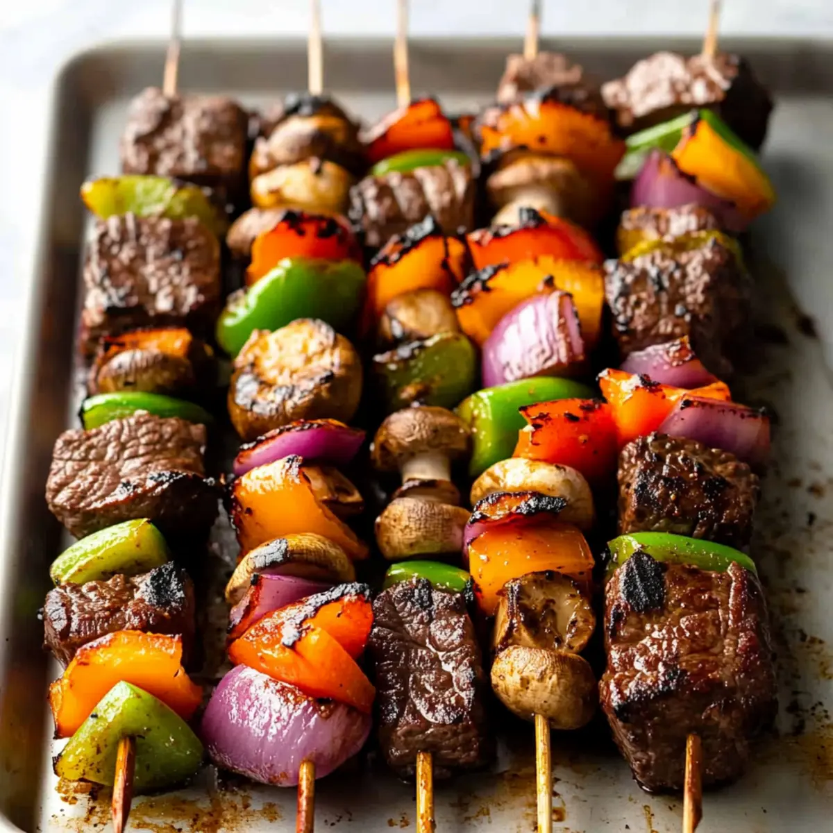 • Even Sizing: Cut the meat and vegetables into uniform sizes (around 1½ inches) to ensure they cook evenly on the grill.