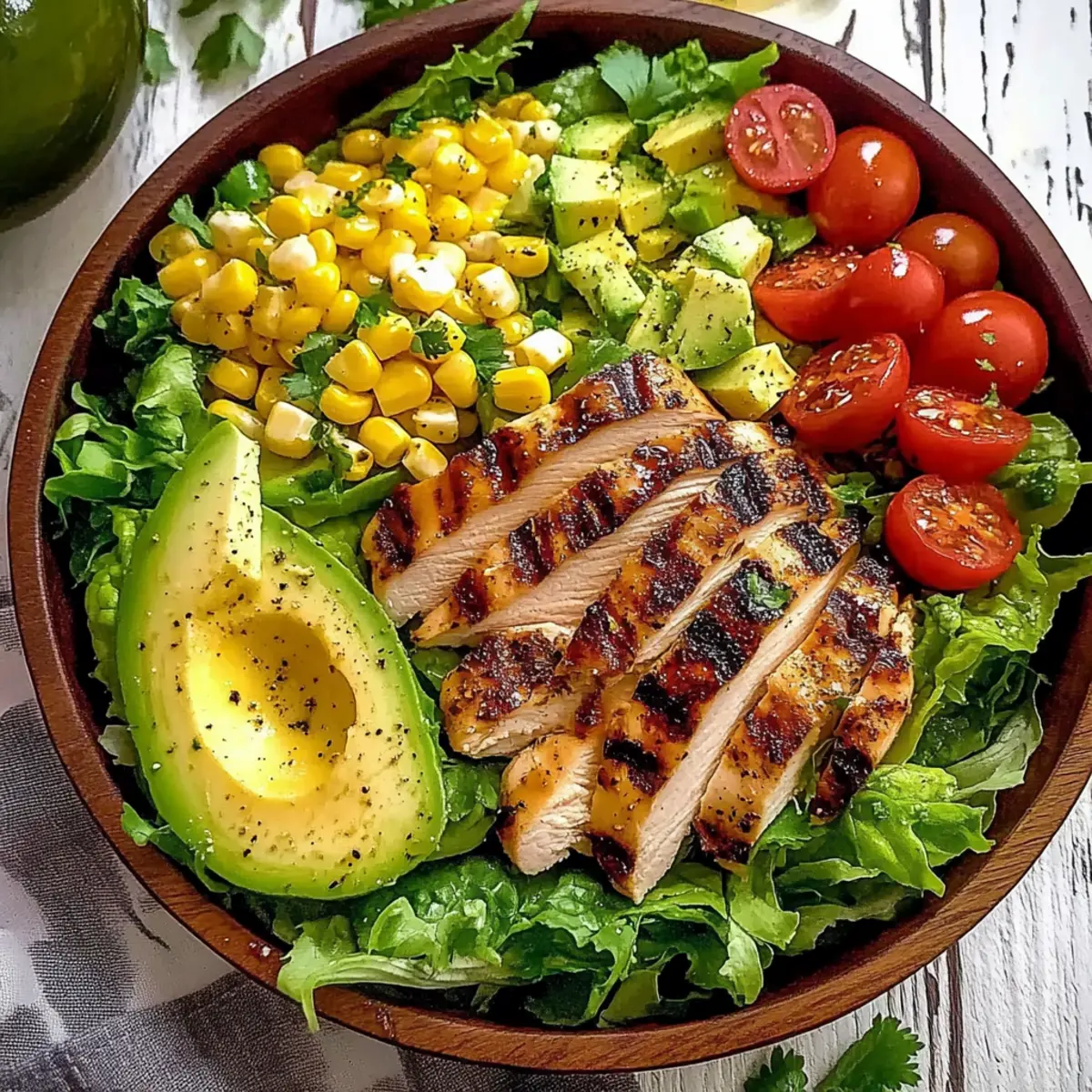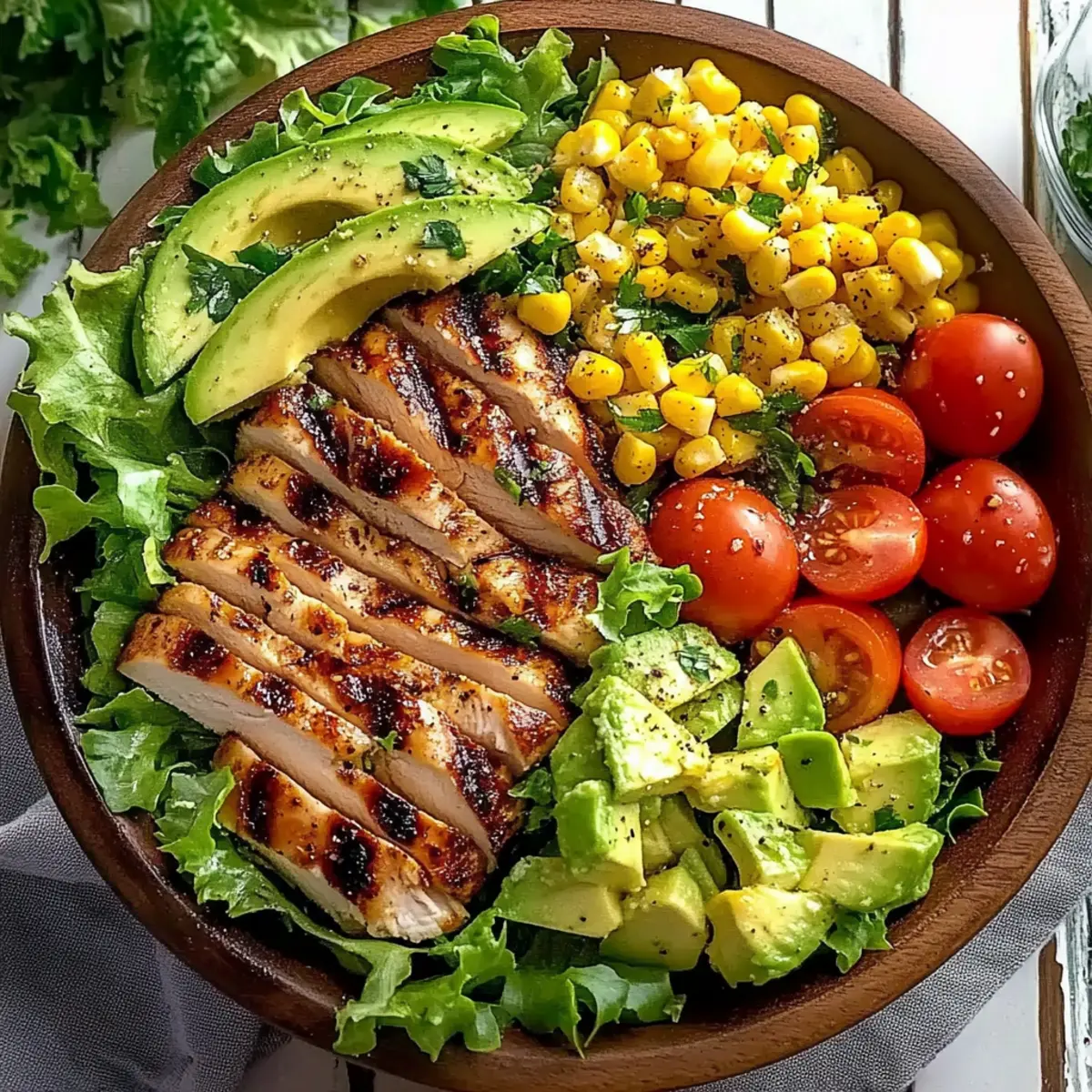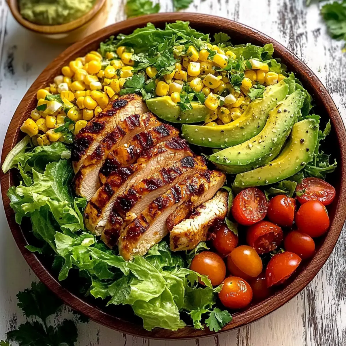 As I sliced into the warm, juicy grilled chicken, the tantalizing aroma wafted through my kitchen, instantly transporting me to a sun-soaked summer picnic. This Grilled Chicken Salad with Avocado and Corn is the embodiment of fresh, vibrant flavors that effortlessly meld together, making it ideal for those busy evenings when you still want something healthy and satisfying. Not only is it a high-protein delight, but it also requires minimal prep time, allowing you to enjoy more moments at the table and less time in the kitchen. Every bite is packed with texture—crisp romaine, luscious avocado, and the sweet crunch of grilled corn—that will have everyone coming back for seconds. Ready to discover just how easy it is to whip up this colorful summer salad? Why is Grilled Chicken Salad a Must-Try? Freshness Galore: This grilled chicken salad bursts with vibrant ingredients, making each bite feel like a sunny summer day. Quick Preparation: With minimal cook time, you can be enjoying this healthful meal in no time—perfect for those busy weeknights! Customizable Delight: Feel free to mix in your favorite veggies like bell peppers or swap in black beans, ensuring everyone’s taste buds are satisfied. High-Protein Meal: Featuring tender grilled chicken, this dish delivers the protein punch you need without feeling heavy. Perfect Pairings: Serve it alongside a slice of Garlic Bread Grilled for a comforting yet fresh feast. Crowd-Pleaser: Whether it’s a family dinner or a gathering of friends, this salad is sure to impress and keep everyone coming back for more! Grilled Chicken Salad Ingredients • Dive into the essentials for a delicious summer delight! For the Protein Chicken Breast or Thighs – Use boneless, skinless cuts for easy prep; thighs stay juicy even if slightly overcooked. For the Veggies Corn (2 ears) – Grilling enhances sweetness and flavor; frozen corn can be a quick substitute if needed. Avocado (1 large) – Offers creaminess; cut last to avoid browning, or opt for nuts for a crunchy twist. Romaine Lettuce (5 cups) – The crisp base for this salad; any hearty lettuce works, but add dressing just before serving to prevent sogginess. Cherry Tomatoes (2 cups) – Halved for a burst of juiciness; substitute with diced regular tomatoes if preferred. Red Onion (1/2 cup, thinly sliced) – Adds sharpness; can be swapped with green onions for milder flavor. For the Dressing Olive Oil (1/3 cup) – Provides healthy fats; extra virgin offers the best taste. Red Wine Vinegar (1/4 cup) – Adds necessary acidity; apple cider vinegar can work in its place. Salt (1/2 tsp) – Essential for flavor enhancement; adjust to your taste. Freshly Ground Pepper (1/2 tsp) – Adds mild spice; white pepper can be used for a more delicate approach. Dried Oregano (1/2 tsp) – Imparts an herbaceous note to the dressing; fresh oregano can elevate the flavor. Honey (1 tsp) – Balances the dressing’s acidity; agave syrup serves as a vegan alternative. Fresh Lime Juice (1 tbsp) – Brightens overall taste; lemon juice is a nice substitute. Enjoy the freshness of this Grilled Chicken Salad that not only pleases your palate but also keeps your meal light and nutritious! Step‑by‑Step Instructions for Grilled Chicken Salad Step 1: Make the Dressing In a medium bowl, whisk together 1/3 cup of olive oil, 1/4 cup of red wine vinegar, 1/2 teaspoon of salt, 1/2 teaspoon of freshly ground pepper, 1/2 teaspoon of dried oregano, 1 teaspoon of honey, and 1 tablespoon of fresh lime juice. Blend vigorously until the mixture is well combined and slightly emulsified. Let it rest for at least 10 minutes to allow the flavors to meld beautifully. Step 2: Prep the Veggies While the dressing is resting, prep your vegetables. Carefully slice the corn off the cob, halving the cherry tomatoes, and thinly slice the red onion. Prepare the avocado last to avoid browning; cut it into chunks. Gather all the vibrant ingredients, ensuring they are ready to bring your Grilled Chicken Salad to life in the next steps. Step 3: Grill the Chicken and Corn Preheat your grill to medium-high heat, around 400°F (200°C). Season your boneless, skinless chicken with salt and pepper, then grill for about 6-7 minutes per side or until the internal temperature reaches 165°F (75°C). During the last few minutes of cooking, add the corn to the grill and char for about 3-5 minutes until slightly golden. Remove both from the grill and let them rest. Step 4: Combine the Salad In a large mixing bowl, place the crisp romaine lettuce as the base. Add the sliced corn, halved cherry tomatoes, red onion, and prepared avocado. Gently toss these fresh ingredients together to ensure even distribution while maintaining textures that will elevate your Grilled Chicken Salad. Step 5: Add Dressing Drizzle the vibrant dressing you made earlier over the salad components. Use the tongs to carefully toss the salad, ensuring a delicate coating on each piece while avoiding breaking the avocado. Adjust seasoning if necessary; you want a delightful blend of flavors to shine through. Step 6: Finish with Chicken Slice the rested chicken against the grain into bite-sized pieces, making sure to showcase those beautiful grill marks. Arrange the chicken pieces artfully on top of the salad, inviting everyone to dive in. The warm chicken on the fresh salad will create a lovely contrast for your Grilled Chicken Salad. Step 7: Serve Immediately Serve your Grilled Chicken Salad while the chicken is still warm and the salad components are fresh and crisp. This colorful dish is perfect for a summer dinner, so gather your loved ones and enjoy every vibrant bite, making mealtime a memorable occasion! What to Serve with Grilled Chicken Salad Elevate your dining experience by pairing this colorful salad with equally delightful accompaniments that enhance its fresh flavors. Garlic Bread: The warm, buttery crunch of garlic bread beautifully contrasts the crisp salad, making each b