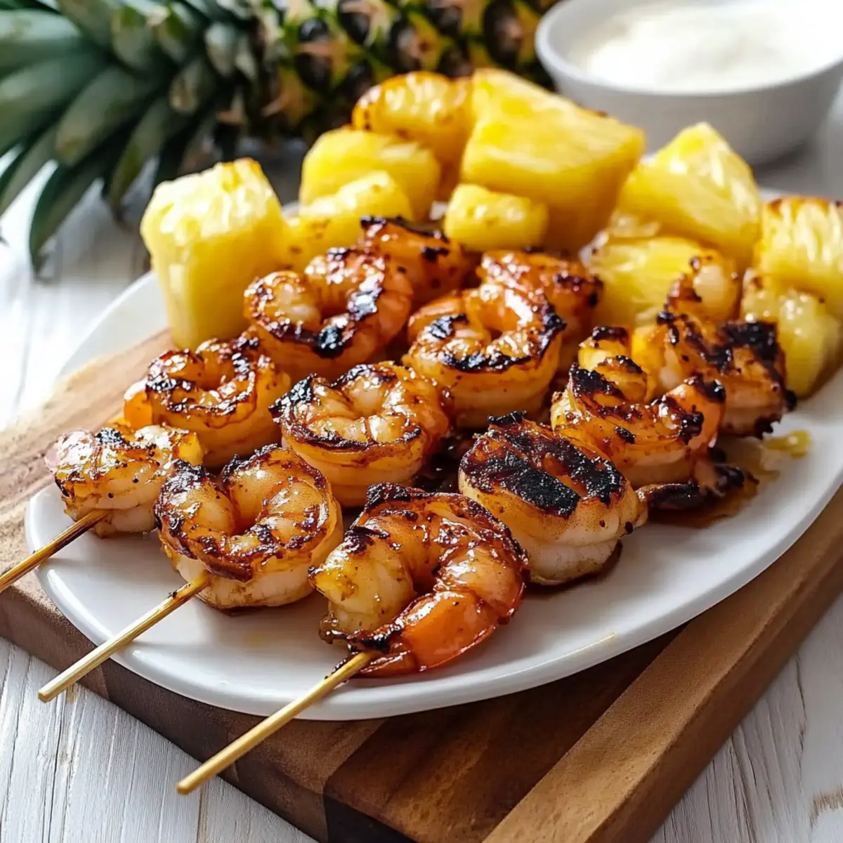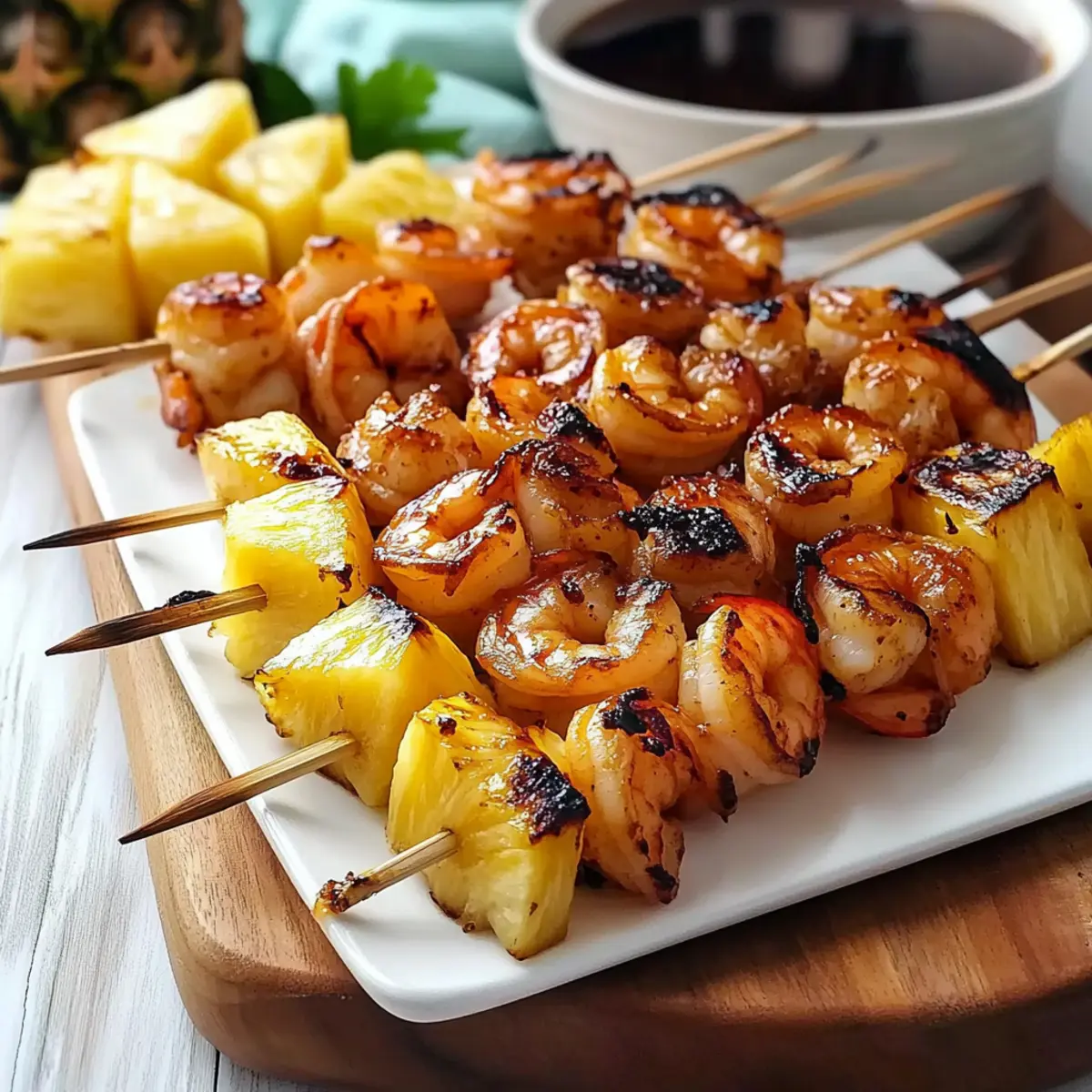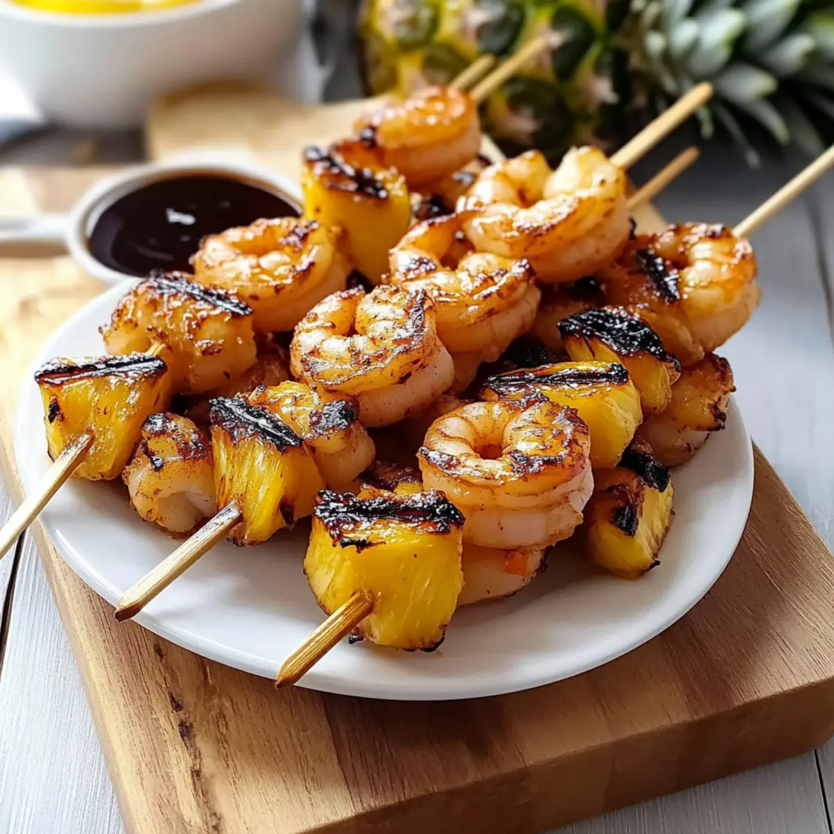 As the sun dips below the horizon, the grill sizzles to life with delicious anticipation. I can almost feel the warm summer breeze as I prepare to make Tasty Grilled Shrimp and Pineapple Skewers. This dish is the perfect blend of sweet and savory, showcasing the juicy melt-in-your-mouth shrimp paired with caramelized pineapple. In just under 20 minutes, you’ll create a mouthwatering meal that transforms ordinary summer gatherings into vibrant culinary experiences. Best of all, it’s a gluten-free option that packs a flavorful punch, making it an instant crowd-pleaser. So, whether you’re grilling for family or impressing your friends, why not dive into this flavorful adventure? Your taste buds will thank you! Why try Grilled Shrimp and Pineapple Skewers? Quick and Easy: With a prep time of under 20 minutes, these skewers are a champion of quick meals, perfect for impromptu summer gatherings. Flavor Explosion: The sweet-tangy marinade elevates the natural flavors of fresh shrimp and caramelized pineapple, tantalizing your taste buds with every bite. Crowd-Pleaser: Ideal for family cookouts or a fun gathering with friends, this dish showcases a vibrant mix of colors and tastes, appealing to everyone. Versatile Options: Experiment with variations like scallops or vegetables, customizing each batch to cater to your guests’ preferences. Gluten-Free Delight: Whether you’re health-conscious or have dietary restrictions, these skewers are a delicious gluten-free choice that everyone will enjoy! Grilled Shrimp and Pineapple Skewers Ingredients For the Skewers • Large Shrimp – Use 21-30 count or larger for the best texture; fresh or fully-thawed frozen shrimp works wonderfully. • Pineapple Chunks – Cut into 1-inch cubes for uniform cooking; these add delightful sweetness that caramelizes perfectly on the grill. For the Marinade • Soy Sauce – Provides a savory depth; try Kikkoman Less Sodium for a healthier option. • Balsamic Vinegar – Adds that tangy kick to balance the sweetness of the pineapple. • Honey – Serves as a natural sweetener and enhances caramelization; if desired, maple syrup can be used as an alternative, though it’s less effective. • Minced Garlic – Elevates the overall flavor profile with its aromatic warmth. • Toasted Sesame Oil – Adds a nutty flavor that beautifully complements shrimp and pineapple. • Fresh Ginger – A touch of freshness; grate it for maximum flavor impact! • Pepper – Simple yet essential for rounding out the taste. For Grilling & Serving • Wooden Skewers – Soak in water for at least 15 minutes to prevent burning on the grill. • High-Heat Oil – Use this to lightly grease the grill grates, enhancing the caramelization process. These Grilled Shrimp and Pineapple Skewers promise to be a vibrant highlight of your summer gatherings! Step‑by‑Step Instructions for Grilled Shrimp and Pineapple Skewers Step 1: Prepare Marinade In a mixing bowl, whisk together ¼ cup soy sauce, 2 tablespoons balsamic vinegar, 2 tablespoons honey, 2 cloves minced garlic, 1 tablespoon grated fresh ginger, 1 tablespoon toasted sesame oil, and a pinch of pepper. Mix until the honey is fully dissolved. This flavorful marinade will elevate your Grilled Shrimp and Pineapple Skewers, balancing sweet and savory notes beautifully. Step 2: Soak Skewers To prevent burning on the grill, submerge your wooden skewers in water for at least 15 minutes. This crucial step ensures your Grilled Shrimp and Pineapple Skewers stay intact during grilling. While they soak, you can prep your other ingredients and get excited for the grilling ahead! Step 3: Assemble Skewers Once your skewers are ready, thread 3 shrimp and 3 pineapple chunks onto each soaked skewer, alternating between them for flavor and texture. Make sure to start and end with a pineapple chunk for a visually appealing result. Assembly should be quick, allowing your Grilled Shrimp and Pineapple Skewers to come together seamlessly. Step 4: Marinate Generously brush the assembled skewers with half of the marinade, ensuring every shrimp and pineapple piece is coated. Let them rest for 10 minutes at room temperature to soak in the flavors. Avoid marinating for more than 30 minutes, as that could make the shrimp too soft. Step 5: Preheat Grill Time to fire up the grill! Preheat your grill to medium heat, aiming for around 375-400°F. Lightly oil the grates with high-heat oil to prevent the skewers from sticking and to promote a beautiful caramelization on your Grilled Shrimp and Pineapple Skewers. Step 6: Grill Skewers Place the skewers on the preheated grill and close the lid. Grill for about 3-4 minutes until the shrimp turn a lovely pink and opaque. Carefully flip the skewers and grill for another 2-3 minutes, ensuring the shrimp are cooked through and the pineapple gets those gorgeous grill marks. Step 7: Final Glaze In the last minute of grilling, brush your Grilled Shrimp and Pineapple Skewers with the reserved marinade. This final glaze adds an extra layer of flavor and shine to the shrimp and pineapple, enhancing the overall deliciousness of your dish. Step 8: Rest and Serve Once grilled to perfection, remove the skewers from the grill and let them rest for 2-3 minutes. This step allows the juices to redistribute, ensuring every bite is juicy and flavorful. Serve warm, and prepare for compliments on your delightful Grilled Shrimp and Pineapple Skewers! Expert Tips for Grilled Shrimp and Pineapple Skewers • Watch Cooking Time: Avoid overcooking shrimp; they should turn pink and opaque in 2-3 minutes per side for perfect texture. • Soak Skewers Properly: Ensure wooden skewers are fully submerged in water for at least 15 minutes. This prevents burning during grilling. • Reserve Marinade: Save half of the marinade before it touches raw shrimp. This can be brushed on as a finishing glaze, ensuring no cross-contamination. • Use High-Heat Oil: Lightly grease the grill grates with high-heat