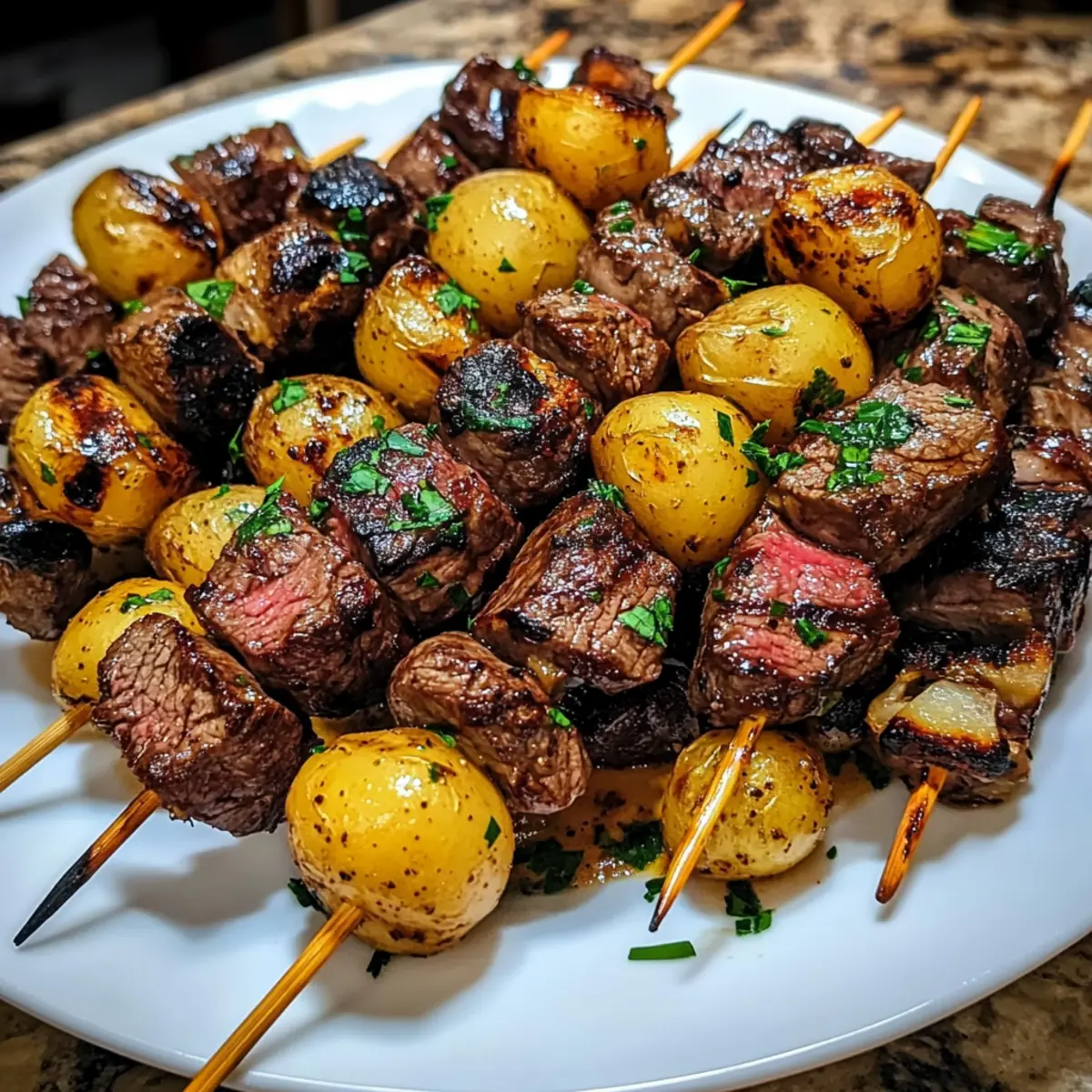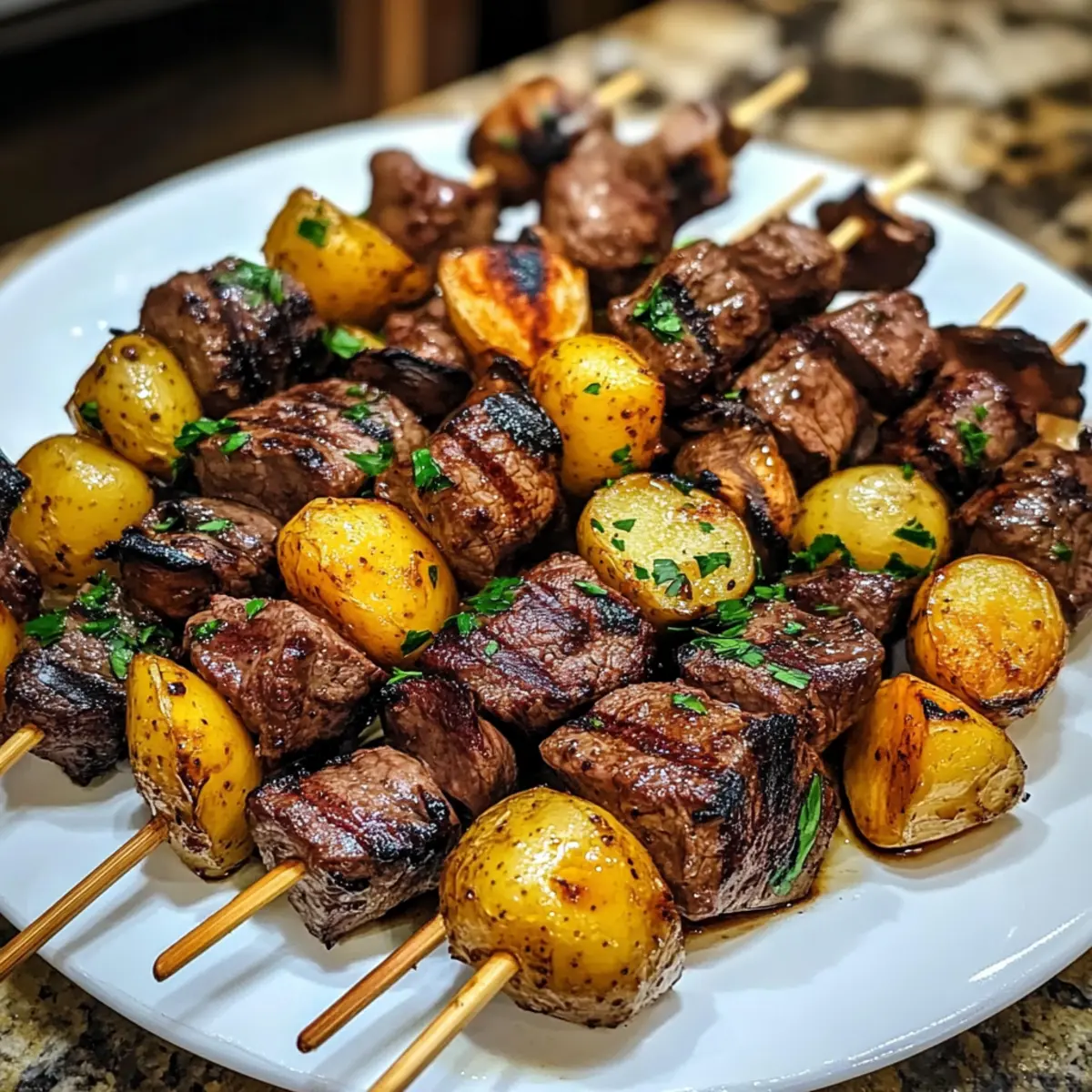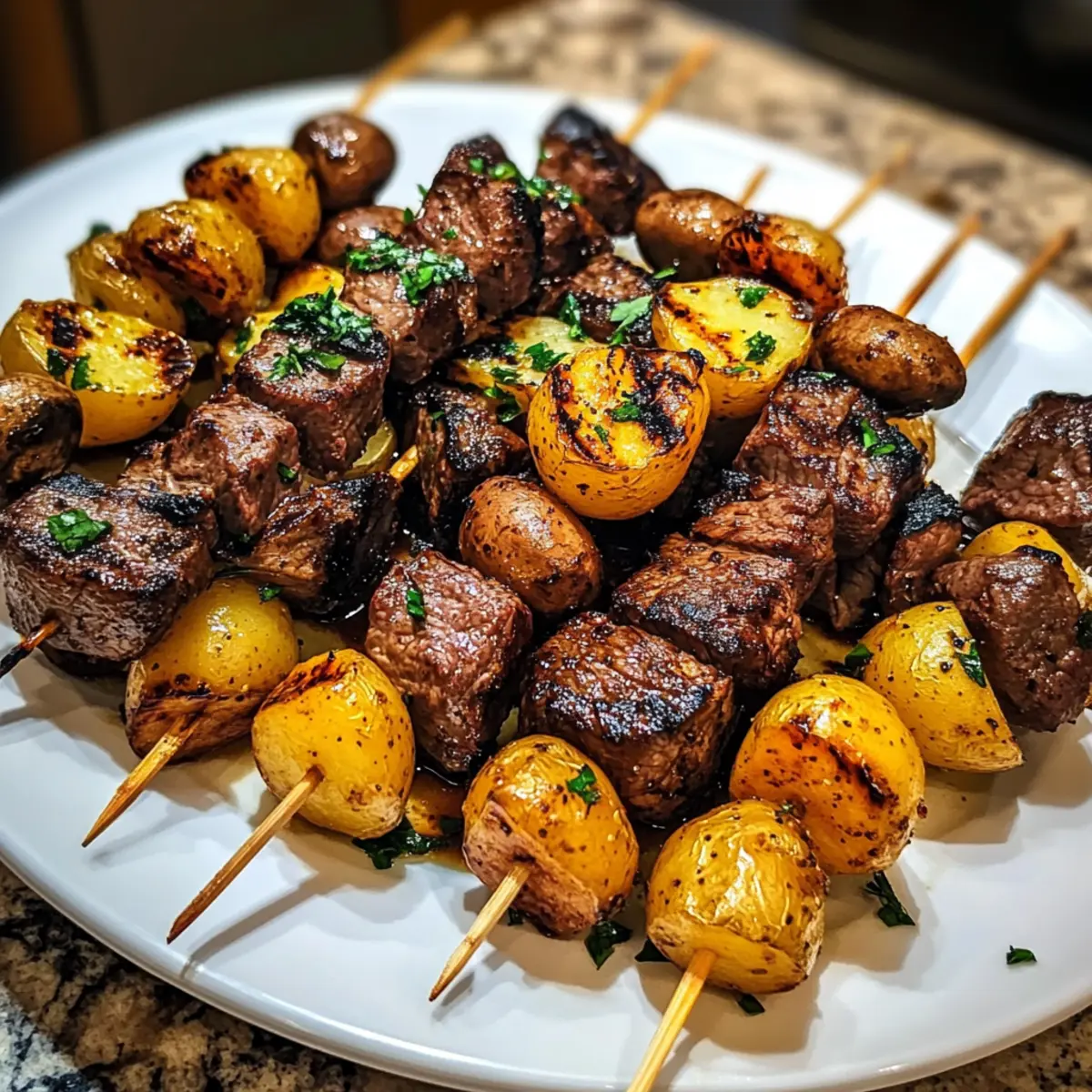 The sizzle of meat hitting a hot grill can instantly transport you to sun-soaked days filled with laughter and good company. That’s the joy of making these Grilled Steak and Potato Kabobs; they stir up memories of summer gatherings while delivering mouthwatering flavors everyone loves. This recipe nails the balance of juicy, tender steak and perfectly roasted potatoes on skewers, making it the ideal choice for a quick, family-friendly meal. Not only are these kabobs gluten-free, but they’re also high in protein, ensuring you stay energized for the fun ahead. With simple preparation and stunning results, this dish is bound to become a staple at your cookouts. What delicious twist will you add to your kabobs? Why are kabobs a summer favorite? Versatile Ingredients: You can easily customize these kabobs by swapping in your favorite vegetables like bell peppers or zucchini. Quick and Easy: They come together in a flash, making them perfect for last-minute family dinners or impromptu BBQs. High-Protein Delight: Packed with juicy steak and potatoes, these kabobs offer a hearty meal without the fuss. Crowd-Pleaser: Whether you’re serving family or friends, everyone will be lining up for seconds! For a fabulous side, try pairing them with a crisp green salad or Air Fryer Grilled cheese sandwiches for a perfect summer feast. Grilled Steak and Potato Kabobs Ingredients • Elevate your summer BBQ with delicious flavors! For the Kabobs Ribeye Steak – Offers rich flavor and tenderness; substitute sirloin for a budget-friendly option. Baby Bella Mushrooms – Adds earthy notes and retains moisture while absorbing the marinade. Baby Yukon Gold Potatoes – Holds up beautifully on the grill; try red or fingerling potatoes for a twist. For the Marinade Soy Sauce – Provides umami depth and complements the steak’s flavor; opt for low-sodium if desired. Ketchup – Adds sweetness that helps caramelize the kabobs. Vegetable Oil – Ensures moisture and aids in grilling perfection. White Vinegar – Balances the flavors with a touch of acidity. Brown Sugar – Introduces a hint of sweetness for that delightful glaze. Garlic Powder – Enhances the aromatic profile and adds great depth to the marinade. With these Grilled Steak and Potato Kabobs Ingredients, you’re all set for a flavorful backyard feast that has family-friendly fun written all over it! Step‑by‑Step Instructions for Grilled Steak and Potato Kabobs Step 1: Prepare Ingredients Begin by cutting the ribeye steak into 16 equal pieces and place them in a large gallon storage bag along with the baby Bella mushrooms. This will ensure that each piece marinates evenly. The size of the steak pieces should be similar to the mushrooms for uniform cooking. Step 2: Whisk Marinade In a mixing bowl, combine soy sauce, ketchup, vegetable oil, white vinegar, brown sugar, and garlic powder. Whisk until the mixture is smooth and fully blended. Pour the marinade over the steak and mushrooms in the bag, sealing it tightly. Gently massage the bag to coat everything evenly and let it marinate for at least 30 minutes to 2 hours in the refrigerator for maximum flavor. Step 3: Par-Boil Potatoes While the steak and mushrooms are marinating, clean the Yukon Gold potatoes thoroughly under running water. Place them in a pot of salted water and bring to a boil over medium-high heat. Boil the potatoes for about 5-7 minutes, or until they are just fork-tender, ensuring they don’t get too soft. Drain them and let them cool to room temperature while you prepare the skewers. Step 4: Assemble Kabobs Take metal or soaked wooden skewers and start threading the ingredients in this order: a piece of ribeye, a potato, another piece of ribeye, and a baby Bella mushroom. Repeat this sequence until all the ingredients are used, spacing each piece just slightly apart to allow for even cooking on the grill. Make sure not to overcrowd the skewers for the best results. Step 5: Grill Kabobs Preheat your grill to medium-high heat, about 400°F. Once hot, oil the grill grate with a paper towel dipped in vegetable oil to prevent sticking. Place the assembled kabobs onto the grill and cook for 5-6 minutes on each side. Flip the kabobs every 3 minutes until they reach your desired doneness, aiming for a lovely char on the outside and juicy steak inside. Step 6: Check Doneness Use a meat thermometer to check the steak’s doneness; you’ll want it between 125°F for rare and 150°F for well-done. The delicious aroma of the grilled steak and tender potatoes will be enticing! Once cooked to perfection, remove the kabobs from the grill and let them rest for a few minutes before serving. Step 7: Serve and Enjoy Carefully slide the ingredients off the skewers onto a serving platter. Serve your Grilled Steak and Potato Kabobs warm alongside a refreshing cucumber-dill yogurt sauce or a crisp salad. This hearty dish is perfect for summer gatherings, promising delightful flavors and cherished memories with loved ones. What to Serve with Juicy Grilled Steak and Potato Kabobs Enjoy a delightful barbecue feast by complementing these kabobs with tasty sides and refreshing drinks. Crisp Green Salad: A refreshing mix of lettuce and vegetables, this salad provides a light, crunchy contrast to the juicy kabobs. Grilled Corn on the Cob: The slightly sweet, smoky flavor of grilled corn pairs beautifully with the savory steak and potatoes. Fluffy Quinoa: This nutty grain adds a wholesome touch, soaking up any extra marinade and offering a delightful texture. Roasted Vegetables: A colorful mix of seasonal veggies, roasting them brings out their natural sweetness, balancing the bold flavors of the kabobs. Tzatziki Sauce: A cool, creamy cucumber-dill yogurt sauce enhances every bite, adding a refreshing Mediterranean twist. Sparkling Lemonade: This fizzy, citrusy drink adds a bright note, perfectly quenching your thirst on warm summer days. Fruit Salad: A vibrant medley of fresh fruits provides a sweet,