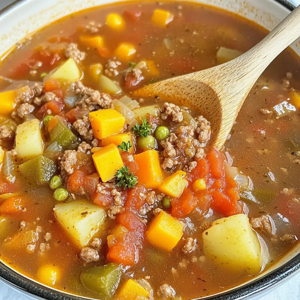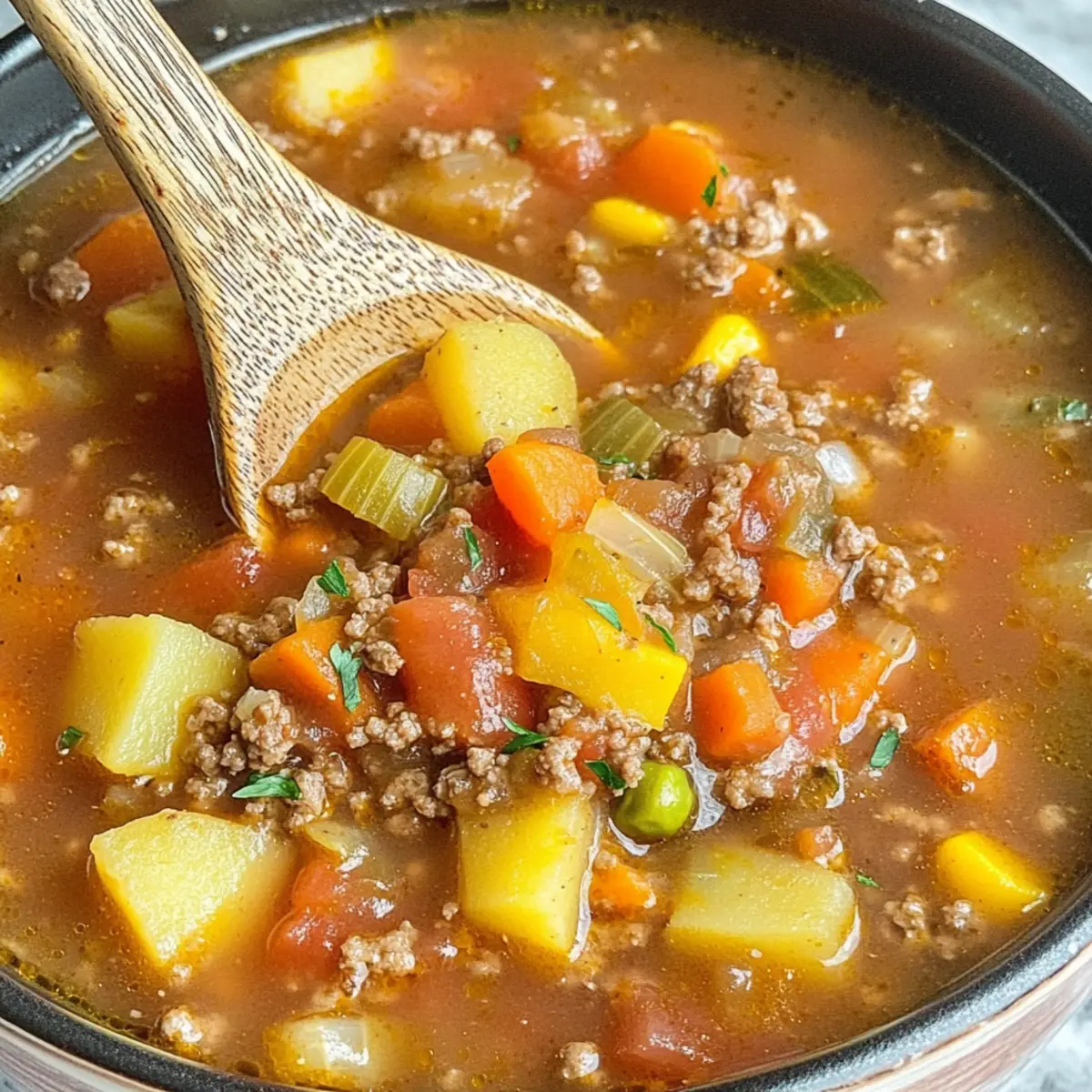 Warm up with this hearty Hamburger Soup, a comforting blend of ground beef, potatoes, and veggies in a rich tomato broth.