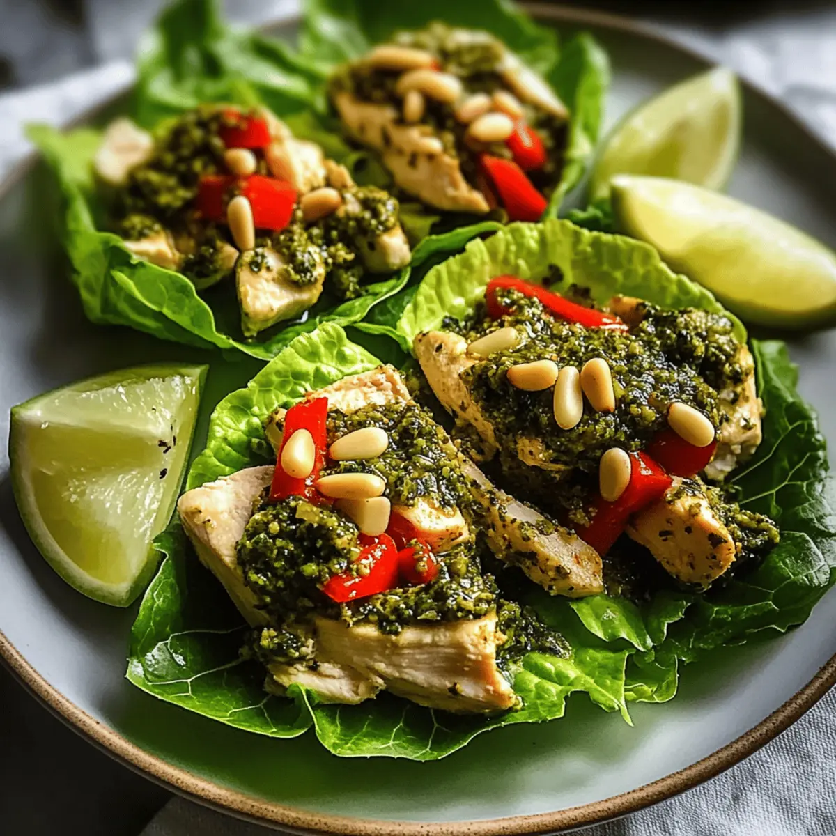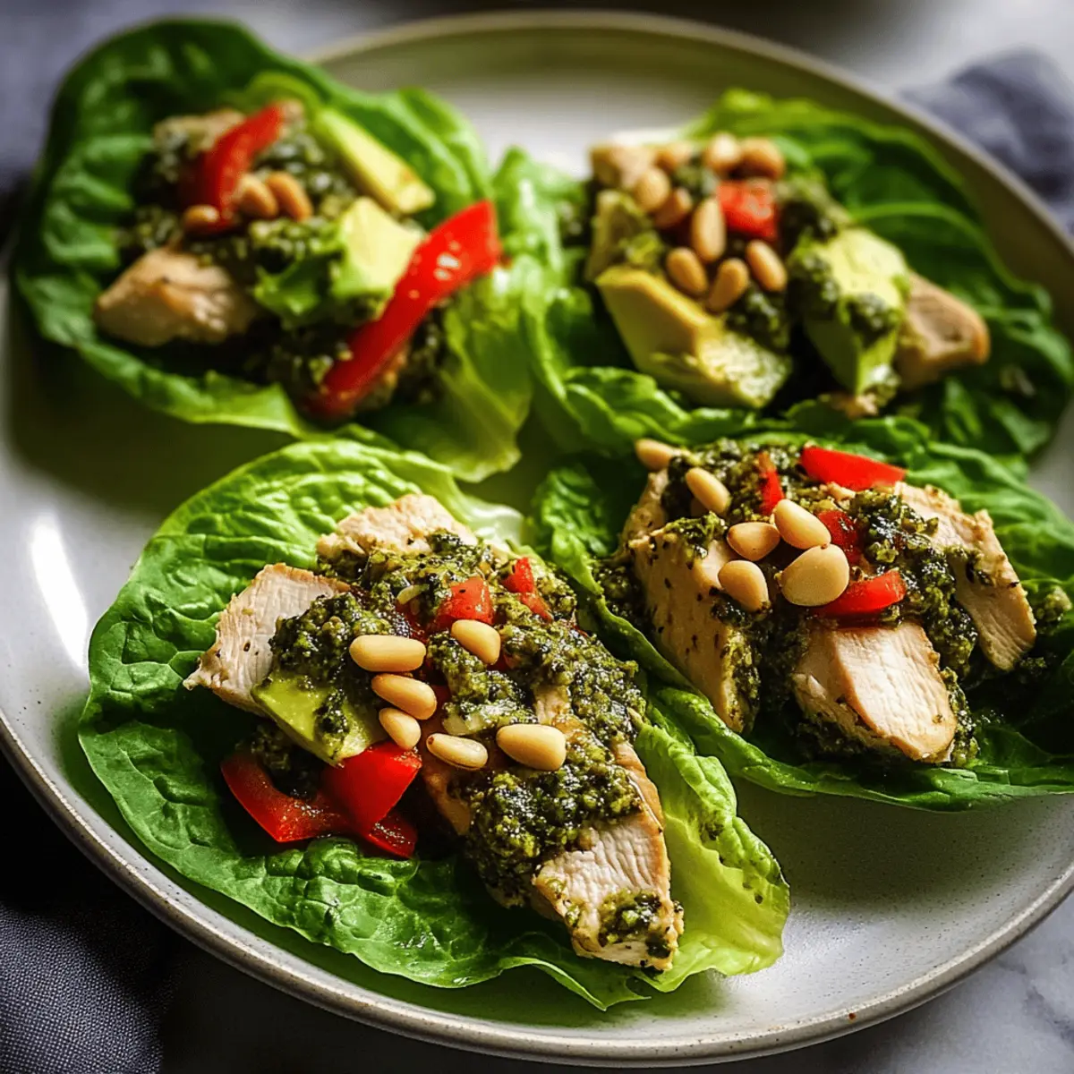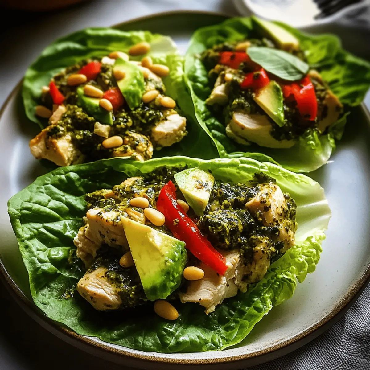 As my knife sliced through the colorful medley of fresh ingredients, a spark of excitement filled the kitchen. I was about to whip up the Healthy Pesto Chicken Lettuce Wraps, a dish that’s quickly become a staple for satisfying weeknight dinners. With just a handful of ingredients, these low-carb delights combine tender chicken, zesty pesto, and crisp veggies—all wrapped up in refreshing lettuce leaves. Not only are they easy to make, perfect for beginners, but they also serve as a refreshing alternative to heavy takeout meals. With every bite, you’re embracing a vibrant taste experience that feels indulgent without the guilt. So, are you ready to transform your dinner routine and impress your loved ones with these irresistible wraps? Why Try Healthy Pesto Chicken Wraps? Quick Meal Solution: These wraps are not only delicious but also come together in a flash—perfect for busy evenings. Low-carb Delight: Enjoy a satisfying meal without the carbs, making it suitable for a variety of diets. Flavorful Twist: The combination of herby pesto, juicy chicken, and fresh veggies creates an explosion of taste in every bite. Beginner-Friendly: Anyone can whip these wraps up, even if you’re new to cooking! Customizable: Feel free to add your favorite veggies or try variations, like swapping basil pesto for sun-dried tomato pesto. You’ll love serving these healthy wraps, and they pair beautifully with light salads or fresh fruit for a perfect, guilt-free meal. Healthy Pesto Chicken Lettuce Wraps Ingredients For the Chicken Mixture Chicken Breast – Lean protein providing the meal’s heartiness; you can substitute with thighs for a juicier option. Olive Oil – Heart-healthy fat for searing the chicken; avocado oil is a great substitute if desired. Salt and Pepper – Essential seasonings to enhance flavors; always adjust to your liking. Basil Pesto – The star ingredient that imparts an herby, garlicky flavor; use homemade or store-bought for convenience. Parmesan Cheese – Adds a salty, umami-rich creaminess; for a dairy-free option, use nutritional yeast. For the Fresh Elements Red Bell Pepper – For crispness and vibrant color; you can substitute with any sweet pepper. Avocado – Provides creaminess and healthy fats; always use ripe avocados for the best taste. Pine Nuts – Toasted for added crunch and nutty flavor; walnuts or sliced almonds can work as alternatives. For the Wrapping Lettuce Leaves (Bibb or Romaine) – Acts as a low-carb wrap, creating a refreshing contrast; ensure they are large enough to hold the filling. Optional Garnish Lemon Wedges – Adds a tangy brightness to the wraps; don’t skip them for that extra zing! These Healthy Pesto Chicken Lettuce Wraps embody a delightful balance of flavors and textures that will leave you wanting more, all while being a guilt-free indulgence. Step‑by‑Step Instructions for Healthy Pesto Chicken Lettuce Wraps Step 1: Sear the Chicken In a large skillet, heat 2 tablespoons of olive oil over medium heat. Once the oil is shimmering, add 1 pound of uniform-sized chicken breast pieces. Season generously with salt and pepper, and cook for about 7-10 minutes, flipping occasionally, until the chicken is golden brown and fully cooked, reaching an internal temperature of 165°F. Step 2: Add the Pesto Lower the skillet’s heat to medium-low, then add a generous ½ cup of basil pesto to the cooked chicken. Use a spatula to stir the mixture thoroughly until all the chicken pieces are evenly coated in the vibrant green pesto. Allow it to cook for an additional 1-2 minutes to warm through and enhance the flavors. Step 3: Incorporate Parmesan Cheese With the pesto chicken still on low heat, sprinkle in ¼ cup of grated Parmesan cheese. Stir continuously until the cheese has melted and combined with the pesto, creating a creamy coating around the succulent chicken. This combination will offer a deliciously rich flavor to your Healthy Pesto Chicken Lettuce Wraps. Step 4: Fold in the Fresh Veggies Remove the skillet from heat and gently fold in 1 diced avocado and 1 cup of sliced red bell pepper. Be careful not to mash the avocado; just incorporate it lightly with the chicken mixture to maintain chunks of creaminess and freshness. The vibrant colors will enhance both the look and taste of your wraps. Step 5: Toast the Pine Nuts In a separate small skillet, toast ¼ cup of pine nuts over medium heat for about 2-3 minutes. Stir frequently, watching closely as they turn golden and fragrant, to prevent burning. Once toasted, remove them from heat and set aside to cool slightly while you prepare the lettuce wraps. Step 6: Assemble the Wraps Prepare your lettuce leaves by selecting large, sturdy Bibb or Romaine leaves that can hold a generous amount of filling without tearing. Spoon an ample amount of the chicken mixture into the center of each leaf, creating a hearty serving of your Healthy Pesto Chicken Lettuce Wraps that guests can easily pick up. Step 7: Garnish with Pine Nuts Sprinkle the toasted pine nuts over each filled lettuce leaf for an extra layer of flavor and delightful crunch. This added texture will complement the creamy avocado, ensuring every bite of your Healthy Pesto Chicken Lettuce Wraps is a satisfying experience. Step 8: Serve with a Zesty Twist Serve your wraps immediately, accompanied by lemon wedges for a refreshing splash of citrus. This vibrant addition will elevate the overall dish and bring out the rich flavors of the chicken and pesto, making this a delightful meal for any occasion. How to Store and Freeze Healthy Pesto Chicken Lettuce Wraps Fridge: Store leftovers in an airtight container for up to 2 days. Keep the chicken mixture separate from the lettuce to prevent wilting. Freezer: Freeze the chicken mixture without the lettuce in an airtight container for up to 3 months. Thaw in the fridge before reheating. Reheating: To reheat, warm the chicken mixture in a skillet over medium heat until heated through, then 