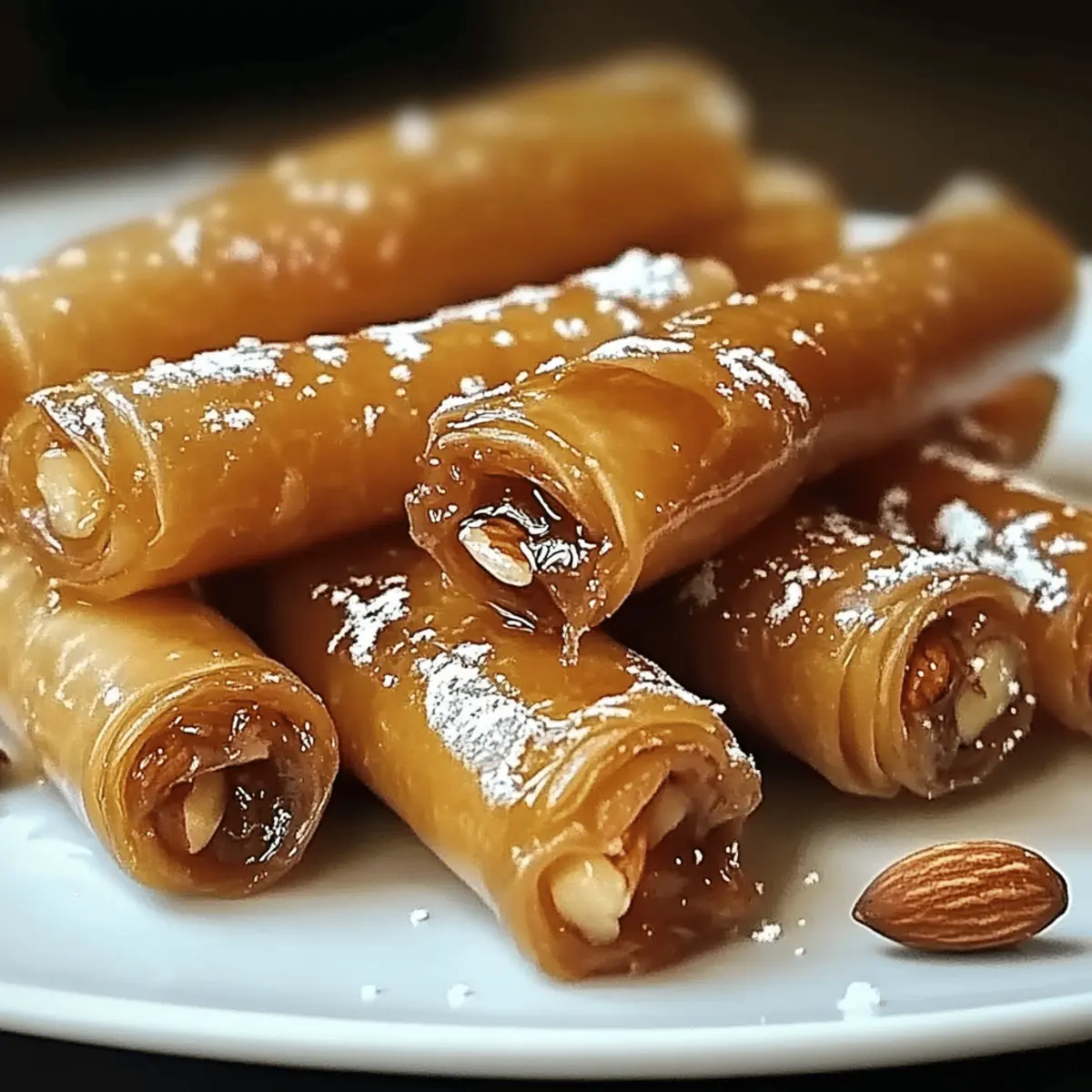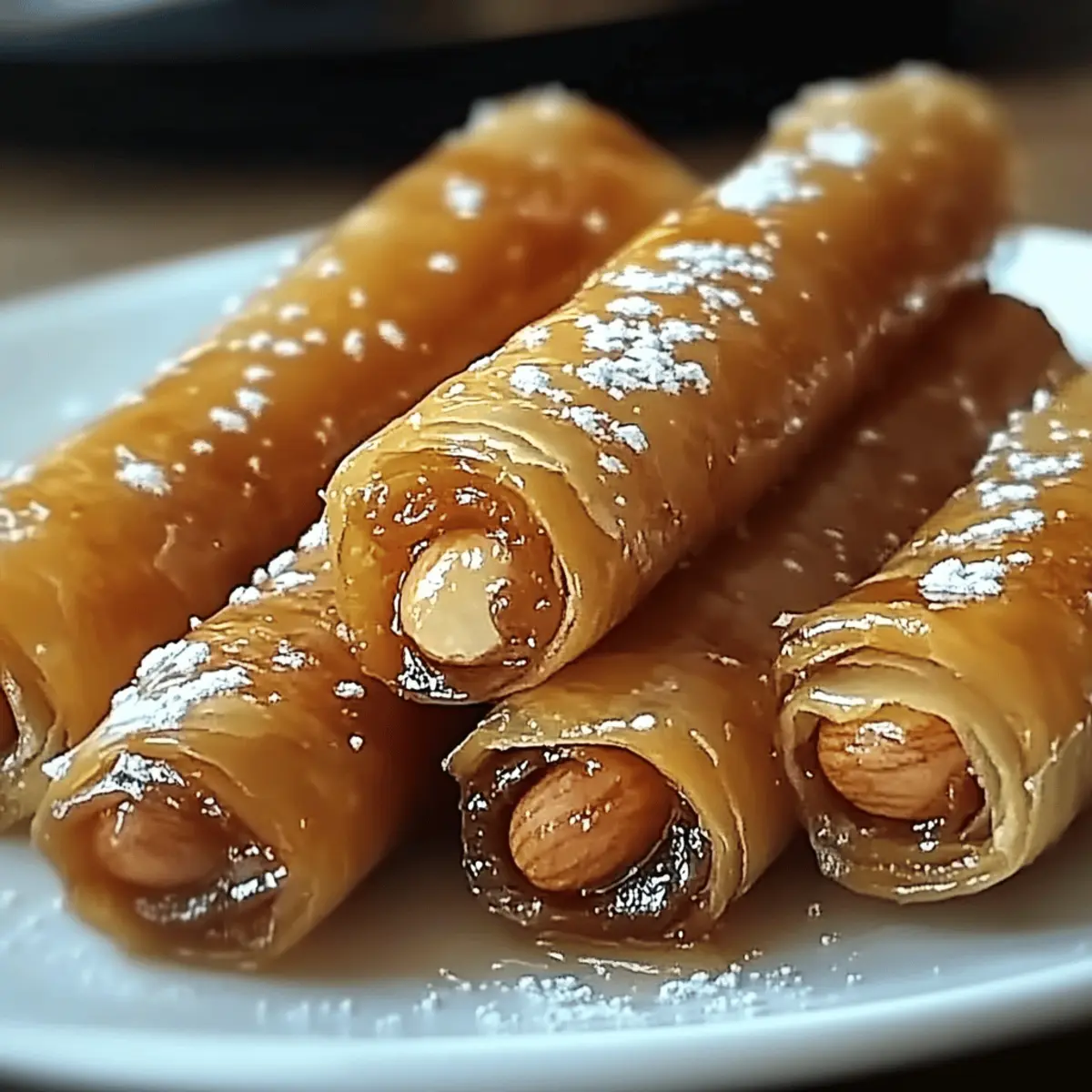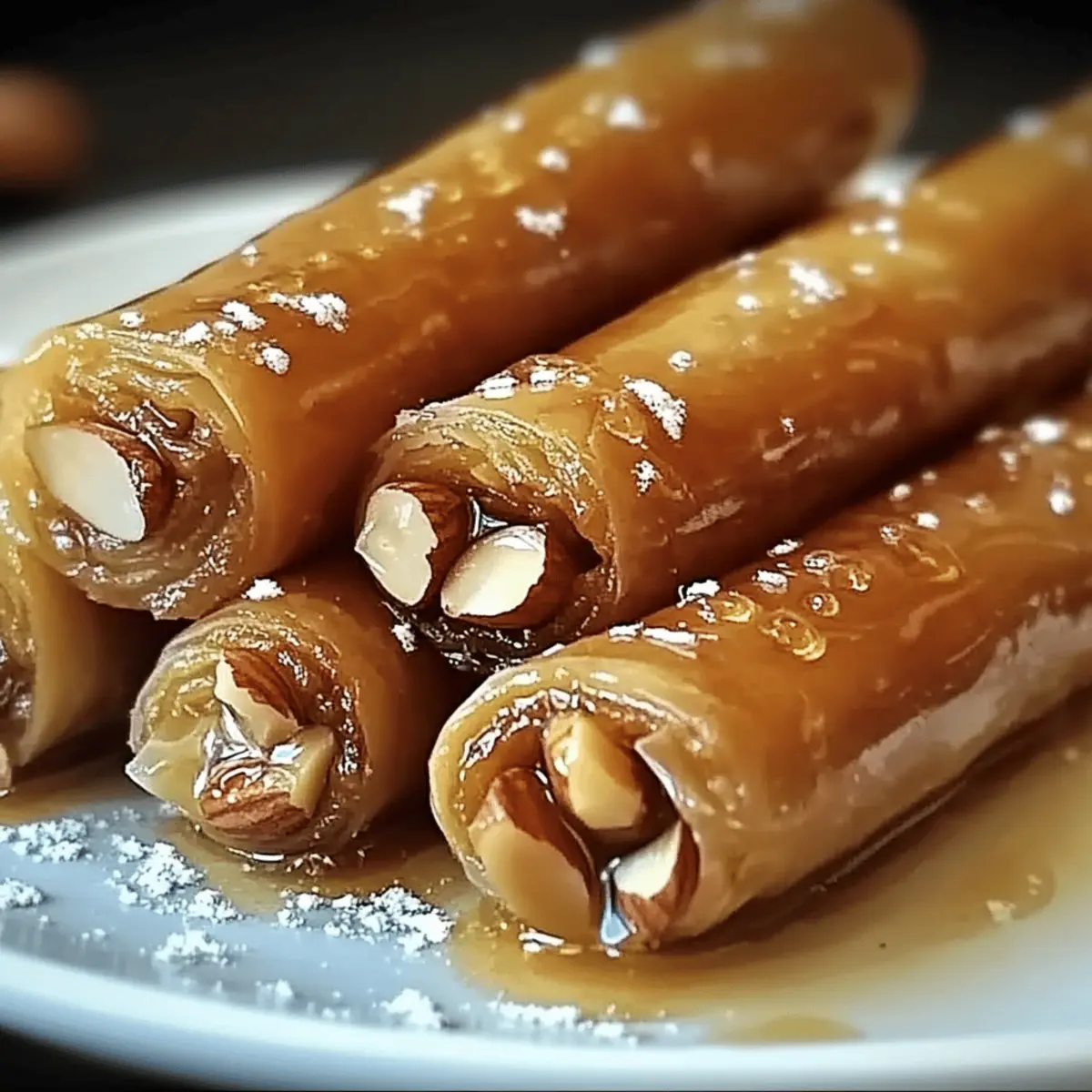Have you ever found yourself craving something sweet, crispy, and delightfully crunchy? Enter Moroccan Honey and Almond Cigars, a treat that captures the essence of Mediterranean flavors in a beautiful, bite-sized package. This recipe not only offers a quick 50-minute prep time, but it also transforms simple ingredients like honey and almonds into a show-stopping dessert that’s perfect for impressing guests or indulging in a cozy evening at home. With their delightful texture and fragrant spices, these cigars are sure to satisfy any sweet tooth while offering a unique twist on traditional desserts. So, are you ready to roll up your sleeves and create these delicious treats that will leave everyone asking for seconds? Why Choose Honey and Almond Cigars? Irresistible Flavor: The pairing of sweet honey and crunchy almonds creates a mouthwatering experience that will have everyone eager for more. Exquisite Texture: Enjoy a delightful contrast between the crispy shell and creamy filling, making each bite truly special. Quick and Easy: In just 50 minutes, you can whip up these satisfying treats, making it a perfect option for last-minute entertaining. Versatile Options: Feel free to experiment with different nuts or add chocolate drizzles for a personal touch. These cigars can easily adapt to your taste! Crowd-Pleasing Delight: Perfect for parties, these cigars will impress your guests and keep everyone coming back for seconds! Serve them alongside other favorites like Honey Bourbon Chicken or Ranch Macaroni Cheese for a delightful spread. Honey and Almond Cigars Ingredients For the Filling Almonds – Adds essential crunch and nutty flavor; feel free to swap with hazelnuts or walnuts for a unique taste. Honey – Provides natural sweetness and moisture; opt for pure honey to enhance flavor depth. Ground Cinnamon – Infuses warmth and spice; allspice or cardamom are great alternatives if you’d like a twist. Ground Nutmeg – Elevates the aromatic profile; consider using cloves in smaller amounts if you want a different spice kick. For the Wrapper Spring Roll Wrappers – The perfect crispy exterior for your filling; substitute with filo pastry for an even flakier bite. Unsalted Butter – Creates that golden, crispy finish when brushed on; substitute with coconut oil for a dairy-free treat. For Finishing Touches Powdered Sugar – Optional for dusting, it adds a sweet decorative finish that enhances the look of your honey and almond cigars. Prepare these delightful ingredients, and get ready to dive into a sweet treat adventure that will have everyone asking for more! Step‑by‑Step Instructions for Honey and Almond Cigars Step 1: Prepare the Filling In a large mixing bowl, combine finely chopped almonds, honey, ground cinnamon, and ground nutmeg. Stir until the almonds are well-coated and the mixture becomes sticky, which should take about 2-3 minutes. Set aside the filling mixture while you prepare the wrappers, ensuring all flavors meld together beautifully for your Honey and Almond Cigars. Step 2: Setup Wrappers Lay a spring roll wrapper on a clean, dry surface with one corner pointing towards you, creating a diamond shape. Make sure the wrapper is smooth and free of tears; this will help maintain the perfect crunch once baked. Keep a damp cloth nearby to cover any unused wrappers to prevent them from drying out as you work. Step 3: Fill the Wrapper Spoon approximately 1 tablespoon of the honey and almond filling onto the lower corner of the spring roll wrapper. Ensure the filling is evenly distributed across the bottom for consistent flavor in your Honey and Almond Cigars. This step is crucial for achieving that delightful balance of crunch and sweetness in every bite. Step 4: Roll the Cigar Begin by folding the corner over the filling tightly, then roll it towards the opposite corner, tucking in the sides as you go. The goal is to create a tight and secure roll that keeps all the delicious filling inside. Repeat this process carefully, ensuring none of the filling leaks out, which would detract from the experience of your Honey and Almond Cigars. Step 5: Seal Edges Before sealing, brush the top corner of the wrapper with melted butter to secure your roll. This will help it stick as it bakes and create a golden finish. Ensure you press the edges together gently, so they stay closed while baking. This step is essential to achieving the perfect crispy outer layer in your Honey and Almond Cigars. Step 6: Repeat Continue the rolling and sealing process until you’ve used up all the wrappers and filling. Arrange the finished cigars on a parchment-lined baking sheet, keeping them spaced apart so they can brown evenly. This will ensure each Honey and Almond Cigar achieves that gorgeous crispy texture all around. Step 7: Preheat the Oven While you’re preparing the cigars, preheat your oven to 375°F (190°C). This temperature is perfect for achieving a wonderfully crispy texture without burning. Allow around 10 minutes for the oven to fully preheat, ensuring your Honey and Almond Cigars cook to perfection. Step 8: Prepare for Baking Once the oven is preheated, brush the tops of the cigars lightly with more melted butter. This step is crucial for creating that shiny, golden-brown finish. Place the parchment-lined baking sheet in the oven carefully, as you don’t want to disturb the neatly arranged Honey and Almond Cigars. Step 9: Bake Bake your Honey and Almond Cigars for about 15-20 minutes, monitoring closely. They should be golden brown and crisp when finished, with a lovely aroma wafting through your kitchen. Rotate the baking sheet halfway through if your oven has hot spots, ensuring even baking for all the cigars. Step 10: Finish and Serve Once baked, remove the Honey and Almond Cigars from the oven and allow them to cool slightly on the baking sheet. If desired, dust with powdered sugar for a sweet finishing touch before serving. These delightful treats are best enjoyed warm, sho