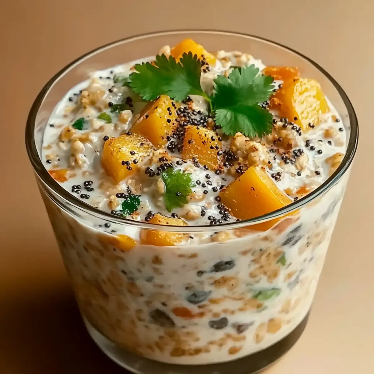 As I reached for my favorite spices one morning, the cozy aroma of cardamom and cinnamon wafted through the air, instantly transporting me to the bustling streets of India. This moment of culinary inspiration birthed my Nourishing Indian Overnight Oats, an easy-to-make breakfast brimming with delightful flavors and textures. With creamy yogurt, crunchy nuts, and the sweet chew of dried mango, it’s not just another quick meal—it’s a vibrant start to your day that will make busy mornings feel special. Plus, it’s a healthy, make-ahead option that fits seamlessly into any lifestyle. Are you ready to whip up something that will transform your breakfast routine? Why Choose Indian Overnight Oats? Simplicity at Its Finest: With just a few ingredients and minimal prep, this recipe is perfect for busy mornings. Bursting with Flavor: The blend of cardamom, cinnamon, and ginger adds a warm, inviting taste that elevates your breakfast experience. Nutritious Goodness: Packed with fiber, protein, and healthy fats, these oats keep you energized and satisfied all morning long. Versatility: Customize your bowl by adding different toppings, such as fresh fruits or nuts, to match your taste! Make-Ahead Convenience: Prepare several jars at once for quick, healthy breakfasts that fit seamlessly into your busy lifestyle. If you’re looking for more ways to elevate your morning routine, check out my tips for meal prepping and delicious variations to satisfy your palate! Indian Overnight Oats Ingredients • Discover the delightful components for these Indian Overnight Oats! For the Oats Base Rolled Oats – The heart of the dish providing essential fiber and structure; steel-cut oats can also be used but require a longer soaking time. Milk – Adds a creamy texture and helps the oats soften; any milk alternative like almond or coconut milk works beautifully. Yogurt – Introduces tang and creaminess; swap for dairy-free yogurt to make it vegan. For the Thickening & Sweetening Chia Seeds – A powerhouse ingredient that creates a pudding-like texture; can be substituted with flaxseeds. Honey – Natural sweetness enhances the flavor; feel free to use maple syrup for a vegan alternative. For the Spice Mix Ground Cardamom – Infuses warm, aromatic notes into the dish; adjust to your preference for stronger or milder flavor. Cinnamon – Adds familiar warmth; can be switched with nutmeg for an alternate spice profile. Turmeric – Gives vibrant color and an earthy taste; omit if a milder flavor is desired. Ginger – Brings a hint of freshness and spice; can be replaced with ground ginger if needed. For the Finishing Touches Pinch of Salt – Elevates all the flavors in your dish. Chopped Nuts (Almonds or Walnuts) – Provide delightful crunch and protein; use any favorite nut for variety. Dried Mango or Raisins – Offer delightful sweetness and chewiness; try swapping them with other dried fruits like cranberries or apricots. Prepare to awaken your taste buds with each spoonful and enjoy the simplicity and nutrition of these Indian Overnight Oats! Step‑by‑Step Instructions for Nourishing Indian Overnight Oats Step 1: Mix Ingredients In a large jar or bowl, combine rolled oats, milk, yogurt, chia seeds, honey, ground cardamom, cinnamon, turmeric, ginger, and a pinch of salt. Stir vigorously for about a minute until all the ingredients are fully blended and the oats are thoroughly coated with the creamy mixture. The texture should be thick and uniform, indicative of a perfect base for your Indian Overnight Oats. Step 2: Refrigerate Once mixed, cover your jar or bowl tightly with a lid or plastic wrap. Place it in the refrigerator and let the mixture chill for at least 6 hours or preferably overnight. This step allows the oats to absorb the liquid, softening them and enhancing the flavors. You’ll know they’re ready when the mixture has thickened and looks rich and inviting. Step 3: Stir & Adjust Consistency When you’re ready to serve your Nourishing Indian Overnight Oats, take them out of the refrigerator. Open the lid and give the mixture a good stir to ensure even creaminess. If you find it too thick for your liking, add a splash of milk—stir until you achieve your desired consistency, ensuring each grain of oats is perfectly blended. Step 4: Add Toppings Now, let your creativity shine by adding toppings! Spoon the oats into a serving bowl or leave them in the jar. Sprinkle chopped nuts, such as almonds or walnuts, on top, followed by your choice of dried fruits like mango or raisins. You can also drizzle a bit of honey or add extra spices to tailor your Nourishing Indian Overnight Oats to your taste. Step 5: Serve Your delightful Nourishing Indian Overnight Oats are now ready to enjoy! You can eat them cold straight from the fridge for a refreshing start to the day, or gently warm them in the microwave for about 30-60 seconds if you prefer a cozy meal. Any leftovers can be stored in the refrigerator for up to three days, just wait to add fresh toppings until you’re ready to indulge. What to Serve with Nourishing Indian Overnight Oats Start your day on a high note with a complete meal that tantalizes your taste buds and nourishes your body. Masala Chai: A spiced tea that complements the oats’ flavors perfectly, providing warmth and a comforting vibe. Fresh Fruit Salad: Bright, juicy fruits add a refreshing contrast to the creamy oats, elevating your breakfast experience. Granola Crunch: Top your oats with granola for an added crunch, enhancing texture and infusing every bite with nutty goodness. Coconut Yogurt: Swap regular yogurt for coconut yogurt to enhance creaminess and add a tropical twist that plays beautifully with Indian spices. Honey Drizzle: A gentle drizzle on top enhances the sweetness and offers an inviting glossy finish to your nourishing bowl. Sweetened Almond Milk: Serve alongside for a light and nutty drink that harmonizes with the spices in your oatmeal. Savory Avocado 