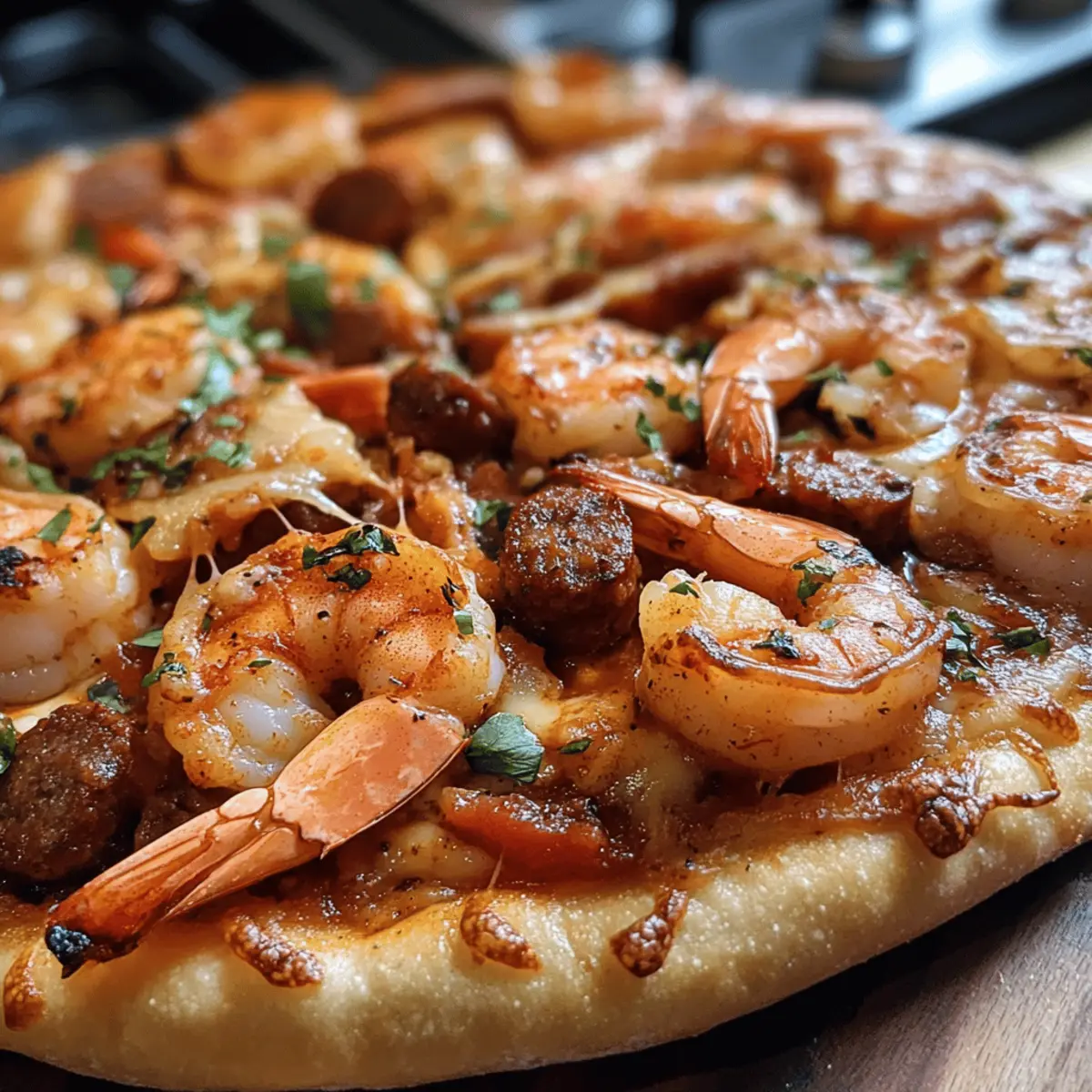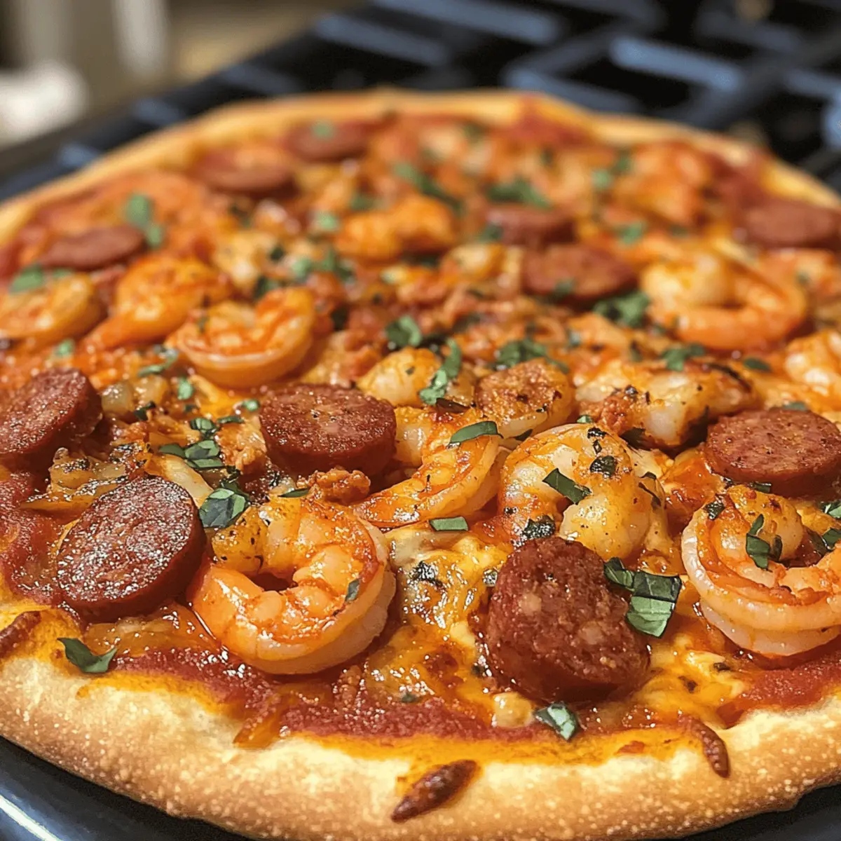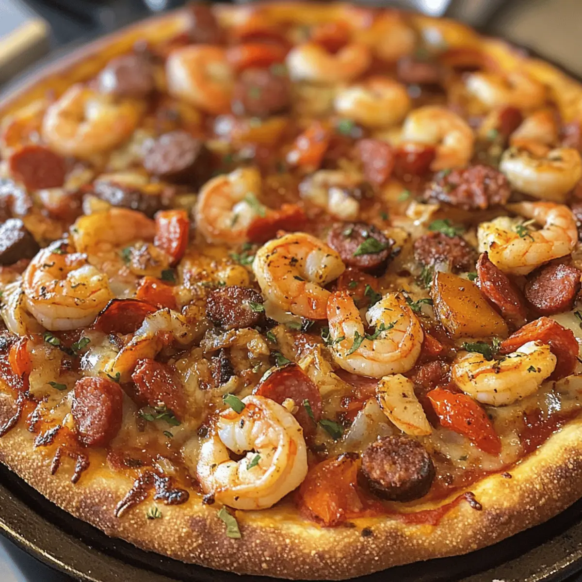Just when I thought pizza couldn’t get any better, I stumbled upon a culinary delight that merges two of my favorite worlds: Cajun and Italian. This Jambalaya Pizza takes all the bold, spicy flavors of classic jambalaya—think shrimp, Andouille sausage, and a medley of vibrant veggies—and elevates them on a crispy pizza crust. What I adore about this recipe is not just its delightful fusion, but also its quick prep time—ready in just 40 minutes, it’s a weeknight meal that can outshine delivery any day. Plus, it’s gluten-free thanks to the use of gluten-free sausage, making it a delicious option for everyone at the table. Are you ready to dive into a slice of this flavor-packed adventure? Let’s get cooking! Why is Jambalaya Pizza a Must-Try? Fusion of Cultures: This Jambalaya Pizza tantalizingly blends Cajun spices with Italian tradition, creating a unique feast for your taste buds. Quick to Make: With just 40 minutes from prep to plate, it’s a speedy alternative to takeout. Crowd-Pleasing Flavor: Spicy Andouille sausage and succulent shrimp on a cheesy base guarantee satisfaction for everyone at the table. Gluten-Free Goodness: Enjoy all the flavors without the gluten, making it a hit for various dietary needs. Whether you want a hearty meal for a busy weeknight or a festive dish for gatherings, this recipe offers the best of both worlds. If you love the idea of combining cuisines, try my Thanksgiving Pizza Cozy for another delicious fusion experience! Jambalaya Pizza Ingredients For the Pizza Dough • Ready-made Pizza Dough – Base of the pizza; feel free to use homemade dough for a fresher taste. For the Toppings • AIDELLS® Cajun Style Andouille Sausage – Offers a smoky flavor and hearty protein; any smoked sausage works too. • Shrimp – Main protein that adds a succulent touch; substitute with chicken or other seafood if desired. • Cajun Seasoning Blend – Enhances the flavor profile; adjust according to your preferred level of spice for the Jambalaya Pizza. • Cooking Spray – Prevents sticking on the pizza tray; olive oil can also do the trick for greasing. • Red Wine – Adds depth to your sauce through deglazing; chicken broth is a great non-alcoholic alternative. • Onion, Green Peppers, Celery (Holy Trinity) – These essentials build the sauce’s flavor; using a mix of bell peppers adds vibrant color. • Fresh Garlic – Provides aromatic depth; mince finely for the best flavor impact. • Roma Tomatoes – The primary ingredient for the sauce that contributes freshness; canned diced tomatoes are a quick substitute. • Fresh Parsley – Used for garnish; you can swap this with green onions for a slightly different flavor. Embrace the delightful fusion of flavors in every bite of your homemade Jambalaya Pizza, perfect for any occasion! Step‑by‑Step Instructions for Jambalaya Pizza Step 1: Preheat and Prepare Begin by preheating your oven to 400°F (200°C). While the oven heats, grab a 16″ pizza tray and spray it with cooking spray to prevent sticking. Meanwhile, take your ready-made pizza dough and stretch it out to fit the tray, creating a nice round shape. Make sure the dough is evenly distributed, and set it aside for later. Step 2: Cook the Sausage and Shrimp In a skillet over medium heat, add a splash of oil and sauté slices of AIDELLS® Cajun Style Andouille sausage for about 2 minutes until they start to brown. Then, toss in your seasoned shrimp and cook everything together for an additional 2 minutes until the shrimp turns pink and opaque. Once cooked, remove them from the skillet and set them aside to cool. Step 3: Create the Flavorful Base Using the same skillet, pour in a splash of red wine to deglaze, scraping up any flavorful bits stuck to the bottom. Add diced onion, green peppers, and celery, cooking them for about 2 minutes until the vegetables become slightly softened. The aroma will fill your kitchen; this is where the magic for the Jambalaya Pizza begins! Step 4: Add Garlic and Tomatoes Next, stir in minced fresh garlic and cook for an additional 30 seconds until fragrant. Then, introduce the diced Roma tomatoes and the Cajun seasoning blend. Let this concoction come to a boil, cooking for 7-10 minutes until the sauce thickens and the flavors meld beautifully. This rich mixture forms the perfect topping for your pizza. Step 5: First Bake of the Pizza Dough Now, carefully transfer your stretched pizza dough to the preheated oven and bake it for about 10 minutes or until it’s lightly golden and fragrant. This pre-baking step ensures a crispy base for your Jambalaya Pizza, setting the stage for the delicious toppings you’ll add shortly. Step 6: Assemble the Pizza Once your dough is baked, take it out and spread the thick tomato sauce mixture generously over the crust. Next, evenly distribute the cooked Andouille sausage and shrimp over the sauce. Finally, sprinkle shredded mozzarella cheese generously on top to create that gooey, melty layer everyone loves. Step 7: Final Bake Return the assembled Jambalaya Pizza to the oven and bake for another 7-10 minutes, or until the cheese is bubbly and golden. Keep an eye on it to avoid over-browning; the pizza is ready when the cheese is melted, and the edges of the crust are perfectly crisp. Step 8: Garnish and Serve Once out of the oven, sprinkle fresh parsley over the top for a vibrant touch. Allow the pizza to cool for a couple of minutes, then slice it into wedges. Serve your Jambalaya Pizza with pride, and enjoy the delightful fusion of flavors that celebrates both Cajun and Italian culinary traditions! How to Store and Freeze Jambalaya Pizza Room Temperature: Jambalaya Pizza can be left out for up to 2 hours after baking. Make sure it’s covered to avoid drying out or attracting insects. Fridge: Store leftovers in an airtight container in the fridge for up to 3 days. Reheat slices in the oven for best texture, or use the microwave if in a hurry. Freezer: For longer st