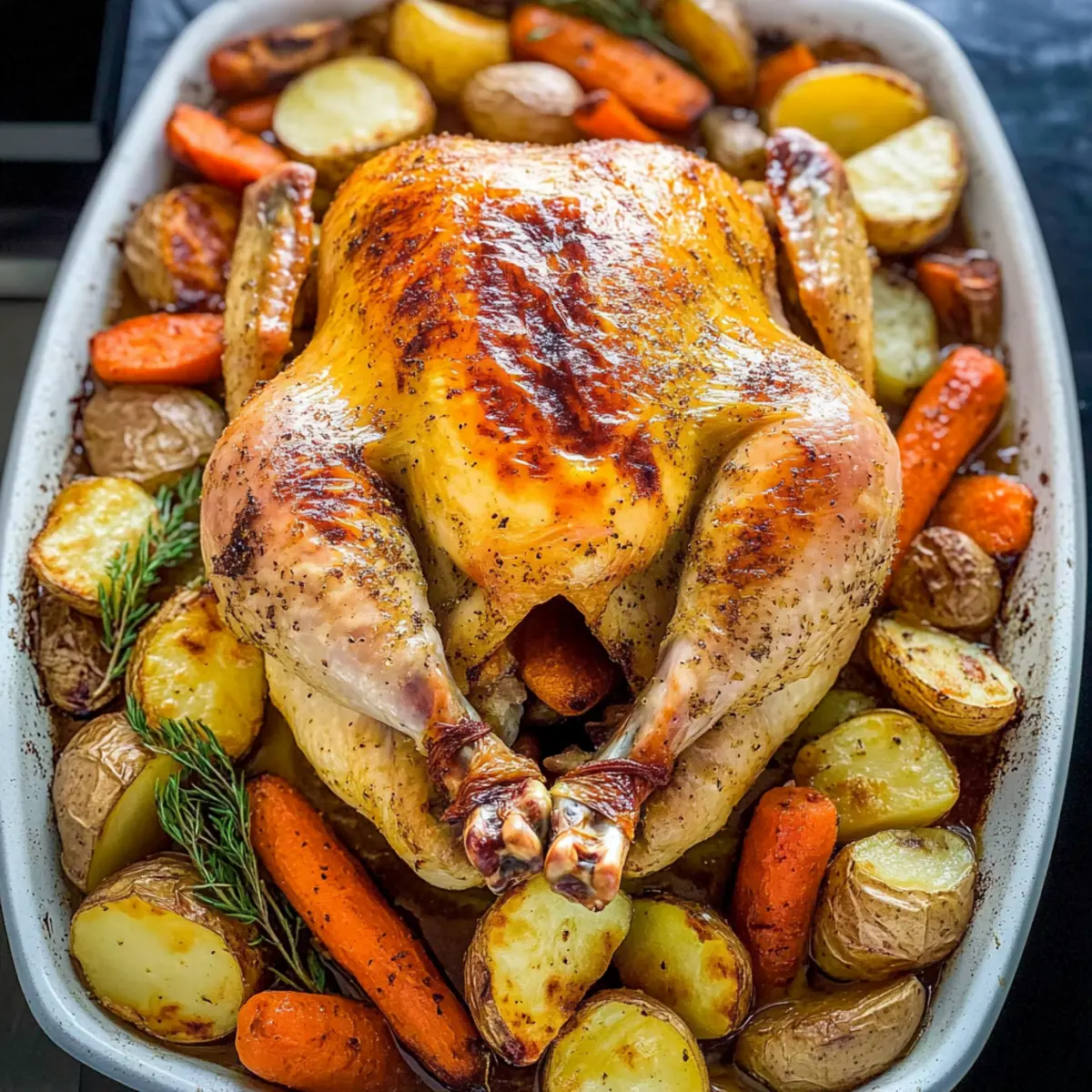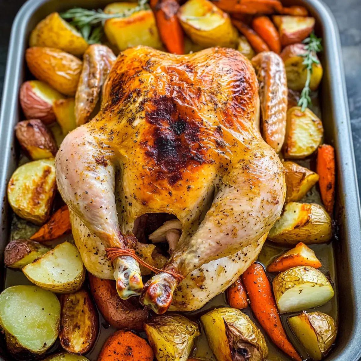 The savory scents wafting from the oven signal that something delicious is on the way. As I gather around the table, I can almost hear the laughter of family and friends sharing stories, all while the star of the night—Juicy Roast Chicken and Vegetables—takes center stage. This easy dinner is not just about a perfectly roasted chicken with a crispy skin; it’s a simple one-pan meal that brings everyone together, making weeknight cooking a breeze. The vibrant mix of caramelized vegetables complements the tender, flavorful meat, creating a dish that’s both satisfying and wholesome. Plus, it’s a fantastic way to enjoy a hearty dinner without spending hours in the kitchen! Ready to learn how to make your very own roast chicken masterpiece? Let’s dive in! Why is this roast chicken recipe ideal? Simplicity: This recipe offers a straightforward process that anyone can tackle with confidence, making it perfect for home cooks of all skill levels. One-Pan Wonder: With everything cooked together, cleanup is a breeze, allowing you to enjoy more quality time with family or friends around the table. Mouthwatering Flavor: The combination of herbs, garlic, and lemon infuses the chicken with an irresistible aroma while the vegetables become beautifully caramelized and flavorful. Crowd-Pleasing Meal: Ideal for family dinners or gatherings, this Juicy Roast Chicken and Vegetables guarantees smiles all around. Healthier Option: Say goodbye to fast food and embrace a wholesome, homemade dinner that feels indulgent without sacrificing nutrition. Why not pair it with a light salad or some crusty bread for a complete meal? For more delightful variations, check out my Chicken Ranch Macaroni option! Juicy Roast Chicken Ingredients • A simple yet flavorful delight awaits you! For the Chicken Whole chicken (5.5 lbs) – The star of the meal; ensures a juicy roast that everyone will love. Unsalted butter – Provides richness and aids in achieving that crispy skin crust. Salt – Essential for seasoning the chicken; use kosher or sea salt for the best flavor. Black pepper – Adds depth and mild heat; freshly ground is preferable for maximum taste. For the Vegetables Yukon gold potatoes – Adds heartiness and complements the chicken beautifully; red potatoes are a great substitute if desired. Large carrots – Sweetens the dish and adds vibrant color; consider using parsnips for a different twist. Medium onion – Enhances the savory flavor as it roasts; shallots can be used for a more delicate taste. Head of garlic – Infuses the dish with robust flavor; reserve half for stuffing the chicken for extra aroma. Sprigs of rosemary – Provides an aromatic, earthy element that pairs perfectly; fresh thyme or sage are excellent alternatives. For Drizzling Olive oil – Helps in cooking and enhances richness; feel free to swap with melted butter if you prefer. For Acidity Lemon – Brightens the dish; stuff inside the chicken for a zesty punch of flavor! Embrace the joy of creating this Juicy Roast Chicken and Vegetables for your next family gathering or cozy dinner! Step‑by‑Step Instructions for Juicy Roast Chicken and Vegetables Step 1: Prep Vegetables In a large mixing bowl, combine the chopped Yukon gold potatoes, large carrots, medium onion, half of the cloves of garlic, and fresh rosemary. Drizzle generously with olive oil, then season with salt and pepper to taste. Toss everything thoroughly to ensure the vegetables are well-coated. Set aside as you prepare the chicken. Step 2: Prepare Chicken Preheat your oven to 425˚F (220˚C). Remove the giblets from the whole chicken and pat it dry inside and out with paper towels. Season the cavity with salt and pepper, then stuff it with the remaining garlic cloves, lemon halves, and rosemary. This step is crucial for infusing your Juicy Roast Chicken and Vegetables with rich flavor. Step 3: Baste the Chicken Melt some unsalted butter in a small saucepan or microwave. Brush the melted butter generously over the exterior of the chicken, making sure to cover all areas for a golden finish. Sprinkle salt and pepper over the skin for added flavor. The buttery coat helps achieve that crispy skin we all love. Step 4: Tie and Arrange Using kitchen twine, tie the chicken legs together to ensure even cooking, and tuck the wings underneath the body. In a large roasting pan, arrange the seasoned vegetables around the chicken, spreading them out evenly. This setup allows the vegetable juices to mingle with the chicken, enhancing the overall taste of your one-pan meal. Step 5: Roast Place the roasting pan in the preheated oven and bake uncovered for 80-90 minutes. Keep a close eye on the chicken as it cooks; look for a golden-brown skin and use an instant-read thermometer to check the internal temperature, which should reach 165˚F (74˚C). Juices should run clear when pierced, signaling it’s perfectly cooked. Step 6: Rest Before Serving Once done, carefully transfer the roasted chicken to a platter. Tent it with aluminum foil to keep the heat in, and let it rest for at least 15 minutes. This resting time is essential as it allows the juices to redistribute, ensuring that your Juicy Roast Chicken is tender and succulent when it’s time to slice and serve. Expert Tips for Juicy Roast Chicken Thermometer Check: Use an instant-read thermometer to ensure your chicken reaches 165°F for optimal juiciness and safety. Even Cooking: Be sure to tie the chicken legs and tuck in the wings to promote even roasting and prevent burnt edges. Foil Shield: If the chicken skin browns too quickly, place a foil shield over it after 30 minutes to prevent overcooking. Resting Time: Don’t skip the resting step! Allow the chicken to rest for at least 15 minutes to retain all the juicy flavor. Flavor Variations: Experiment with different herbs like thyme or oregano to infuse unique flavors into your roast chicken and vegetables! Make Ahead Options Busy home cooks will love how easy it is t