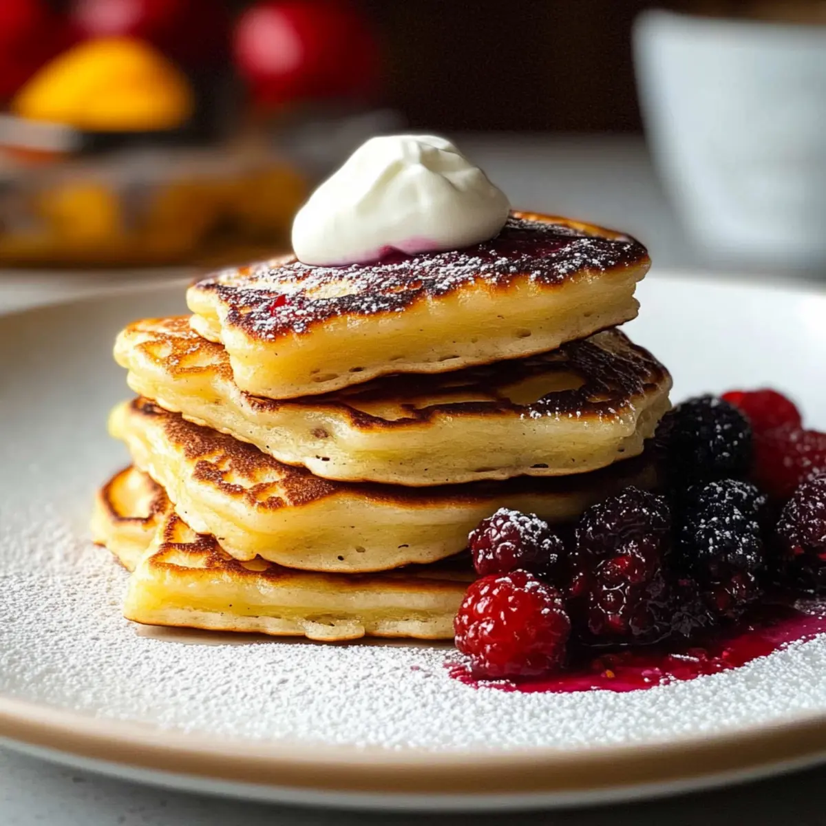 As I flipped my pancakes this morning, the warm aroma of fermentation filled the kitchen, instantly whisking me away to a bustling Lithuanian breakfast table. Indulging in Fluffy Kefir Pancakes has become a cherished weekend ritual for me, and it’s no surprise why: these delightful treats not only boast a uniquely tangy flavor but also add a healthy twist with their probiotic-rich kefir base. Prepared in just a few simple steps, they promise minimal fuss and maximum satisfaction, making them perfect for any home chef looking to elevate their breakfast game. Ready to join me on this tasty journey and discover a new family favorite? Let’s dive into this delightful recipe together! Why Choose Kefir Pancakes? Unique Flavor: The use of kefir brings a delightful tang that sets these pancakes apart from traditional recipes. Probiotic Benefits: Enjoy not only a treat but a healthy twist packed with gut-friendly probiotics. Quick and Easy: Perfect for busy mornings, these pancakes come together in just a few minutes—great for any skill level! Versatile Topping Options: Dress them up with toppings like fresh fruits, honey, or even a dollop of yogurt for endless delightful variations. Crowd-Pleasing: These pancakes are sure to impress friends and family alike, making breakfast special every time. Why not elevate your morning routine with a delicious stack of Kefir Pancakes? Kefir Pancake Ingredients For the Batter Egg – Provides structure and richness for the pancakes; for a vegan option, try a flax egg. Kefir (250g / 1¼ cups) – Adds moisture and a tangy flavor, giving the pancakes their signature fluffiness; buttermilk can be a substitute if needed. All-Purpose Flour (160g / 1¼ cups) – The base ingredient that gives structure to the pancakes; use a gluten-free flour blend for a gluten-free version. Melted Butter or Oil (1 tablespoon) – Adds richness and aids in browning; for a dairy-free option, opt for coconut oil. Baking Soda (½ teaspoon) – Acts as a leavening agent, contributing to the pancakes’ lift; when combined with kefir, it enhances fluffiness. Baking Powder (½ teaspoon) – Another leavening agent for achieving lightness; always check for freshness before use. Caster Sugar (2 tablespoons) – Sweetens and enhances flavor; alternative sweeteners like honey or maple syrup work well too. Salt (a pinch) – Balances sweetness and heightens flavors; it’s essential but can be omitted for a low-sodium diet. For Frying Oil for Frying – Helps prevent sticking and assists with browning; choose an odourless oil to maintain flavor integrity. With this collection of ingredients, you are now ready to create these delightful Kefir Pancakes that bring a touch of Lithuanian tradition to your breakfast table! Step‑by‑Step Instructions for Kefir Pancakes Step 1: Mix Dry Ingredients In a large mixing bowl, whisk together 160g of all-purpose flour, ½ teaspoon of baking soda, ½ teaspoon of baking powder, and a pinch of salt. This dry mixture will provide structure and leavening, creating that delightful fluffiness in your kefir pancakes. Make sure there are no lumps, and set the bowl aside while you prepare the wet ingredients. Step 2: Prepare Wet Ingredients In a separate bowl or a large measuring jug, combine 250g of kefir, one egg, and 2 tablespoons of caster sugar. Add 1 tablespoon of melted butter or oil for richness. Whisk these ingredients together until they are well blended, and you see a smooth, consistent mixture to add that wonderful tang to the kefir pancakes. Step 3: Combine Wet and Dry Mixtures Gently pour the wet mixture into the dry ingredients, taking care to fold them together using a spatula or a wooden spoon. Be cautious not to overmix; a few lumps are perfectly fine! This light folding will keep your batter airy and promise light, fluffy kefir pancakes. Step 4: Heat the Pan Place a large non-stick frying pan over medium heat and add a small amount of oil to the surface to prevent sticking. Allow the pan to warm for about 2 minutes, ensuring it’s hot enough to sizzle when the batter touches it. This step is crucial for achieving that golden-brown crust on your pancakes. Step 5: Cook the Pancakes Spoon 1 heaped tablespoon of batter into the hot pan for each pancake, spreading it slightly with the back of your spoon. Cook for 3–4 minutes until bubbles start to appear on the surface and the edges look set, indicating they’re ready to turn. Don’t rush this step; patience ensures a perfect flip! Step 6: Flip and Finish Carefully flip each pancake using a spatula and continue cooking for another 3–4 minutes on the other side. You’re aiming for a lovely, golden brown color. Once they’re fluffy and fully cooked in the middle, transfer them to a plate. Keeping them warm in a low oven at 200°F (95°C) works well while you cook the remaining batter. Step 7: Serve and Enjoy Finally, serve your delectable kefir pancakes warm with your favorite toppings like fresh fruit, maple syrup, or a dollop of yogurt. Each fluffy bite promises the comforting taste of a traditional Lithuanian breakfast. Enjoy this delightful twist on a classic dish, perfect for special breakfasts or casual weekend brunches! Storage Tips for Kefir Pancakes Room Temperature: Store leftover cooked pancakes at room temperature for up to 2 hours if they’re not topped. Keep them covered with a clean kitchen towel to maintain warmth and moisture. Fridge: Place any uneaten pancakes in an airtight container in the fridge for up to 3 days. It’s best to separate layers with parchment paper to prevent sticking together. Freezer: For longer storage, freeze Kefir Pancakes in a single layer on a baking sheet before transferring to an airtight container. They can last up to a month. Reheating: Reheat frozen pancakes in a toaster or on a skillet over low heat until warmed through. This keeps them fluffy and delicious, just like freshly made! Kefir Pancakes Variations & Substitutions Feel free to ex