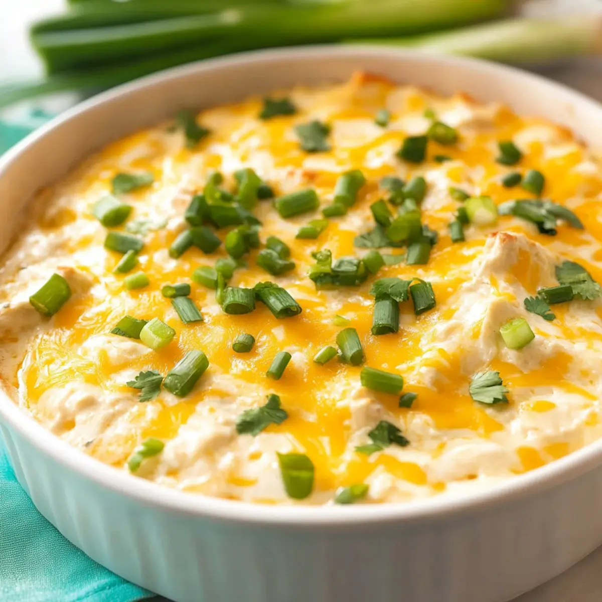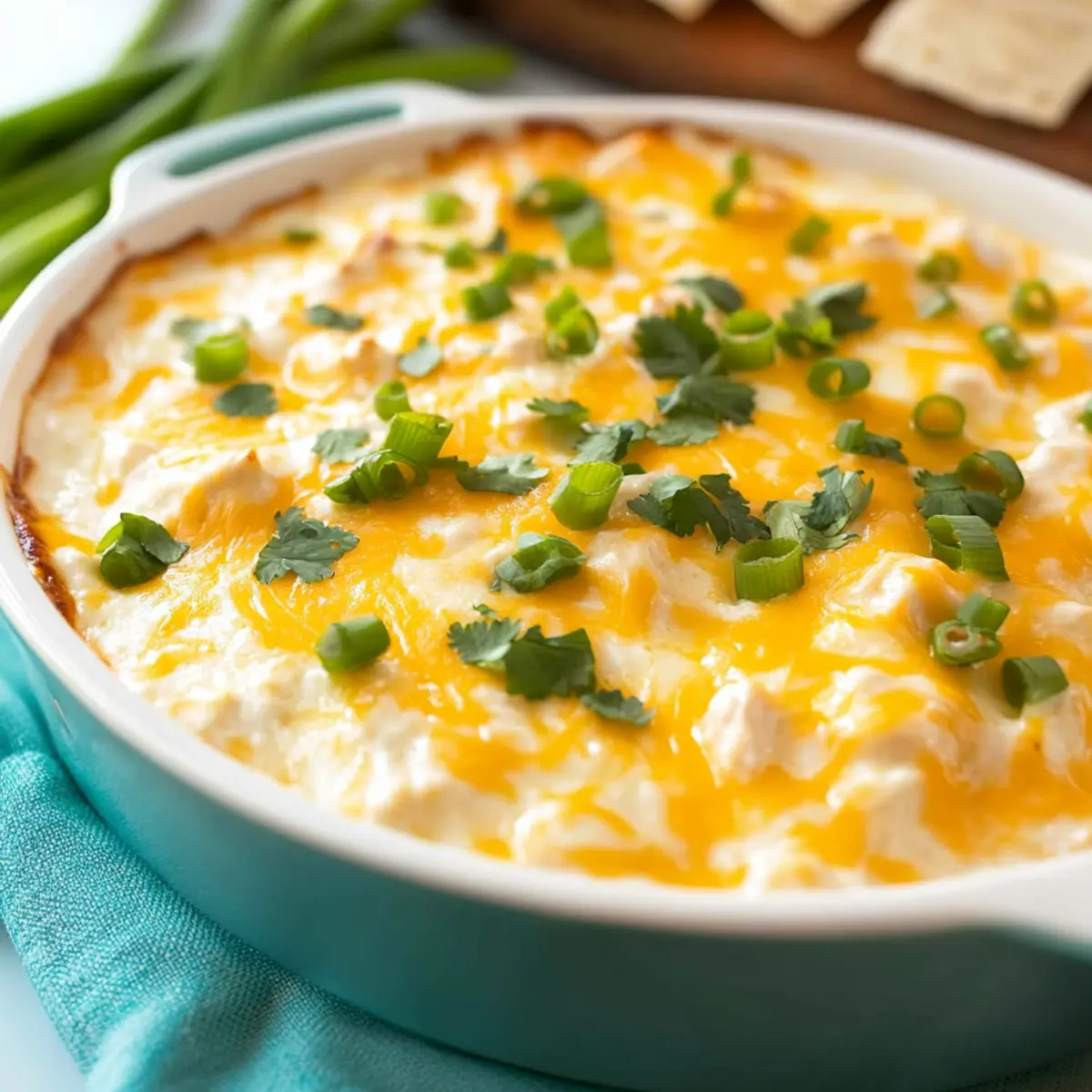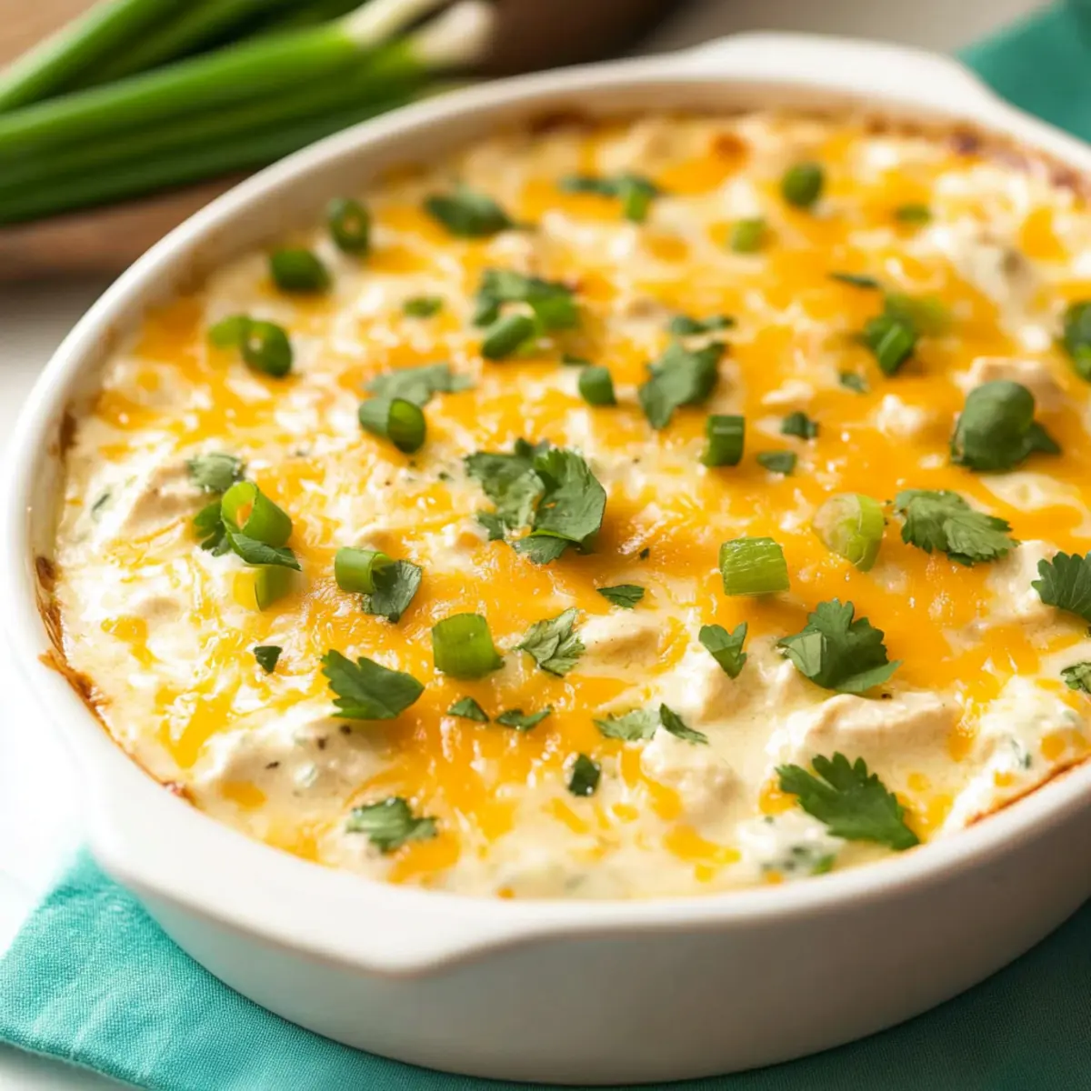 There’s something magical about warm, cheesy dips that brings people together, don’t you agree? My King Ranch Chicken Dip captures the delicious essence of the beloved Texan casserole, minus the tortillas, making it a hit for any gathering. What I love most about this recipe is its simplicity—whip it up in no time with shredded chicken and a handful of flavorful ingredients. Plus, it’s low carb and gluten-free, so everyone can indulge without guilt! Whether you’re throwing a game day bash or just looking to spice up a casual get-together, this dip will have your friends and family coming back for seconds. Wouldn’t you love to dig into a creamy, savory dip that’s perfect for scooping with your favorite chips or fresh veggies? Let’s dive into the details! Why is King Ranch Chicken Dip So Special? Creamy, Comforting Delight: This dip is the ultimate crowd-pleaser, rich and creamy with flavors that warm the soul. Easy to Make: Just mix, bake, and relax! Perfect for busy evenings or spontaneous gatherings. Versatile Appeal: Whether served with tortilla chips or fresh veggies, it complements any snack table beautifully. Diet-Friendly: Being low carb and gluten-free ensures your guests can enjoy without worry—just like the flavors in Lemon Chicken Orzo. Hearty and Filling: Packed with protein from shredded chicken, it keeps everyone satisfied while indulging in a bit of Tex-Mex magic. King Ranch Chicken Dip Ingredients • A flavorful combination that brings joy! For the Dip Cooked shredded chicken – Provides protein and essential texture. Use leftovers for convenience. Shredded Mexican blend cheese (2 1/2 cups) – Adds creaminess and a rich flavor. Can be substituted with cheddar or pepper jack for a spicier option. Sour cream (2 cups) – Contributes to the dip’s creamy consistency. Greek yogurt can be a lower-calorie substitute. Tomatillo salsa verde (16 ounces) – Infuses the dip with tangy flavor. Swapping with green enchilada sauce is an alternative. Chopped green chiles (4 ounces) – Enhances flavor with mild heat. Use jalapeños for a spicier kick. Ranch dressing dip mix (1 packet) – Seasoning base that delivers classic ranch flavor. Dressings can vary; check gluten-free options. Ground cumin (1 teaspoon) – Adds depth and warmth to the dish. Omit or reduce for a milder flavor. For Garnish Chopped scallions or cilantro – For garnish, adding freshness. Use parsley as an alternative. With these delightful ingredients, your King Ranch Chicken Dip will certainly impress your guests! Step‑by‑Step Instructions for King Ranch Chicken Dip Step 1: Preheat and Prepare Begin by preheating your oven to 350°F (175°C). While it warms up, grease a 2-quart baking dish with cooking spray or oil to prevent sticking. This step ensures that your King Ranch Chicken Dip will bake evenly, allowing for that delicious, bubbly top that everyone loves. Step 2: Mix the Dip Ingredients In a large mixing bowl, combine your cooked shredded chicken, 2 cups of shredded Mexican blend cheese, sour cream, tomatillo salsa verde, chopped green chiles, ranch dressing mix, and ground cumin. Mix everything together until you achieve a smooth, creamy consistency. The hues of the ingredients should meld beautifully, creating a vibrant mixture that’s rich in flavor. Step 3: Transfer to Baking Dish Carefully pour the creamy mixture into your prepared baking dish, spreading it evenly with a spatula for uniform cooking. This step is crucial as it lays the foundation for your flavorful King Ranch Chicken Dip. Be sure to reserve ½ cup of cheese for the topping to achieve that perfect cheesy crust. Step 4: Add Cheese Topping Sprinkle the reserved ½ cup of shredded cheese evenly over the dip mixture. This cheese layer will melt and form a beautiful, golden browning as it bakes. Watching it transform in the oven will make you even more excited about serving this delicious dish! Step 5: Bake to Perfection Place the baking dish in the preheated oven and bake for 20-25 minutes. Keep an eye on it, and look for a golden, bubbly edge that indicates the dip is done. The aroma of cheesy goodness will fill your kitchen—get ready for your friends and family to stop by! Step 6: Garnish and Serve Once baked, remove the King Ranch Chicken Dip from the oven and allow it to cool for a few minutes. Then, garnish it with chopped scallions or cilantro for a pop of freshness. Serve it warm with tortilla chips or fresh veggies, and watch everyone dive in for a scoop! King Ranch Chicken Dip Variations Feel free to personalize this creamy dip to make it your very own culinary masterpiece. Rotisserie Chicken: Use shredded rotisserie chicken for a quick and easy prep without sacrificing flavor. The rich taste pairs perfectly with the other ingredients. Spicy Cheese: Substitute with pepper jack cheese to add a delightful kick to your dip. You’ll enhance the flavor profile and make it even more exciting for those who crave heat. Greek Yogurt: Swap out sour cream for Greek yogurt to make it a bit healthier. This substitution keeps that luscious creaminess while cutting some calories. Green Enchilada Sauce: If you’re in the mood for a twist in flavor, replace tomatillo salsa verde with green enchilada sauce. This will lend a unique touch to your dip, transporting your taste buds to another level. Extra Veggies: Incorporate chopped bell peppers or diced spinach for added nutrition and texture. They’ll bring in a pop of color and a fresh taste that livens up each bite. Herbs Galore: Experiment with different herbs as garnishes; fresh basil or oregano can add a surprising and delightful flavor twist. They’ll complement the Tex-Mex elements beautifully. Creamy Avocado: Serve with slices of creamy avocado or guacamole on the side for a rich, satisfying addition. You’ll find that it balances the dip perfectly. These variations not only accommodate different diets and tastes but also invite your creativity to flourish. O