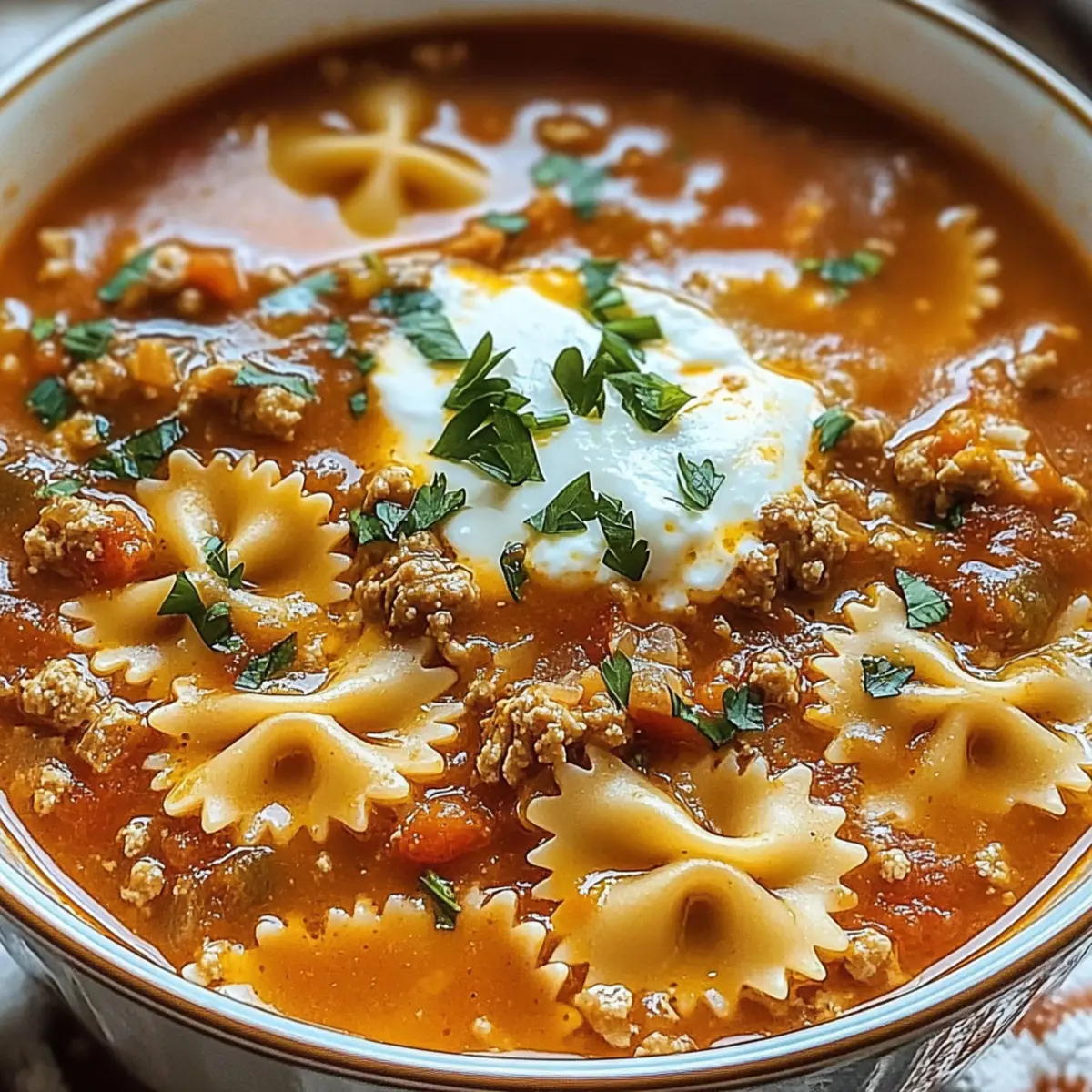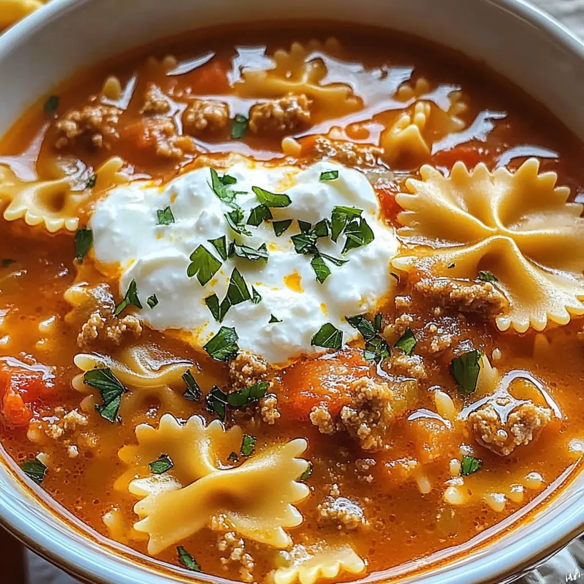 The aroma of simmering tomatoes and melting cheese wafts through your kitchen, transforming the atmosphere into one of pure comfort. Today, I’m excited to share my Cozy One-Pot Lasagna Soup recipe, a delightful twist on the classic lasagna that transports you straight to your favorite Italian eatery—all in a fraction of the time. This soup embodies everything we love about comfort food, offering a quick and customizable meal that easily satisfies even the hungriest of diners. With tender pasta soaked in a rich, creamy broth and topped with gooey cheese, it’s perfect for busy weeknights or cozy family gatherings. So, are you ready to dive into this warm hug of a dish? Let’s get cooking! Why You’ll Love This Lasagna Soup Comforting and Hearty: Each bowl of this Lasagna Soup is like a warm hug, filled with rich flavors and creamy textures that bring back memories of cozy family dinners. Quick and Easy: This one-pot recipe comes together in under 30 minutes, perfect for those busy weeknights when you crave something substantial without a lengthy prep time. Customizable Goodness: Whether you want to use ground turkey for a leaner option or load it up with extra veggies, this soup adapts to your pantry and personal preferences effortlessly. Crowd-Pleasing Meal: Perfect for family gatherings or a casual dinner party, this dish invites everyone to gather around the table, just like traditional meals do. If you love cozy gatherings, pairing it with Easy Lasagna could make it even more delightful! Satisfying Leftovers: This Lasagna Soup stores well, allowing you to enjoy leftovers the next day—just add a splash of broth when reheating to keep it creamy, ideal for lunch or dinner! Lasagna Soup Ingredients • Gather everything you need to create this comforting dish! For the Soup Base Olive Oil – For sautéing; can substitute with canola or vegetable oil. Ground Beef – Provides flavor and heartiness; use ground turkey or chicken for a leaner option. Onion – Adds sweetness and depth; yellow or white works best. Garlic – Enhances flavor; fresh minced garlic is ideal, but garlic powder can work in a pinch. Diced Tomatoes (15 oz can) – Adds sweetness and acidity; keep the juice for a richer flavor. Tomato Sauce – Gives body to the soup; you can mix different tomato products for a unique flavor. Tomato Paste (1/3 cup) – Thickens the soup and intensifies tomato flavor; add more for extra thickness. Chicken Broth (4 cups) – The base liquid; vegetable broth is a great substitute for a vegetarian version. Water (1-2 cups) – Adjusts the soup’s consistency; use less for a thicker result. For Seasoning Italian Seasoning – Blends herbal notes perfectly; substitute with individual herbs like oregano and basil if needed. Sea Salt – Enhances all flavors; adjust according to dietary preferences. Black Pepper – Adds seasoning and a touch of heat. For the Pasta Bowtie Pasta (8 oz, uncooked) – Provides texture and bulk; swap for small pasta shapes like shells, adjusting cooking time as necessary. For the Creamy Finish Ricotta Cheese (1/2 cup) – Adds creaminess; cottage cheese can be a lighter alternative. Mozzarella Cheese (2 oz, shredded) – Top it for a melty finish; feel free to use provolone or your favorite cheese blend. Parmesan Cheese (1/4 cup, shaved or grated) – Offers savory umami notes; optional but highly recommended. For Garnish Fresh Parsley (1/4 cup, chopped) – For a touch of freshness; basil or oregano can substitute for a different herb profile. Dive into the warmth and comfort of this Lasagna Soup with ingredients that promise a deliciously satisfying meal for any occasion! Step‑by‑Step Instructions for Lasagna Soup Step 1: Sauté the Aromatics Begin by heating 2 tablespoons of olive oil in a large pot over medium heat. Once the oil is shimmering, add 1 chopped onion and 2 minced garlic cloves, stirring frequently. Cook them for about 3-5 minutes until they are softened and fragrant, creating a flavorful base for your Lasagna Soup. Step 2: Brown the Beef Next, add 1 pound of ground beef to the pot, breaking it up with a wooden spoon as it cooks. Continue to cook for about 5-7 minutes, or until the beef is browned and no longer pink. This step will infuse the soup with rich, savory flavors that mimic traditional lasagna. Step 3: Incorporate the Tomatoes Once the beef is browned, stir in a 15 oz can of diced tomatoes (with juice), 1 cup of tomato sauce, and 1/3 cup of tomato paste. Mix these ingredients until well combined, ensuring that the tomato base is thick and uniform. This will give your Lasagna Soup its signature hearty texture and flavor. Step 4: Add Broths and Water Pour in 4 cups of chicken broth and 1-2 cups of water, adjusting the amount based on your desired soup consistency. Stir everything together thoroughly and bring the mixture to a boil. The rich broth will complement the tomato mixture perfectly, creating a delicious soup. Step 5: Season the Soup Once boiling, season the soup with 1 tablespoon of Italian seasoning, 1 teaspoon of sea salt, and a few cracks of black pepper. Stir well to ensure even distribution of the spices. The fragrant herbs will enhance the savory flavors, making your Lasagna Soup truly aromatic. Step 6: Cook the Pasta Add 8 oz of uncooked bowtie pasta to the bubbling soup and reduce the heat to medium-low. Simmer for 10-12 minutes, or until the pasta is al dente. Be sure to stir occasionally to prevent the pasta from sticking and to ensure that each piece is well-coated in the delicious broth. Step 7: Mix in the Cheese Once the pasta is cooked, remove the pot from heat and fold in 1/2 cup of ricotta cheese until it’s fully melted and creamy. This addition brings a luxurious texture to your Lasagna Soup, much like the creamy layers of traditional lasagna. Step 8: Final Touch with Mozzarella Lastly, sprinkle 2 oz of shredded mozzarella cheese on top of the soup, allowing it to melt from the residual heat. This s