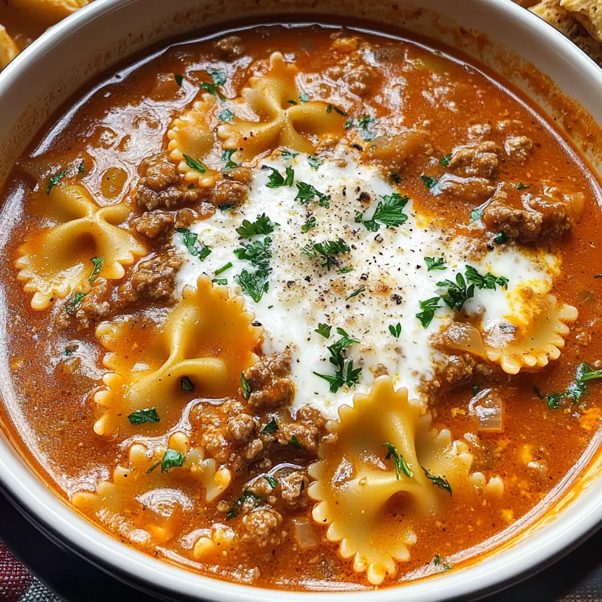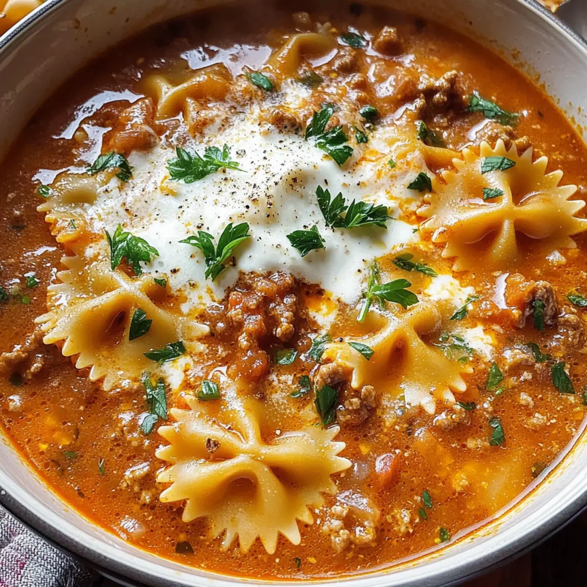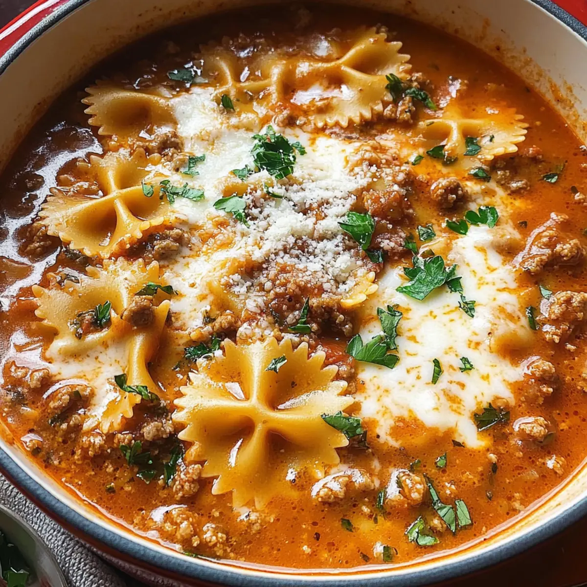 As I stirred the pot, the rich aroma of seasoned tomatoes and melting cheese swept through my kitchen, instantly reminding me of the warmth of family gatherings. This Hearty One-Pot Lasagna Soup transforms the classic lasagna you love into a comforting, easy-to-make soup that’s perfect for any weeknight chaos. With tender pasta, savory ground beef, and a creamy blend of cheeses all simmered together in just 40 minutes, it’s truly a time-saver. Plus, this delightful dish makes for an impressive family-friendly meal that can be easily customized! Whether you want to add some greens or switch up the proteins, the possibilities are endless. So, are you ready to embrace this cozy twist on a timeless favorite? Why is Lasagna Soup a Must-Try? Comforting Cravings: This hearty soup is the perfect antidote to those chilly evenings, encapsulating the warmth of traditional lasagna in every spoonful. Quick and Easy: With only 40 minutes from start to finish, it’s an ideal choice for busy weeknights without sacrificing flavor. Versatile Options: Feel free to experiment with ingredients like spinach or turkey, allowing you to create a unique version every time! One-Pot Wonder: Less mess, more fun! This recipe maximizes ease by cooking everything in a single pot, making clean-up a breeze. Family Appeal: Its combination of creamy cheese and savory meat delights even the pickiest eaters at the dinner table, ensuring a clean bowl every time! For more comforting meals, consider making Turkey Vegetable Soup or serving this with a side of Garlic Bread for a cozy, complete meal! Lasagna Soup Ingredients • Your taste buds are in for a treat with these hearty ingredients! For the Soup Base Ground Beef – Provides rich flavor and protein; swap with ground turkey for a lighter option. Olive Oil – Used for sautéing; adds depth to the flavor. Can be replaced with vegetable oil for a lighter taste. Onion – Brings sweetness and complexity to the soup; shallots or leeks work as substitutions. Garlic – Enhances flavor; use fresh garlic for the best taste or powdered garlic if needed. Diced Tomatoes – Contributes acidity and body; feel free to use canned or fresh. Tomato Sauce – Offers a smooth texture; crushed tomatoes can be a perfect substitute. Tomato Paste – Intensifies tomato flavor; omit if you’re out, just adjust the salt. Chicken Broth – Adds savory notes; swap with vegetable broth for a vegetarian option. Water – Adjusts soup consistency; add more or less to achieve your desired thickness. Italian Seasoning – Blends all flavors beautifully; mix your own with dried oregano, basil, and thyme if needed. Sea Salt and Black Pepper – Essential for seasoning; kosher salt and freshly ground pepper elevate the flavor. For the Pasta and Cheeses Bowtie Pasta – Creates that traditional lasagna feel; feel free to use elbow or rigatoni as alternatives. Ricotta Cheese – Adds creaminess and that classic lasagna texture; cottage cheese works well for a lighter touch. Mozzarella Cheese – Melts beautifully into the soup; substitute with provolone or dairy-free cheese if desired. Parmesan Cheese – Provides a flavorful garnish; it’s optional but highly recommended for finishing touches. Dive into this Lasagna Soup experience and savor the comforting flavors that transform dinnertime into a delightful gathering! Step‑by‑Step Instructions for Hearty One-Pot Lasagna Soup Step 1: Heat the Oil Begin by heating 2 tablespoons of olive oil in a large pot over medium heat. Allow the oil to shimmer, indicating it’s hot enough for cooking. This step will lay the flavorful foundation for your hearty lasagna soup, ensuring the beef and vegetables will sauté beautifully. Step 2: Brown the Beef Add 1 pound of ground beef to the pot, breaking it apart with a wooden spoon. Cook for about 5–7 minutes, or until the meat is browned and no longer pink. This browning will enhance the flavor of your soup, so make sure to stir occasionally for even cooking. Step 3: Sauté Onion and Garlic Once the beef is browned, add 1 diced onion and 3 minced garlic cloves to the pot. Sauté the mixture for approximately 3–4 minutes until the onion becomes translucent and fragrant. This step adds a delightful depth of flavor to your lasagna soup. Step 4: Incorporate Tomatoes and Broth Next, stir in one can of diced tomatoes, 1 can of tomato sauce, and 2 tablespoons of tomato paste. Then pour in 4 cups of chicken broth and 1 cup of water. Add 2 teaspoons of Italian seasoning, and season with sea salt and black pepper. Bring the mixture to a boil, which should take about 5 minutes. Step 5: Add the Pasta Once boiling, add 1 cup of uncooked bowtie pasta to the pot. Reduce the heat to medium-low and let it simmer for about 10 minutes, stirring occasionally, until the pasta is tender. This step ensures the pasta absorbs all the comforting flavors of the lasagna soup. Step 6: Stir in the Cheeses After the pasta is cooked, remove the pot from heat and stir in ½ cup of ricotta cheese and 1 cup of shredded mozzarella cheese. Mix until the cheeses are melted and fully incorporated, creating a creamy texture in your hearty one-pot lasagna soup. Step 7: Serve and Garnish Ladle the lasagna soup into bowls and garnish with freshly grated Parmesan cheese and chopped parsley. This final touch adds a perfect finishing flavor and presentation, inviting everyone to enjoy the comforting goodness of your homemade soup. Make Ahead Options These Hearty One-Pot Lasagna Soup components are perfect for busy home cooks looking to save time! You can prep the soup base—browning the ground beef, sautéing the onions and garlic, and adding the tomatoes, broth, and seasonings—up to 24 hours in advance. Store this mixture in an airtight container in the refrigerator, and when you’re ready to serve, bring it to a boil and add the uncooked bowtie pasta. This method ensures that the pasta absorbs all the rich flavors of the soup while keeping it j