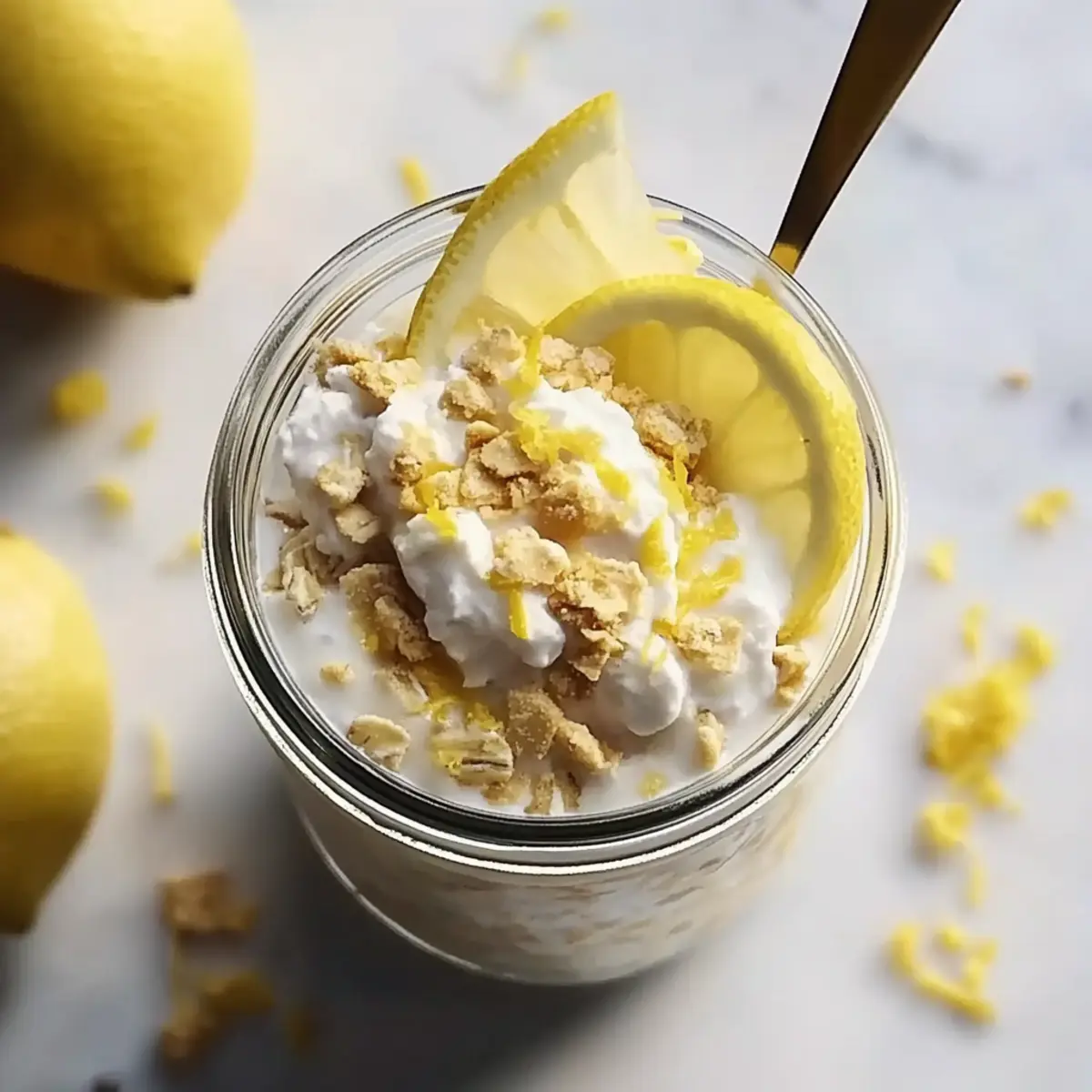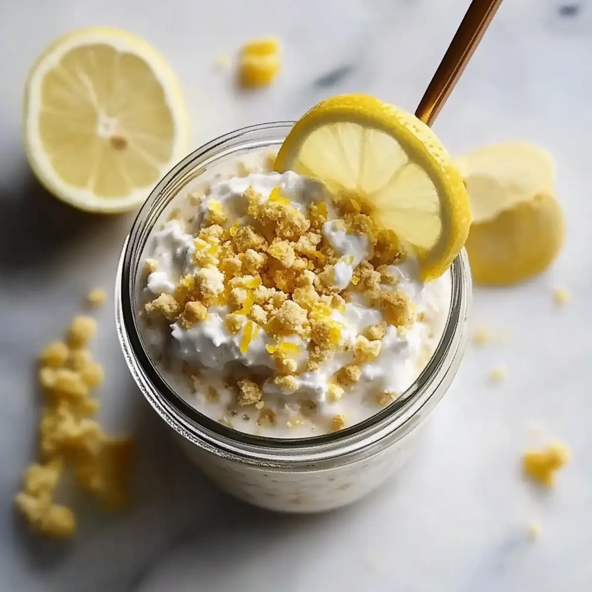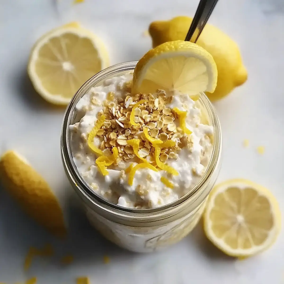 As I poured my morning coffee, the tangy scent of fresh lemons danced through my kitchen, reminding me of sunlit summer days. That’s when I realized it was time to whip up a batch of Lemon Cheesecake Overnight Oats. With just a few simple steps, I could create a creamy, no-bake delight that’s not only high in protein but also customizable to fit any dietary preference. Imagine starting your day with a breakfast that combines the satisfying crunch of graham crackers with the smoothness of cheesecake—what’s not to love? This make-ahead recipe is a game changer for busy mornings or when you’re just craving something a little special. Are you ready to awaken your taste buds and embrace a guilt-free indulgence? Let’s dive into the delicious details! Why try Lemon Cheesecake Overnight Oats? Delightful Creaminess: The blend of Greek yogurt and cream cheese delivers a rich, cheesecake-like texture that feels indulgent. No-Bake Convenience: Perfect for busy mornings, these oats are made ahead of time and require zero cooking! Customizable Fun: Whether you want to go vegan, add extra protein, or swap flavors with berries, the options are endless! Nutrient-Packed Start: Loaded with protein and fiber, these oats ensure you kick off your day healthily. Crowd-Pleaser: Great for sharing or enjoying solo, they’re sure to impress friends or family members alike! You might also enjoy trying out our delightful Italian Lemon Pistachio for an extra citrusy treat. Lemon Cheesecake Overnight Oats Ingredients For the Crust Graham Crackers – Crushed to create a delicious cheesecake-flavored base; swap with gluten-free crackers if needed. Milk of Choice – Used to moisten the crust and oats; choose from dairy, almond, oat, or soy based on dietary preferences. For the Oats Rolled Oats – Provide structure and fiber; quick or minute oats work best—skip steel-cut for this no-bake recipe. Chia Seeds – Thicken the mixture and add nutritional benefits; can be omitted if you prefer a simpler version. Vanilla Protein Powder – Optional for a protein boost; consider using a plant-based powder for a vegan option. Vanilla Extract – Infuses the mixture with rich flavor; pure extract is best for optimal taste. Lemon Zest – Adds a refreshing, citrusy flavor; use freshly grated zest for an aromatic punch. For the Cheesecake Topping Plain Greek Yogurt – Forms the creamy base of the topping and adds protein; substitute with dairy-free yogurt for a vegan alternative. Honey – Provides natural sweetness; maple syrup can serve as a great vegan swap. Light Cream Cheese – Optional for a richer topping texture; can be omitted or replace with dairy-free cream cheese for a lighter version. Lemon Juice – Elevates the lemon flavor, bringing that cheesecake profile to life. Get ready for a breakfast that’s as delightful as it is nutritious with these Lemon Cheesecake Overnight Oats! Step‑by‑Step Instructions for Lemon Cheesecake Overnight Oats Step 1: Prepare Crust In a medium bowl, mix together the crushed graham crackers and milk until combined. Press this mixture firmly into the bottom of a mason jar or container, creating a compact crust layer. The crust should be slightly damp but hold its shape—perfect for capturing that cheesecake flavor in your Lemon Cheesecake Overnight Oats. Step 2: Mix Oats In another bowl, combine the rolled oats, chia seeds, vanilla protein powder (if using), milk, vanilla extract, and lemon zest. Stir vigorously for about 1-2 minutes to ensure all ingredients are well incorporated. The mixture should be evenly combined with a slightly thick consistency, providing the essential texture for your overnight oats. Step 3: Assemble Layers Carefully pour the oat mixture over the prepared crust in your jar. Gently tap the jar on the counter to settle the oats and remove any air bubbles. This step is crucial for achieving a delightful layering effect in your Lemon Cheesecake Overnight Oats, ensuring every bite has that luscious cheesecake flavor followed by the creamy oat layer. Step 4: Make Cheesecake Topping In a separate mixing bowl, blend the plain Greek yogurt, honey, cream cheese (if using), and lemon juice until the mixture is smooth and creamy. This typically takes about 2-3 minutes of whisking to achieve a perfectly velvety topping. The consistency should be thick yet spreadable, ready to complement your delicious oats. Step 5: Layer Top Spread the cheesecake topping evenly over the oat mixture in the jar, making sure to cover the oats completely. Use a spatula for an even texture, and consider leaving a little room at the top of the jar for free movement. This luscious layer adds the signature cheesecake flavor to your Lemon Cheesecake Overnight Oats, making them irresistibly delightful. Step 6: Chill Cover the jar with a lid and refrigerate for at least 2 hours, but ideally overnight. Allowing the mixture to chill lets the flavors meld beautifully, transforming your Lemon Cheesecake Overnight Oats into a refreshing breakfast experience. The oats will absorb the moisture and soften, creating a delightful contrast between the creamy topping and the crust. Step 7: Garnish Before serving, feel free to sprinkle extra crushed graham crackers and a bit of lemon zest on top for added texture and an inviting presentation. This final touch enhances the visual appeal of your Lemon Cheesecake Overnight Oats, making them not just tasty but also aesthetically pleasing for a delightful breakfast treat. Storage Tips for Lemon Cheesecake Overnight Oats Fridge: Store your Lemon Cheesecake Overnight Oats in the refrigerator for up to 3 days. Make sure they are covered to maintain freshness and avoid any fridge odors. Freezer: While it’s best not to freeze these oats due to potential texture changes, you can freeze individual portions in airtight containers for up to 1 month. Thaw overnight in the fridge before consuming. Reheating: If you prefer your oats warm, simply microwave them 