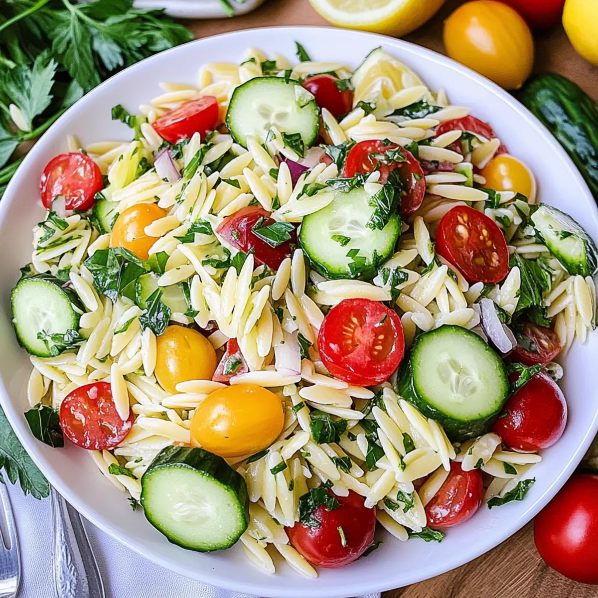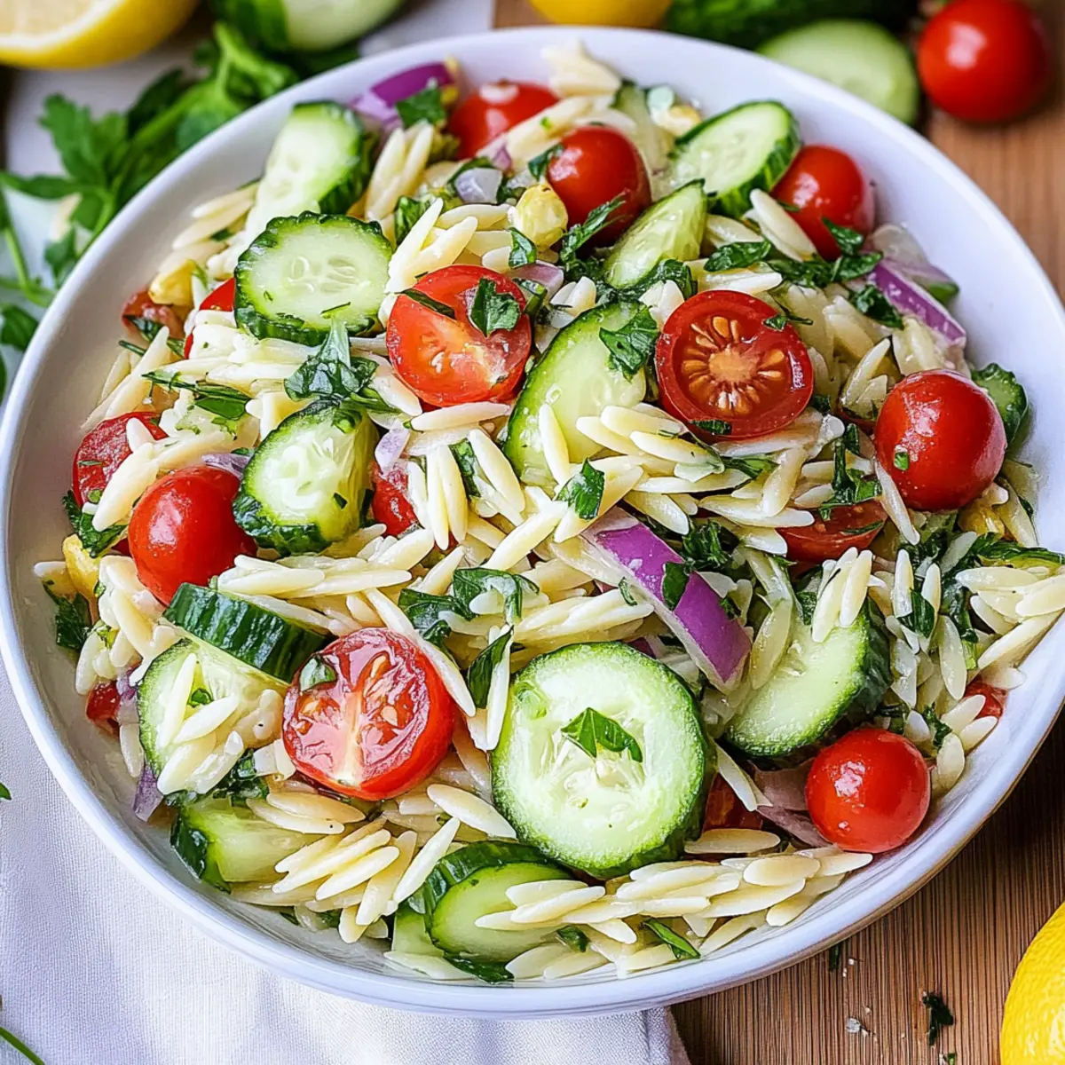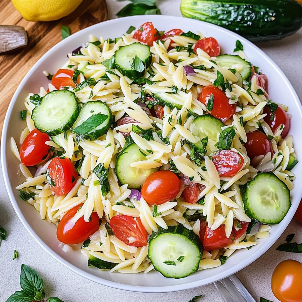 Summer is around the corner, and as the days grow longer, I find myself dreaming of lighter, brighter meals. That’s where my Refreshing Lemon Orzo Salad comes into play! This dish is a delightful mix of juicy cherry tomatoes, crisp cucumbers, and fragrant herbs, making it a perfect side for potlucks, BBQs, or just a light lunch. It’s wonderfully versatile—customize it with your favorite veggies or proteins for a meal that’s as unique as you are. Plus, it’s quick to prepare, so you won’t be stuck in the kitchen when you could be outside enjoying the sunshine. Are you ready to give your warm-weather gatherings a fresh twist? Let’s dive into this vibrant salad that’s sure to impress! Why is Lemon Orzo Salad So Refreshing? Bright, Fresh Ingredients: This salad showcases vibrant vegetables like cherry tomatoes and cucumbers that elevate any meal. Quick Prep Time: With just a few steps, you can have a delightful dish ready in no time, perfect for last-minute gatherings. Versatile Customization: Easily swap in your favorite veggies or add protein for a personal touch to satisfy your cravings. Cool and Crisp: Ideal for summer, this salad offers a refreshing alternative to heavier pasta dishes, keeping you light on those warm days. Crowd-Pleasing Delight: Perfect for parties or picnics, it’s a dish that will impress your guests without hours of cooking. Enjoy it alongside grilled meats or a Crab Salad Refreshing for a summer feast! Lemon Orzo Salad Ingredients • Fresh and vibrant, these ingredients come together to create a dish that will leave everyone wanting more! For the Salad Orzo – The base of the Lemon Orzo Salad, cooked to al dente for the perfect bite. English Cucumber – Adds a refreshing crunch; can substitute with any variety, but English cucumbers have fewer seeds. Cherry Tomatoes – Infuse sweetness and color; halve larger tomatoes for even bite-sized pieces. Kalamata Olives – Introduces a savory touch; green olives can be swapped for a different flavor profile. Fresh Parsley – Provides herbs and freshness; cilantro works as a delightful alternative. Fresh Basil – Enriches the Mediterranean essence; use fresh instead of dried for optimal flavor. Fresh Mint – Adds a refreshing zing; completely optional but highly recommended for a bright twist. Olive Oil – Binds the salad while imparting richness; high-quality extra virgin is best for flavor. Lemon (Zest and Juice) – Delivers brightness and acidity; freshly squeezed juice is essential for the best taste. Parmesan Cheese Shavings – Optional garnish for savory richness; omit for a vegan-friendly version. Salt & Pepper – Crucial for enhancing overall flavor. This Lemon Orzo Salad comes together effortlessly, providing a delightful and fresh dish that’ll brighten up any gathering! Step‑by‑Step Instructions for Lemon Orzo Salad Step 1: Cook the Orzo Begin by bringing a large pot of salted water to a rolling boil over high heat. Add the orzo and cook according to package instructions, usually about 8–10 minutes, until it reaches al dente. Once cooked, drain the orzo in a colander and quickly rinse it under cold water to stop the cooking process, preventing it from becoming mushy. Step 2: Prepare the Vegetables While the orzo cooks, wash and chop the vegetables for the Lemon Orzo Salad. Quarter the English cucumber, halve the cherry tomatoes, and slice the kalamata olives. Aim for bite-sized pieces to ensure a pleasant texture. Set these colorful veggies aside to enhance the salad’s freshness and crunch. Step 3: Chop the Herbs Next, grab a sharp knife and finely mince the fresh parsley, basil, and optional mint. The fragrant herbs will infuse your Lemon Orzo Salad with a burst of flavor. You should have about a cup of chopped herbs combined, which will beautifully complement your salad and create a vibrant appearance. Step 4: Combine Ingredients In a large mixing bowl, combine the cooked orzo, chopped vegetables, and minced herbs. Drizzle in the olive oil and freshly squeezed lemon juice, adding the lemon zest for an extra zing. Season with salt and pepper to taste, then stir gently but thoroughly to ensure everything is well mixed and coated in the zesty dressing. Step 5: Serve the Salad Transfer the Lemon Orzo Salad to a serving dish and spread it out evenly. If desired, top with shaved parmesan cheese for a rich flavor and inviting presentation. This salad can be served chilled or at room temperature, making it perfect for gatherings. For the best taste, consider letting it chill in the refrigerator for at least an hour before serving to allow the flavors to meld beautifully. Lemon Orzo Salad Variations & Substitutions Feel free to get creative and make this Lemon Orzo Salad truly your own with these delightful twists! Vegetable Swap: Replace cucumbers with bell peppers or diced zucchini for a colorful crunch. Adding variety keeps the salad exciting every time! Protein Boost: Stir in grilled chicken or chickpeas for a satisfying, complete meal that’s great for lunch or dinner. It’s an easy way to transform a side dish into a main! Cheese Alternatives: Use feta or goat cheese instead of parmesan for a different flavor, or omit cheese entirely for a dairy-free version that remains deliciously vibrant. Flavor Upgrade: Toss in a handful of sun-dried tomatoes or roasted red peppers for an added depth of flavor and a Mediterranean twist that you’ll love. Herb Mix: Don’t be shy about swapping fresh parsley and basil with arugula or spinach for a peppery kick. This can really elevate the freshness of your salad! Citrus Variety: Experiment with other citrus fruits like lime or orange juice in place of lemon for a unique brightness. It’ll be a fun surprise that tickles your taste buds. Nutty Crunch: Add some toasted pine nuts or sliced almonds for a delightful crunch that complements the textures, taking your Lemon Orzo Salad to the next level. Heat Element: If you enjoy a little spice, c