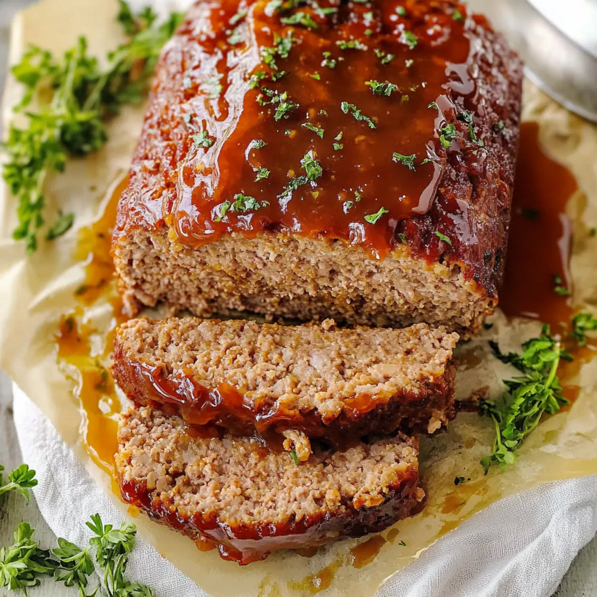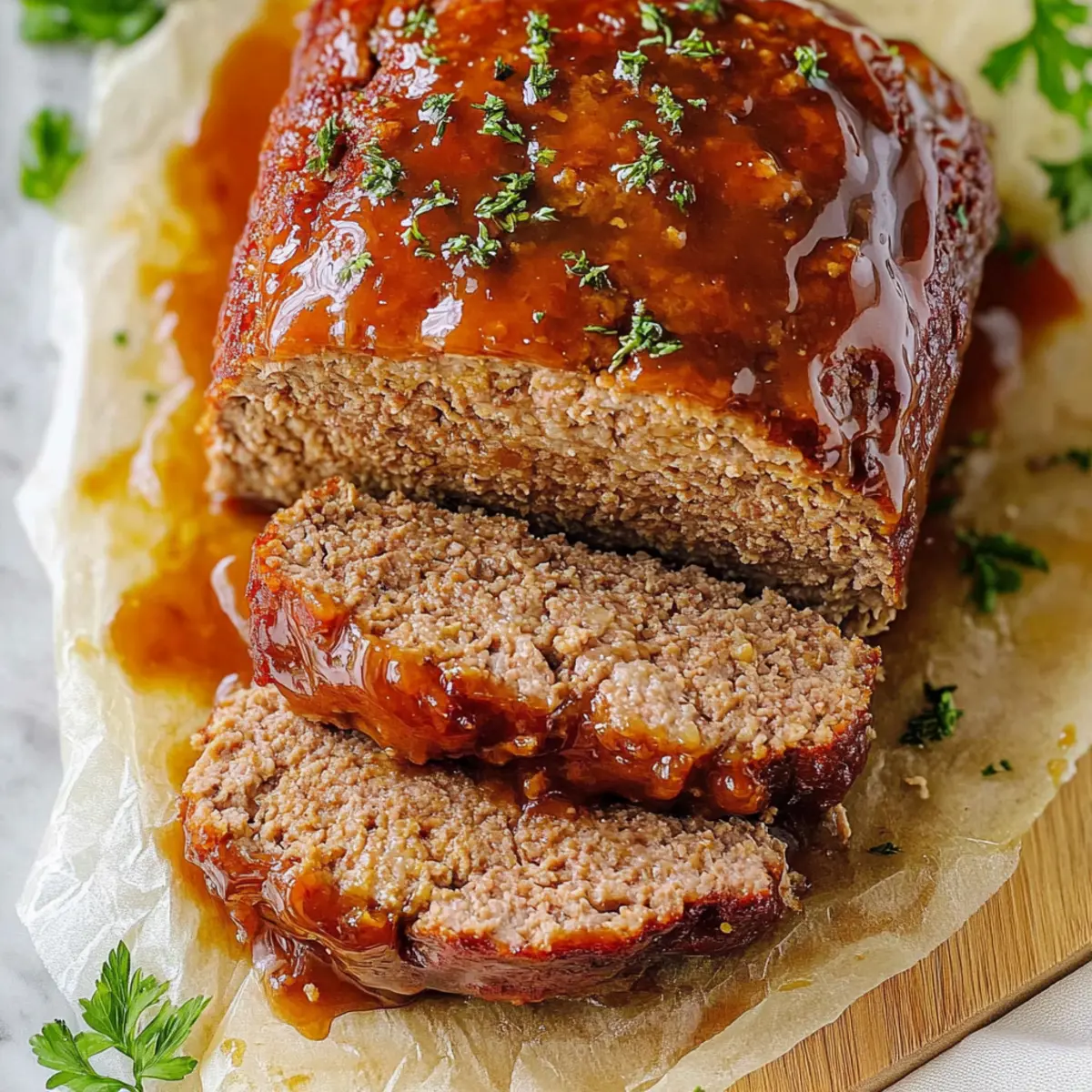 Walking into my kitchen, I’m often enveloped by scents that transport me back to family dinners filled with laughter and warmth. One dish that takes center stage in those cherished memories is my Juicy Classic Meatloaf with Sweet and Tangy Glaze. This recipe is not only a nostalgic nod to comfort food but also a good source of high protein, making it as satisfying as it is nourishing. Plus, it’s a breeze to whip up, perfect for those busy weeknights when the family craves something hearty yet homemade. With a beautiful caramelized glaze that brings everything together, this meatloaf promises to become a new favorite at your table. Are you ready to create your own slice of delicious nostalgia? Why is this meatloaf a must-try? Juicy, heartwarming goodness: This meatloaf is designed to melt in your mouth, delivering flavors reminiscent of home-cooked family meals. Quick prep time: With a streamlined cooking process, it’s perfect for busy nights when you need comfort food without the fuss. Protein-packed delight: A high-protein dish that keeps everyone satisfied and energized, making it ideal for family gatherings or meal prep. Versatile variations: Want to spice things up? Feel free to swap half the beef for ground turkey or add a kick of hot sauce! Irresistible glaze: The sweet and tangy glaze not only enhances flavor but creates a beautiful caramelized outer layer that’s hard to resist. Tasty leftover possibilities: Enjoy it the next day in sandwiches, salads, or as a pie filling—so many delicious options await you! Don’t forget to check out our tips for perfecting your meatloaf! Meatloaf Ingredients For the Meatloaf Ground Beef – Provides protein and richness; you can replace half with ground turkey or pork for a different flavor. Onion – Adds moisture and sweetness; finely chop and sauté for enhanced flavor. Olive Oil – Used for sautéing onions; any neutral oil can be substituted if needed. Eggs – Binds the mixture to maintain shape; no substitutions recommended for best results. Garlic Cloves – Enhance the savory flavor profile; fresh minced garlic is preferred for optimal taste. Ketchup – Adds sweetness and moisture to the meatloaf; you can swap it for BBQ sauce for a unique twist. Fresh Parsley – Provides freshness and color; dried parsley works in a pinch if fresh isn’t available. Panko Breadcrumbs – Gives the meatloaf its classic texture; gluten-free breadcrumbs are a great substitute. Milk – Adds moisture to the mixture; almond milk is a lactose-free alternative. Salt – Enhances overall flavor; feel free to adjust according to taste. Italian Seasoning – Offers a blend of herbs for flavor; individual herbs like oregano and basil can be used too. Ground Black Pepper – Provides mild heat; white pepper can be a good alternative for a different flavor. For the Glaze Ketchup – Sweet and tangy topping; it caramelizes in the oven, enhancing the meatloaf’s flavor. White Vinegar – Balances sweetness in the glaze; apple cider vinegar can also be used for a twist. Brown Sugar – Adds sweetness and that rich molasses flavor to the glaze. Garlic Powder & Onion Powder – Enhances the savory depth; fresh alternatives are best if you have them on hand. Step‑by‑Step Instructions for Juicy Classic Meatloaf with Sweet and Tangy Glaze Step 1: Preheat the Oven Begin by preheating your oven to 350°F (175°C). While the oven warms up, line a rimmed baking sheet with parchment paper to make cleanup easier. This step is vital for ensuring that your meatloaf cooks evenly and that the baked-on glaze doesn’t stick, so get that oven ready! Step 2: Sauté the Onions In a skillet, heat 1 teaspoon of olive oil over medium heat. Add the finely chopped onions and sauté them for about 5-7 minutes, or until they turn golden and aromatic. This process enhances their sweetness and depth of flavor, which is essential for your Juicy Classic Meatloaf. Once done, set the sautéed onions aside to cool slightly. Step 3: Combine Ingredients In a large mixing bowl, combine the ground beef, sautéed onions, minced garlic, eggs, ketchup, fresh parsley, panko breadcrumbs, milk, salt, Italian seasoning, and ground black pepper. Using clean hands or a spatula, mix gently until just combined. Be careful not to over-mix, as this will help keep your meatloaf tender and moist. Step 4: Shape and Bake Transfer the mixture onto the prepared baking sheet and shape it into a loaf. Aim for a uniform thickness to ensure even cooking. Place the meatloaf in the preheated oven and bake for about 40 minutes. You’ll know it’s time for the next step when the edges turn a nice brown, and it starts to firm up. Step 5: Prepare the Glaze While the meatloaf is baking, whisk together ketchup, white vinegar, brown sugar, garlic powder, and onion powder in a separate bowl. This glaze will provide a sweet and tangy finish that beautifully contrasts with the savory meatloaf, so ensure it’s well mixed and set aside for later. Step 6: Glaze and Finish Baking After the initial 40 minutes of baking, carefully remove the meatloaf from the oven. Generously spread the prepared glaze over the top, making sure to cover every inch. Return it to the oven for another 20 minutes or until the internal temperature reaches 160°F (70°C). The glaze should caramelize, adding a gorgeous finish. Step 7: Let It Rest Once baked, remove your Juicy Classic Meatloaf from the oven and let it rest for 10-15 minutes. This important step allows the juices to redistribute, making it easier to slice without falling apart. Prepare yourself for a delicious, tender slice of meatloaf that’ll be a hit with the family! Expert Tips for Meatloaf Optimal Beef Selection: Use 80% to 85% lean ground beef for a rich, juicy meatloaf without excess grease. Anything leaner can dry out. Don’t Skip Sautéing: Sautéing the onions before mixing is key to deepening their flavor, enhancing the overall taste of your meatloaf. Gentle Mixing Only