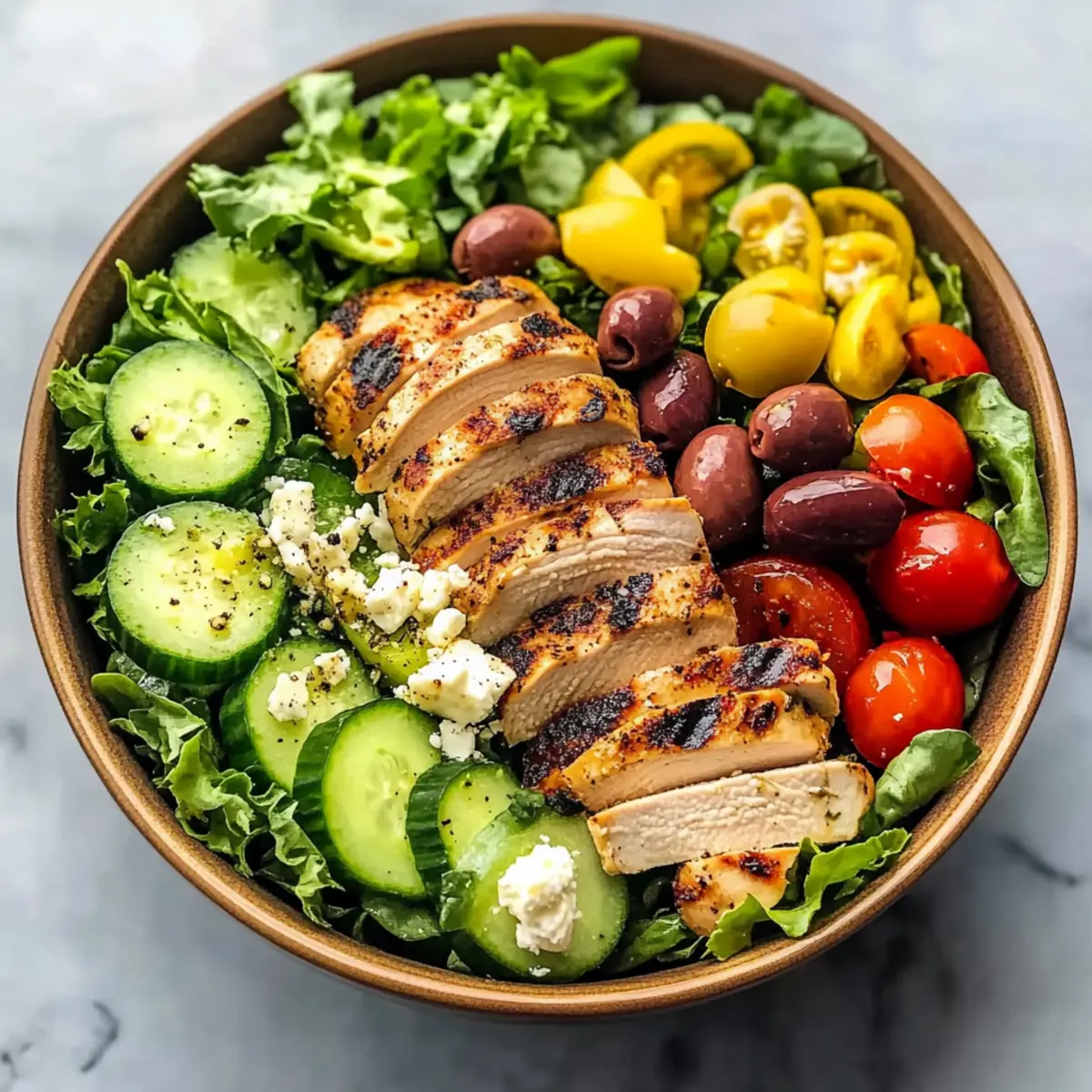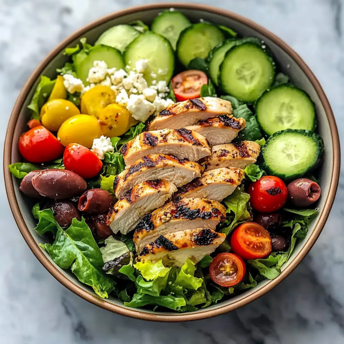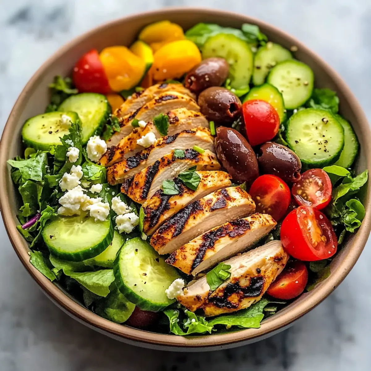 Fresh and Flavorful: This salad bursts with vibrant flavors, combining juicy grilled chicken, tangy feta, and briny olives that create an explosion of taste in every bite.