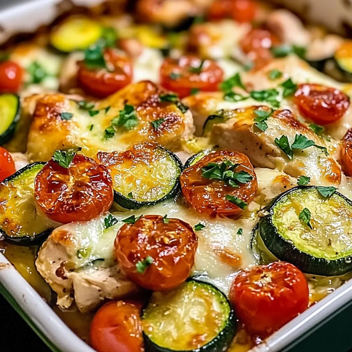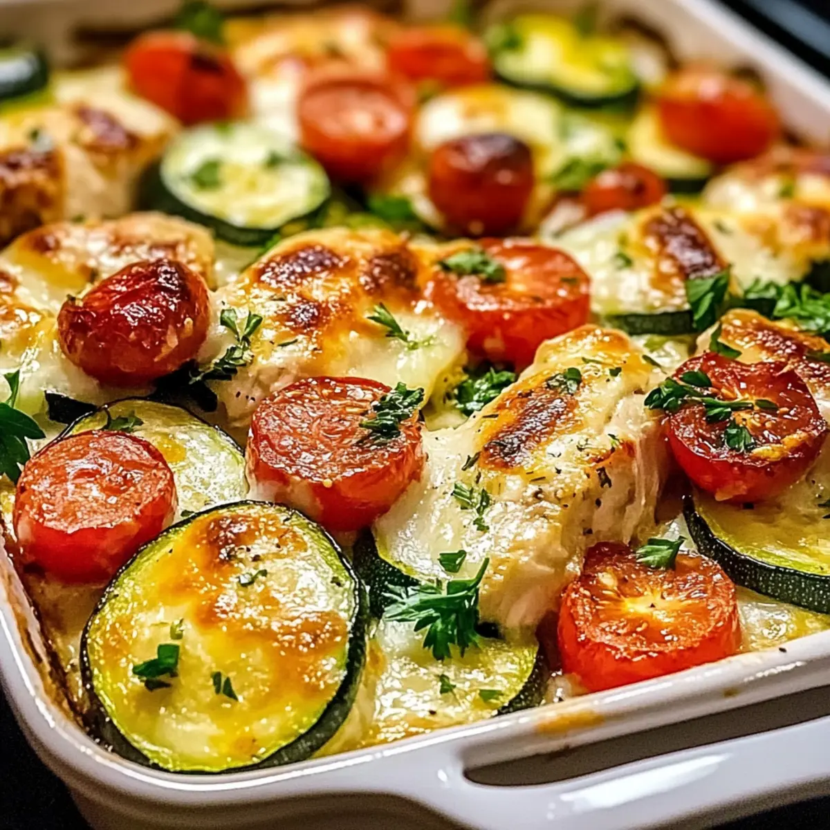 As I pulled the warm Mediterranean Chicken Zucchini Bake from the oven, a delightful aroma enveloped my kitchen, transporting me straight to sun-drenched coasts and bustling markets. This one-pan meal is a game-changer for busy nights when cooking feels like more of a chore than a joy. With tender chicken, juicy zucchini, and a gooey cheese topping, this dish is not only gluten-free but also healthy—perfect for anyone wanting a guilt-free indulgence. Plus, it’s made with wholesome ingredients that you likely already have in your pantry, making meal prep a breeze. Imagine delighting friends and family with this quick and flavorful delight that checks all the boxes for nutrition and taste. Ready to scoop out a plate of culinary joy? Let’s dive into this Mediterranean marvel together! Why is this Mediterranean Bake a Must-Try? Vibrant Flavors: This Mediterranean Chicken Zucchini Bake bursts with fresh, lively tastes that transport you to sunny shores. One-Pan Wonder: Cleanup is a breeze with everything cooked in just one dish, saving you precious time. Customizable Delight: Feel free to swap ingredients based on what you have on hand, like using eggplant or enhancing with different spices. Nutritious Comfort: Packed with wholesome ingredients, this dish is both healthy and satisfying, proving that comfort food can be guilt-free. Quick Assembly: With minimal prep and cooking time, this recipe is perfect for busy weeknights and effortless family meals. Crowd-Pleaser: Your family and friends will be raving about the flavors, making it a go-to dish for gatherings—consider pairing it with a refreshing side salad for extra crunch! Mediterranean Chicken Zucchini Bake Ingredients For the Chicken and Veggies • Chicken Breast – Provides protein and tender texture; use skinless for a healthier option. • Zucchini – Adds moisture and a slight crunch; substitute with eggplant or bell peppers if desired. • Cherry Tomatoes – Contributes sweetness and acidity; any seasonal tomato variety can work well. • Red Onion – Imparts sweetness and flavor; yellow onion makes a suitable substitute. • Minced Garlic – Delivers aromatic depth; garlic powder can be used for convenience. For Seasoning and Cooking • Olive Oil – Aids in cooking and flavor infusion; avocado oil is a great alternative. • Oregano – Brings Mediterranean flavor; Italian seasoning mix can be used if oregano is unavailable. • Basil – Enhances freshness; dried basil can work if fresh isn’t available. • Smoked Paprika – Adds a subtle smokiness; regular paprika or cayenne can be swapped in. • Salt & Black Pepper – Essential seasonings that enhance flavor; adjust according to preference. • Red Pepper Flakes – Adds heat; omit for a milder dish. For the Cheesy Topping • Shredded Mozzarella Cheese – Provides a creamy topping; any meltable cheese can be used as a substitute. • Grated Parmesan Cheese – Offers a savory finish; Pecorino can also be a tasty alternative. For Garnish • Fresh Parsley – Adds color and freshness; consider using basil or cilantro as alternatives. This Mediterranean Chicken Zucchini Bake is a delightful blend of flavors and textures, making it a favorite for those who cherish home-cooked meals! Step‑by‑Step Instructions for Mediterranean Chicken Zucchini Bake Step 1: Preheat the Oven Begin by preheating your oven to 375°F (190°C). This ensures an even cooking temperature for your Mediterranean Chicken Zucchini Bake, helping to achieve that perfect blend of tender chicken and soft vegetables. Take a moment to enjoy the warm aromas that will soon fill your kitchen! Step 2: Prepare the Baking Dish Lightly grease a 9×13-inch baking dish with olive oil, ensuring all edges are coated to prevent sticking. This simple step will make your cleanup easier later. Once greased, set the dish aside, ready to hold your delicious mixture. Step 3: Combine Ingredients In a large mixing bowl, combine the cubed chicken breast, sliced zucchini, halved cherry tomatoes, chopped red onion, and minced garlic. Stir the mixture well to ensure the fresh ingredients are evenly distributed, blending their vibrant colors and flavors together beautifully. Step 4: Add Seasonings Pour in the olive oil and sprinkle in the oregano, basil, smoked paprika, salt, pepper, and optional red pepper flakes. Using a large spoon, mix everything thoroughly until the chicken and vegetables are fully coated in the aromatic seasonings, ensuring a lively taste throughout your Mediterranean Chicken Zucchini Bake. Step 5: Spread in the Dish Now, spread the seasoned mixture evenly in your prepared baking dish. Make sure to distribute the chicken and vegetables in a single layer to allow for even cooking and browning. This step sets the foundation for a visually appealing and delicious final dish. Step 6: Add Cheese Toppings Generously sprinkle the shredded mozzarella and grated Parmesan cheese over the top of the chicken and vegetable mixture. This melty layer will give your Mediterranean Chicken Zucchini Bake a rich, golden crust that not only tastes great but also looks inviting. Step 7: Cover and Bake Cover the baking dish with aluminum foil and place it in the preheated oven. Bake for 20 minutes to help keep the moisture locked in, allowing the chicken to cook through while the veggies soften and flavors meld beautifully. Step 8: Uncover and Finish Baking After 20 minutes, carefully remove the foil and return the dish to the oven. Bake for an additional 10-15 minutes, watching for the cheese to turn golden and bubbly. Ensure the chicken reaches an internal temperature of 165°F (75°C) for optimal safety and flavor. Step 9: Garnish and Serve Once cooked, remove the Mediterranean Chicken Zucchini Bake from the oven. Sprinkle fresh parsley over the top for a pop of color and freshness. Let it cool for a few moments before serving warm, allowing all those vibrant flavors to shine through as you dish it up! Make Ahea