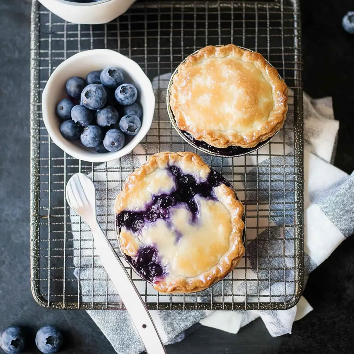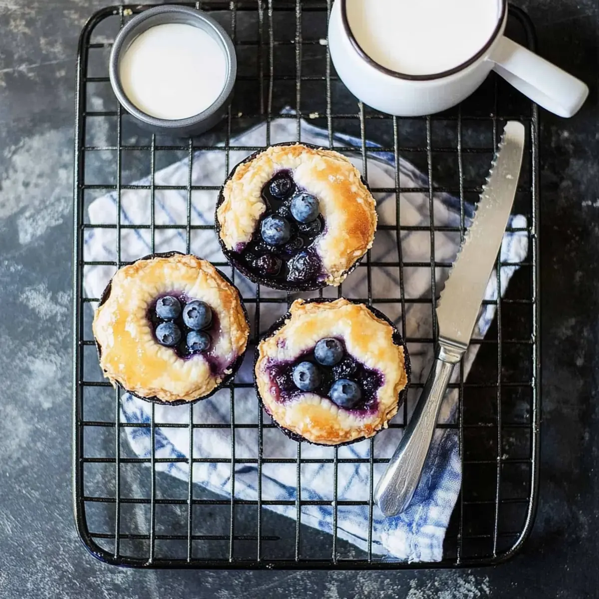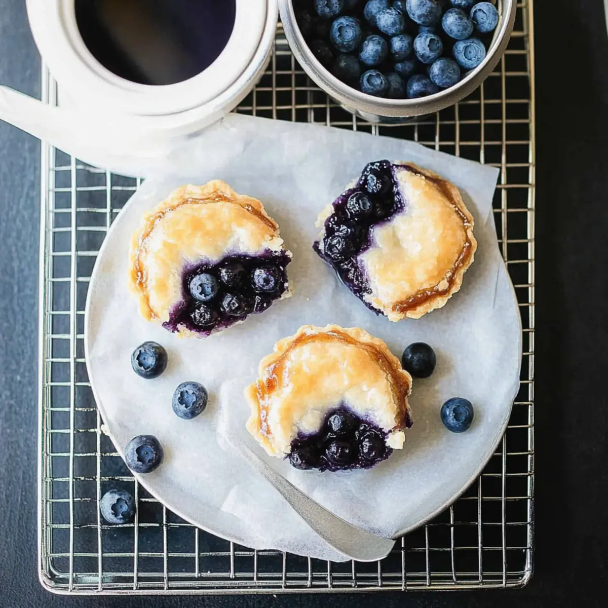 “Have you ever found yourself face-to-face with the perfect dessert moment? That’s exactly how I felt when I discovered these Mini Blueberry Pies. With a buttery, flaky crust that cradles a tangy lemon-blueberry filling, these little wonders are not just a treat—they’re a celebration in every bite. They’re a quick, crowd-pleasing solution for summer gatherings or a warm, cozy evening at home, and the best part? You can whip them up in no time, using either homemade or store-bought crust. Whether you’re aiming for a gluten-free option or simply want something delightful, these mini pies do it all. Ready to learn how to create an individual dessert that will have everyone asking for seconds?” Why Are Mini Blueberry Pies So Irresistible? Individual Portions: These delightful mini blueberry pies are perfect for sharing, allowing everyone to indulge without the fuss of slicing a larger dessert. Bursting with Flavor: With their vibrant lemon-blueberry filling, every bite is a refreshing explosion of sweetness and tang, captivating your taste buds. Quick & Easy: Whether you choose homemade pie crust or store-bought, this recipe is a breeze, making it ideal for busy days or last-minute gatherings. Versatile Options: Experiment with different fruits or add a streusel topping for unique twists. You can even enjoy these with a scoop of ice cream or a dollop of whipped cream for an extra treat. Crowd-Pleaser: Their adorable, individual size ensures they’re a hit at any get-together—just watch how quickly they disappear! Dive into more deliciousness with recipes like these Apple Hand Pies, perfect for satisfying your dessert cravings. Mini Blueberry Pie Ingredients • Get ready to create a delicious treat! For the Pie Crust All-Purpose Flour – The base for the crust; you can swap for gluten-free flour mix for a lighter option. Unsalted Butter – Offers rich flavor and flaky texture; if using salted butter, just reduce extra salt. Sugar – Adds a touch of sweetness to the crust; brown sugar will enhance depth in flavor. Salt – Essential to balance flavors; don’t skip this crucial ingredient! Very Cold Water – Helps the crust stay flaky; use ice-cold water for the best results. For the Blueberry Filling Fresh Blueberries – The star of your mini pies; you can use frozen blueberries directly for convenience. Cornstarch – Thickens the filling perfectly; can be exchanged with arrowroot starch in a pinch. Granulated Sugar – Sweetens the filling; adjust based on the natural sweetness of your blueberries. Lemon Zest & Juice – Brightens the flavor profile; lime juice can also bring a refreshing twist! For the Egg Wash Egg – Gives the crust a beautiful golden finish; for a vegan option, brush with plant-based milk instead. For the Glaze Confectioners’ Sugar – Adds a sweet finish; mix with cream for the perfect drizzle consistency. Cream – Creates a luxurious glaze; swap with milk for a lighter alternative. Vanilla Extract – Enhances the flavor profile of your glaze wonderfully. With these ingredients at hand, you’re all set to whip up some delightful mini blueberry pies that will have everyone smiling! Step‑by‑Step Instructions for Mini Blueberry Pies Step 1: Prepare Pie Dough Start by combining all-purpose flour, sugar, and salt in a mixing bowl. Cut in very cold unsalted butter using a pastry cutter or your fingertips until the mixture resembles pea-sized crumbs. Gradually add ice-cold water, mixing just until the dough forms. Shape it into a disc, wrap in plastic, and chill in the refrigerator for at least 2 hours to maximize flakiness. Step 2: Preheat Oven While the dough chills, preheat your oven to 425°F (220°C). This temperature is key to achieving a perfectly golden and crispy crust for your mini blueberry pies. Set your oven rack to the center position to ensure even baking, and prepare a muffin tin by lightly greasing it or using non-stick cooking spray. Step 3: Roll Dough Once the dough is chilled, remove it from the refrigerator and let it sit for a few minutes to soften slightly. On a floured surface, roll out the dough to about 1/8-inch thickness. Use a round cutter to cut circles that are slightly larger than the muffin tin’s cups, as these will form the base of your mini blueberry pies, creating a lovely, flaky shell. Step 4: Prepare Filling In a large mixing bowl, gently toss together the fresh blueberries, granulated sugar, cornstarch, lemon juice, and zest. Mix until the blueberries are well coated. This mixture should be glistening and fragrant, showcasing the vibrant color of the blueberries ready to be encased in the crust. Step 5: Assemble Pies Press the larger rounds of dough into the greased muffin tin, ensuring the dough covers the bottom and sides. Spoon the luscious blueberry filling into each crust, filling them generously without overfilling. Cut smaller rounds from the remaining dough and place them on top, sealing the edges well. Cut a few slits in the top to allow steam to escape, preventing sogginess. Step 6: Chill Again Place the assembled mini blueberry pies back in the refrigerator for about 20 minutes. This short chill helps the crust maintain its shape and texture during baking, ensuring they turn out beautifully flaky and golden once placed in the oven. Step 7: Bake Bake the mini blueberry pies in the preheated oven for 18-23 minutes, or until the tops are golden brown and the filling is bubbly. Keep an eye on them; if they brown too quickly, cover loosely with foil. Once baked, remove them from the oven and allow them to cool in the tin for a few minutes. Step 8: Glaze To add a sweet finishing touch, whisk together confectioners’ sugar, cream, and vanilla extract until smooth. Drizzle this glaze over the warm mini blueberry pies just before serving. This glossy glaze will enhance their appeal, making each bite even more delightful, ready for you and your guests to enjoy! How to Store and Freeze Mini Blueberry Pie