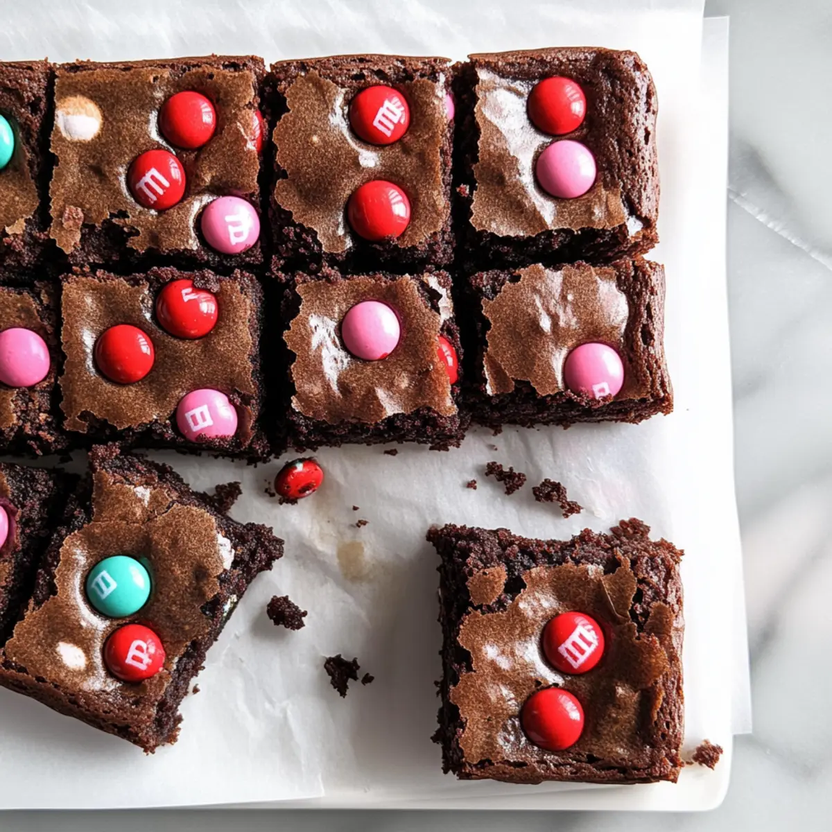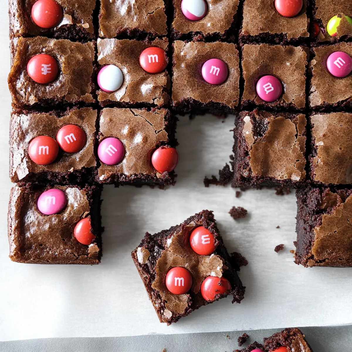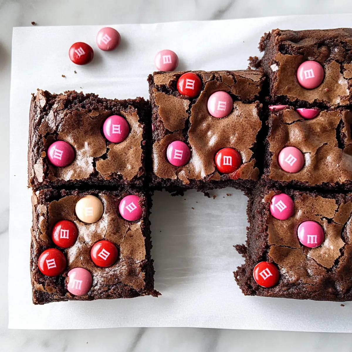 As the aroma of warm chocolate fills my kitchen, I can’t help but feel a rush of excitement. There’s something undeniably special about homemade treats, especially when they’re as delightful as M&M’s Brownies. These chocolaty gems are not only easy to whip up—perfect for busy weeknights—but they also make for the ultimate festive treat that’s sure to brighten any gathering. The combination of rich, fudgy goodness with colorful M&M’s provides a fun twist that invites smiles and happy taste buds. Whether you’re surprising a loved one on Valentine’s Day or simply indulging a sweet craving, these brownies are just waiting to be savored. Curious about how to make these irresistible delights? Let’s dive into the recipe together! Why are these M&M’s Brownies irresistible? Decadent flavors await as you bite into these fudgy brownies, combining rich chocolate and colorful M&M’s for a delightful treat. Quick and simple to prepare, this recipe will easily fit into your busy schedule. Festive fun makes them perfect for any celebration, including holidays or unexpected gatherings. Chewy texture creates a comforting experience that both kids and adults will adore. Perfectly shareable, these brownies are bound to spark joy, ensuring everyone leaves with a smile! M&M’s Brownies Ingredients • Get ready to create a chocolate masterpiece! For the Batter • Semi-Sweet Chocolate – The star of the show, delivering rich chocolate goodness; opt for high quality for the best flavor. • Unsalted Butter – Adds necessary moisture and lusciousness; if using salted butter, simply skip adding more salt. • Granulated Sugar – Sweetens and contributes to that perfect chewy texture; brown sugar can deepen the flavor profile if you fancy. • Brown Sugar – Enhances fudginess; choose light or dark based on your preference for a richer taste. • Eggs – Acts as a binder, providing structure; large eggs are best for consistency in your brownies. • Cocoa Powder – Intensifies that delectable chocolate flavor; stick to unsweetened for true chocolate bliss, but expect lighter brownies with it. • Vanilla Extract – Adds warmth and complements the chocolate perfectly; pure vanilla is always worth it! • Flour – Gives your brownies structure; you can swap for gluten-free flour if you like, just make sure it contains xanthan gum. • Salt – Enhances overall flavor; this can be omitted if you opted for salted butter. • M&M’s Candies – Brings fun color and a crunch to your brownies; personalize with seasonal varieties to match any occasion! Get ready to whip up these delectable M&M’s brownies that are sure to please everyone! Step‑by‑Step Instructions for M&M’s Brownies Step 1: Melt the Chocolate Base Begin by placing a heatproof bowl over a saucepan filled with simmering water to create a double boiler. Combine semi-sweet chocolate, unsalted butter, granulated sugar, and brown sugar in the bowl. Stir occasionally until everything melts into a glossy mixture, which should take about 5-7 minutes. Once melted, remove the bowl from heat and let it cool for 5-10 minutes until it’s just warm to the touch. Step 2: Incorporate the Eggs Once the chocolate mixture has cooled, it’s time to whisk in the eggs. Add them one at a time, using a whisk or spatula to mix until the batter is smooth and shiny; this should take about 1-2 minutes per egg. It’s essential to ensure the eggs are fully integrated to create that perfect fudgy consistency in your M&M’s brownies. Step 3: Mix in Flavorful Ingredients Next, add the cocoa powder, vanilla extract, and salt to the batter. Use your spatula or whisk to mix until no dry cocoa streaks remain; the batter should be rich and chocolatey. This step intensifies the flavor of your brownies, blending beautifully with the sweetness from the sugars. Step 4: Add the Flour Gently fold in the flour using a spatula, being careful not to overmix. You want to combine until you see just a few flour streaks remaining, which will help maintain that chewy texture that’s characteristic of M&M’s brownies. Overmixing could lead to a denser, cake-like outcome. Step 5: Prepare the Baking Pan Line an 8×8-inch baking pan with parchment paper, allowing the edges to hang over for easy removal later. Pour the brownie batter into the pan, smoothing the top with a spatula to ensure even baking. The batter should be thick and luscious as you spread it out, ready to be transformed into delicious brownies. Step 6: Top with M&M’s Before baking, sprinkle a generous handful of M&M’s candies over the top of the brownie batter. Press them in gently without submerging them; this keeps the colorful treats visible and adds a delightful crunch when biting into your fudgy M&M’s brownies. Step 7: Bake to Perfection Preheat your oven to 350°F (175°C) and bake the brownies for 45-50 minutes. Keep an eye on them—the edges should be firm while the center remains slightly gooey. To check doneness, insert a toothpick; if it comes out with just a few moist crumbs, they’re ready to come out of the oven. Step 8: Cool and Slice Once baked, remove the brownies from the oven and let them cool completely in the pan on a wire rack. This cooling process takes about an hour and is crucial for achieving clean slices. Once cool, lift the brownies out using the parchment paper and slice them into squares to serve. Expert Tips for M&M’s Brownies Quality Ingredients: Use high-quality semi-sweet chocolate for the richest flavor. Avoid chocolate chips as they contain stabilizers that can affect texture. Gentle Mixing: To achieve that chewy texture, gently fold in flour until just combined. Overmixing can lead to a cakey result instead of fudgy M&M’s brownies. Proper Cooling: Let the brownies cool completely in the pan before slicing. This helps them set and makes cutting easier, preventing them from crumbling. Baking Time Accuracy: Watch the baking time carefully—remove when