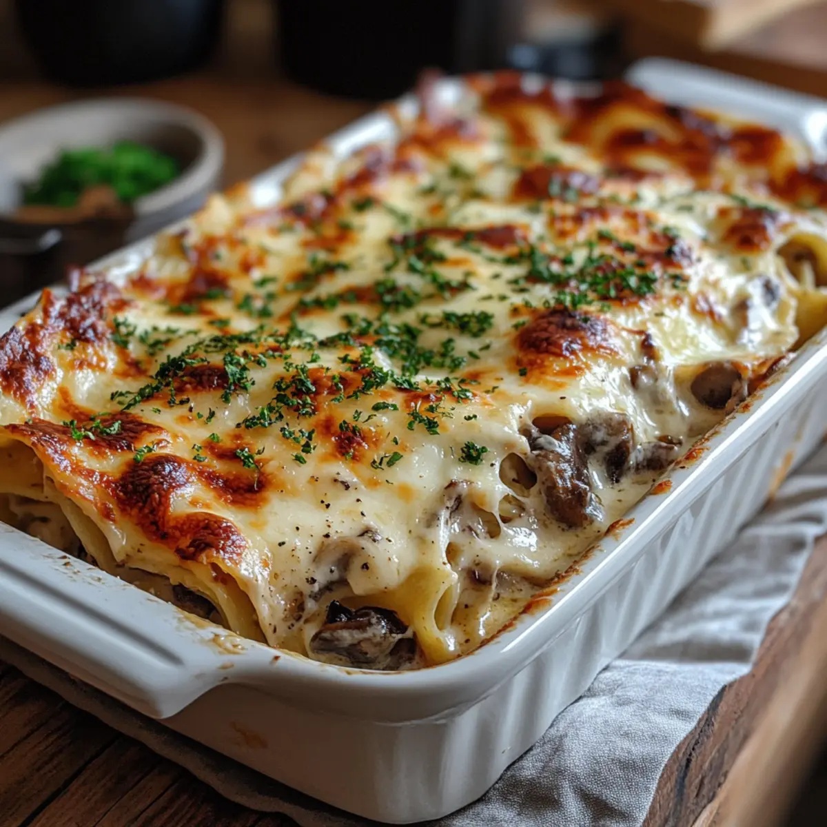 As I stirred the creamy Bechamel sauce, a nostalgic warmth enveloped my kitchen, reminiscent of cherished family dinners. This Mushroom Lasagna with Grape Tomatoes combines the earthiness of sautéed mushrooms with the vibrant sweetness of succulent tomatoes, creating a perfect harmony of flavors. With quick prep time and a vegetarian twist, this dish is the ultimate comfort food to impress both vegetarians and meat lovers. Plus, it easily adapts to gluten-free needs, ensuring everyone can enjoy a hearty slice without compromise. Ready to dive into this mouthwatering lasagna experience? Let’s explore how to bring this comforting delight to your dinner table! Why is Mushroom Lasagna so beloved? Comforting Experience: This Mushroom Lasagna is the epitome of comfort food, bringing a warm hug to your dinner table with its creamy layers and savory filling. Rich and Inviting: The marriage of earthy mushrooms and sweet grape tomatoes creates a delightful flavor profile that will leave everyone asking for seconds. Easy Customization: With gluten-free options and the flexibility to substitute ingredients, this recipe is perfect for any dietary preference. Quick Prep and Cook Time: Enjoy a delicious homemade meal without spending hours in the kitchen; it’s a winner for busy weeknights. Crowd Pleaser: Whether you’re feeding a family or hosting a gathering, this savory lasagna effortlessly appeals to vegetarians and meat-lovers alike. Don’t forget to pair it with a fresh salad or some garlic bread for a complete dining experience! Mushroom Lasagna Ingredients For the Sauté Olive Oil – This is the essential base for sautéing; you can swap it with vegetable oil for a more neutral flavor. Onions – They add a wonderful sweetness; if you prefer a milder taste, try using shallots. Garlic – Infuses the dish with aromatic goodness; if fresh is hard to come by, garlic powder will work in a pinch. For the Filling Mushrooms (cremini, shiitake, portobello) – These are the stars of the dish, delivering umami; feel free to use button mushrooms if you like. Dried Thyme & Oregano – Perfect for adding earthy notes; fresh herbs can replace dried; just remember to triple the amount! Salt & Pepper – The basic seasonings that enhance flavors; adjust according to your taste preference. White Wine (optional) – It adds a delightful acidity; use vegetable broth instead for a non-alcoholic twist. Grape Tomatoes – Bringing fresh sweetness and juiciness; canned diced tomatoes can work in a hurry. Spinach – This leafy green boosts nutrition and color; you can also swap it out for kale or Swiss chard. For the Bechamel Sauce Butter – Key for that luscious Bechamel; margarine makes for a great dairy-free alternative. All-Purpose Flour – Thickens the sauce perfectly; substitute with a gluten-free flour blend to keep it friendly for everyone. Milk – The creamy base for the sauce; opt for a dairy-free milk if you want a vegan version. Nutmeg – Enhances the Bechamel’s flavor; it’s optional but highly recommended for that cozy warmth. For the Assembly Lasagna Noodles – These provide structure to the dish; be sure to use gluten-free noodles if you’re keeping it GF. Mozzarella & Parmesan Cheese – They deliver creaminess and a punch of flavor; dairy-free cheese options exist for a vegan take. With these ingredients, you’re just a step away from making a comforting Mushroom Lasagna that everyone will devour with delight! Step‑by‑Step Instructions for Creamy Mushroom Lasagna with Grape Tomatoes Step 1: Sauté Aromatics In a large skillet, heat 2 tablespoons of olive oil over medium heat. Add one chopped onion and sauté until translucent, about 5 minutes. Stir in 2 minced garlic cloves, cooking for an additional 1 minute until fragrant. This aromatic base is essential for your Mushroom Lasagna, laying the groundwork for delicious flavors. Step 2: Cook Mushrooms Add 8 cups of sliced mushrooms (such as cremini, shiitake, or portobello) to the skillet. Sauté for 8-10 minutes until the mushrooms are browned and their moisture evaporates. Season with salt, pepper, and dried thyme and oregano. For added depth, optionally pour in ½ cup of white wine and let it simmer for an extra 2-3 minutes. Step 3: Add Tomatoes Stir in 2 cups of halved grape tomatoes into the mushroom mixture. Cook for another 2-3 minutes until the tomatoes soften and release their juices. Once combined, remove the skillet from heat and set the Mushroom and Tomato filling aside. This mixture adds a vibrant flavor to your creamy lasagna layers. Step 4: Make Bechamel Sauce In a saucepan, melt 4 tablespoons of butter over medium heat. Whisk in ⅓ cup of all-purpose flour until golden and bubbly for about 2-3 minutes to create a roux. Gradually add 3 cups of warmed milk, whisking continuously until the sauce thickens, around 5-7 minutes. Season with a pinch of nutmeg, salt, and pepper for extra flavor in your Mushroom Lasagna. Step 5: Preheat Oven Preheat your oven to 375°F (190°C). Meanwhile, cook the lasagna noodles according to the package instructions; this step helps ensure they’re perfectly al dente for layering. Strain and set them aside while you prepare the next step. Step 6: Assemble Lasagna In a 9×13 inch baking dish, spread a layer of Bechamel sauce at the bottom. Place a layer of cooked lasagna noodles on top, followed by half of the mushroom and tomato mixture, a handful of fresh spinach, and a layer of shredded mozzarella and Parmesan cheese. Repeat the layers, finishing with noodles and Bechamel on top for a creamy finish. Step 7: Bake Cover the dish with aluminum foil and bake in the preheated oven for 25 minutes. After this, remove the foil and continue baking for another 20 minutes, or until the top is golden and bubbling. Your Mushroom Lasagna should be warm and inviting, with cheese melting beautifully. Step 8: Rest & Serve Once baked, remove the lasagna from the oven and let it rest for 10 minutes befo