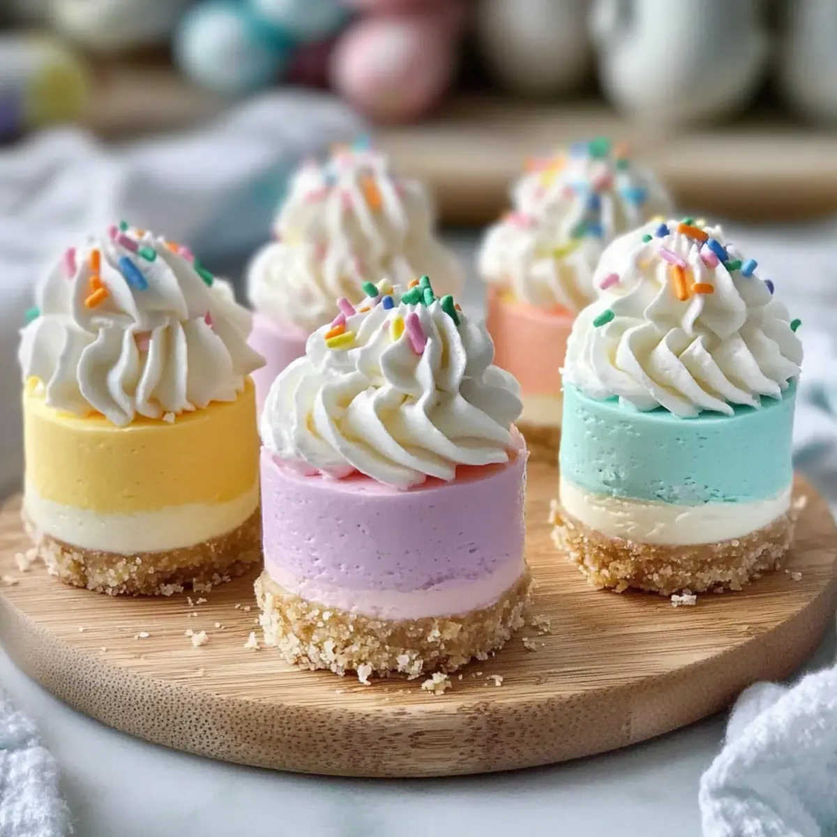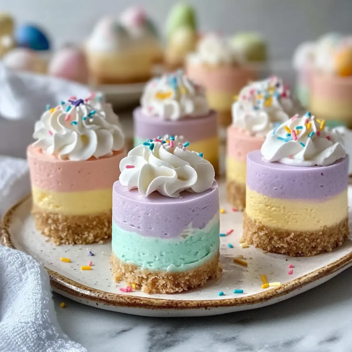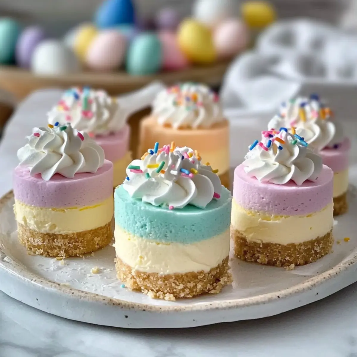 As spring blossoms around us, I can’t help but think about the joyous gatherings filled with laughter and sweet treats. That’s where these Easy No Bake Easter Mini Cheesecakes come to the rescue! Perfect for those of us who want to impress without the oven hassle, this festive dessert is both budget-friendly and kid-friendly, making it a hit at any celebration. With the option to customize flavors—from zesty lemon to luscious strawberry—preparing a delightful treat has never been easier. Plus, they’re a breeze to make ahead, freeing you up for more fun activities with your loved ones. Curious about how to create these stunning mini delights and add a splash of color to your Easter table? Let’s get started! Why Choose No Bake Easter Mini Cheesecakes? Simplicity: No need for baking, just mix and chill for effortless preparation. Customizable Flavors: Add your favorite purees like strawberry or lemon zest for a personal touch. Budget-Friendly: Made with accessible ingredients, perfect for any wallet. Kid-Friendly: A fun culinary project to involve children, making Easter memorable. Make-Ahead Magic: Prepare these mini treats a day in advance, allowing flavors to meld beautifully. Visually Stunning: The layered colors make a cheerful addition to your festive table, just like a Bake Strawberry Heaven kind of dessert! No Bake Easter Mini Cheesecakes Ingredients • Ensure you have everything you need for these delightful no bake Easter mini cheesecakes! For the Crust Graham Cracker Crust – Provides structure and crunch; substitute with gluten-free graham crackers for a gluten-free version. Butter (melted) – Binds the crust ingredients together; can replace with coconut oil for a dairy-free option. Granulated Sugar – Adds sweetness to the crust; may substitute with brown sugar for a richer flavor. For the Cheesecake Filling Cream Cheese (full-fat, softened) – Creates the creamy filling; low-fat cream cheese can be used for a lighter version, though texture may vary. Powdered Sugar – Sweetens the cheesecake filling and helps achieve a smooth texture; can use a sugar substitute for a low-sugar option. Vanilla Extract – Enhances flavor depth; almond extract can be a unique alternative for a different flavor profile. Heavy Whipping Cream (cold) – Whipped to stiff peaks, it gives the filling a light, airy texture; substitute with coconut cream for a dairy-free dessert. Pastel Gel Food Coloring – Adds vibrant color to the filling; omit for a classic cheesecake appearance. For the Toppings Whipped Cream (for topping) – Provides a light finishing touch; can exclude or replace with whipped coconut cream for a dairy-free version. Easter Sprinkles – For decoration; optional but boosts festive presentation. Use seasonal themed sprinkles for varying occasions. Mini Chocolate Eggs (optional) – A fun topping that enhances the Easter theme. Enjoy crafting these colorful no bake Easter mini cheesecakes that are sure to impress family and friends! Step‑by‑Step Instructions for No Bake Easter Mini Cheesecakes Step 1: Make the Crust Begin by combining graham cracker crumbs, melted butter, and granulated sugar in a mixing bowl. Stir until the mixture resembles wet sand. Line a muffin tin with cupcake liners, and then firmly press the crust mixture into the bottom of each liner, forming an even layer. Chill the crusts in the refrigerator for 15-20 minutes to set. Step 2: Prepare the Filling In a large mixing bowl, beat the softened cream cheese with an electric mixer until it is smooth and creamy, about 2-3 minutes. Gradually add the powdered sugar and vanilla extract, mixing until fully combined and there are no lumps. This creamy base will be the delightful filling for your No Bake Easter Mini Cheesecakes. Step 3: Whip the Cream In a separate bowl, whip the cold heavy cream using a hand mixer or stand mixer until stiff peaks form, taking about 3-5 minutes. Be careful not to overwhip, or the cream can become grainy. Once whipped, gently fold the whipped cream into the cream cheese mixture, ensuring a light and airy texture in your filling. Step 4: Create Layers Divide the filling into 3-4 bowls, tinting each portion with your desired pastel gel food coloring until you reach a vibrant shade. Layer the tinted fillings into each chilled crust, alternating colors for a beautiful effect. Use a toothpick to swirl the layers lightly if you want a marbled look, adding to the visual appeal of your No Bake Easter Mini Cheesecakes. Step 5: Chill and Serve Once all layers are in place, cover the mini cheesecakes with plastic wrap and chill in the refrigerator for at least 4 hours, or overnight for best results. This allows the flavors to meld and the filling to firm up. Before serving, decorate with dollops of whipped cream, festive Easter sprinkles, and mini chocolate eggs for an extra special touch. What to Serve with No Bake Easter Mini Cheesecakes? The vibrant colors and creamy textures of these mini delights create a delightful spring experience, perfect for building a festive meal. Fresh Fruit Salad: A medley of juicy strawberries, blueberries, and kiwi adds a refreshing contrast to the rich cheesecakes without overpowering them. Lightly Sweetened Whipped Cream: This fluffy topping complements the cheesecakes, enhancing their creaminess while offering a delightful mouthfeel. Chocolate-Dipped Strawberries: The juicy fruit covered in chocolate provides an indulgent touch, tying together the sweetness of the mini cheesecakes. These decadent bites are always a crowd-pleaser. Crispy Bacon-Wrapped Asparagus: The salty crunch of bacon-wrapped asparagus creates an exciting savory element that balances the sweetness of the desserts, making it a superb appetizer. Sparkling Lemonade: A bubbly drink with tartness cuts through the sweetness of the cheesecakes, offering a crisp refreshment that invigorates the palate as you indulge. Pistachio Muffins: Their nutty flavor and soft crumb create a del