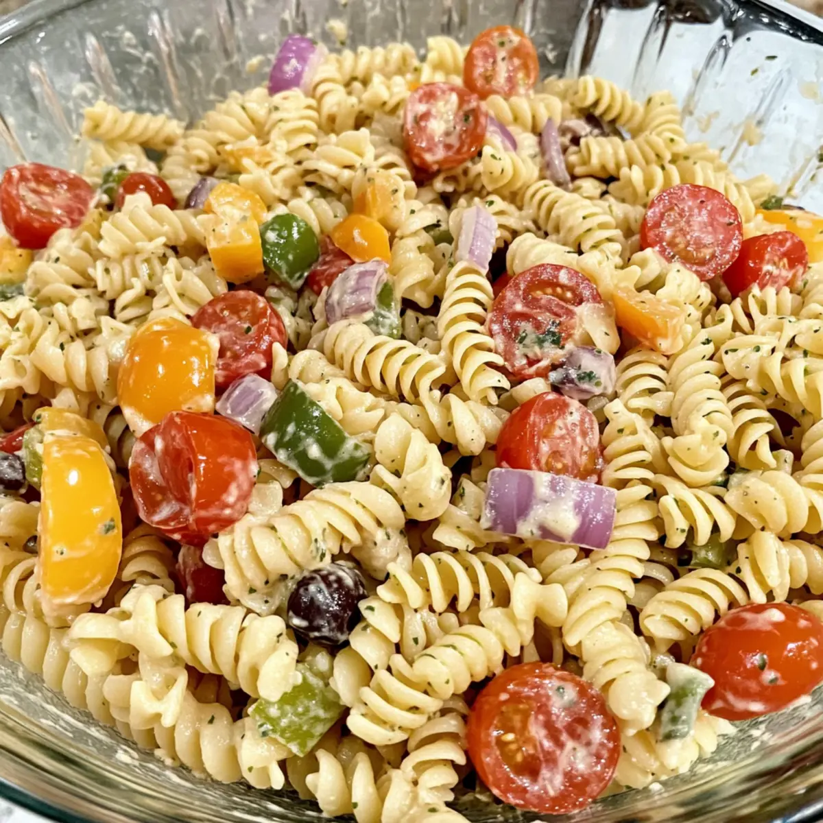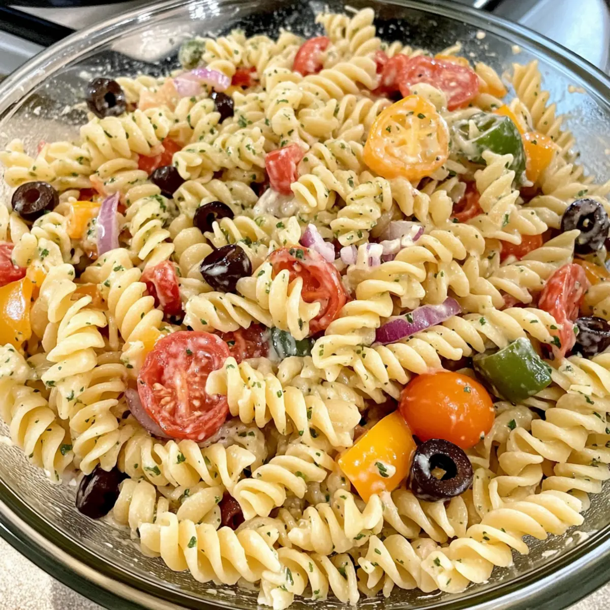 As I frantically tossed together ingredients from my pantry, a kaleidoscope of colors began to take shape before my eyes. That’s when I knew I was on the path to creating a dish that would become a staple in my home: Easy Olive Garden Pasta Salad. This vibrant salad, brimming with fresh vegetables and enveloped in a creamy dressing, is as family-friendly as it is delicious. Whether you’re preparing for a busy weeknight or gearing up for a potluck, it’s both easy to make and incredibly inexpensive—perfect for keeping your kitchen stress-free. The best part? With its delightful medley of textures, this salad is a guaranteed crowd-pleaser. Who wouldn’t want a bowl full of tasty goodness ready to serve? Curious about how to whip this up in your kitchen? Let’s dive in! Why Is Olive Garden Pasta Salad So Popular? Simplicity: This Easy Olive Garden Pasta Salad comes together in just a few minutes, making it ideal for busy weeknights. Flavor Explosion: The mix of fresh vegetables and creamy dressing delivers a mouthwatering experience that even picky eaters will love. Versatile Dish: Easily transform this salad by adding protein like grilled chicken or changing dressings for varying tastes. Perfect for Any Occasion: Whether it’s a family dinner or picnic with friends, this salad shines bright as a crowd-pleaser. Make-Ahead Wonder: Prepare it ahead of time, as the flavors only get better, ensuring you can enjoy your day stress-free! Why not check out Garlic Butter Pasta for another quick recipe that’s sure to impress? Olive Garden Pasta Salad Ingredients For the Pasta • Rotini or any pasta – Rotini holds the dressing well, providing a sturdy base for your salad. For the Vegetables • Bell peppers – Add vibrant color and a sweet crunch to the salad. • Red onions – Give a zesty kick; soak them in cold water for milder flavor. • Cherry tomatoes – Burst with sweetness; slice them in half for easy eating. For the Dressing • Olive oil – Introduces richness and helps emulsify the dressing; feel free to substitute with a different oil for unique flavors. • Italian seasoning – Enriches the taste; use fresh herbs for a garden-fresh twist. • Parmesan cheese – Adds a savory touch; try a dairy-free option for a vegan Olive Garden Pasta Salad experience. These ingredients come together beautifully to create a salad that’s both nourishing and delicious! Step‑by‑Step Instructions for Olive Garden Pasta Salad Step 1: Cook the Pasta Begin by boiling a large pot of salted water over high heat. Once the water reaches a rolling boil, add your rotini pasta and cook according to package instructions, usually about 8–10 minutes, until al dente. Stir occasionally to prevent sticking. Drain the pasta in a colander and let it cool completely before moving on to the next steps. Step 2: Prepare the Vegetables While the pasta cools, wash and chop your bell peppers, red onions, and cherry tomatoes into bite-sized pieces. Aim for even cuts to ensure a balanced bite in your Olive Garden Pasta Salad. Visualize vibrant colors filling your cutting board, bringing a fresh essence to the dish. Step 3: Combine Pasta and Veggies In a large mixing bowl, combine the cooled pasta with the chopped vegetables. Gently toss them together using a spatula or large spoon, ensuring the pasta and vegetables are well incorporated. Feel free to add any extra seasonal vegetables you love for variety and nutrition. Step 4: Make the Dressing In a separate bowl, whisk together olive oil, Italian seasoning, and freshly grated Parmesan cheese until the mixture is smooth and well combined. The dressing should have a creamy consistency that will envelop your salad delightfully. Take a moment to inhale the aromatic blend of herbs. Step 5: Dress the Salad Pour the dressing over the pasta and vegetables mixture in the large bowl. Gently toss everything together until the ingredients are evenly coated and the colors are beautifully blended. The delicious aroma will draw everyone in, promising a flavorful bite ahead. Step 6: Chill the Salad Cover the salad with plastic wrap or transfer it to an airtight container. Refrigerate for at least 30 minutes to allow the flavors of your Olive Garden Pasta Salad to meld together beautifully. This chilling time enhances the overall taste and creates a refreshing dish. Step 7: Serve and Enjoy After chilling, give the salad a quick toss to redistribute the dressing before serving. Transfer it to a serving bowl, and consider garnishing with additional Parmesan cheese or a sprinkle of fresh herbs if desired. This vibrant salad is now ready to delight your family or guests! Expert Tips for Olive Garden Pasta Salad Pasta Perfection: Avoid mushy noodles by cooking the pasta just until al dente. This retains the perfect texture in your Olive Garden Pasta Salad. Veggie Variations: Don’t be afraid to mix in seasonal veggies! Zucchini or cucumbers can add an extra crunch and freshness. Dressing Mastery: Whisk the dressing until it’s emulsified for a creamier texture. This ensures an even coating on all ingredients without separation. Chill Time: Allowing the salad to chill for an hour enhances the flavors. If possible, prepare it the night before for the best taste. Taste Test: Remember to taste and adjust the seasoning before serving; this will elevate your Olive Garden Pasta Salad to perfection! Olive Garden Pasta Salad Variations Feel free to get creative with this Olive Garden Pasta Salad and make it your own delightfully unique dish! Protein Boost: Add diced pepperoni or salami for a flavorful kick. This savory addition will satisfy the meat lovers at your table and bring a hearty richness to every bite. Vinaigrette Twist: Switch the dressing to a light vinaigrette for a refreshing twist. This variation brightens the flavors and is a perfect option for those seeking a lighter meal. Cheese Remix: Incorporate different cheeses like feta or mozzarella for a flavor upgrade. The 