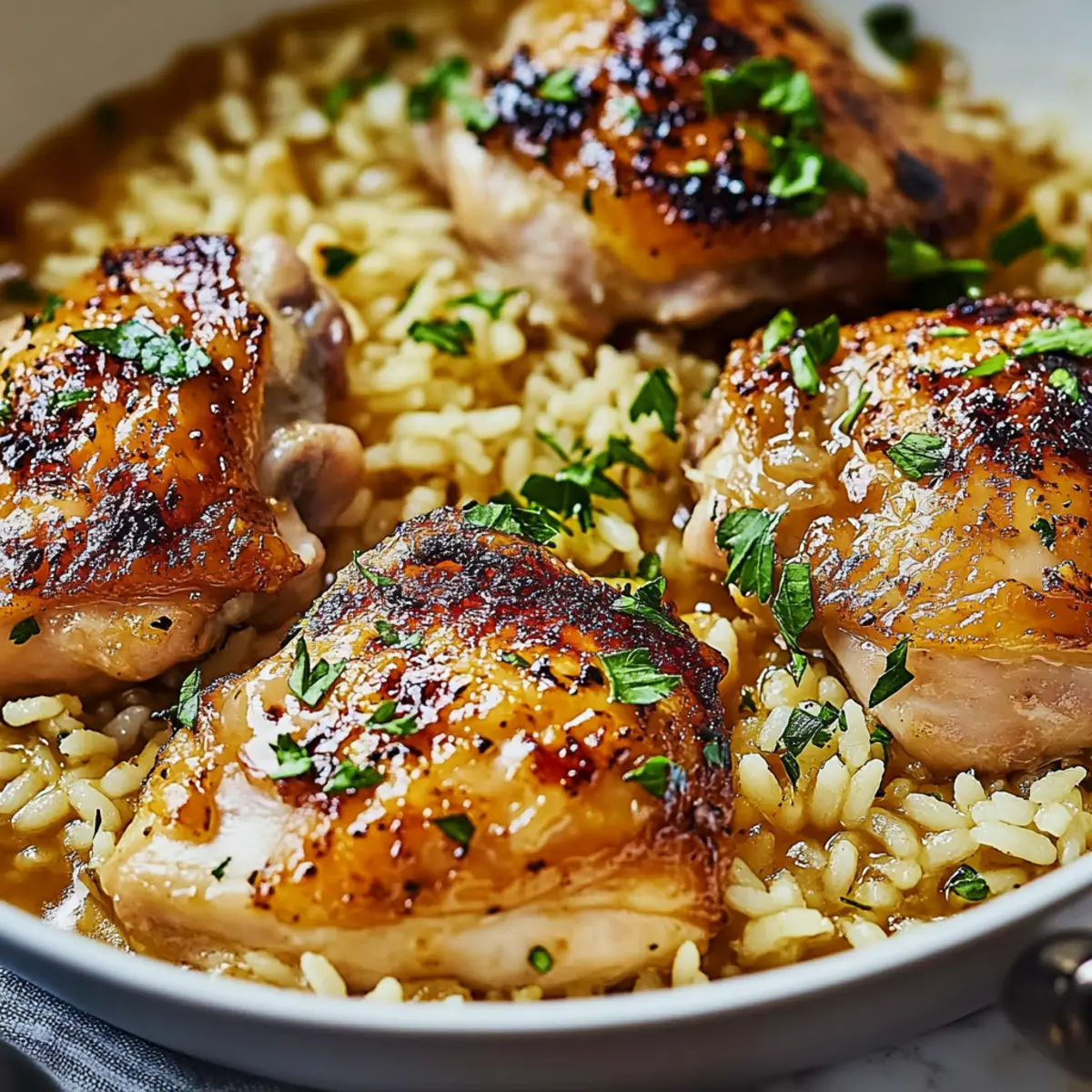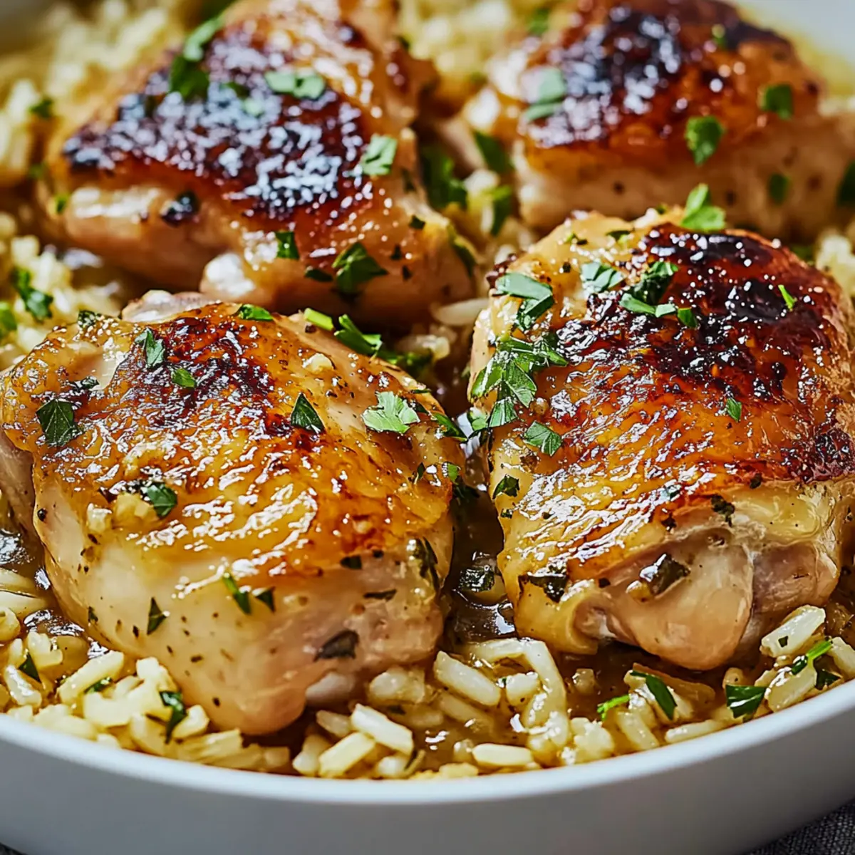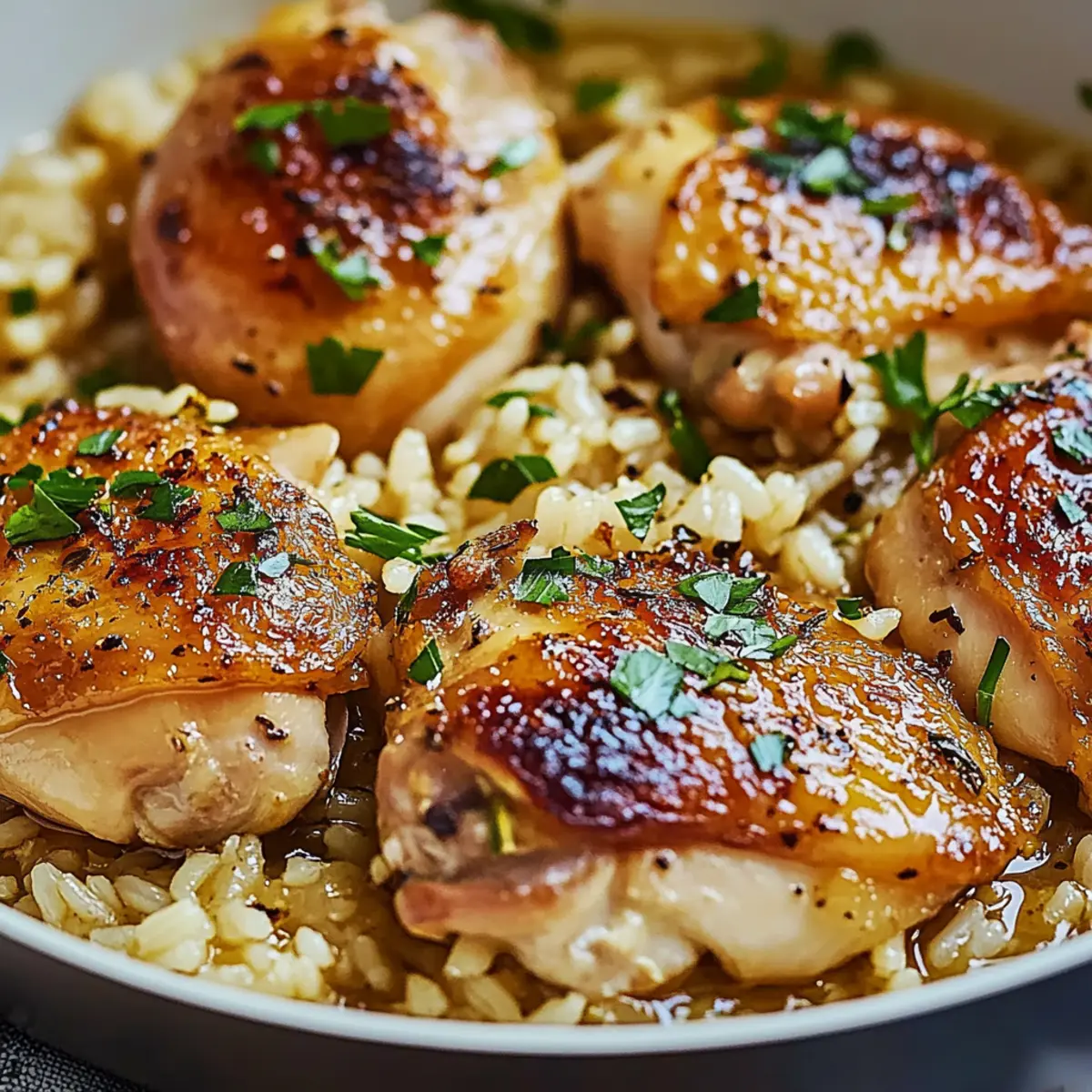There’s nothing quite like the comforting scent of garlic sizzling in butter, especially when you know it’s about to bring a delicious One-Pan Chicken Thighs and Garlic Rice to the table. In under 30 minutes, you can have a tasty and family-friendly meal that’s not only comforting but also scales easily to suit any taste with simple ingredient swaps. Whether you prefer tender chicken thighs or juicy chicken breasts, this recipe offers the perfect base to customize with seasonal veggies or your favorite spices. With minimal cleanup and maximum flavor, it’s a go-to solution for busy weeknights that will enchant everyone around the dinner table. Ready to dive into this delightful dish? Let’s get cooking! Why try this easy one-pan recipe? Flavorful and satisfying, this One-Pan Chicken Thighs and Garlic Rice brings together the warm, aromatic notes of garlic with juicy chicken, creating a dish everyone will love. Customizable to meet your preferences, feel free to swap in chicken breasts or your favorite vegetables! Quick preparation means you’ll spend under 30 minutes in the kitchen, making it a lifesaver on busy nights. Minimal cleanup lets you focus on enjoying your meal rather than scrubbing pots and pans. Pair it with a fresh salad or garlic bread for a complete dinner that’s certain to please. One-Pan Chicken Thighs and Rice Ingredients • Prepare to create a delightful and easy meal with these essential ingredients! For the Chicken Chicken Thighs – A succulent protein source that stays juicy during cooking; feel free to substitute with boneless chicken breasts for a leaner option. Salt and Black Pepper – Use generously for perfect seasoning; adjust according to personal preference for taste. Paprika – Adds a beautiful smoky flavor; experiment with smoked paprika for an exciting twist. Olive Oil – Ideal for searing chicken, ensuring a golden and crispy crust. For the Rice Unsalted Butter – Provides a rich depth of flavor; always melt it first for the best taste. Onion (Yellow or White) – The base of flavor that adds sweetness; sauté until deliciously softened. Garlic (Fresh or Powder) – Offers an aromatic kick; fresh garlic is recommended for maximum vibrancy. Long-Grain White Rice – Absorbs all the fantastic flavors; helps achieve a fluffy texture when properly cooked. Chicken Broth – Essential for keeping the rice moist and flavorful; opt for low-sodium if preferred. Onion Powder and Garlic Powder – Boost the flavor of the dish effortlessly; great in a pinch when fresh ingredients aren’t available. Fresh Parsley – An optional garnish that adds a dash of freshness and color to the meal. Feel free to customize this One-Pan Chicken Thighs and Rice with your favorite vegetables or spices to make it your own! Step‑by‑Step Instructions for One-Pan Chicken Thighs and Garlic Rice Step 1: Prepare Chicken Pat the chicken thighs dry using paper towels, ensuring they’re free of moisture for a good sear. Season both sides generously with salt, black pepper, and paprika to enhance the flavors. This seasoning creates a delicious crust while cooking. Set aside and let it sit for a few minutes to absorb the flavors. Step 2: Sear Chicken In a deep skillet, heat 2 tablespoons of olive oil over medium-high heat until shimmering. Carefully add the seasoned chicken thighs to the pan, searing for 4-5 minutes on each side until they reach a beautiful golden-brown color. Once cooked, transfer the chicken to a plate and cover it with foil to keep it warm while you prepare the rice. Step 3: Sauté Aromatics Lower the heat to medium and add 2 tablespoons of unsalted butter to the same skillet, letting it melt and foam gently. Once melted, add a finely diced onion and sauté for about 3 minutes until it becomes soft and translucent. Stir in 3 minced garlic cloves and cook for an additional minute until fragrant, ensuring not to let the garlic burn. Step 4: Toast Rice Add 1 cup of long-grain white rice to the skillet with the sautéed onions and garlic. Stir the rice continuously for about 1 minute, allowing it to toast slightly and absorb the aromatic flavors from the pan. This step helps to enhance the overall flavor of the One-Pan Chicken Thighs and Garlic Rice. Step 5: Combine and Cook Pour in 2 cups of chicken broth while scraping the bottom of the skillet to release any flavorful bits stuck to the pan. Mix in 1 teaspoon of onion powder, 1 teaspoon of garlic powder, and a sprinkle of fresh parsley for added flavor. Nestle the seared chicken thighs back into the skillet, bringing the mixture to a boil before reducing the heat to low. Cover and simmer for 20-25 minutes until the rice is fluffy and cooked through. Step 6: Rest and Serve After cooking, remove the skillet from heat and let it rest, covered, for a few minutes to allow the flavors to meld. Before serving, garnish the One-Pan Chicken Thighs and Garlic Rice with additional fresh parsley for a burst of color. Serve warm and enjoy the delightful combination of juicy chicken with flavorful, garlic-infused rice. Storage Tips for One-Pan Chicken Thighs and Rice Fridge: Store leftovers in an airtight container in the refrigerator for up to 4 days. This will keep your One-Pan Chicken Thighs and Rice fresh and flavorful. Freezer: For longer storage, freeze portions in airtight containers or freezer bags for up to 2 months. This allows you to enjoy this comforting meal later with ease. Reheating: To reheat, thaw overnight in the fridge if frozen, then warm in a skillet over medium heat or in the microwave until heated through. Add a splash of chicken broth if the rice seems dry. Airtight Storage: Always ensure your storage containers are tightly sealed to maintain moisture and flavor in your One-Pan Chicken Thighs and Rice. One-Pan Chicken Thighs and Rice Variations Feel free to explore the delightful possibilities of this recipe and make it your own with these fun and easy variations. Chicken Breasts: Substitute c