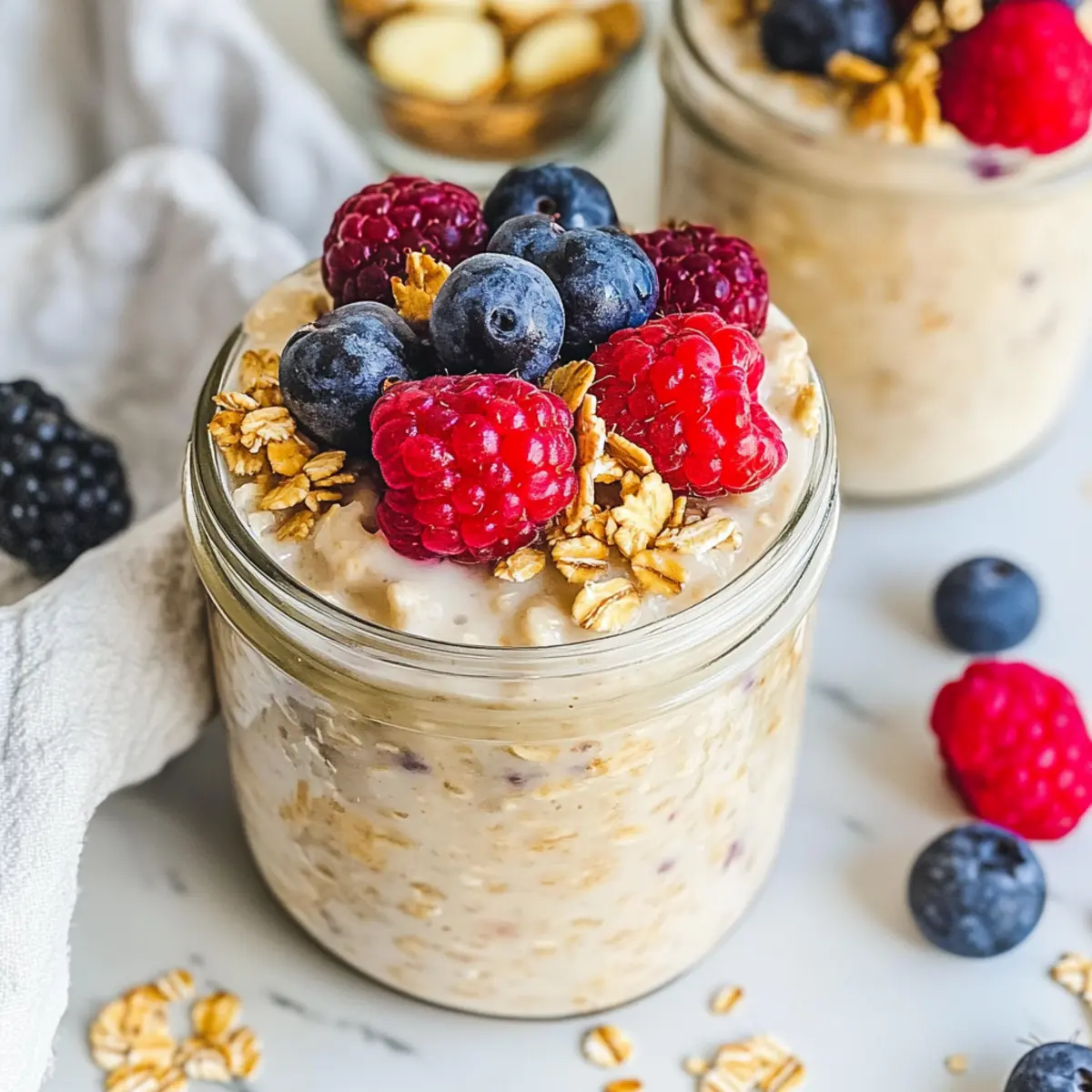 These Overnight Oats with Almond Milk are perfect for busy home cooks looking to save time during hectic mornings! You can prepare the base mixture (oats, almond milk, yogurt, vanilla, honey, and cinnamon) up to 24 hours in advance by combining the ingredients in a large container or individual jars. Just cover them tightly and refrigerate to maintain freshness. When you’re ready to serve, simply stir the mixture, then add your favorite toppings, such as fresh fruits or nuts, for a delightful finish. This method ensures your oats remain just as delicious while making breakfast a breeze on busy days!