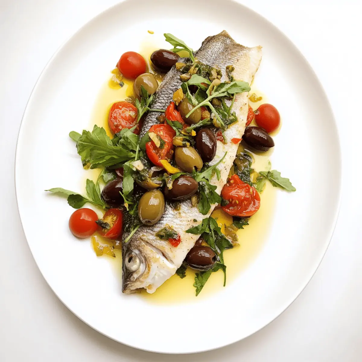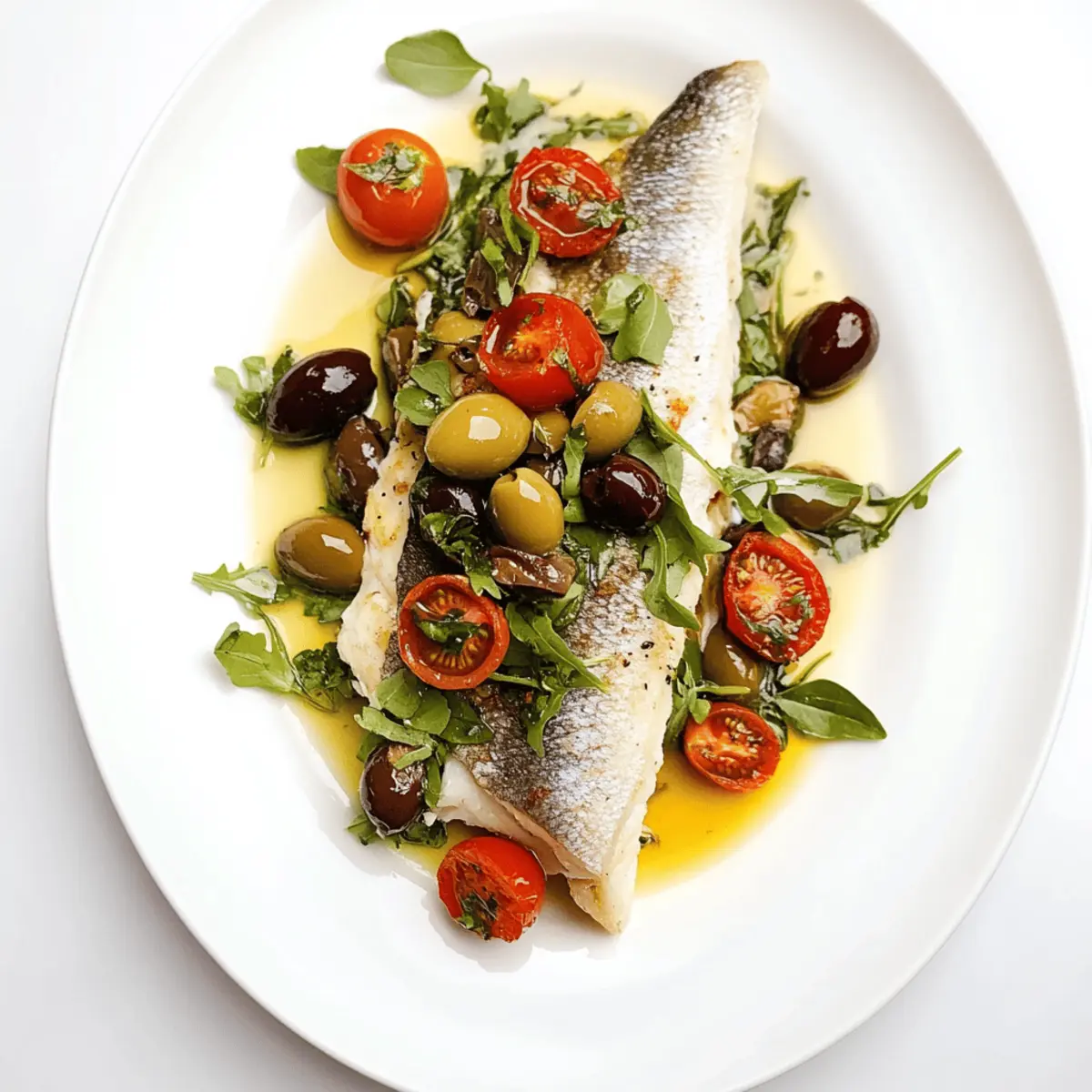 A delightful Pan-Seared Branzino dish with zesty olive tomato relish. Perfect for a healthy Mediterranean dinner.