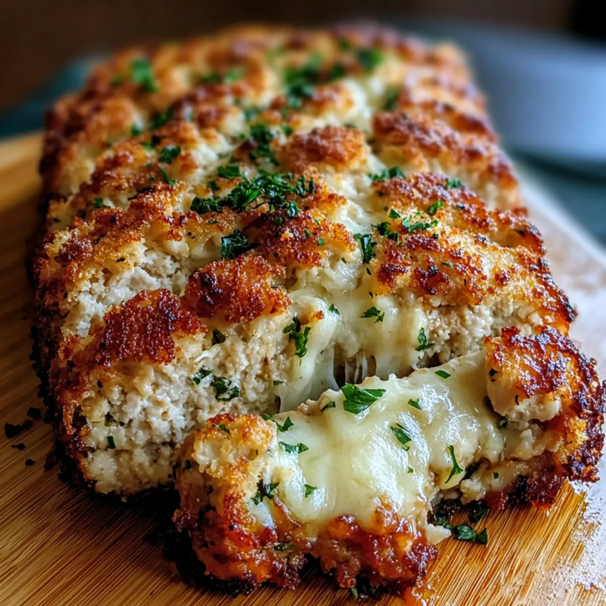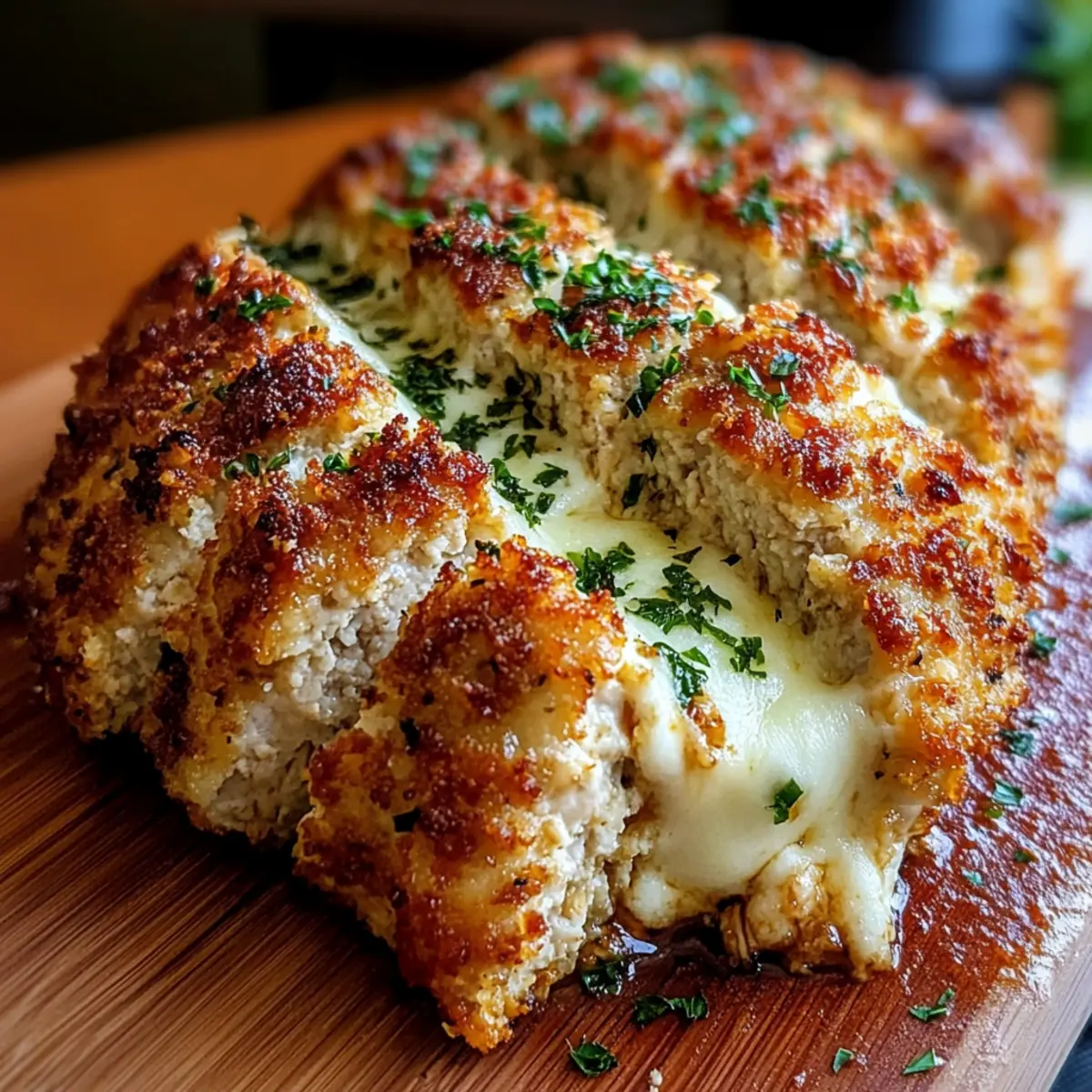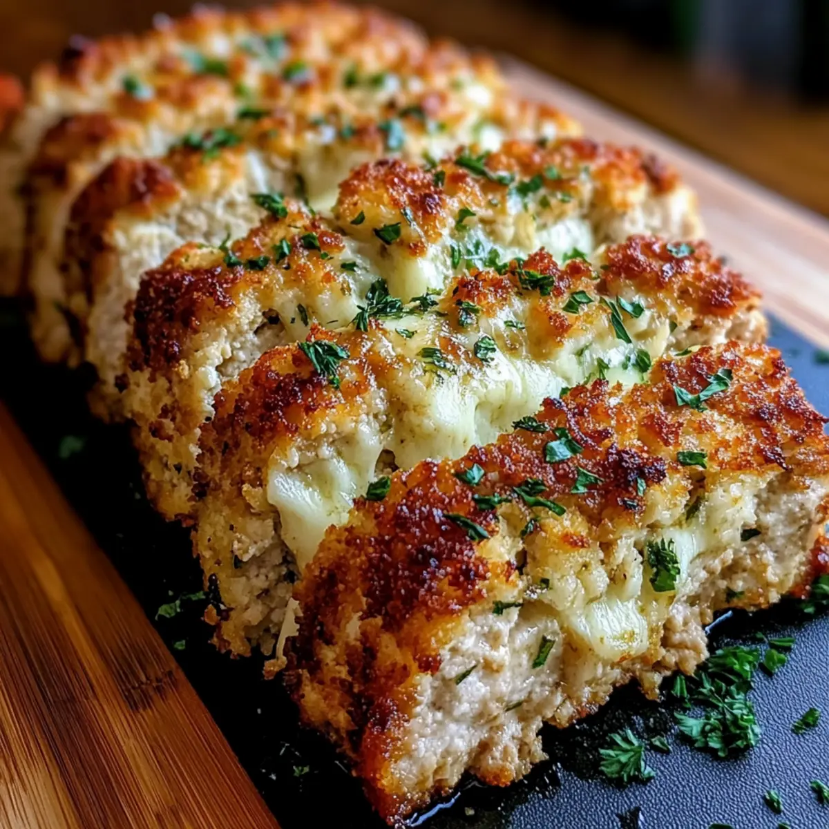 As I stood in my kitchen, the rich aroma of onion and garlic sautéing on the stove instantly transported me back to family gatherings where comfort food took center stage. That’s the magic behind this Parmesan Chicken Meatloaf with Melted Mozzarella—it’s an Italian-inspired dish that perfectly marries the savory goodness of chicken parmesan with the hearty appeal of classic meatloaf. Not only is it a breeze to prepare, but it also guarantees satisfaction for your loved ones, making it an ideal choice for those bustling weeknight dinners. With its creamy mozzarella surprise at the heart of the loaf and the vibrant marinara sauce on top, this recipe promises to rejuvenate your home-cooked meals into a delicious, cozy experience. Are you ready to savor a taste of Italy right at your dinner table? Why is Parmesan Chicken Meatloaf a Must-Try? Comforting, Hearty Dish: This Parmesan Chicken Meatloaf blends the best of Italian flavors, evoking warmth and satisfaction with every bite. Gooey Mozzarella Center: A surprise melty center of mozzarella adds a delightful twist that your family will love; it’s a step up from traditional meatloaf! Quick and Easy: Perfect for busy weeknights, this recipe comes together in just a few simple steps, making homemade cooking accessible to everyone. Versatile Ingredient Options: With easy substitutions like ground turkey or vegan cheese, you can customize this dish to fit various dietary preferences. Crowd-Pleaser: Guaranteed to impress with its vibrant flavors and beautiful presentation, this meatloaf is sure to become a family favorite at every gathering! Pair it with some garlic mashed potatoes or a fresh salad for a complete meal that delights! Parmesan Chicken Meatloaf Ingredients For the Meatloaf Olive Oil – Adds moisture and flavor; feel free to use any neutral oil if preferred. Onion – Finely diced for an aromatic base; shallots or leeks work well as substitutes. Garlic – Minced for depth of flavor; powdered garlic serves as a quick alternative. Ground Chicken – The main protein source that keeps the meatloaf moist; ground turkey or lean beef can easily replace it. Seasoned Breadcrumbs – Provides structure and texture; opt for Italian breadcrumbs for enhanced flavor or gluten-free versions if needed. Milk – Adds moisture; you can substitute with non-dairy milk for a vegan option. Parmesan Cheese – Infuses a rich umami flavor into the meatloaf; consider using Pecorino for a twist or nutritional yeast as a vegan alternative. Egg – Binds the meatloaf together; substitute with a flax egg or chia seed gel for a vegan option. Fresh Parsley – Adds fresh herbal notes; alternatively, use basil or oregano for variety. Italian Seasoning – Offers a blend of spices; feel free to mix individual herbs like basil, oregano, and thyme. Salt – Enhances flavor; adjust according to your taste preference. For the Center and Topping Mozzarella Cheese – Provides that gooey, melty center; use full-fat shredded mozzarella or cheese strings for the best results. Marinara Sauce – A delicious topping that adds both moisture and flavor; use homemade or store-bought for convenience. Panko Breadcrumbs – For a crunchy topping that contrasts beautifully; regular breadcrumbs or crushed crackers can substitute. Butter – Binds the breadcrumb topping nicely; choose olive oil or vegan butter for a dairy-free version. This irresistible Parmesan Chicken Meatloaf comes together with simple ingredients, allowing you to whip up a culinary masterpiece that your family will savor! Step‑by‑Step Instructions for Parmesan Chicken Meatloaf Step 1: Prep Aromatics Heat 2 tablespoons of olive oil in a skillet over medium heat. Add 1 finely diced onion and 3 minced garlic cloves, sautéing them until softened and fragrant, about 5 minutes. Once cooked, remove the pan from heat and allow the mixture to cool completely before adding it to the meatloaf mixture. Step 2: Mix Meatloaf In a large mixing bowl, thoroughly combine 1 pound of ground chicken, the cooled onion-garlic mixture, 1 cup of seasoned breadcrumbs, 1/4 cup of milk, 1/2 cup of grated Parmesan cheese, 1 egg, 2 tablespoons of chopped fresh parsley, 1 tablespoon of Italian seasoning, and a pinch of salt. Use your hands to mix until just combined to maintain a tender texture in your Parmesan Chicken Meatloaf. Step 3: Shape the Loaf On a lined baking sheet, form about two-thirds of the meat mixture into a rectangle, ensuring it’s compact yet somewhat flattened. Create a trench down the center and fill it with 1 cup of shredded mozzarella cheese. Take the remaining meat mixture and cover the cheese, sealing the edges carefully to prevent leakage during baking. Step 4: Add Marinara Spread 1 cup of marinara sauce evenly over the meatloaf, ensuring it’s well-covered. Preheat your oven to 200°C (400°F) and bake the meatloaf for about 45 minutes. You’ll know it’s ready when the edges begin to brown and the internal temperature reaches about 74°C (165°F). Step 5: Prepare Topping While the meatloaf bakes, prepare the topping by mixing 1 cup of panko breadcrumbs with 1/4 cup of grated Parmesan cheese, 2 tablespoons of melted butter, and another tablespoon of chopped parsley in a small bowl. After 45 minutes of baking, remove the meatloaf and sprinkle shredded mozzarella and the panko mixture on top. Step 6: Final Bake & Serve Return the meatloaf to the oven and bake for another 15-20 minutes, or until the topping is golden and crispy, and the internal temperature reaches the desired level. Allow the Parmesan Chicken Meatloaf to rest for about 10 minutes before slicing it to ensure the cheese keeps its wonderful melt. What to Serve with Parmesan Chicken Meatloaf Create the perfect meal experience with delightful sides that complement every bite of this savory Italian-inspired dish. Garlic Mashed Potatoes: Creamy and buttery, these classic potatoes provide a comforting balance to the meatloaf’s rich flavor