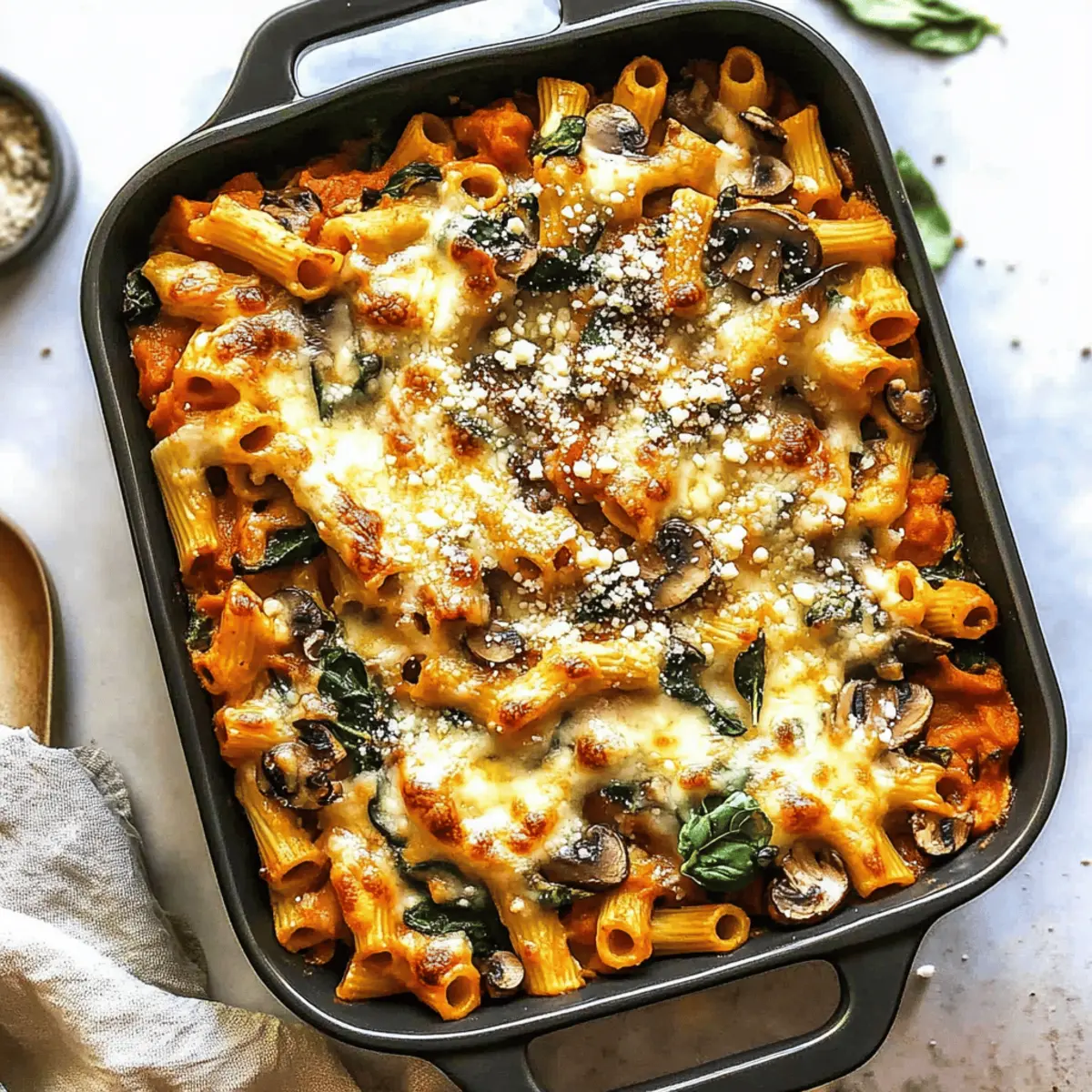 This Pasta Bake with Pumpkin Tomato Sauce blends creamy pumpkin with earthy mushrooms and vibrant spinach for a cozy, comforting meal.