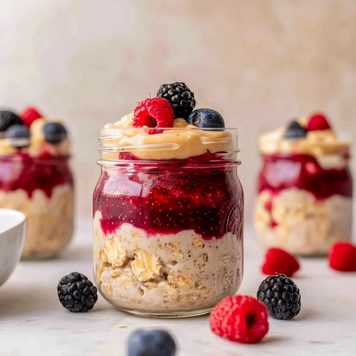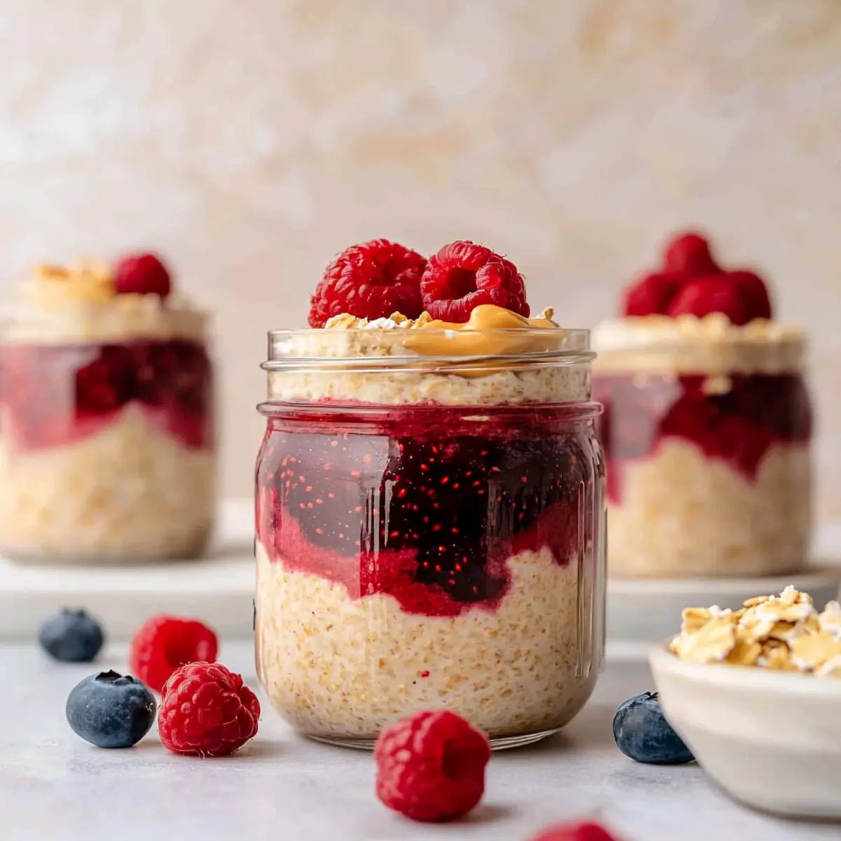 As I stirred together the ingredients for my latest breakfast obsession, a wave of nostalgia washed over me, reminding me of those carefree childhood days when a simple peanut butter and jelly sandwich was the highlight of my lunchbox. Now, with these Peanut Butter and Jelly Overnight Oats, I get to relive that joy in a healthier, more satisfying way. Packed with protein-rich Greek yogurt and hearty rolled oats, this meal prep wonder is perfect for those bustling mornings when time is tight. Plus, it’s gluten-free if you choose the right oats! With just a few minutes of prep the night before, you’ll have a deliciously creamy breakfast waiting for you. Curious about how to whip up this delicious dish? Let’s dive in! Why Are Overnight Oats So Popular? Convenience Overload: These Peanut Butter and Jelly Overnight Oats are a breeze to prepare, making them ideal for busy mornings when you need a quick yet nutritious breakfast. Protein Power: Rich in protein thanks to Greek yogurt, they help keep you fuller for longer—perfect for those long workdays ahead. Nostalgic Flavor: Enjoy the delicious taste of a classic PB&J that takes you back to childhood, but in a healthier way! Versatile Customization: Feel free to swap out the peanut butter for almond or sunflower seed butter, or mix up the jam to suit your taste buds. You can even make it a hearty meal by adding fresh fruit or nuts on top! Perfect for Meal Prep: Make a batch ahead of time, store them in the fridge, and grab one as you rush out the door. These oats are the solution to your breakfast dilemma! Ready to take your breakfast game to the next level? You won’t want to miss out on trying this delightful recipe! Peanut Butter and Jelly Overnight Oats Ingredients For the Oats Mix • Rolled Oats – These provide a satisfying texture; for the best results, stick with old-fashioned rolled oats. • Greek Yogurt – Adds rich creaminess and protein; regular yogurt can be used for a lighter alternative. • Milk – Serves as the liquid base; feel free to swap with any non-dairy milk. • Chia Seeds – Thickens the mixture while adding omega-3s; flax seeds can be used but may require longer soaking. • Peanut Butter – The star of our PB&J, use natural peanut butter for optimal mixing; almond or sunflower seed butter are good substitutes. For Sweetness and Flavor • Maple Syrup – A natural sweetener that enhances flavor; honey or agave syrup can substitute nicely. • Vanilla Extract – Elevates the taste of your oats; always choose real vanilla for the finest flavor. • Salt – Balances out sweetness and intensifies flavor; don’t skip this important ingredient. For the Jelly Layer • Jam – Gives that classic “jelly” essence; consider using chia jam or your favorite fruit preserves if desired. Get ready to enjoy these delightful Peanut Butter and Jelly Overnight Oats as the perfect way to start your day! Step‑by‑Step Instructions for Peanut Butter and Jelly Overnight Oats Step 1: Mix the Base Ingredients In a large mixing bowl, combine rolled oats, Greek yogurt, milk, chia seeds, peanut butter, maple syrup, vanilla extract, and a pinch of salt. Using a whisk or spoon, stir well until all ingredients are smoothly blended, ensuring the oats are fully coated. This should take about 2-3 minutes and create a thick, creamy texture, perfect for your Peanut Butter and Jelly Overnight Oats. Step 2: Cover and Refrigerate Once the mixture is thoroughly combined, cover the bowl tightly with a lid or plastic wrap. Place it in the refrigerator and allow the oats to soak for at least 3 hours, ideally overnight. This soaking time lets the oats absorb the liquid and flavors, resulting in a creamy consistency that is both rich and delightful when it’s ready to serve. Step 3: Layer the Oats for Serving When you’re ready to enjoy your Peanut Butter and Jelly Overnight Oats, take the bowl out of the fridge. Grab some mason jars or serving bowls, and spoon a third of the oat mixture into each container. Then, add 2 tablespoons of jam in the center, creating a luscious layer that captures the classic PB&J essence, before topping it off with the remaining oat mixture. Step 4: Garnish and Enjoy To finish off your creation, drizzle additional jam on top and add any desired toppings, such as fresh berries or chopped peanuts, for extra flavor and texture. Serve immediately or store in the fridge for a quick grab-and-go breakfast. Savor the nostalgic taste of your Peanut Butter and Jelly Overnight Oats any day of the week! What to Serve with Peanut Butter and Jelly Overnight Oats Elevate your breakfast experience by adding delightful sides and flavors that perfectly complement your creamy overnight oats. Fresh Fruit Salad: Bright, juicy fruits like berries, bananas, and citrus enhance the meal’s nutritional profile and add a refreshing contrast. Savor every bite as the sweetness from the fruits mingles with the rich oats and jam. Crunchy Granola: A sprinkle of your favorite granola provides satisfying texture and a delightful crunch, balancing the creaminess of the oats. Choose a homemade or store-bought option with nuts and seeds for added nutrients, creating a wholesome breakfast harmony. Greek Yogurt Parfait: Layered with additional yogurt and fresh fruit, this parfait serves as a protein-packed side that enhances creaminess. Enjoy the contrast of temperatures and textures, making each spoonful exciting and luscious. Nutty Energy Bites: These no-bake treats are perfect for a satisfying snack alongside your oats, harmonizing the peanut flavor. Their wholesome ingredients offer an extra energy boost, making them a great companion on your busy mornings. Maple Glazed Bacon: Sweet and salty bacon complements the peanut butter flavor, adding a unique twist to your breakfast spread. The savory crunch brings a delightful richness, transforming your morning into an indulgent feast. Cinnamon-Spiced Chai: This warm and aromatic drink beautif