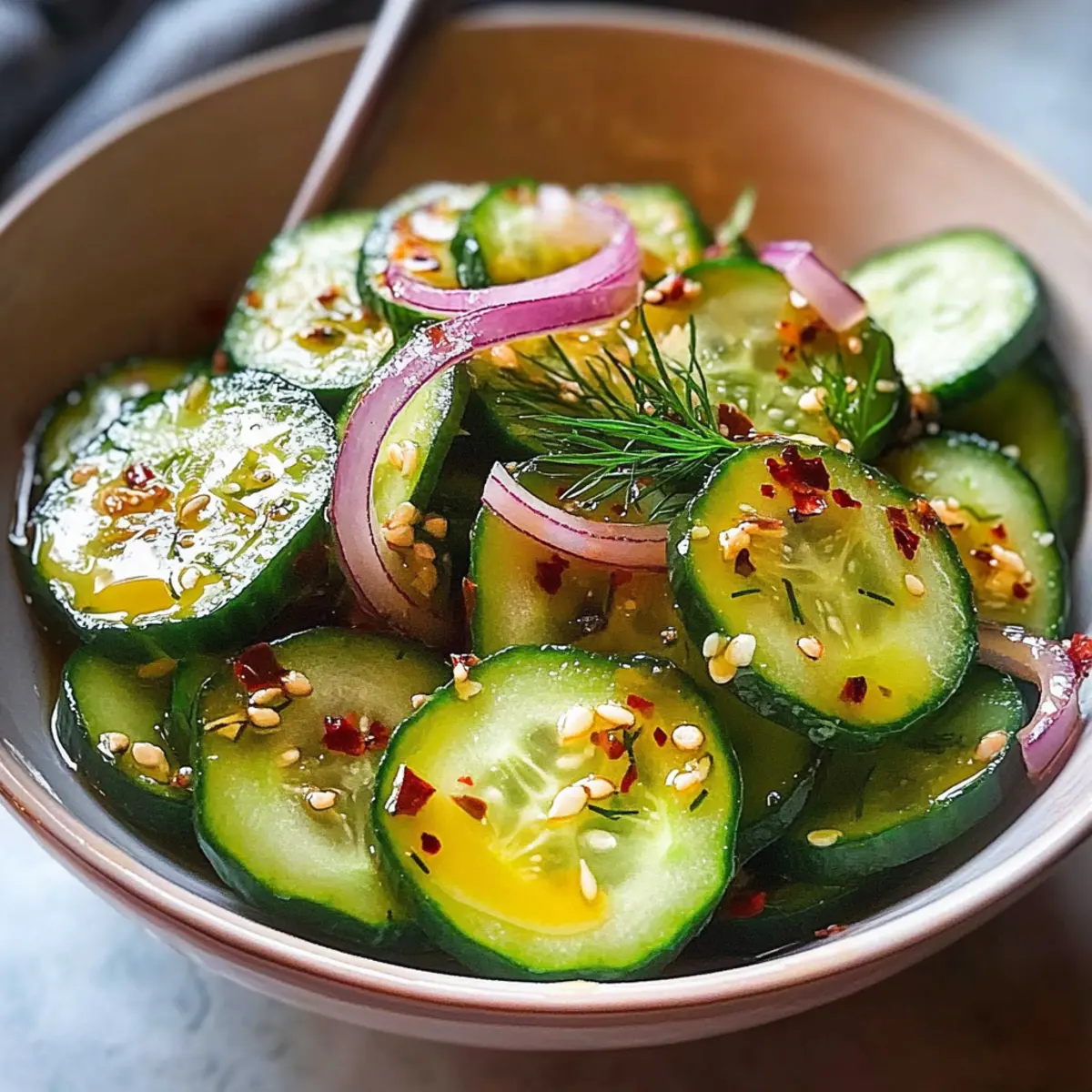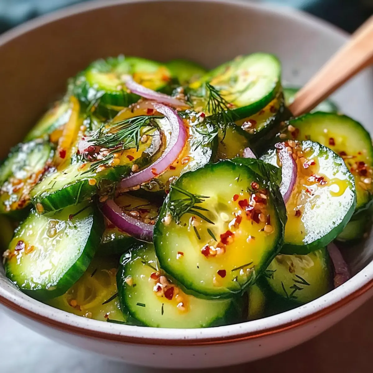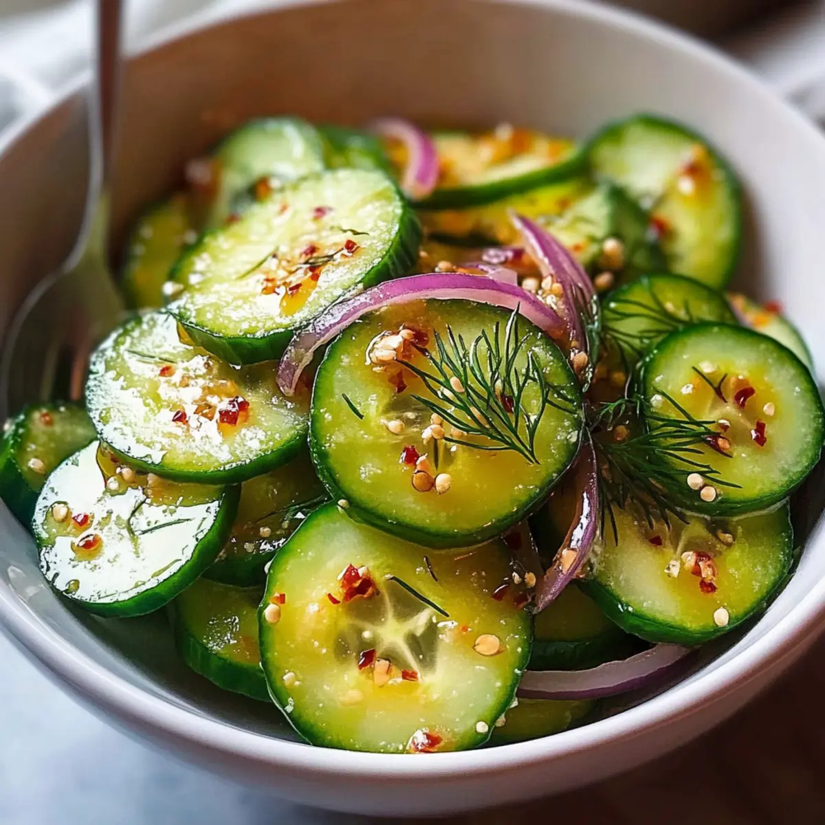 “Crisp and refreshing” might be the ultimate praise my summer salads strive for, yet none quite hit the mark like my Perfect Cucumber Salad. Its vibrant, luscious slices of cucumber and red onion, all delicately bathed in a sweet and tangy vinegar dressing, create a refreshing side that’s hard to resist. This salad doesn’t just brighten up any meal; it’s a quick recipe that you can prepare ahead, perfect for those sunny afternoons when the grill is firing up. Whether you’re serving it alongside grilled meats or taking it to your next potluck, this salad comes with the bonus of healthy goodness that leaves you feeling light and energized. Ready to discover how to elevate your summer gatherings with this delightful dish? Let’s dive in! Why is this cucumber salad a must-try? Freshness at Its Finest: This Perfect Cucumber Salad shines with its crisp texture and refreshing taste, making it the ultimate summer side dish. Quick and Easy: With minimal prep time and simple steps, you’ll have a vibrant salad ready in no time—ideal for busy days. Healthy Choice: Packed with hydrating cucumbers and flavorful herbs, it’s a light dish that pairs beautifully with rich main courses like grilled meats. Versatile Variations: From the zingy Asian Style to the comforting Creamy Ranch, this recipe can adapt to any flavor profile! Make-Ahead Magic: Preparing this salad in advance enhances its flavors, making it a perfect choice for potlucks and gatherings. Crowd-Pleaser: Whether you’re hosting friends or serving family, this cucumber salad is sure to be a hit at any table! Perfect Cucumber Salad Ingredients For the Salad Cucumbers – Provide crispness and hydration; use medium-sized ones, peeled and seeded if preferred. Red Onion – Adds a sharp flavor; be sure to slice it thinly to blend well. For the Dressing White Vinegar – Gives a delightful tanginess; rice vinegar can be a great substitute for a milder taste. Sugar – Balances the acidity; honey or maple syrup can be used for a natural sweetness. Salt – Extracts moisture from cucumbers, keeping the salad crisp; don’t forget a little extra for salting. Black Pepper – Adds warmth to the dressing; adjust according to your spice preference. Garlic Powder – An optional ingredient that brings extra flavor to the salad. Olive Oil – Use this optional ingredient for added richness if desired. For the Flavor Boost Fresh Dill – An aromatic herb that elevates the flavor; mint or parsley works as a nice alternative. Celery Seed – Optional; just a pinch adds depth to the dressing and a hint of earthiness. Whether you’re serving this perfect cucumber salad as a refreshing side or making it ahead for your next gathering, it’s bound to impress with each delightful bite! Step‑by‑Step Instructions for Perfect Cucumber Salad Step 1: Prep Cucumbers Begin by washing your medium-sized cucumbers thoroughly under cold water. If desired, peel them for a smoother texture, then slice them as thinly as possible, aiming for even pieces that capture the dressing beautifully. Place the sliced cucumbers into a large mixing bowl, creating a base for your Perfect Cucumber Salad. Step 2: Salt & Drain Sprinkle a generous amount of salt over the sliced cucumbers, ensuring each piece is well-coated. Toss them gently to distribute the salt evenly, then let them rest for 30 minutes. This step is crucial as it allows the cucumbers to release excess water, resulting in a deliciously crisp salad. Step 3: Make Dressing While the cucumbers are draining, grab a small bowl to prepare the dressing. Combine white vinegar, sugar, black pepper, and garlic powder (if using). Stir the mixture until the sugar fully dissolves and the ingredients blend harmoniously. The dressing should have a balanced tangy-sweet flavor that will complement your Perfect Cucumber Salad. Step 4: Combine Once the cucumbers have drained and you’ve patted them dry with a paper towel, add the thinly sliced red onion and fresh dill to the bowl. Pour the prepared dressing over the cucumbers and gently toss everything together, ensuring even coverage. This step allows all the flavors to meld and enhances the freshness of your salad. Step 5: Chill Transfer your mixed salad to the refrigerator and let it chill for at least 1 hour. This cooling time allows the cucumbers and onions to soak up the dressing while preventing any excess water from diluting the flavors. Stir occasionally to redistribute the dressing and ensure a refreshing taste in your Perfect Cucumber Salad. Step 6: Serve When ready to serve, give the salad a gentle stir to reintegrate any settled dressing. Use a slotted spoon for serving, as this will help manage excess liquid. Your Perfect Cucumber Salad will be vibrantly cool, crispy, and packed with delightful flavors, making it an ideal accompaniment to any summer meal. Expert Tips for Perfect Cucumber Salad Dry Cucumbers Well: Ensure cucumbers are thoroughly dried after salting to avoid a watery salad. Excess moisture can dilute flavors. Use Thin Slices: Slice your cucumbers and red onion as thinly as possible for the best texture and flavor distribution in your Perfect Cucumber Salad. Chill Time Matters: Let the salad chill for at least an hour to allow flavors to meld. This also keeps the cucumbers crisp and refreshing. Adjust Seasonings: Taste the dressing before adding to the salad and adjust sugar, vinegar, or salt to your preference for a perfectly balanced flavor. Incorporate Variations: Feel free to experiment with different herbs or dressings, like a creamy ranch or zesty ginger for a unique twist on the classic cucumber salad. What to Serve with Perfect Cucumber Salad? Elevate your summer dining experience with delightful pairings that complement this refreshing dish beautifully. Grilled Chicken: The juicy, smoky flavors of grilled chicken make a fantastic contrast to the crisp salad, keeping your meal light yet satisfying. Shrimp Tacos: Tender shrimp seasoned
