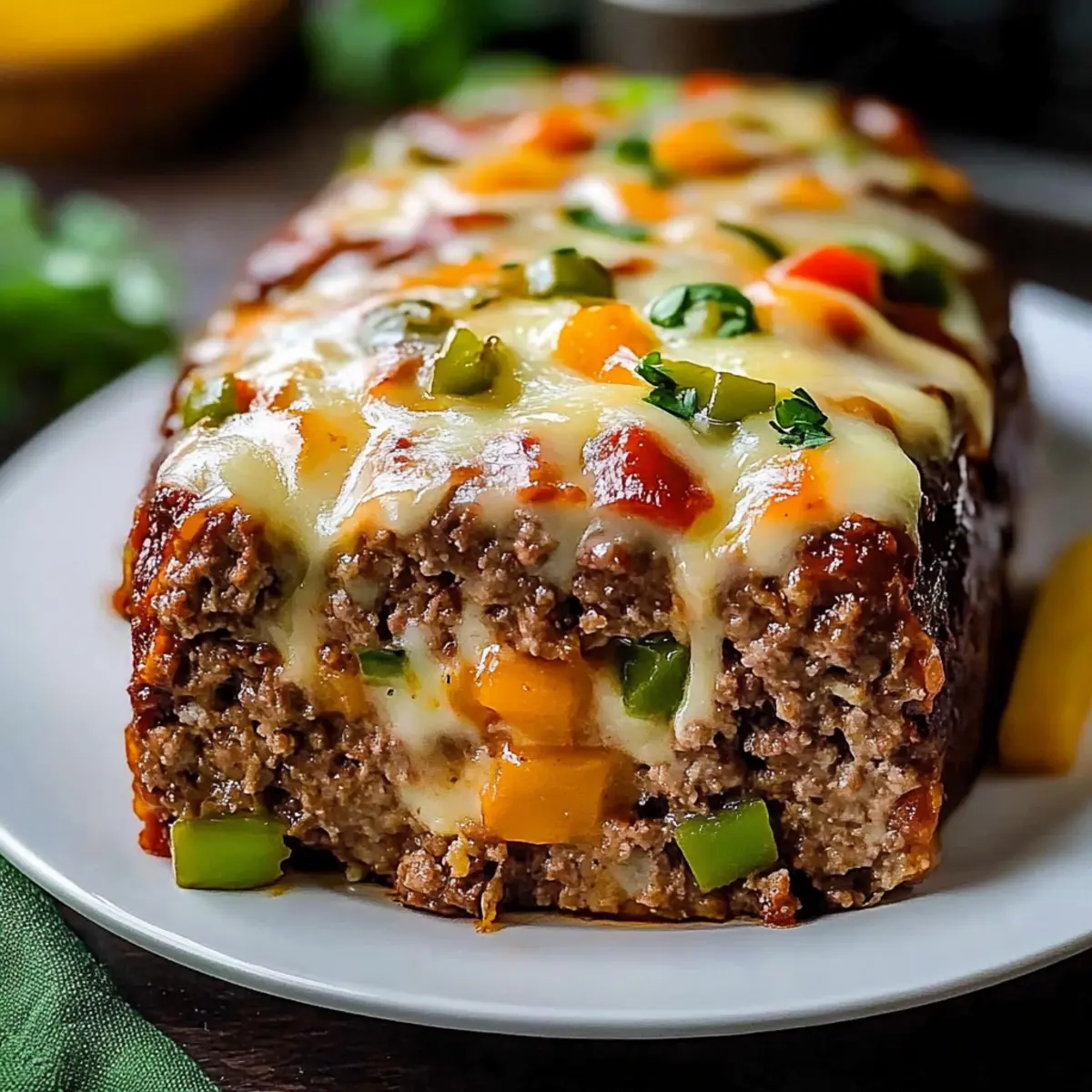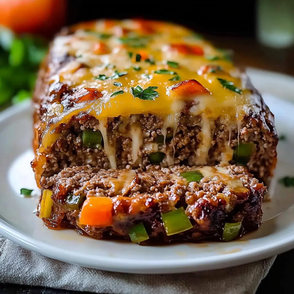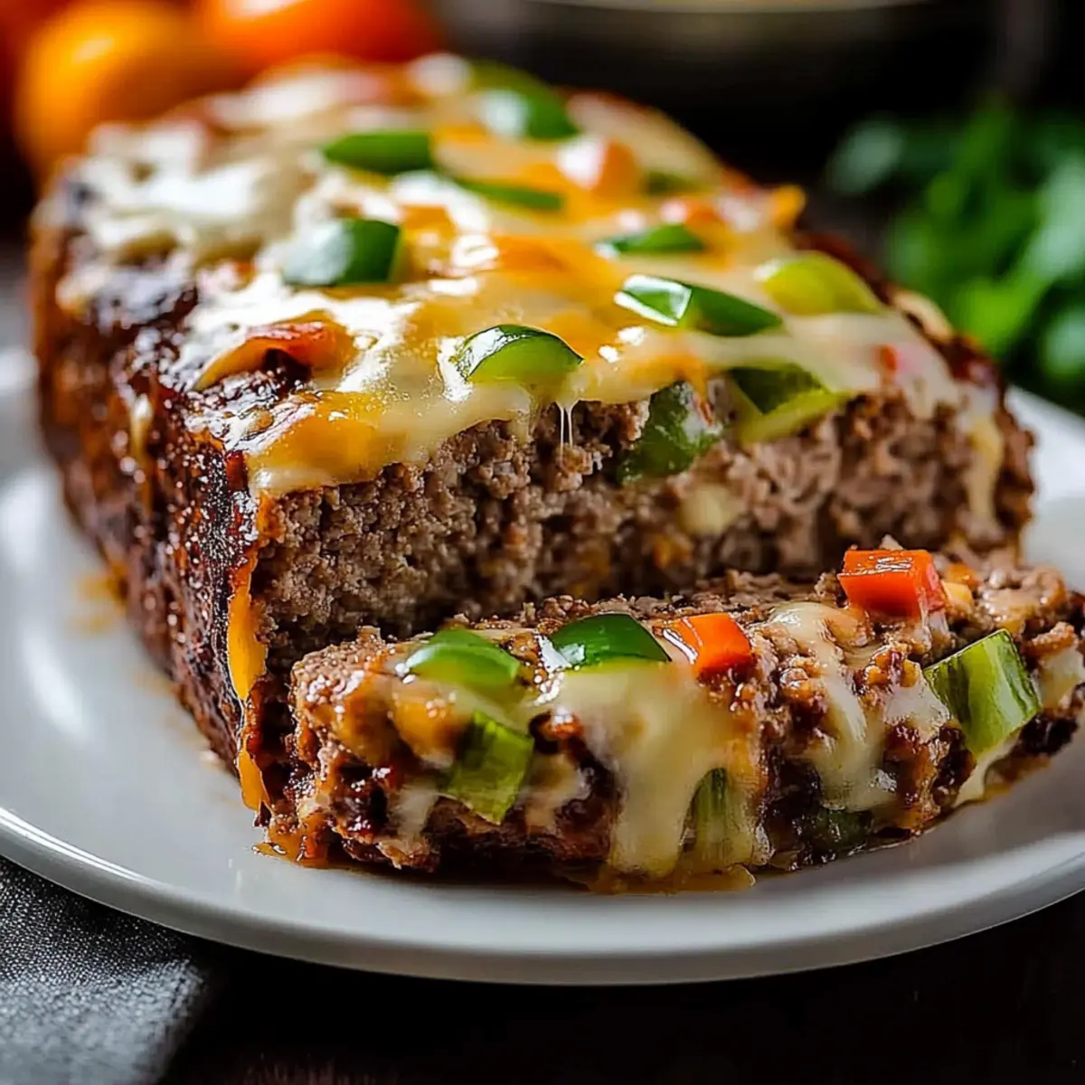 As I watched the steam rise from the oven, I couldn’t help but feel a wave of nostalgia wash over me, reminding me of cozy family dinners. This Cheesy Philly Cheesesteak Meatloaf blends the beloved, robust flavors of a classic Philly cheesesteak with the comforting texture of traditional meatloaf. What’s even better? It’s family-friendly and perfect for meal prep, making it an ideal choice for busy weeknights. Each slice reveals a gooey provolone center nestled within a crispy crust, promising to turn even the most hectic dinners into something special. Ready to create a comforting meal that your loved ones will rave about? Let’s dive in! Why is this meatloaf so special? Comforting, Flavorful Fusion: This Cheesy Philly Cheesesteak Meatloaf masterfully combines two classics into one delectable dish that’s sure to satisfy. Time-Saving Delight: Whipping this up is a breeze, perfect for meal prep and busy weeknights. Versatile Ingredients: Feel free to swap in lean ground turkey or add your favorite veggies, making it customizable for everyone’s taste! Irresistible Cheese Center: The gooey provolone at the heart creates a flavor explosion that’s simply unforgettable. Family-Friendly Treat: It’s a hit with both kids and adults, ensuring everyone gathers around the dinner table with joy. For more delicious comfort food ideas, check out my recipes for Philly Cheesesteak Rolls or try these tasty Keto Philly Cheesesteak options! Philly Cheesesteak Meatloaf Ingredients For the Meatloaf Butter – Adds richness and moisture during sautéing vegetables; substitute with olive oil for a lighter option. Yellow Onion – Provides sweetness and depth of flavor; can substitute with shallots for a milder taste. Green Bell Pepper – Contributes fresh, slightly bitter notes; substitute with red bell pepper for sweetness or chopped jalapeños for heat. Brown Mushrooms – Adds umami and moisture to the meatloaf; substitute with any mushroom variety or omit if desired. Kosher Salt – Enhances flavor; regular table salt can be used, but use about half due to its finer grain. Ground Beef (80/20 or 85/15) – Forms the meatloaf base, offering a balance of flavor and moisture; substitute with ground turkey or chicken for a lighter option. Ketchup – Adds sweetness and moisture; use a homemade version or low-sugar option for a healthier alternative. Worcestershire Sauce – Provides depth and savory umami flavor; soy sauce can be used as a substitute for a gluten-free version. Eggs – Acts as a binder to hold the meatloaf together; commercial egg substitutes can be used for a vegan alternative. Panko Breadcrumbs – Adds lightness and texture; substitute with whole wheat breadcrumbs for added fiber. For the Cheese Layer Provolone Cheese – The star ingredient that adds gooeyness and richness; can be replaced with mozzarella or cheese whiz for variation. Dive into this delicious Philly Cheesesteak Meatloaf and savor the unforgettable flavors! Step‑by‑Step Instructions for Philly Cheesesteak Meatloaf Step 1: Preheat the Oven Begin by preheating your oven to 375°F (190°C) to ensure it’s ready for baking. While the oven heats up, prepare a loaf pan by spraying it generously with nonstick cooking spray, which will help prevent the meatloaf from sticking. Step 2: Sauté the Vegetables In a medium skillet, melt about 2 tablespoons of butter over medium heat. Add chopped yellow onion, diced green bell pepper, and sliced brown mushrooms. Season with kosher salt and pepper. Sauté these vegetables for about 4 minutes until they’re softened and lightly browned, then set aside to cool slightly. Step 3: Combine Meatloaf Ingredients In a large mixing bowl, combine 1 ½ pounds of ground beef with the sautéed vegetables, ¼ cup of ketchup, 2 tablespoons of Worcestershire sauce, 2 beaten eggs, and 1 cup of panko breadcrumbs. Mix gently until just combined, being careful not to overwork the meat to keep the meatloaf tender. Step 4: Layer the Cheese Press half of the meat mixture into the prepared loaf pan, ensuring it covers the bottom evenly. Next, create a well along the center and layer it with slices of provolone cheese, approximately 6-8 slices. Gently press the remaining meat mixture over the cheese, shaping it into a rounded loaf on top. Step 5: Bake the Meatloaf Place the filled loaf pan in your preheated oven and bake for about 40 minutes. After this time, check the internal temperature to ensure it’s around 160°F (71°C). Remove it from the oven and sprinkle about ½ cup of shredded provolone cheese on top, then return it to the oven for an additional 15-20 minutes until the cheese is melted and bubbly. Step 6: Cool & Serve Once baked to perfection, take the meatloaf out of the oven and let it cool for about 10 minutes. This resting period is essential for the juices to redistribute, making it easier to slice. After cooling, slice the Philly Cheesesteak Meatloaf and serve warm, delighting in the gooey cheese center and comforting flavors. Expert Tips for Philly Cheesesteak Meatloaf Cool the Veggies: Make sure to let the sautéed vegetables cool slightly before mixing them with the raw meat. This prevents the eggs from cooking prematurely and keeps your meatloaf moist. Rest Before Slicing: Allow your meatloaf to rest for about 10 minutes after baking. This helps the juices redistribute, making for easier slicing and a tender texture. Layer the Cheese Properly: For the best flavor and gooey texture, ensure the provolone cheese is layered neatly in the center of the meatloaf. This way, every bite is perfectly cheesy. Use Quality Meat: Opt for ground beef with a fat content of 80/20 or 85/15 for the best flavor and moisture. Less fat might result in a drier meatloaf, while more can make it greasy. Watch the Bake Time: Keep an eye on your meatloaf as it bakes. Ovens can vary in temperature, so check for doneness when it reaches an internal temperature of 160°F (71°C). Make Ahead Options Thes
