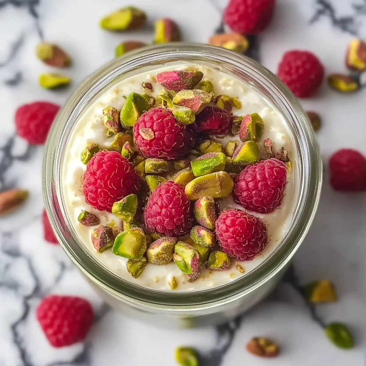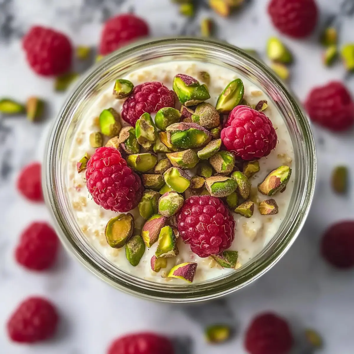 The next morning, retrieve your pistachio overnight oats from the fridge. If they seem too thick, stir in an extra splash of non-dairy milk to reach your desired creaminess. Top your oats with your choice of non-dairy yogurt, a handful of fresh raspberries, and a generous sprinkle of chopped pistachios to enhance both flavor and texture before enjoying!
