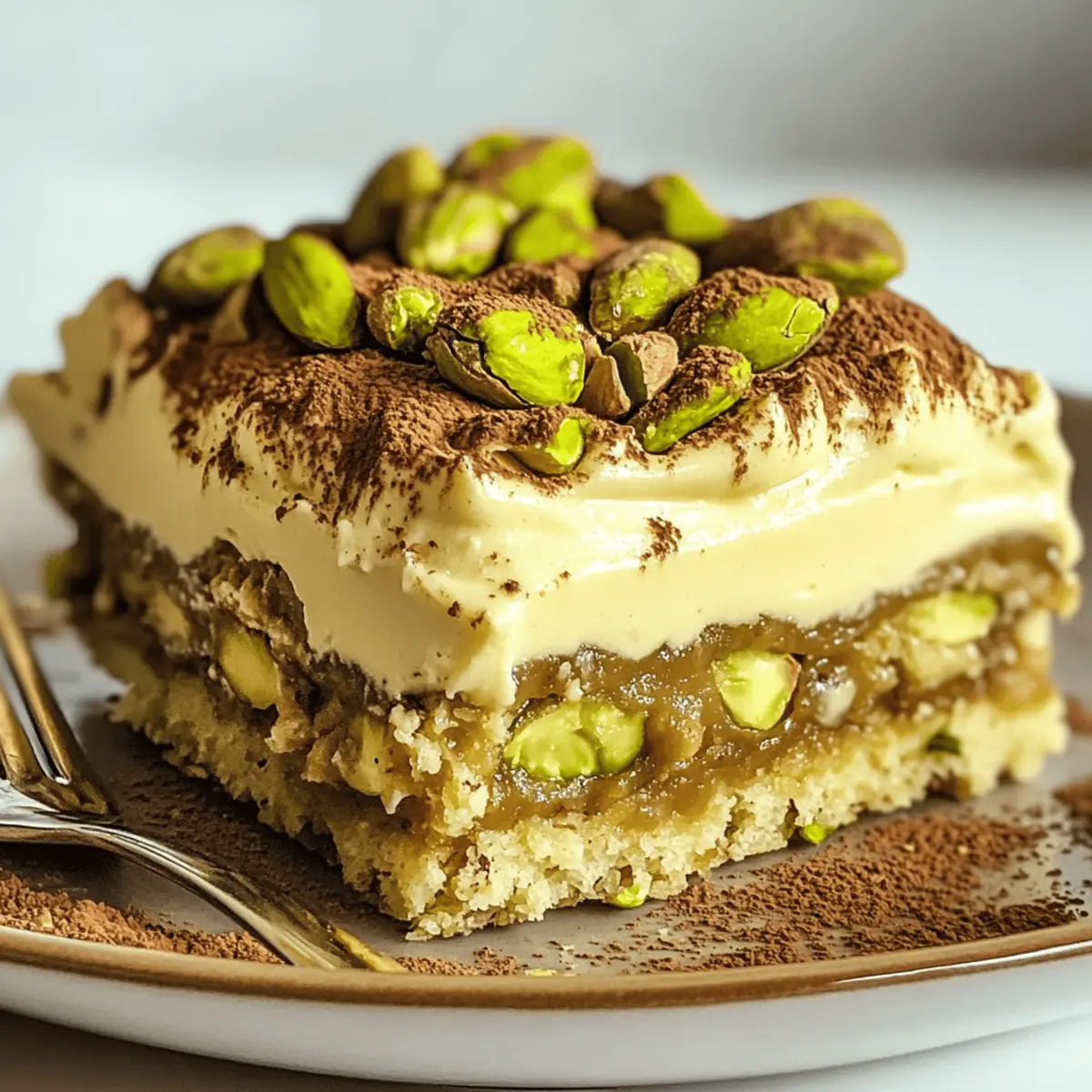 Have you ever wondered how to savor the beloved flavors of traditional tiramisu without any eggs or dairy? Let me introduce you to my Vegan Pistachio Tiramisu Recipe—an indulgent treat that’s perfect for impressing guests or simply enjoying a sweet moment at home. This effortless dessert features a silky cashew-based mascarpone paired with the delightful nuttiness of pistachios, all layered with coffee-soaked vegan ladyfingers. The result is a light, airy dessert that’s not just vegan; it’s also a crowd-pleaser, making it a fantastic choice for anyone looking to elevate their dessert game. Plus, it’s gluten-free, so everyone can join in on the joy! Are you ready to discover how to whip up this delightful treat? Why Try This Pistachio Tiramisu Recipe? Indulgence Redefined: This vegan version captures the essence of traditional tiramisu, blending rich pistachio flavors without the eggs or dairy. Crowd-Pleasing Delight: Ideal for gatherings, your guests will rave about this delicious dessert, and you’ll love the compliments! Simple Steps: With minimal prep and straightforward instructions, you’ll craft a stunning dessert even as a kitchen novice. Versatile Variations: Feel free to experiment! Add a hint of almond extract or a splash of amaretto for a personalized touch. Healthy Indulgence: Not only is it a treat for your taste buds, but this Pistachio Tiramisu is gluten-free and plant-based—everyone can enjoy! Take your dessert game to the next level and impress your loved ones with this delightful recipe, whether complemented by a hot cup of coffee or served at your next dinner party. Pistachio Tiramisu Recipe Ingredients For the Cream • Cashews – Soak beforehand for a smooth, creamy mascarpone. • Almond Milk – Adds creaminess; any plant-based milk works as a substitute. • Powdered Sugar – Provides sweetness and smooth texture; can swap for maple syrup if desired. • Pistachios – Rich flavor and color; use unsalted for the best taste. • Pistachio Paste – Optional but recommended for an extra pistachio kick. • Vanilla Extract – Adds depth; replace with almond extract for a unique twist. • Salt – Balances the sweetness. For the Ladyfingers Layer • Vegan Ladyfingers – Essential for structure; use homemade or store-bought options. • Coffee or Espresso – Strongly brewed to soak ladyfingers for flavor; cool before using. • Amaretto (Optional) – For that delightful nutty flavor; skip if preferred. This Pistachio Tiramisu Recipe brings together harmonious flavors and textures, making it a delightful indulgence for everyone! Step‑by‑Step Instructions for Vegan Pistachio Tiramisu Recipe Step 1: Prepare Cashew Cream Begin by draining and rinsing 1 cup of soaked cashews, placed in water for at least 4 hours. In a high-speed blender, combine the cashews with ½ cup of almond milk, ½ cup of powdered sugar, ½ cup of pistachios, 2 tablespoons of pistachio paste, 1 teaspoon of vanilla extract, and a pinch of salt. Blend until a smooth, creamy texture forms, approximately 2-3 minutes. Step 2: Chill Cream Transfer the smooth pistachio cream to a mixing bowl and cover it tightly with plastic wrap. Refrigerate for at least 1 hour, allowing it to thicken and develop richer flavors. This cooling process is essential for achieving the right velvety consistency for your Pistachio Tiramisu, enhancing its overall indulgence. Step 3: Brew Coffee While the cream chills, brew a robust cup of coffee or espresso—aim for about 1 cup of strong brew. If using amaretto, mix in 2 tablespoons at this stage for an added nutty flavor. Allow your coffee to cool to room temperature; this will prevent the ladyfingers from becoming too soggy once dipped. Step 4: Soak Ladyfingers Quickly dip each vegan ladyfinger into the cooled coffee, ensuring they only soak for a second to retain their shape. As you remove them from the coffee, gently shake off any excess liquid. Layer the soaked ladyfingers neatly in the bottom of your serving dish, creating a solid base for the Pistachio Tiramisu. Step 5: Layer Dessert Spread half of the prepared pistachio cream evenly over the layer of soaked ladyfingers, smoothing it out to ensure even coverage. Follow with another layer of dipped ladyfingers, ensuring they fit snugly next to each other. Finish by spreading the remaining pistachio cream over the top layer, creating a beautiful, creamy finish that showcases the vibrant green color of the pistachios. Step 6: Chill Dessert Cover the assembled dessert with plastic wrap or a lid and refrigerate for at least 3.5 hours, or if time allows, overnight. This chilling period is crucial for setting the layers together, allowing the flavors of the pistachio cream and coffee-soaked ladyfingers to meld beautifully, resulting in an unforgettable Pistachio Tiramisu. Step 7: Finalize and Serve Once set, remove the dessert from the fridge. Dust the top generously with cocoa powder for a classic tiramisu finish and garnish with chopped pistachios for added texture and color. Slice into portions and serve chilled to indulge your guests with an exquisite vegan treat that showcases the delightful flavors of this Pistachio Tiramisu Recipe. How to Store and Freeze Pistachio Tiramisu Fridge: Store any leftovers in an airtight container in the refrigerator for up to 3 days for optimal freshness and flavor retention. Freezer: Although it’s best fresh, you can freeze the unassembled layers (ladyfingers and pistachio cream separately) for up to 1 month. Thaw in the fridge before assembling. Reheating: There’s no need to reheat; simply serve chilled for the best experience. The creamy texture of this Pistachio Tiramisu recipe truly shines when served cold. Make-Ahead: Feel free to prepare the dessert a day in advance! Making it ahead not only melds the flavors beautifully but also saves you time for last-minute gatherings. Make Ahead Options These Pistachio Tiramisu treats are perfect for meal prep enthusiast