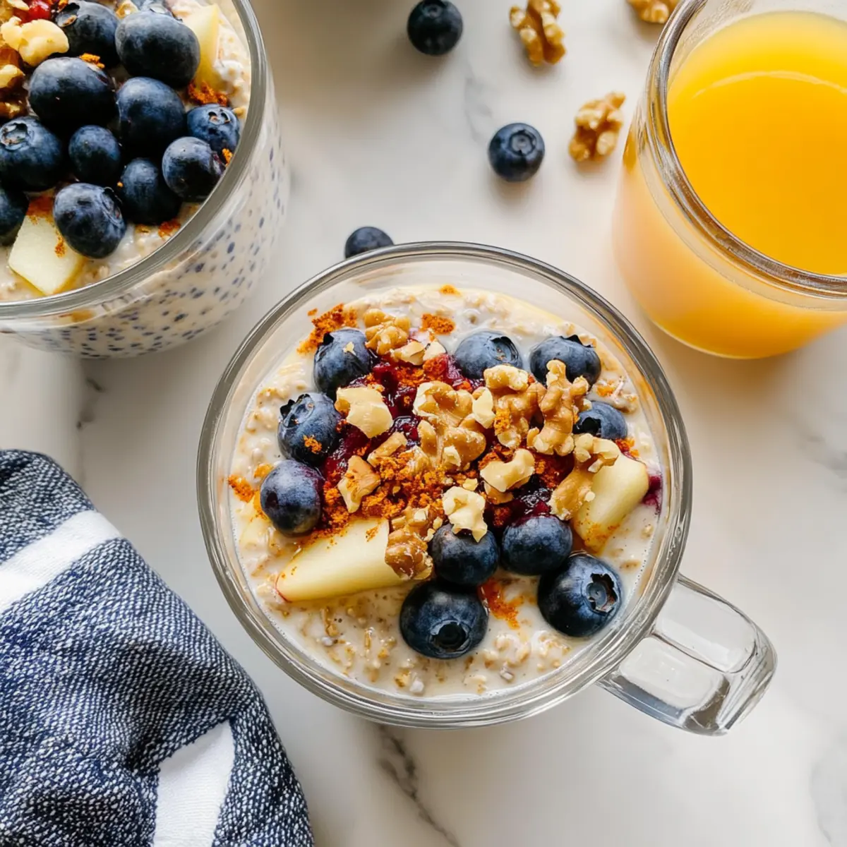 1. Spoon the overnight oats into serving bowls or jars. Top with fresh blueberries, additional walnuts, and a sprinkle of grated apple.