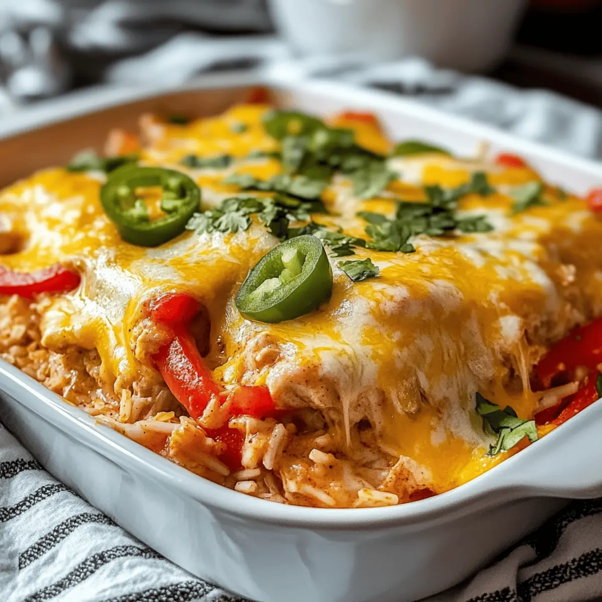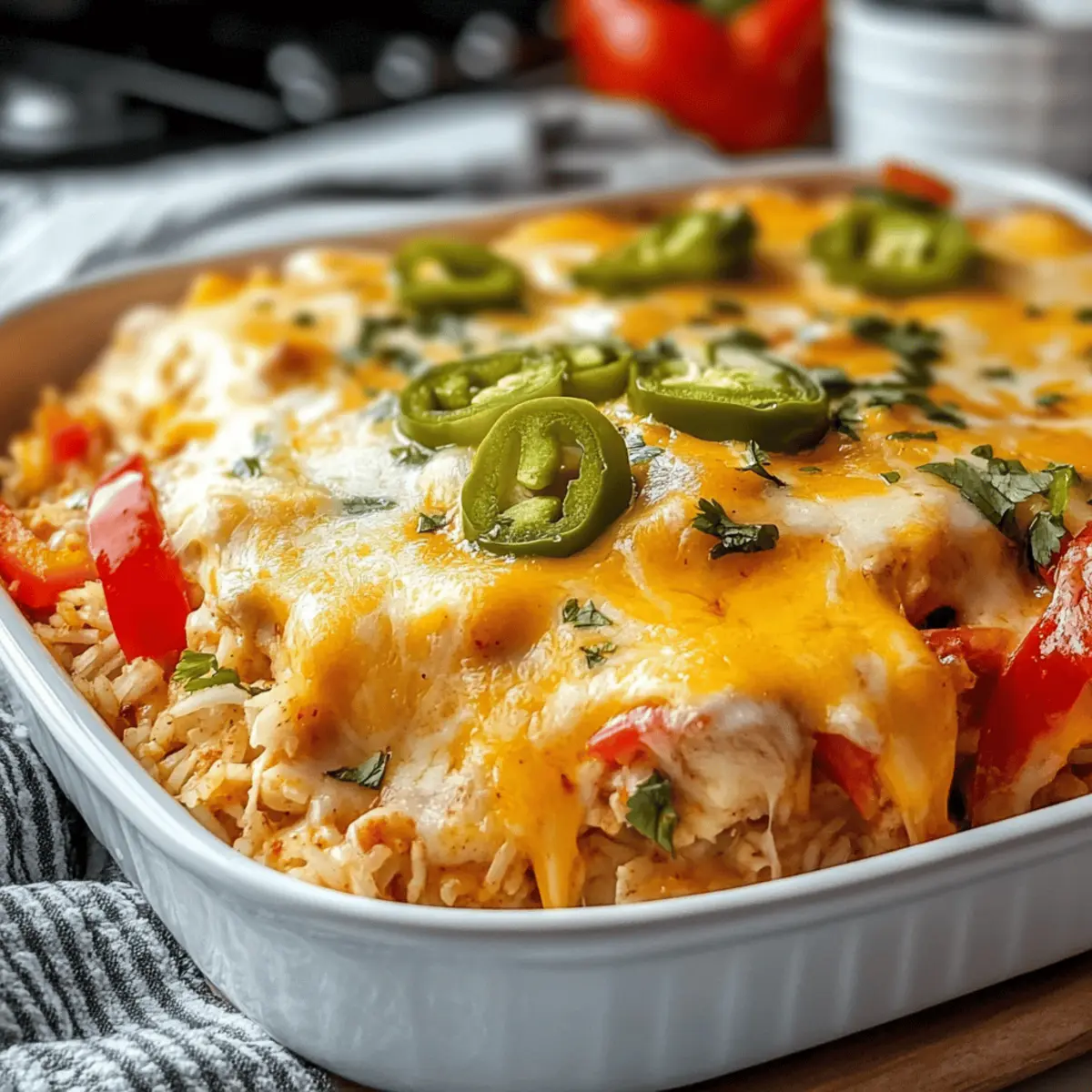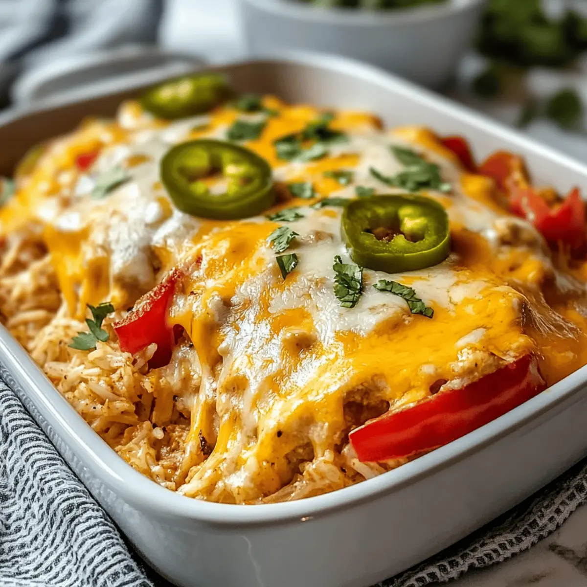 As I stood in my kitchen, the rich aroma of sautéing peppers began to dance through the air, transporting me straight to a cozy Tex-Mex eatery. Today, I’m excited to share my Queso Smothered Fajita Casserole, a dish that combines the vibrant flavors of sizzling fajitas with the comforting embrace of a cheesy casserole. This one-dish wonder makes weeknight meals effortless and is perfect for potlucks or meal prepping, ensuring you’ll always have something warm and satisfying on hand. With tender chicken, colorful bell peppers, and an indulgent queso topping, each bite is a creamy, flavorful experience that will impress family and friends alike. Are you ready to bring this cheesy delight to your table? Why is this casserole a must-try? Convenience at its finest: This Queso Smothered Fajita Casserole is the ultimate one-dish meal, making weeknight dinners a breeze. Bursting with flavor: The combination of seasoned chicken, vibrant bell peppers, and creamy queso brings an explosion of Tex-Mex taste to your table. Crowd-pleaser: Perfect for potlucks and family gatherings, this dish guarantees satisfied smiles and full bellies. Meal prep friendly: Make it ahead and store leftovers easily—just reheat for a quick, hearty meal anytime. Customization galore: Feel free to add black beans or corn for extra texture, or serve with warm tortillas for a complete experience. With such ease and flavor, you’ll wonder how you ever lived without it! Queso Smothered Fajita Casserole Ingredients • Get ready to create cheesy bliss! For the Casserole Base • Cooked Chicken Breast or Thighs (2 cups) – This protein-packed base adds heartiness, while shredded pieces blend beautifully with other ingredients. • Bell Peppers (1 cup each of red, yellow, and green) – These colorful treasures not only enhance the visual appeal but also add sweetness and crunch; frozen can work in a pinch, but may change the texture. • Yellow Onion (1 medium) – Its aromatic flavor elevates the dish; feel free to swap it with shallots for a gentler profile. • Taco Seasoning (1 tablespoon) – This blend infuses the casserole with classic Tex-Mex flavor; consider a homemade mix for your ideal spice level. • Cooked White Rice (2 cups) – Acts as a satisfying base; for a gluten-free option, swap with quinoa. • Diced Tomatoes with Green Chilies (1 can, 10 oz) – Provides moisture with a hint of heat; plain diced tomatoes can make it milder. • Cream Cheese (4 oz) – This creamy component lends richness; sour cream is a lighter alternative if you prefer. For the Cheesy Topping • Shredded Sharp Cheddar Cheese (1 cup) – Delivers a bold flavor and melts effortlessly; use mild cheddar for a gentler taste. • Shredded Monterey Jack Cheese (1 cup) – Melts smoothly, creating that perfect queso texture; feel free to experiment with other melting cheeses as well. • Fresh Jalapeño (1, sliced, optional) – Adds a spicy kick; omit it for a milder dish that even the little ones can enjoy. Step‑by‑Step Instructions for Queso Smothered Fajita Casserole Step 1: Preheat the Oven Begin by preheating your oven to 375°F (190°C). This ensures the Queso Smothered Fajita Casserole bakes evenly and the cheese melts beautifully as it cooks. A properly heated oven is key to achieving a bubbly and golden cheese topping, so don’t skip this step! Step 2: Sauté the Vegetables In a large skillet, heat a splash of cooking oil over medium-high heat. Add one cup each of sliced red, yellow, and green bell peppers along with the diced medium yellow onion. Sauté for about 5–7 minutes, stirring occasionally until they are tender and slightly charred, filling your kitchen with delightful aromas. Step 3: Mix in Chicken and Seasoning Stir in the shredded cooked chicken (2 cups) and taco seasoning (1 tablespoon) to the sautéed vegetables. Continue cooking for another 2–3 minutes, mixing thoroughly until the chicken is heated through and well-coated with the seasoning. The vibrant colors should shine through, making this Queso Smothered Fajita Casserole visually appealing. Step 4: Create the Creamy Base Add the diced tomatoes with green chilies (1 can) and cream cheese (4 oz) to the skillet. Stir continuously for about 4–5 minutes, until the cream cheese melts and combines with the other ingredients, creating a creamy mixture that binds everything together. Turn off the heat once the mixture is smooth and well-blended. Step 5: Prepare the Baking Dish Grease a 9×13 inch baking dish generously to prevent sticking. Spread the cooked white rice (2 cups) evenly across the bottom of the dish, creating a solid base. Make sure the rice is evenly distributed to support the flavorful toppings that will come next. Step 6: Layer the Chicken Mixture Pour the creamy chicken and vegetable mixture over the rice layer. Smooth it out evenly with a spatula, ensuring every bite of your Queso Smothered Fajita Casserole will be rich and flavorful with the seasoned chicken and veggies. Step 7: Add the Cheese Topping Sprinkle shredded sharp cheddar cheese (1 cup) and Monterey Jack cheese (1 cup) generously over the top of the casserole. The cheese will melt and blend into the dish, creating a deliciously gooey layer on top that is essential for this comforting Tex-Mex favorite. Step 8: Optional Jalapeño Garnish If desired, add sliced fresh jalapeño on top for an extra kick. This step is optional, but it adds a beautiful pop of color and extra flavor to your Queso Smothered Fajita Casserole, making it appealing for those who enjoy a bit of heat. Step 9: Bake to Perfection Place the casserole in the preheated oven and bake uncovered for 20–25 minutes. Keep an eye on it; the cheese should be melted and bubbly with a slight golden hue on top. This ensures your dish is ready to serve and poised to impress everyone at the table. Queso Smothered Fajita Casserole Variations Feel free to customize your Queso Smothered Fajita Casserole with these fun and t