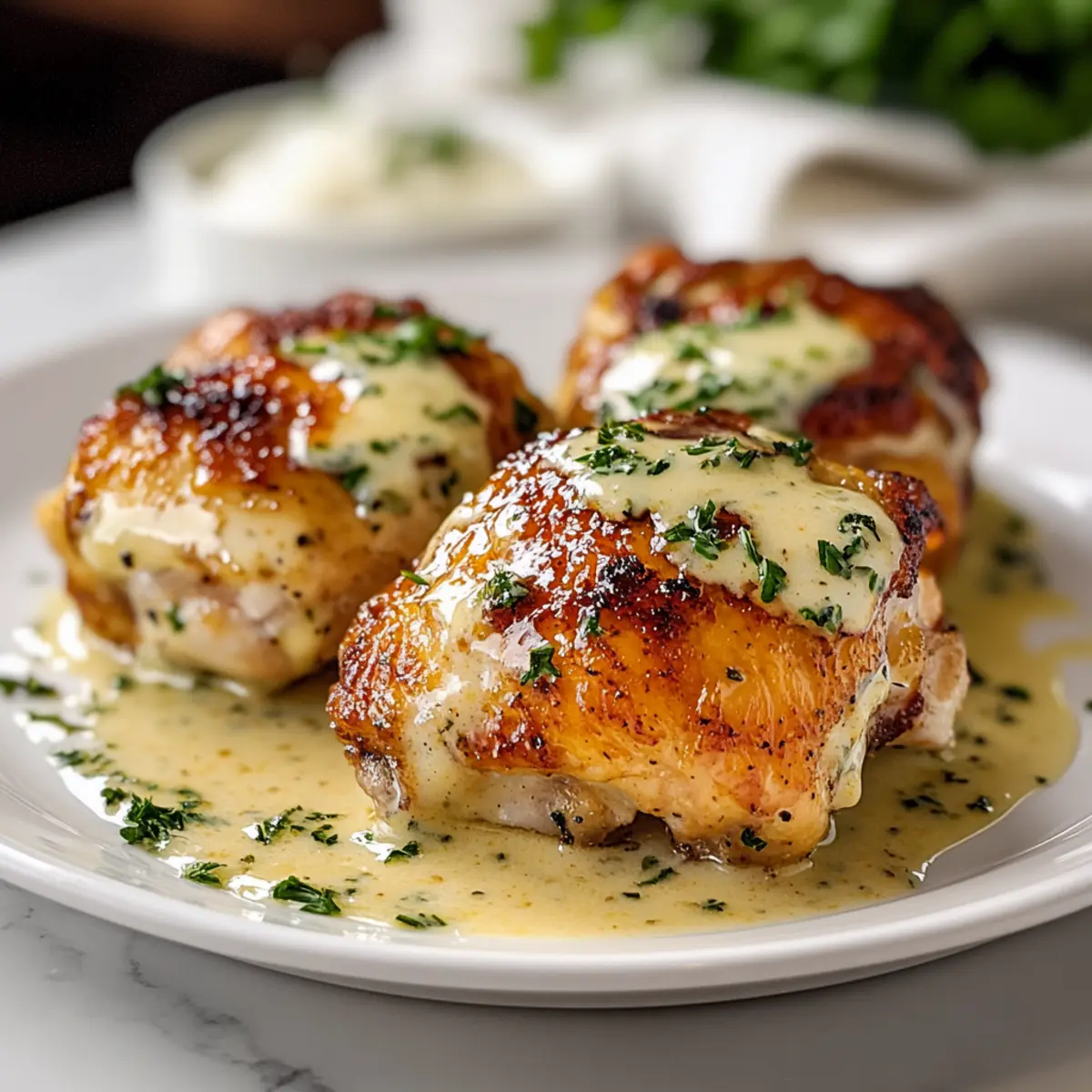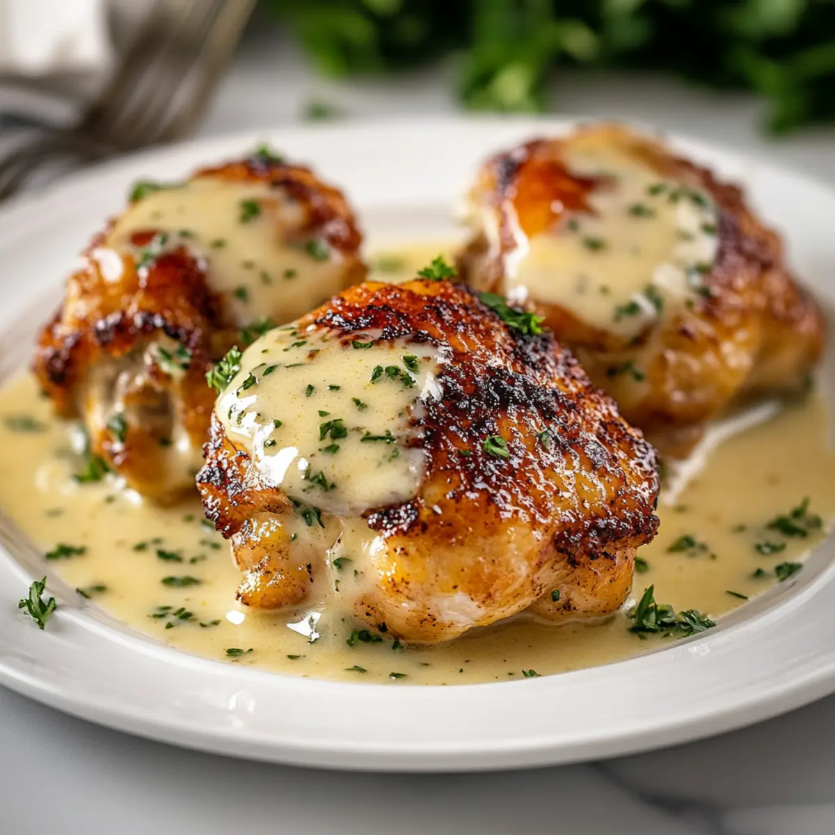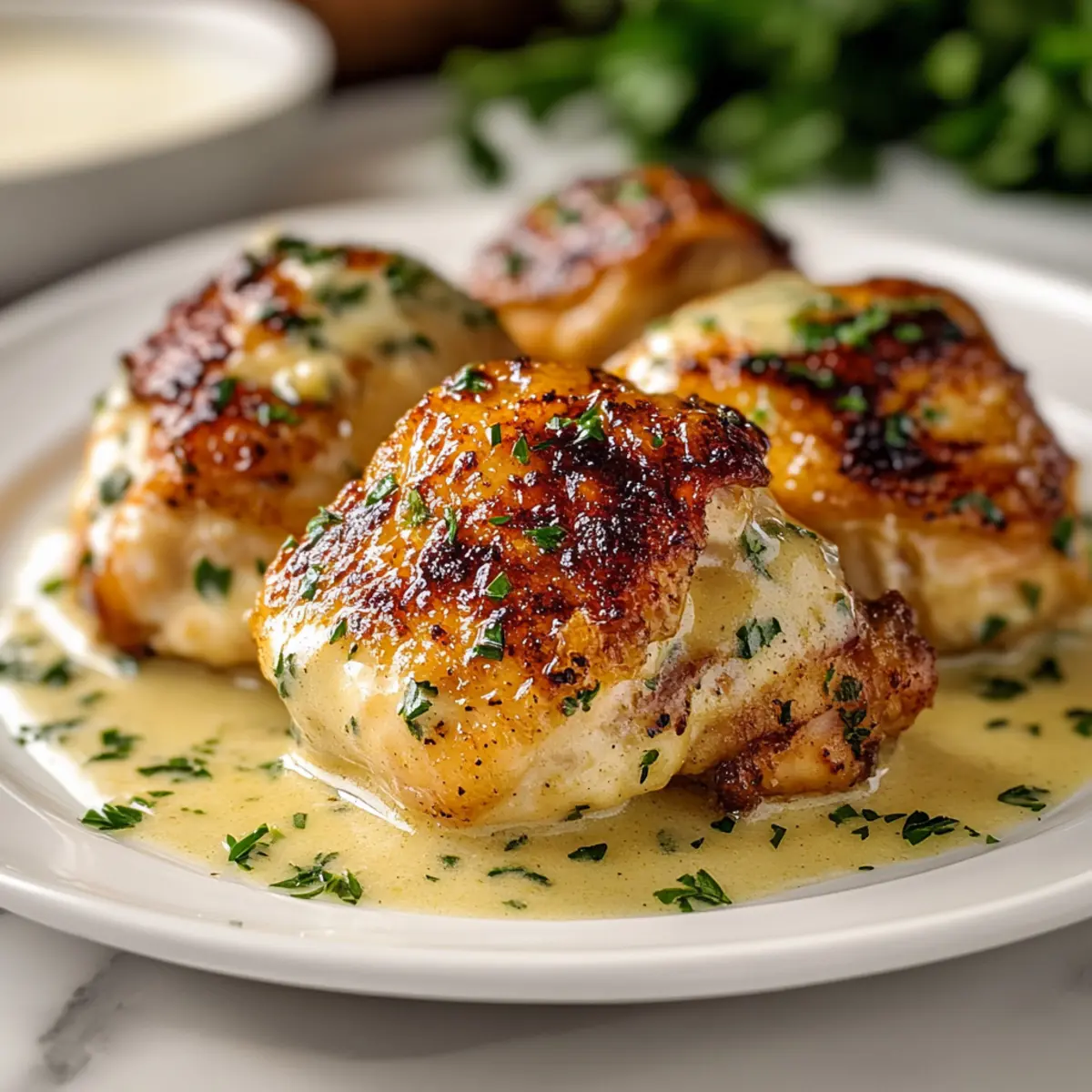 “Did you try that new recipe yet?” It was a question that sparked memories of cozy dinners and laughter around the table. If you’re anything like me, preparing meals that delight your family is a joyous part of the week. Enter Juicy Ranch Chicken Thighs with Creamy Herb Glaze—your new go-to comfort food that’s both gluten-free and effortlessly simple. Ideal for those hectic weeknights, these chicken thighs promise juicy, tender meat enhanced by a creamy herby glaze that everyone will devour. Plus, with a golden, crispy skin, this dish beautifully combines ease and flavor, making it a real crowd-pleaser. So, are you ready to discover just how easy it can be to elevate your family dinner? Let’s dive in! Why are Ranch Chicken Thighs So Irresistible? Juicy, tender meat: Each bite of these ranch chicken thighs bursts with succulence, elevating your weeknight meals. Crispy skin: Achieving that perfect golden-brown exterior gives this dish an appealing crunch. Effortless prep: With just a few simple ingredients, you’ll be on your way to a delicious dinner in no time! If you’re looking for more flavorful chicken ideas, you might enjoy Honey Bourbon Chicken or our hearty Lemon Chicken Orzo. Customizable flavors: Feel free to mix in your favorite herbs or spices, tailoring it to your family’s taste. Crowd-pleaser: This dish is sure to win over both kids and adults alike, making it a staple in your kitchen! Ranch Chicken Thigh Ingredients For the Chicken Bone-in, skin-on chicken thighs – The secret for juicy, flavorful meat and a crispy skin; you can use boneless thighs, just adjust your cooking time. Olive oil – Infuses moisture and richness; feel free to substitute with your favorite cooking oil. For the Creamy Glaze Mayonnaise – Provides a luxurious coating that keeps the chicken juicy; Greek yogurt can be a lighter alternative if desired. Sour cream – Adds a delightful tanginess; use heavy cream for a creamier texture if you prefer. Ranch seasoning mix – This mix delivers that signature herby flavor; homemade ranch seasoning works just as well. Garlic powder – A must for adding depth; you can swap it for fresh minced garlic if you like. Onion powder – Enhances savory notes; fresh onion can also be used or you can omit it entirely. Paprika – Adds subtle heat and stunning color; smoked paprika gives a richer flavor profile. Salt – Essential for bringing all flavors to life; adjust according to your taste. Freshly ground black pepper – Provides a little kick; white pepper can be a good alternative. For Garnishing Fresh parsley – This sprinkle brings freshness and color; try swapping it with other herbs like thyme or dill for a different flavor twist. Now that you have all your ranch chicken thighs ingredients ready, let’s get cooking! Step‑by‑Step Instructions for Ranch Chicken Thighs Step 1: Preheat and Prepare Begin by preheating your oven to 400°F (200°C) to ensure even cooking. While the oven heats, pat your bone-in, skin-on chicken thighs dry with paper towels—this step is crucial for achieving that coveted crispy skin. Arrange them in a baking dish, ready for the flavorful ranch coating. Step 2: Mix the Creamy Ranch Glaze In a medium mixing bowl, combine olive oil, mayonnaise, sour cream, ranch seasoning mix, garlic powder, onion powder, paprika, salt, and freshly ground black pepper. Whisk the ingredients together until smooth and creamy, creating a rich glaze that will infuse your ranch chicken thighs with flavor. Step 3: Coat the Chicken Thighs Place the prepared chicken thighs skin-side up in the baking dish. Generously slather each thigh with the creamy ranch glaze, ensuring every nook and cranny is covered. This will keep the chicken moist while building up a delightful crust. Make sure to spread the glaze evenly for the best results. Step 4: Bake to Perfection Carefully place the baking dish in your preheated oven and roast the ranch chicken thighs for 35-40 minutes. Use a meat thermometer to check for doneness; the internal temperature should reach 165°F (75°C). The skin will turn golden brown, giving a beautiful crispiness to the dish. Step 5: Broil for Extra Crispiness For an irresistible crispy finish, switch on the broiler for the last 2-3 minutes of cooking. Keep a close eye on the chicken thighs as they broil to avoid burning. The glaze will bubble and caramelize, enhancing the overall flavor and crunch of the ranch chicken thighs. Step 6: Rest and Garnish Once baked, remove the chicken thighs from the oven and allow them to rest for 5 minutes. This step helps reabsorb the juices, making each bite incredibly tender. Finally, sprinkle with freshly chopped parsley before serving to add a pop of color and freshness to your mouthwatering ranch chicken thighs. Storage Tips for Ranch Chicken Thighs Fridge: Store cooked ranch chicken thighs in an airtight container for up to 4 days. Make sure they cool completely before sealing to maintain freshness. Freezer: These chicken thighs freeze well! Place them in a freezer-safe bag or container and enjoy them for up to 3 months. For best results, label with the date. Reheating: To preserve that glorious crispy skin, reheat the ranch chicken thighs in the oven at 350°F (175°C) for about 15-20 minutes, until warmed through. Room Temperature: Avoid leaving unrefrigerated ranch chicken thighs out for more than 2 hours to ensure safety and quality. Ranch Chicken Thighs Variations & Substitutions Feel free to customize your ranch chicken thighs and experiment with delightful flavors and textures! Gluten-Free: Use certified gluten-free mayonnaise and ranch seasoning for a worry-free meal. Dairy-Free: Substitute the sour cream and mayonnaise with cashew cream or silken tofu blended until smooth. Your chicken will still be delightfully creamy! Add Heat: Mix in crushed red pepper or cayenne for a spicy twist that adds a delightful kick to your dish. The extra heat will elevate the flavors beautiful