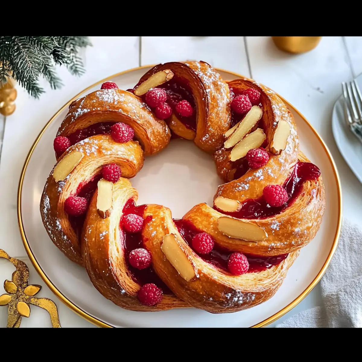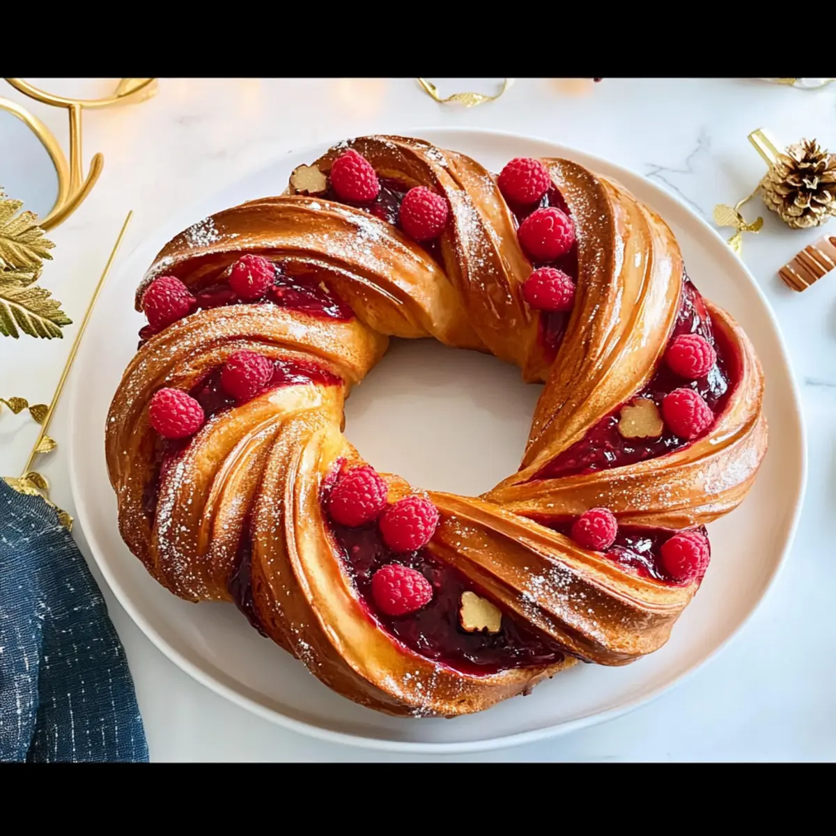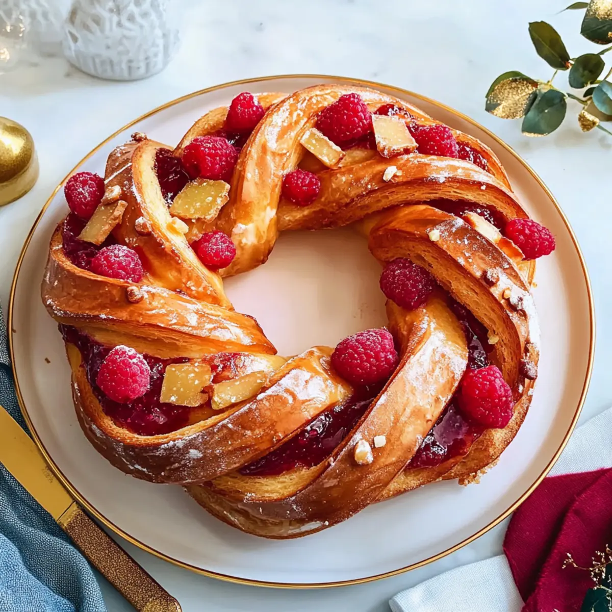 As the holiday season approaches, I find myself reminiscing about the scents that fill a warm kitchen—the sweet tang of raspberries mingling with the spicy aroma of ginger. That’s exactly what inspired my Raspberry and Ginger Bread Wreath Delight, a show-stopping dessert that transforms your holiday table into a masterpiece. This festive wreath not only looks stunning but is a joy to make, bringing a delightful contrast of flavors that will amaze your guests. Plus, it’s surprisingly quick to prepare, making it an effortless favorite during those busy holiday days. Ready to impress your loved ones and make your dessert table unforgettable? Let’s dive into this enticing recipe and create something truly special together! Why You’ll Adore This Wreath? Simplicity: This Raspberry and Ginger Bread Wreath requires no advanced baking skills, making it accessible for both novice and seasoned home cooks alike. Elegant Presentation: Its stunning shape and vibrant colors make it a perfect centerpiece that enhances any festive gathering. Irresistible Flavor: The combo of sweet raspberries and spicy ginger creates a delightful burst of taste that harmonizes beautifully. Versatile Options: Experiment with different jams or go savory by adding cheese and herbs for a unique twist that caters to everyone! Time-Saving: With easy prep and bake times, this wreath fits seamlessly into your holiday schedule, leaving you more time to celebrate with family and friends. For another delicious option, don’t forget to check out my Garlic Bread Grilled recipe that’s ideal for any gathering! Raspberry and Ginger Bread Wreath Ingredients For the Dough 1/2 cup milk, warmed – Moisture for the dough; use almond or soy milk for a dairy-free version. 1/4 cup water, warmed – Assists yeast activation; no substitutions needed. 7g (2 1/4 tsp) dried yeast – Essential leavening agent for rising; instant yeast can speed up the process. 2 Tbsp honey – Adds natural sweetness; opt for maple syrup for a vegan alternative. 4 1/4 cups plain flour, sifted – Provides structure; whole wheat flour works for added fiber. 1/3 cup caster sugar – Sweetness enhancer; brown sugar gives a richer flavor. 1 tsp salt – Balances flavor; avoid substitutes unless reducing sodium. 2 tsp finely grated lemon zest – Brightens the taste; lime zest can also be used. 2 tsp ground ginger – Adds spice; replace with freshly grated ginger for a stronger flavor. 1/2 tsp ground cinnamon – Gives warmth; can be omitted for a milder taste. 1/2 tsp ground cardamom – Adds floral notes; optional for complexity. 2 free-range eggs, lightly beaten – Adds moisture and richness; use flax eggs for a vegan option. 125g unsalted butter, melted, cooled – Provides richness; substitute with coconut oil for a dairy-free option. 2 Tbsp milk, for brushing – Ensures a golden crust; omit for dairy-free. 30g crystallised ginger, finely chopped – Offers texture and extra ginger flavor; other dried fruits may be used as substitutes. For the Jam Filling 1 cup caster sugar – Sweetness for the raspberry filling; adjust based on the ripeness of the fruit. 250g raspberries, fresh or frozen – The star ingredient for your wreath; feel free to swap for other berries. 2 Tbsp lemon juice – Brightens the jam; lime juice can work too. 1 Tbsp finely grated fresh ginger – Boosts jam flavor; skip it if you prefer less ginger. 40g unsalted butter, melted, cooled – Adds smoothness to the jam without thickening it too much. To Serve Gold ribbon – A decorative option for presentation; entirely optional. This Raspberry and Ginger Bread Wreath is sure to captivate your guests and elevate your festive gatherings! Step‑by‑Step Instructions for Raspberry and Ginger Bread Wreath Step 1: Activate the Yeast In a mixing bowl, combine 1/2 cup warmed milk, 1/4 cup warmed water, 7g dried yeast, and 2 tablespoons honey. Stir gently to mix, then let it sit for about 10 minutes, until it becomes frothy on the surface. This step is essential to ensure your Raspberry and Ginger Bread Wreath rises beautifully. Step 2: Prepare the Dough In a stand mixer, whisk together 4 1/4 cups sifted flour, 1/3 cup caster sugar, 1 teaspoon salt, 2 teaspoons lemon zest, 2 teaspoons ground ginger, 1/2 teaspoon ground cinnamon, and optional 1/2 teaspoon ground cardamom. Gradually add the frothy yeast mixture and 2 lightly beaten eggs. Mix on medium speed until a smooth, elastic dough forms. Step 3: Knead and Incorporate Butter With the mixer running, slowly drizzle in 125g melted and cooled unsalted butter while continuing to knead for about 10–15 minutes. The dough should become elastic and slightly tacky but not sticky. You’re looking for a smooth texture that will hold together well once you begin shaping your Raspberry and Ginger Bread Wreath. Step 4: Let the Dough Rise Shape the kneaded dough into a ball and place it into a greased bowl. Cover with a clean kitchen towel and let it rise in a warm spot until doubled in size, roughly 1.5 hours. Keep an eye on it—the dough should look puffy and have expanded significantly! Step 5: Prepare the Jam Filling While the dough is rising, make the jam filling. In a saucepan, combine 1 cup caster sugar, 250g raspberries, 2 tablespoons lemon juice, and 1 tablespoon finely grated fresh ginger if desired. Cook over medium heat for about 15–20 minutes, stirring occasionally, until the mixture thickens. Once cooked, strain if desired and allow it to cool. Step 6: Roll and Fill the Dough Once the dough has risen, roll it out on a lightly floured surface into a rectangle about 1/4 inch thick. Brush the surface with the remaining melted butter, then spread half the cooled jam filling evenly over the dough. Sprinkle 30g finely chopped crystallised ginger on top for added texture, then roll the dough into a log from one long side. Step 7: Shape the Wreath Chill the rolled log in the refrigerator for about 15 minutes to firm up the dough. After c