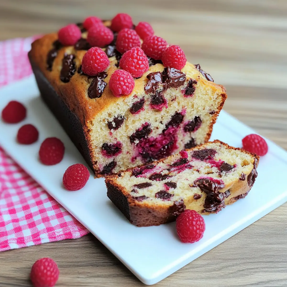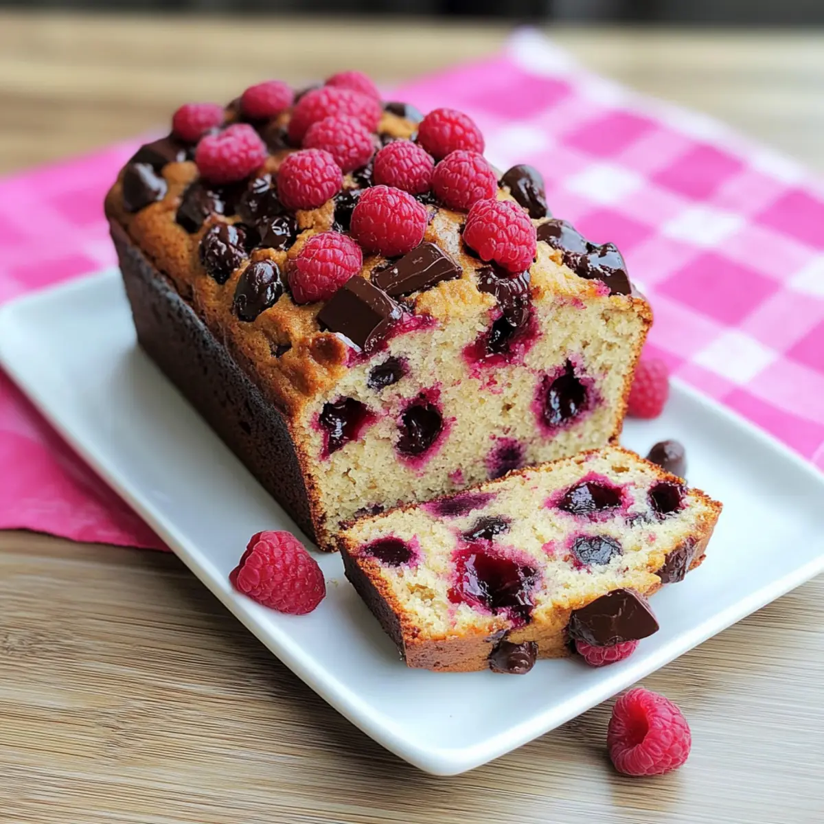 As I lifted the loaf out of the oven, a wave of warm, inviting aromas enveloped my kitchen, transporting me to a cozy bakery. This Raspberry Dark Chocolate Banana Bread is not just a treat; it’s a hug in a slice! With its soft, moist texture and the delightful combination of sweet, ripe bananas, tangy raspberries, and rich dark chocolate, it’s a recipe that sings with comfort and joy. Best of all, it’s incredibly easy to whip up and customizable to fit your dietary needs, offering dairy-free and vegan options for those who desire them. Whether you’re treating yourself to a lavish breakfast or impressing guests during coffee chats, this bread checks all the boxes. Are you ready to elevate your baking game with a twist on a classic? Why Is This Banana Bread Exceptional? Unmatched Flavor: The mix of sweet bananas, zesty raspberries, and rich dark chocolate creates a dessert-like delight that satisfies sweet cravings at any time of day. Customizable Fun: Easily tailor this recipe! Swap in your favorite berries, add nuts, or switch the yogurt for a dairy-free alternative like coconut yogurt. Perfect for Any Occasion: Whether it’s a cozy breakfast or a fancy dessert, this Raspberry Dark Chocolate Banana Bread seamlessly fits the bill, making it an instant crowd-pleaser. Quick and Easy: With simple steps and basic ingredients, you’ll have a delicious loaf on the table in no time—perfect for busy bakers! Warm Aromas: Imagine filling your kitchen with the comforting scents of baking while this loaf creates a cozy atmosphere, reminiscent of childhood memories. Don’t forget to try it with a dollop of fresh whipped cream or a side of vanilla ice cream! Raspberry Dark Chocolate Banana Bread Ingredients For the Batter • All-Purpose Flour – Provides structure; substitute with whole wheat flour for a healthier option. • Baking Soda – This leavening agent helps the bread rise; make sure it’s fresh for best results. • Salt – Enhances the overall flavor and balances sweetness. • Granulated Sugar – Adds sweetness and moisture; brown sugar can offer a richer taste. • Unsalted Butter – Contributes to moisture and richness; use coconut oil for a dairy-free alternative. • Large Eggs – Essential for structure and moisture, ideally at room temperature for easier mixing. • Mashed Ripe Bananas – Acts as a natural sweetener and moisture source; about 3 medium bananas are needed. • Plain Low Fat Yogurt – Adds moisture and tenderness; Greek or dairy-free yogurt is a great substitute. • Vanilla Extract – Enhances flavor; opt for pure extract for the best results. • Dark Chocolate Chunks – Provides rich flavor and texture; semi-sweet or milk chocolate can be swapped if desired. • Halved Raspberries – Adds a burst of tartness; toss frozen raspberries in flour to prevent sinking. Optional Toppings • Extra Dark Chocolate Chunks – Sprinkle on top before baking for added richness. • Fresh Raspberries – Scatter across the top just before the loaf goes into the oven for a beautiful presentation. Step‑by‑Step Instructions for Raspberry Dark Chocolate Banana Bread Step 1: Preheat and Prepare the Pan Begin by preheating your oven to 350°F (175°C). While your oven warms up, take a 9×5 inch loaf pan and coat it thoroughly with cooking spray. This ensures that your Raspberry Dark Chocolate Banana Bread will release easily after baking, allowing for a perfectly shaped loaf when it’s time to enjoy. Step 2: Mix Dry Ingredients In a medium-sized bowl, whisk together the all-purpose flour, baking soda, and salt until well combined. This step is essential for ensuring that your dry ingredients are evenly distributed, which helps the bread rise uniformly. Set this bowl aside while you focus on mixing the wet ingredients, allowing the flavors of your Raspberry Dark Chocolate Banana Bread to blend harmoniously. Step 3: Cream Butter and Sugar In a large mixing bowl, use an electric mixer to cream together the granulated sugar and unsalted butter until the mixture is light and fluffy, taking about 1 minute. You’ll know it’s ready when the mixture appears pale and has a smooth texture. This creates a rich base for your batter, enhancing the moistness of your Raspberry Dark Chocolate Banana Bread. Step 4: Combine Eggs and Wet Ingredients Next, add the large eggs one at a time to the creamed butter and sugar, mixing well after each addition. Once the eggs are incorporated, blend in the mashed ripe bananas, plain low-fat yogurt, and vanilla extract until everything is smoothly combined. This mixture adds moisture and flavor, creating the perfect foundation for your delightful bread. Step 5: Incorporate Dry Ingredients Gradually add the flour mixture to the wet ingredients, gently mixing until just combined. Be careful not to overmix, as this can affect the tenderness of your Raspberry Dark Chocolate Banana Bread. The batter should appear slightly lumpy, indicating it’s ready for the next exciting phase of adding those sweet mix-ins. Step 6: Fold in Chocolate and Raspberries Now it’s time to incorporate the star ingredients! Carefully fold in the dark chocolate chunks and halved raspberries, making sure they’re spread throughout the batter. Reserve a few raspberry halves for topping the loaf, if desired. This step ensures that every bite of your banana bread is bursting with flavor and texture, enhancing the overall experience. Step 7: Transfer to the Loaf Pan Spoon the luscious batter into your prepared loaf pan, using a spatula to smooth the top evenly. This not only makes for a lovely presentation but also helps the Raspberry Dark Chocolate Banana Bread bake evenly. Make sure to leave some space at the top, as the bread will rise during baking, creating a beautiful crust. Step 8: Bake the Bread Place the loaf pan in the preheated oven and bake for 50-60 minutes. Keep an eye on it, and check for doneness by inserting a toothpick in the center—if it comes ou