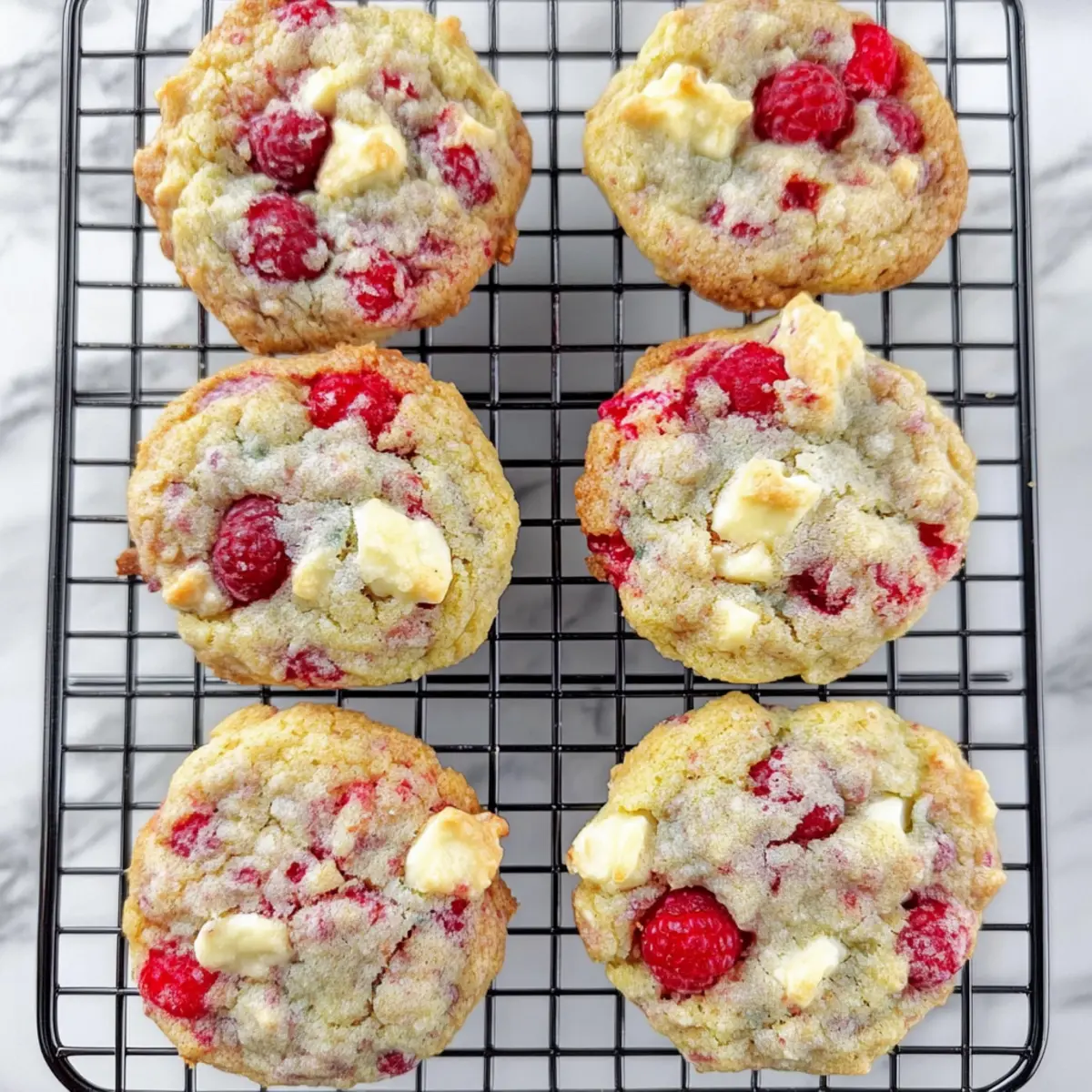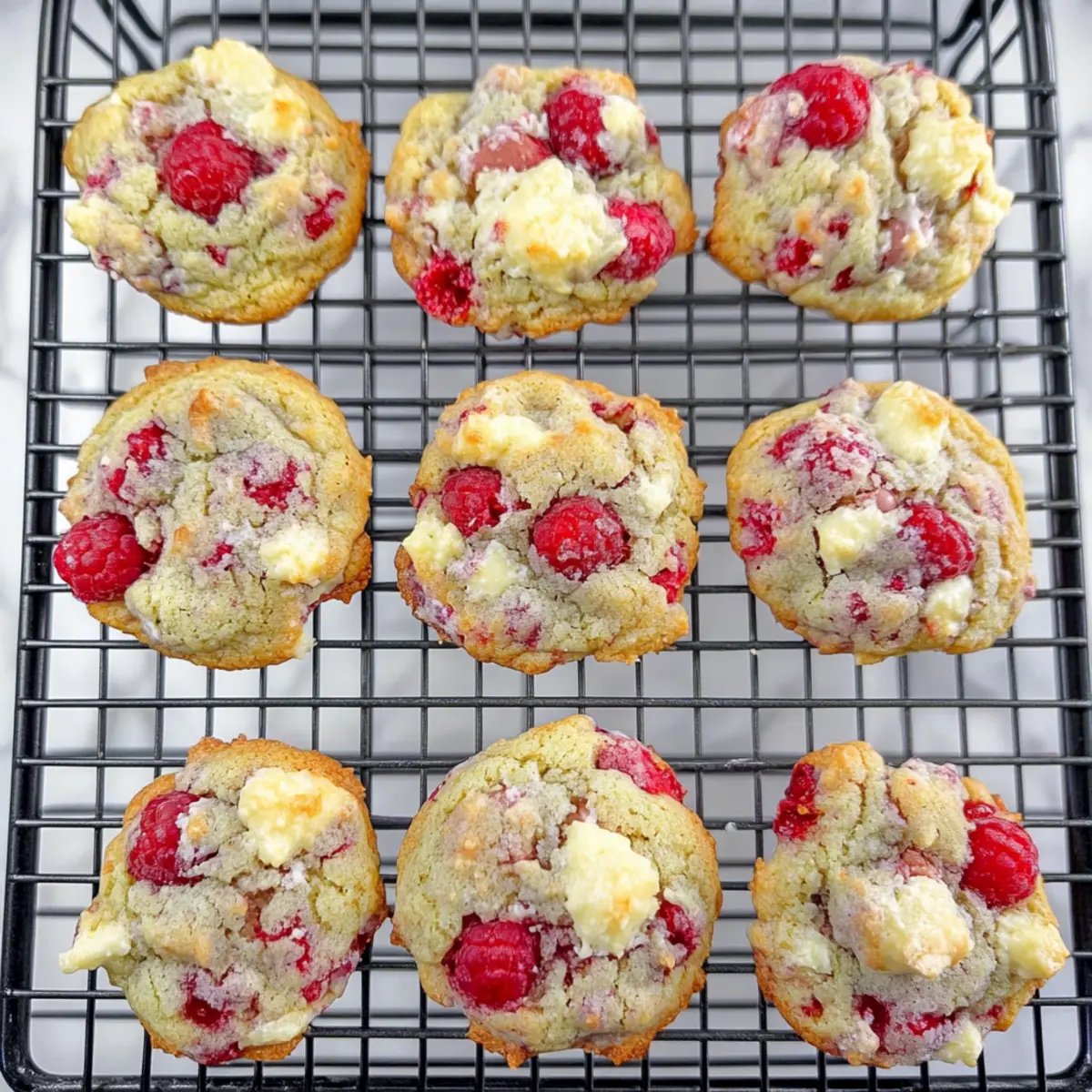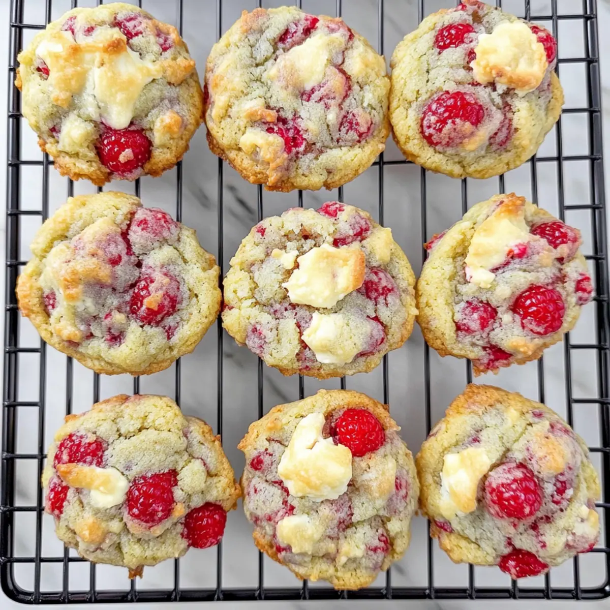As I stood in my kitchen, the sun streaming through the window, the unmistakable scent of baking cookies wafted through the air, transporting me to cherished moments of laughter and warmth. That’s when I decided to create these Raspberry White Chocolate Cookies, a delightful blend of tartness and sweetness that brings joy in every bite. Not only are they incredibly easy to whip up, but they also make the perfect companion for a cozy coffee break or an afternoon tea gathering. With the vibrant flavors of fresh raspberries complemented by creamy white chocolate, these cookies are a wonderful way to embrace the bounty of spring. Ready to indulge your senses? Let’s bake a batch together! Why are Raspberry White Chocolate Cookies special? Irresistible Flavor Combo: The tartness of fresh raspberries perfectly balances the sweetness of creamy white chocolate, creating a cookie that’s truly unforgettable. Quick and Easy: No complicated techniques here; just simple steps that even novice bakers can master, making this a go-to recipe for quick treats. Versatile Ingredients: Feel free to substitute fresh raspberries with frozen ones or experiment with different chocolates to personalize your cookies every time! Perfect for Sharing: Whether it’s a casual coffee break or a special occasion, these cookies are a wonderful way to connect with friends and family. Serve them alongside my easy Lemon Pistachio Cookies for a delightful spread! Make-Ahead Option: Preparing the dough in advance means you can bake these tasty delights fresh whenever you want, perfect for spontaneous gatherings! With all these delightful attributes, it’s no wonder these Raspberry White Chocolate Cookies are quickly becoming a favorite in my home. Raspberry White Chocolate Cookies Ingredients • Get ready to bake these delightful treats with love! For the Cookie Dough All-Purpose Flour – Provides structure to the cookies; no substitutions needed here. Baking Soda – A leavening agent for lightness; check for freshness for the best result. Baking Powder (Aluminum-Free) – Helps them rise without an off taste; opt for aluminum-free to keep flavors pure. Salt – Enhances the flavors beautifully; standard table salt works well. Unsalted Butter (room temperature) – Adds richness and moisture, essential for creaming; margarine can substitute if needed. Granulated Sugar – Sweetens and improves texture; reduce for a less sweet cookie. Light Brown Sugar – Provides moisture and a touch of depth; dark brown sugar can offer a richer flavor. Large Eggs – Binds everything together and contributes to texture; use room temperature for easier mixing. Vanilla Extract – Essential for flavor; pure vanilla is recommended for the best taste. For the Add-ins Fresh Raspberries – Delivers vibrant tartness and moisture; ensure they are dry before use. Frozen raspberries can be a great alternative if fresh are not on hand. Chopped White Chocolate – Brings creaminess and sweetness; feel free to use white chocolate chips for convenience. With these Raspberry White Chocolate Cookies ingredients, you’re all set to create a batch of cookies that are not only easy to make but also utterly delightful! Happy baking! Step‑by‑Step Instructions for Raspberry White Chocolate Cookies Step 1: Prep Baking Sheets Start by preheating your oven to 375°F (190°C). While it’s heating, grab two baking sheets and line them with parchment paper or Silpats. This will ensure that your Raspberry White Chocolate Cookies don’t stick while baking and allow for easy removal later. Step 2: Mix Dry Ingredients In a medium bowl, whisk together 2 cups of all-purpose flour, 1 teaspoon of baking soda, 1 teaspoon of baking powder, and a pinch of salt. This step is crucial as it combines the leavening agents and flour, ensuring your cookies rise beautifully and have a fabulous texture. Set this mixture aside for later. Step 3: Cream Butter and Sugars In a large mixing bowl, beat together ½ cup of room temperature unsalted butter, ½ cup of granulated sugar, and ½ cup of light brown sugar using an electric mixer. Mix on medium speed for 2–3 minutes until the mixture is light and fluffy, signaling that it’s ready to incorporate more ingredients. Step 4: Incorporate Eggs and Vanilla Add in 2 large eggs, one at a time, mixing just until combined. Then, stir in 1 teaspoon of pure vanilla extract, which will enhance the overall flavor of your Raspberry White Chocolate Cookies. Be careful not to over-mix; just blend until smooth for the best texture. Step 5: Blend Dry Ingredients Gradually add the dry ingredient mixture to the wet ingredients, mixing on low speed. Stop mixing once just combined to avoid overworking the dough. A few small lumps are perfectly fine; they will bake out beautifully, creating soft cookies packed with flavor. Step 6: Fold in Add-ins Now, gently fold in 1 cup of fresh raspberries and 1 cup of chopped white chocolate using a spatula. Aim for an even distribution of the raspberries and white chocolate throughout the dough. This step ensures every bite of your cookie bursts with delightful flavor and texture. Step 7: Chill Dough Using a cookie scoop or tablespoon, drop about 2 tablespoons of dough onto the prepared baking sheets. Space them at least 2 inches apart. Cover the sheets with plastic wrap and chill the cookie dough in the refrigerator for 30-60 minutes. This crucial step prevents spreading during baking. Step 8: Preheat Oven While the dough chills, ensure your oven is fully preheated to 375°F (190°C). This high temperature is essential for achieving the crispy edges and soft center typical of Raspberry White Chocolate Cookies. Step 9: Bake Cookies Once chilled, remove the cookie sheets from the fridge and place them in the oven. Bake for 9-11 minutes, or until the edges are lightly golden but the centers are still soft. Allow the cookies to cool on the baking sheet for a few minutes before transferring them to wire rac