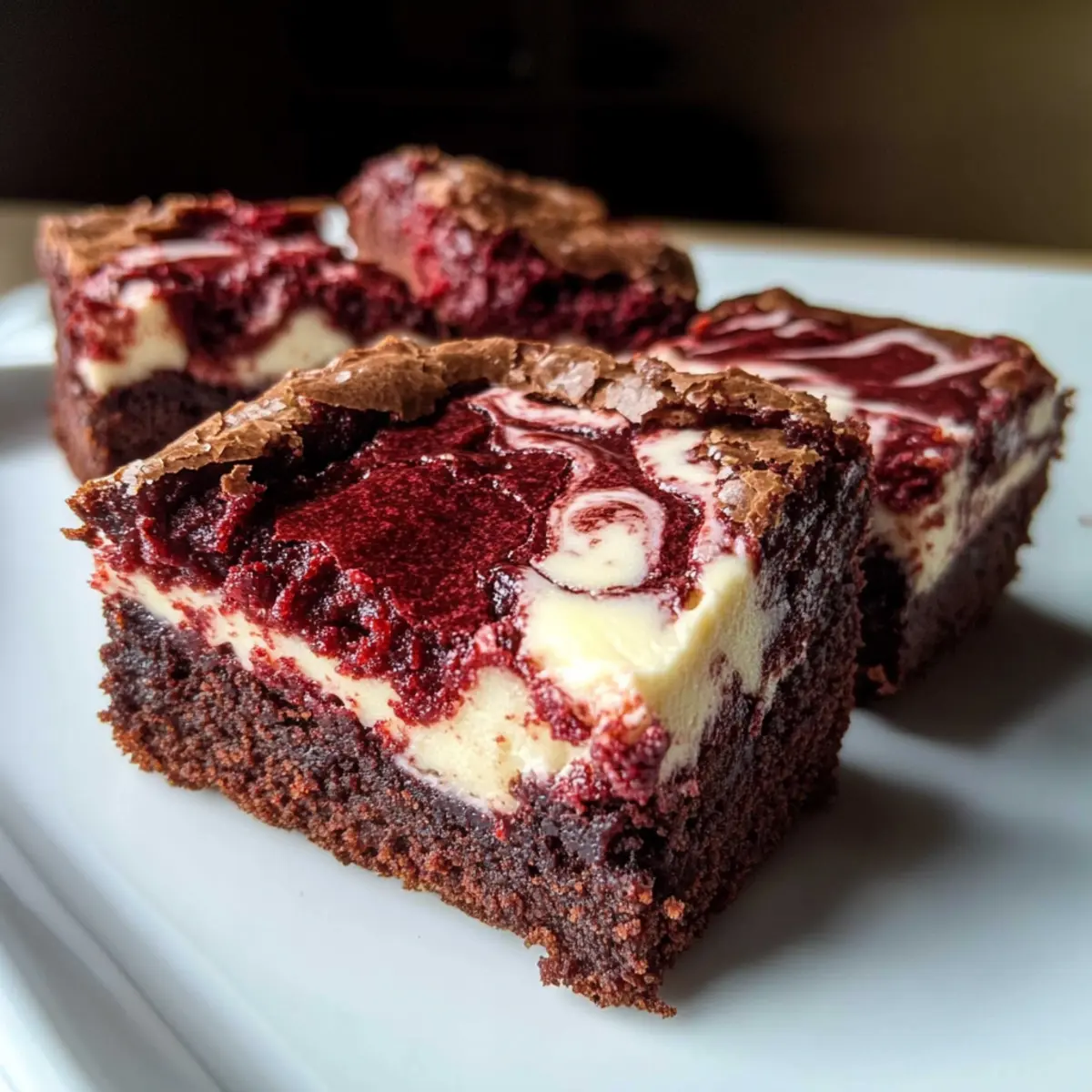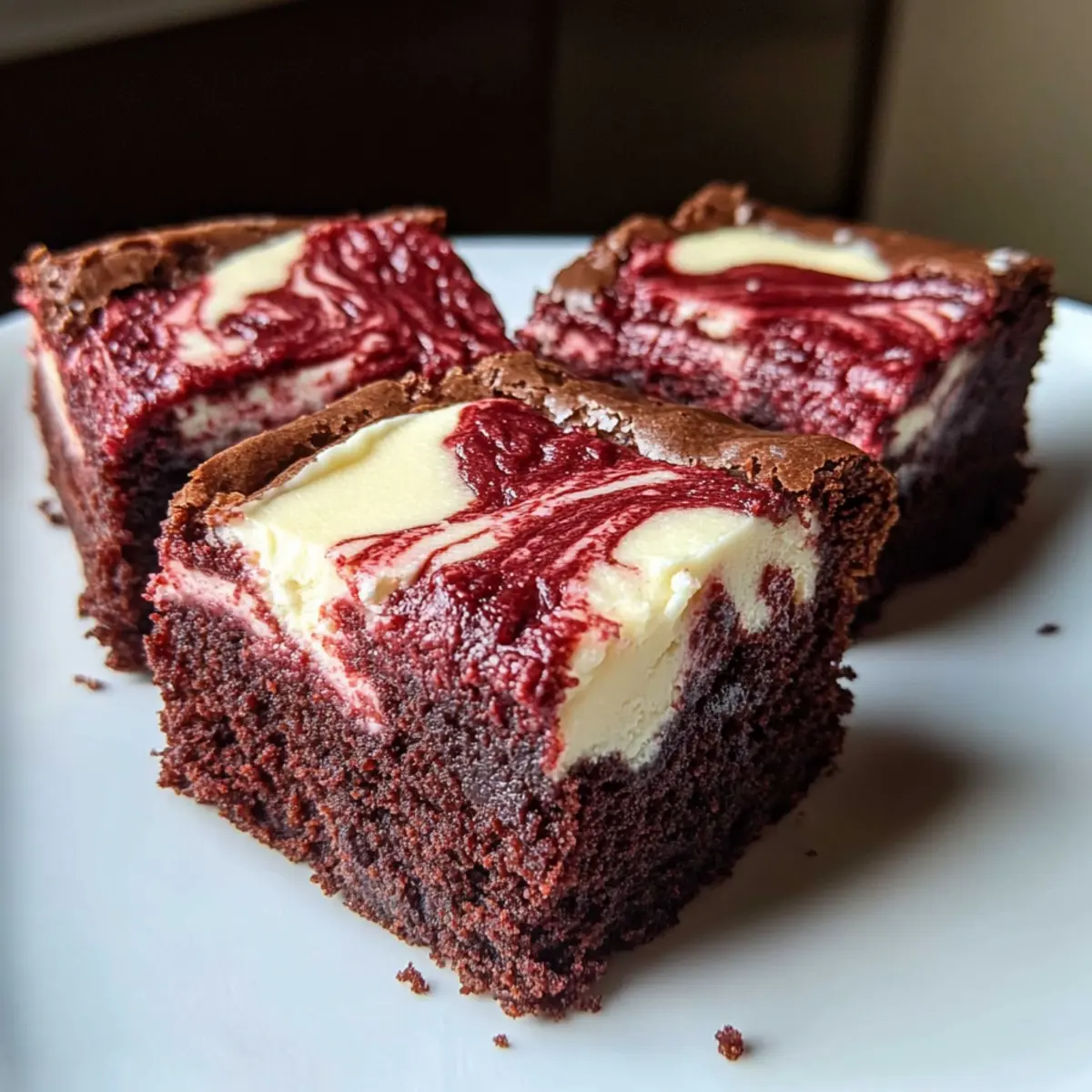 As I whisk together these ingredients, the kitchen fills with a delightful aroma that instantly transports me to a cozy bakery, where everything is rich and delectable. Today, I’m excited to share my recipe for Red Velvet Cream Cheese Brownies—a treat that combines the luxurious taste of chocolate with the tangy allure of cream cheese. What makes these brownies truly irresistible is not just their stunning deep red hue, perfect for impressing guests at any gathering, but also their quick prep time—ready in just 35 minutes! Plus, the fudgy texture offers a comforting indulgence that is both satisfying and easy to make at home. So, are you ready to dive into this delicious world of flavor and color? Let’s get baking! Why Are These Brownies So Irresistible? Decadent, fudgy base: These Red Velvet Cream Cheese Brownies are a delightful twist on a classic, blending rich cocoa flavor with a creamy, tangy swirl that leaves a lasting impression. Speedy preparation: Whip them up in just 35 minutes, making them perfect for spontaneous gatherings or a cozy night in. Show-stopping color: The vibrant, deep red hue not only dazzles the eye but also adds a touch of elegance to any dessert table. Versatile options: Whether you stick to the recipe or experiment with Goat Cheese Potato or even throw in chocolate chips, the possibilities are endless! Ideal for sharing: Cut them into small squares for potlucks or special occasions, and prepare to receive rave reviews from friends and family alike! Red Velvet Cream Cheese Brownies Ingredients For the Brownie Batter • All-Purpose Flour – Provides structure; substitute with gluten-free flour for a gluten-free option. • Cocoa Powder – Adds rich chocolate flavor; use Dutch-process cocoa for deeper color and flavor. • Salt – Enhances flavor; essential for balancing sweetness. • Unsalted Butter – Adds richness and moisture; substitute with an equal amount of vegetable oil for dairy-free brownies. • Granulated Sugar – Sweetness and moisture; can replace with coconut sugar for a lower glycemic index. • Eggs – Binds ingredients and helps with rise; use room temperature eggs for best results. • Vanilla Extract – Adds flavor depth; no substitute recommended for best taste. • Red Food Coloring – For signature color; for a natural alternative, use 2 tablespoons of beet powder (note it will produce a more muted hue). For the Cream Cheese Layer • Cream Cheese – Adds richness and tanginess; Greek yogurt is a suitable non-dairy alternative. • Sugar for Cream Cheese Mixture – Sweetens the cream cheese layer; optional to reduce for less sweetness. • Egg Yolk for Cream Cheese Mixture – Provides richness; omit for a lighter version, but it will affect texture. This ingredient list will set you on the path to creating the most delightful Red Velvet Cream Cheese Brownies that are sure to impress! Happy baking! Step‑by‑Step Instructions for Irresistible Red Velvet Cream Cheese Brownies Step 1: Preheat and Prepare Your Pan Begin by preheating your oven to 350°F (175°C). While it’s heating, take a 9×9-inch baking pan and grease it thoroughly with butter or cooking spray. For easier removal of the brownies later, line the bottom and sides with parchment paper, allowing some overhang for easy lifting. Step 2: Whisk the Dry Ingredients In a medium mixing bowl, combine 1 cup of all-purpose flour, 2 tablespoons of cocoa powder, and 1/4 teaspoon of salt. Whisk these dry ingredients together until they are well combined and free of lumps. Setting this mixture aside will ensure that your Red Velvet Cream Cheese Brownies have a uniform texture once combined with the wet ingredients. Step 3: Mix the Wet Ingredients In a large bowl, melt 1/2 cup of unsalted butter in the microwave or on the stovetop until just melted. Stir in 1 cup of granulated sugar until well blended. Next, add in 2 large eggs, one at a time, mixing gently after each addition. Then, pour in 1 teaspoon of vanilla extract and a few drops of red food coloring, blending everything into a vibrant mixture. Step 4: Combine Wet and Dry Mixtures Slowly fold the dry ingredient mixture into the wet mixture using a spatula or wooden spoon. Aim for just combined, which will keep your Red Velvet Cream Cheese Brownies fudgy and moist. You’ll want to see a few small streaks of flour remaining, which is perfectly fine as it helps prevent overmixing. Step 5: Prepare the Cream Cheese Layer In a separate medium bowl, beat 8 ounces of cream cheese until perfectly smooth. Add in 1/4 cup of sugar and 1 egg yolk, mixing until creamy and well blended. Make sure the cream cheese is at room temperature to achieve this velvety consistency, which will create a delightful contrast in your brownies. Step 6: Create the Swirls Spoon the cream cheese mixture over the brownie batter already spread in the pan. With a knife, gently swirl the cream cheese mixture into the brownie batter to create a beautiful marbled effect. Be careful not to overmix; you want to see distinct layers of rich brownie and creamy filling throughout. Step 7: Bake to Perfection Place the pan in the preheated oven and bake for 30-35 minutes. Check for doneness by looking for the edges to pull away slightly from the sides of the pan and sticking a toothpick into the center. You should see moist crumbs clinging to the toothpick—this indicates your Red Velvet Cream Cheese Brownies are perfectly fudgy! Step 8: Cool Before Serving Once baked, remove the brownies from the oven and allow them to cool in the pan set on a wire rack. It’s essential to let them cool completely before slicing—this helps achieve that beautiful presentation and perfect texture. Once cool, lift them out using the parchment paper and cut them into squares to serve. Storage Tips for Red Velvet Cream Cheese Brownies Room Temperature: Store cooled brownies in an airtight container at room temperature for up to 2 days. This keeps them soft and ready for an
