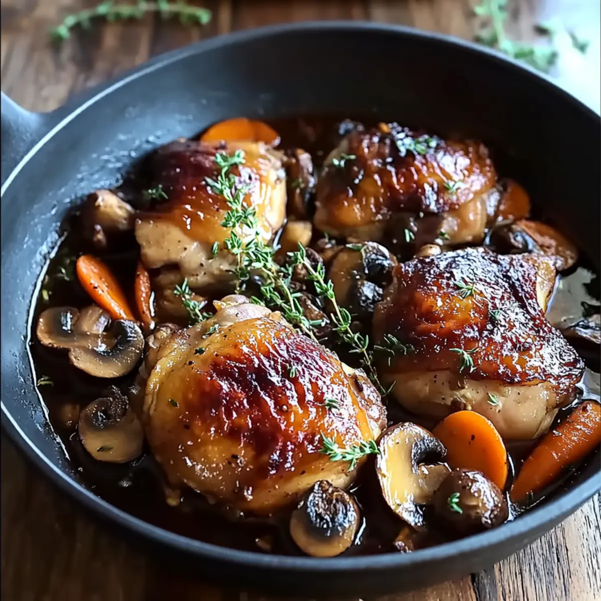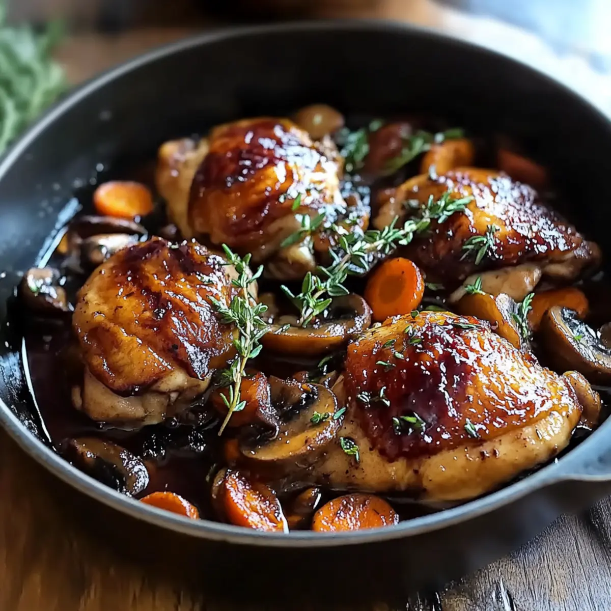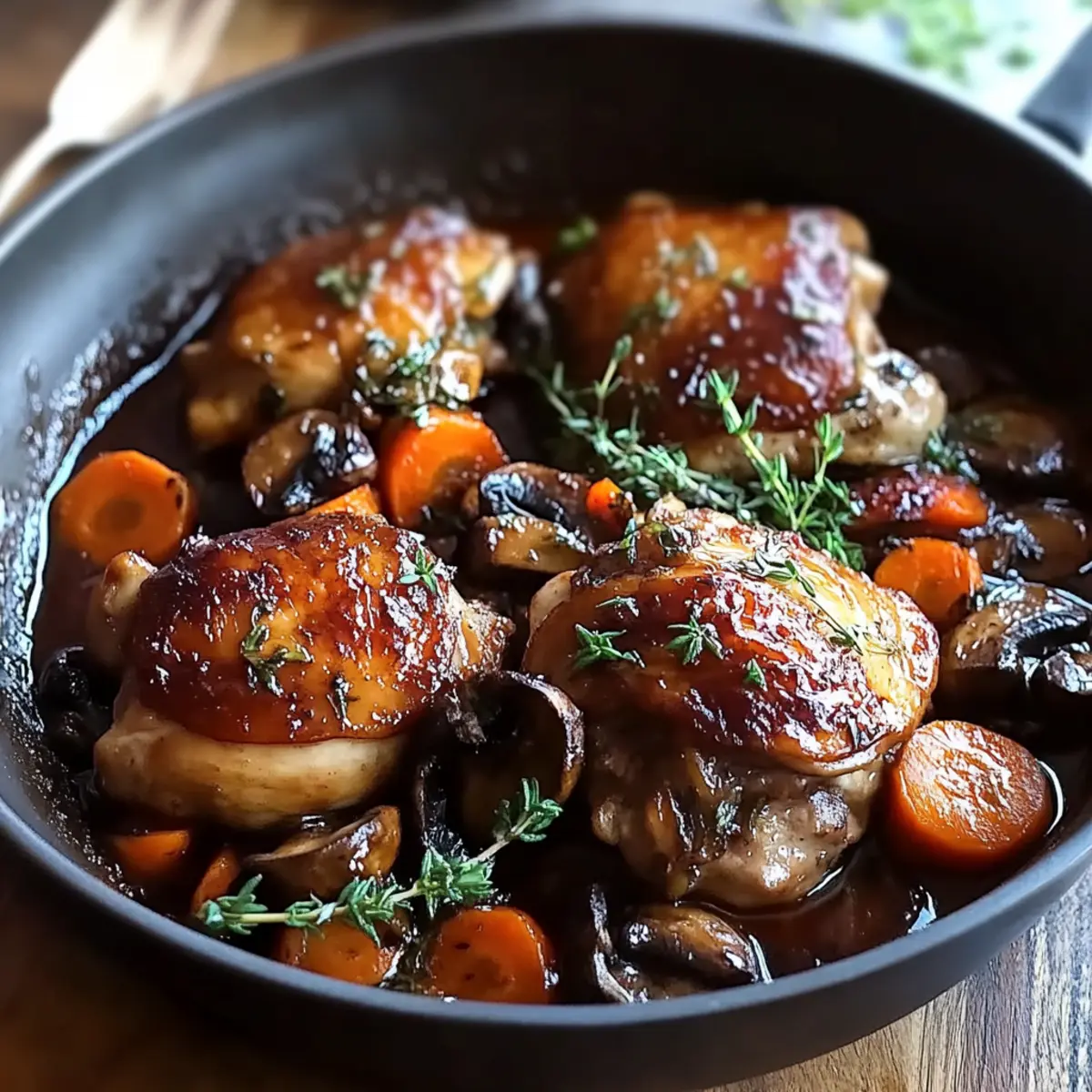 A flavorful dish of tender chicken thighs braised in a rich red wine sauce, perfect for weeknight dinners or gatherings.