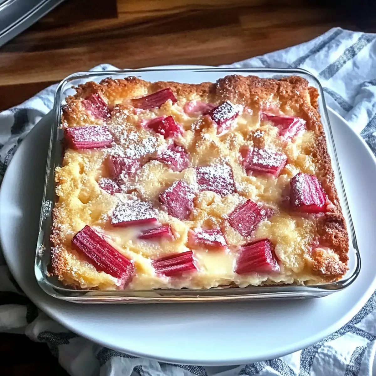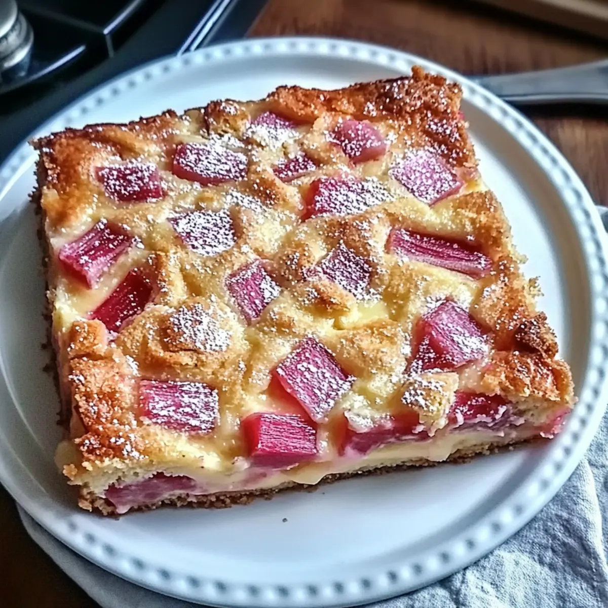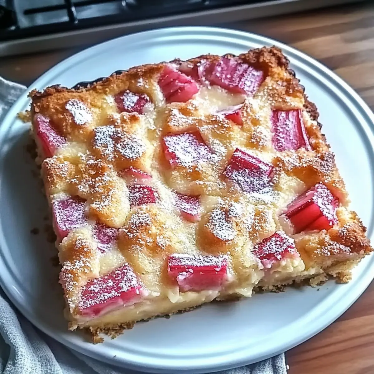 As the first hints of spring blossom, I can’t help but recall my grandmother’s cheerful kitchen, filled with the tart scent of fresh rhubarb. This Classic Rhubarb Custard Kuchen embodies those heartwarming memories, blending flavors and textures that remind us of simpler times. With its buttery crust cradling a rich, creamy custard punctuated by vibrant rhubarb, this dessert is not just a treat, but a delightful companion for family gatherings, springtime picnics, or leisurely brunches. Plus, it’s wonderfully approachable—ready on your table in no time and perfect for any occasion! Are you ready to dive into this nostalgic slice of spring? Why is Rhubarb Custard Kuchen So Special? Uniqueness: This Rhubarb Custard Kuchen brings a charming balance of tartness and creaminess that’s hard to resist. Ease of Preparation: You can whip this up effortlessly, making it suitable for bakers of all levels. Springtime Flavors: Celebrate the season with bright, fresh rhubarb that captures the essence of spring. Versatile Variations: Feel free to explore delightful adaptations like a Mixed Berry Rhubarb Kuchen or an Almond Rhubarb Kuchen for extra flair! Perfect for Sharing: This dessert is sure to impress at gatherings, making it a crowd-pleaser that’s bound to have everyone asking for seconds. Get ready to enjoy a timeless recipe that’s both nostalgic and delicious! Rhubarb Custard Kuchen Ingredients For the Crust All-purpose flour – Provides structure to the crust. Can be substituted with gluten-free flour blend. Sugar – Adds sweetness to both the crust and custard. For a lower-calorie alternative, consider using a sugar substitute. Salt – Enhances flavor balance. Essential for taste; do not omit. Cold butter, cubed – Creates a flaky, tender crust. Use unsalted butter for better control over sweetness. Large egg yolk – Binds the dough together. Substitution with a flaxseed egg may work for a vegan option. Milk – Adds moisture to the dough. Use any non-dairy milk for lactose intolerance. For the Custard Filling Fresh rhubarb, diced – Main ingredient, provides tartness and vibrant color. Fresh is best; frozen can be used but adjust pre-baking hydration. Sugar (for custard filling) – Sweetens the custard. May vary based on rhubarb tartness; taste before adding. All-purpose flour (for custard) – Thickens the custard. Essential for texture; substitutions may alter consistency. Ground nutmeg – Adds warm spice notes. Cinnamon can be used as an alternative. Large eggs – Provides richness and sets the custard. Flaxseed meal may substitute for vegan options, though texture will differ. Heavy cream – Adds indulgence and creaminess. Can substitute with full-fat coconut milk for a dairy-free version. Step‑by‑Step Instructions for Rhubarb Custard Kuchen Step 1: Preheat the Oven Begin by preheating your oven to 400°F (200°C). While the oven heats up, prepare a 9-inch square baking pan by greasing it well with butter or non-stick spray. This step ensures that your Rhubarb Custard Kuchen will bake evenly and won’t stick when it’s time to serve. Step 2: Prepare the Crust In a large mixing bowl, combine all-purpose flour, sugar, and salt. Use a pastry cutter or your fingers to cut in the cold, cubed butter until the mixture resembles coarse crumbs. This process should take about 5 minutes. The texture is key for a flaky crust, so be gentle to ensure the butter remains cold. Step 3: Form the Dough In a separate bowl, whisk together the egg yolk and milk. Gradually stir this mixture into the flour-butter combination until a soft dough forms. Once you achieve the right consistency, press the dough into the prepared pan, ensuring the edges are slightly raised. This forms the shell for your rich custard filling and should take about 5-10 minutes. Step 4: Layer the Rhubarb Evenly scatter the diced rhubarb over the prepared crust. Make sure to distribute the rhubarb pieces well, as they will provide a delightful tartness and vibrant color to your Rhubarb Custard Kuchen. Aim for a colorful, even layer to enhance both flavor and presentation. Step 5: Prepare the Custard In another mixing bowl, whisk together sugar, all-purpose flour, and ground nutmeg until well combined. Now, beat in the eggs and heavy cream until the mixture is smooth and creamy—this should only take a few minutes. The custard filling will be thick but pourable, and it’s essential for enrobing the rhubarb. Step 6: Bake the Kuchen Pour the prepared custard mixture evenly over the rhubarb. Place the baking pan into the preheated oven and bake for 40-45 minutes. You’ll know it’s done when the custard is set and a knife inserted in the center comes out clean. The edges should be golden, and the center will have a slight jiggle when removed from the oven. Step 7: Cool and Serve Once baked, remove your Rhubarb Custard Kuchen from the oven and let it cool completely in the pan. This cooling step is crucial for allowing the custard to set properly, making it easier to slice later. After cooling, feel free to refrigerate any leftovers for a refreshing treat the next day! Storage Tips for Rhubarb Custard Kuchen Room Temperature: Allow the Rhubarb Custard Kuchen to cool completely before leaving it at room temperature for up to 2 hours. This keeps it fresh for immediate enjoyment. Fridge: Store any leftovers in an airtight container in the refrigerator for up to 3 days. This helps maintain the creamy custard texture and prevents drying out. Freezer: If you want to keep the kuchen longer, wrap individual slices tightly in plastic wrap, then place them in a freezer bag. It can be frozen for up to 2 months; just thaw in the fridge overnight before serving. Reheating: For a warm treat, reheat slices in the oven at 350°F (175°C) for about 10-15 minutes, or enjoy chilled for a refreshing dessert! What to Serve with Rhubarb Custard Kuchen Enhance your delightful dessert experience with perfect accompaniments that comple