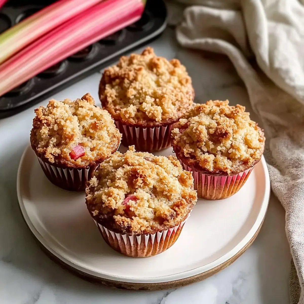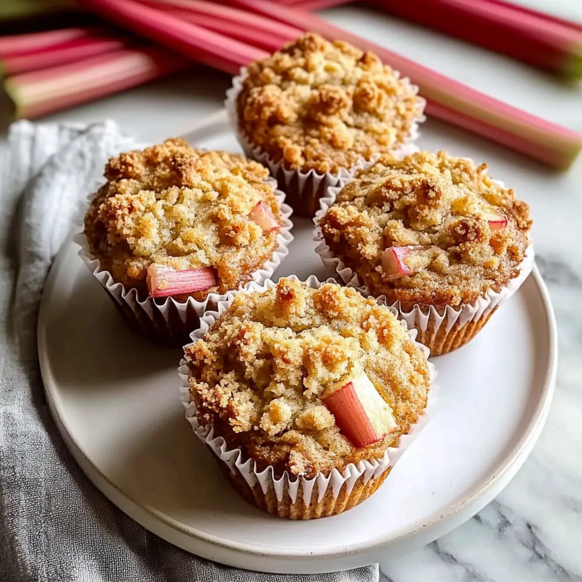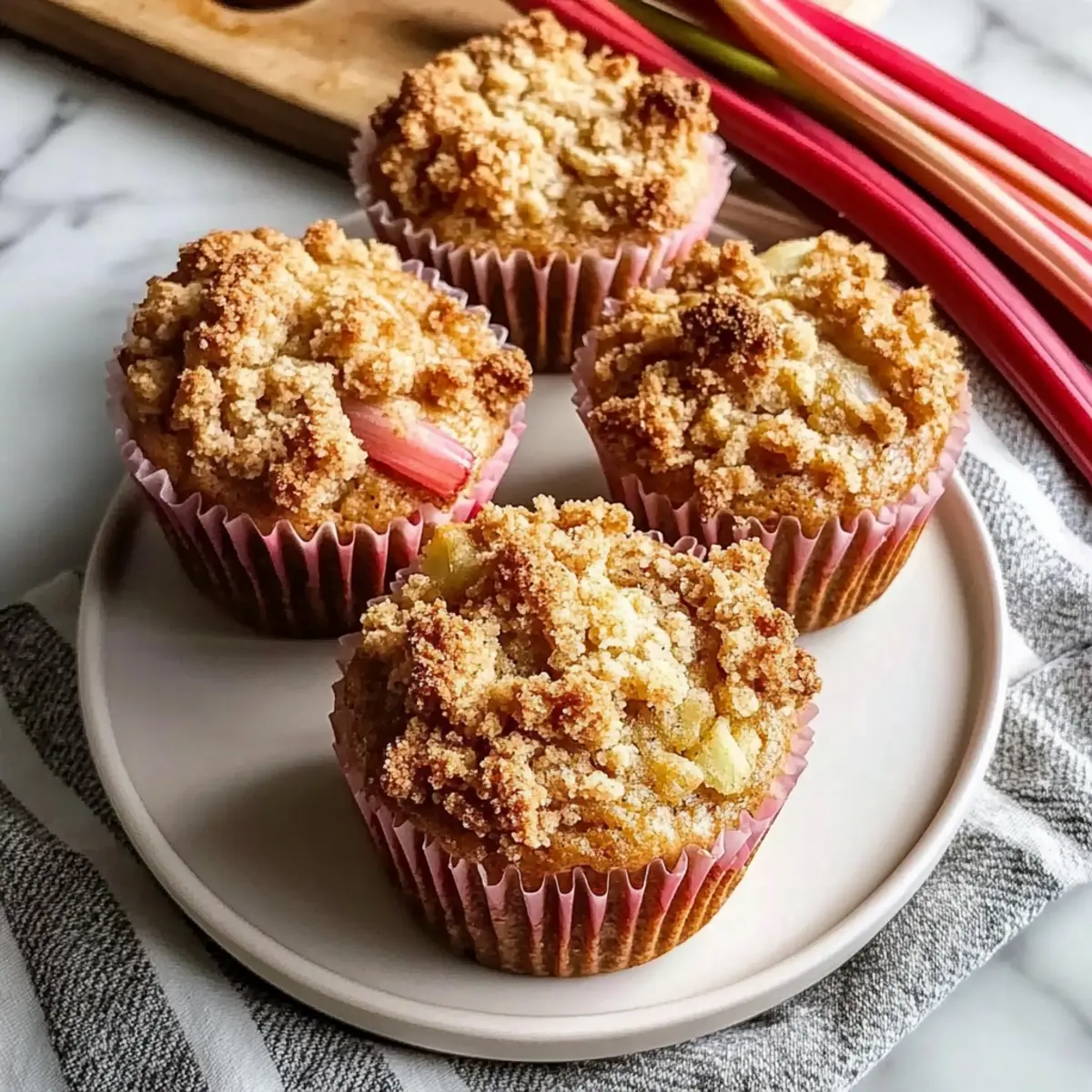 As I stood in my kitchen surrounded by the vibrant greens and pinks of fresh rhubarb, a spark of inspiration hit me. These Classic Rhubarb Oat Muffins with Cinnamon Butter Crumble are not just another baked good; they encapsulate the essence of spring, with each bite offering a delightful tang that dances alongside a crunchy topping. Perfect for busy mornings, this recipe is a make-ahead dream that allows you to enjoy sweet, wholesome muffins throughout the week. Imagine the joy of sharing these tender delights with loved ones, paired perfectly with a warm cup of coffee or tea! Plus, they are wonderfully adaptable; feel free to mix in your favorite nuts or substitute rhubarb with seasonal berries. Are you ready to embark on this delicious journey? Let’s get baking! Why are these muffins a must-try? Spring Flavor Explosion: The vibrant tartness of fresh rhubarb elevates these muffins to new heights, making them a delightful treat for any brunch. Crunchy Topping: A crispy cinnamon butter crumble not only adds texture but also enhances the flavor profile, creating a perfect match with the moist interior. Easily Make-Ahead: Prepare a batch at the beginning of the week, and enjoy fresh muffins each day – they’re ideal for busy mornings! Versatile Ingredients: Feel free to swap rhubarb for seasonal favorites like strawberries or toss in a handful of nuts for an extra crunch. Crowd-Pleaser: Whether for breakfast or a sweet snack, these muffins are sure to bring smiles and satisfaction, just like my popular Garlic Butter Pasta or Cinnamon Sugar Cruffins. Rhubarb Oat Muffins Ingredients For the Crumble • Unsalted Butter – Adds richness to the crumble; ensure it’s cold for optimal texture. • Flour (Crumble) – Provides structure to the crumble topping; no substitutions needed. • Oats – Contributes chewiness and nuttiness; quick oats can be used as a substitute if necessary. • Brown Sugar (Crumble) – Adds sweetness and depth; can replace with coconut sugar for a different flavor. • Cinnamon – Enhances flavor in both the muffins and crumble; use nutmeg as an alternative for variety. • Turbinado Sugar – Gives a crunchy texture to the topping; can substitute with regular sugar. For the Muffins • All-Purpose Flour (Muffins) – Main structure provider for muffins; whole wheat flour can be swapped in for a healthier option. • Brown Sugar (Muffins) – Sweetens and adds moisture; white granulated sugar can be used as a substitute. • Oats (Muffins) – Adds texture and fiber; use quick oats as a substitution if preferred. • Baking Soda – Leavening agent for muffins; sodium bicarbonate can be used as an alternative. • Salt – Balances sweetness; no substitutions necessary, though sea salt can enhance flavor. • Cinnamon (Muffins) – Amplifies the flavor profile; other warming spices like allspice can be used instead. • Milk – Provides moisture; use almond or soy milk for a dairy-free version. • Vinegar – Works with milk to create a buttermilk substitute, improving muffin texture; lemon juice can be used similarly. • Vanilla Extract – Adds flavor depth; optional but recommended; almond extract can be used for a different flavor. • Vegetable Oil – Keeps muffins moist; can be replaced with melted coconut oil if desired. • Egg – Binds ingredients; can be omitted for a vegan substitute like flax egg. • Rhubarb (Sliced) – Key ingredient providing tartness; frozen rhubarb can be used without thawing, making these Rhubarb Oat Muffins a convenient choice! Step‑by‑Step Instructions for Classic Rhubarb Oat Muffins with Cinnamon Butter Crumble Step 1: Preheat and Prepare Begin by preheating your oven to 350°F (175°C). While the oven warms up, take a moment to grease a 12-cup muffin pan to ensure your Classic Rhubarb Oat Muffins come out easily after baking. This crucial first step sets the stage for perfectly baked muffins! Step 2: Make the Crumble In a medium bowl, combine flour, oats, brown sugar, cinnamon, and turbinado sugar to create the crumble mixture for your muffins. Then, using a pastry cutter or your fingers, cut in cold unsalted butter until the mixture resembles coarse crumbs. Set this aside; your crumble will add delightful texture to the muffins. Step 3: Combine Dry Ingredients In a large mixing bowl, whisk together all-purpose flour, brown sugar, oats, baking soda, salt, and cinnamon. Make sure there are no lumps in this dry mixture, as it will be the base for your Classic Rhubarb Oat Muffins. This blend will provide structure and flavor to your muffins. Step 4: Mix Wet Ingredients In a separate bowl, mix together milk, vinegar, vanilla extract, vegetable oil, and your egg until well combined. This step creates a creamy, flavorful wet mixture that enhances the moisture of your muffins. The combination effectively ensures your batter turns out perfectly rich and tender. Step 5: Combine Wet and Dry Mixtures Pour the wet ingredients into the dry mixture, folding gently until just combined. Be careful not to overmix; you want to maintain the lovely texture of your muffins. This is where the magic happens, as we prepare to bring together all the elements of your Classic Rhubarb Oat Muffins. Step 6: Fold in the Rhubarb Gently fold in your sliced rhubarb, making sure to disperse the pieces evenly without breaking them. The tartness of the rhubarb is the star of the show, and you want to ensure that each muffin gets its fair share of this delicious fruit. Step 7: Fill the Muffin Cups Scoop the batter into the greased muffin cups, filling each about 2/3 full to allow for rising. Afterward, generously top each muffin with the crumble mixture and place a small piece of fresh rhubarb on top for visual appeal and added tartness. Step 8: Bake to Perfection Bake in your preheated oven for 20-25 minutes, or until the muffins are golden brown and a toothpick inserted into the center comes out clean. Keep an eye on them as they bake, and enjoy t