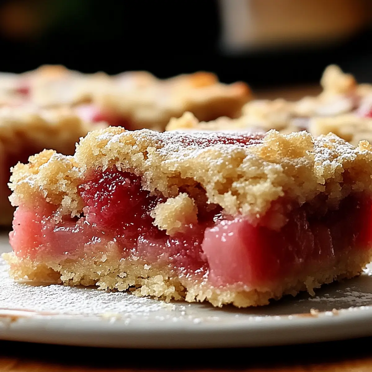 • Chocolate Drizzle: Top cooled bars with a drizzle of melted dark chocolate for an indulgent finish. The richness of chocolate pairs heavenly with the tart rhubarb!