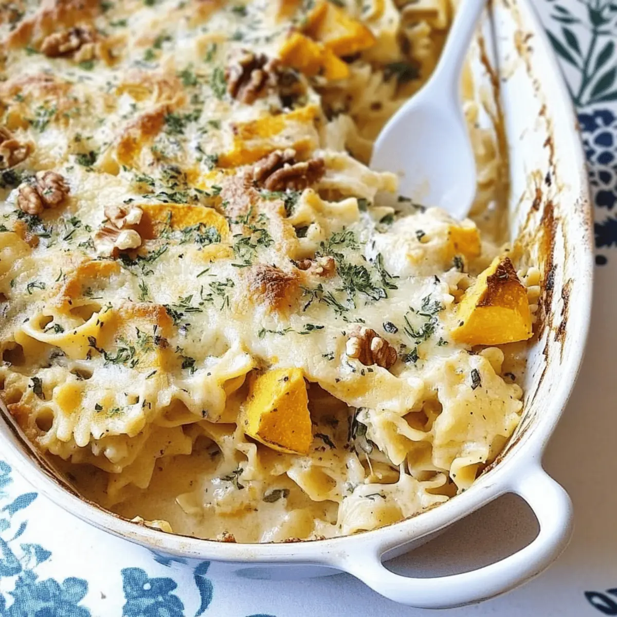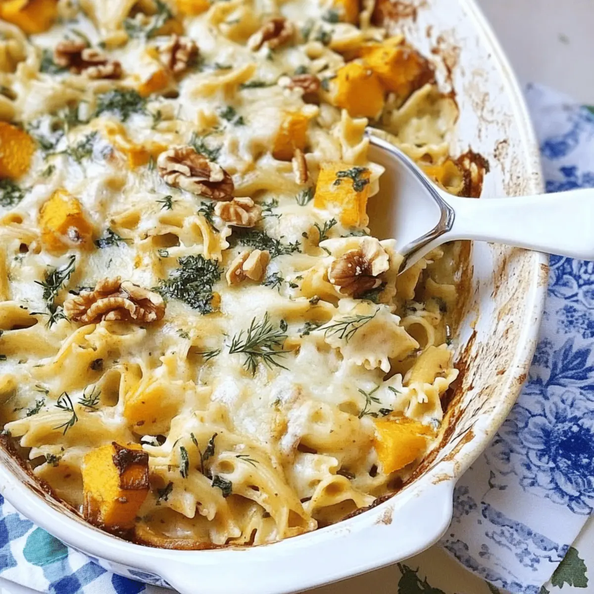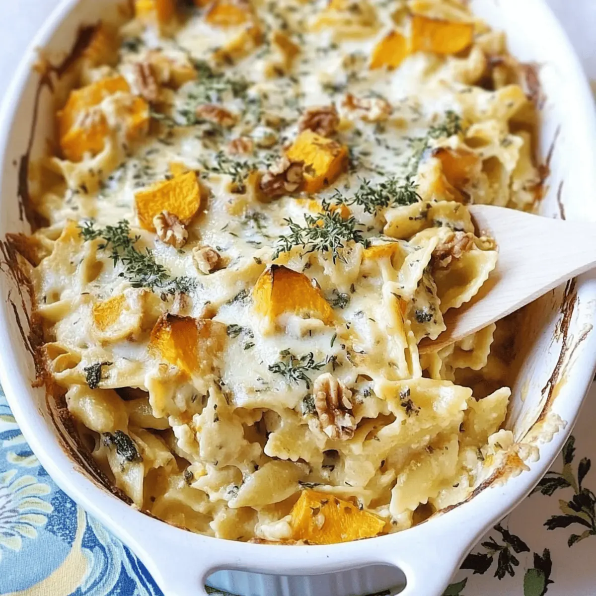 As the leaves turn and a cool breeze fills the air, my kitchen transforms into a haven of cozy aromas, with the enchanting scent of roasting pumpkin wafting through. This Creamy Roast Pumpkin, Herb & Walnut Pasta Bake is my go-to comfort dish, effortlessly bringing together the earthy flavors of roasted vegetables and the crunch of toasted walnuts for a satisfying meal. Not only is it a vegetarian delight, but it’s also a simple, one-pan wonder that comes together in no time, perfect for those busy weeknights or chill family gatherings. Trust me, every bite is a hug in a dish! Are you ready to embrace the warmth of this seasonal favorite? Why is this pasta bake irresistible? Creamy Comfort: This dish delivers a luxurious, velvety texture, enveloping each bite in warmth and indulgence. Nutty Crunch: The addition of walnuts creates a satisfying crunch that contrasts beautifully with the soft roasted pumpkin. Quick & Easy: Perfect for busy weeknights, this one-pan wonder can be whipped up in no time without sacrificing flavor. Flavor Variations: Feel free to swap out ingredients according to your pantry or taste—try substituting with sweet potatoes or adding kale for some extra greens! Crowd-Pleaser: Whether you’re hosting a gathering or enjoying a family dinner, this dish is sure to impress everyone at the table. It’s as delightful paired with a fresh salad or garlic bread as it is on its own! Roast Pumpkin, Herb & Walnut Pasta Ingredients For the Pasta Bake Kent or Butternut Pumpkin – Adds sweetness and creaminess; substitute with sweet potatoes for a different flavor. Onion – Provides aromatic base flavor and sweetness; can be swapped with shallots for a milder taste. Garlic – Imparts depth and aroma; use roasted garlic for a sweeter note or leave out for a milder flavor. Fresh Rosemary – Offers fragrant, earthy notes; thyme can be used as a substitute. Grapeseed Oil – Essential for roasting vegetables; any neutral oil like canola or vegetable oil works well. Bow Tie Pasta (or short pasta) – Acts as the base carb component; use gluten-free pasta for a gluten-free option. Sea Salt and Black Pepper – Essential for seasoning the dish; adjust to taste. Walnuts – Adds crunch and nuttiness; pecans or hazelnuts could be used as a substitute. Chives – Provides a mild onion flavor; can be replaced with green onions or omitted if desired. Fresh Basil – Offers a fragrant herbal lift; dried basil can be used, but fresh is preferable. Cheddar Cheese – Creates creaminess and flavor; use mozzarella for a milder taste. Light Cooking Cream – Ensures a rich, creamy texture; substitute with non-dairy cream for a dairy-free version. Parmesan Cheese – Adds savory depth; nutritional yeast can be a vegan alternative for the cheesy flavor. Extra Virgin Olive Oil – Drizzled for added richness; any other quality oil can be used in its place. With these delightful ingredients for your Roast Pumpkin, Herb & Walnut Pasta, you’re on your way to creating a heartwarming meal that embodies comfort food! Step‑by‑Step Instructions for Creamy Roast Pumpkin, Herb & Walnut Pasta Bake Step 1: Preheat and Prepare the Baking Tray Begin by preheating your oven to 200°C (392°F). While the oven warms, take a large baking tray and line it with baking paper to prevent sticking. This will be where your pumpkin, onion, and garlic will roast beautifully, creating the fragrant base for your creamy roast pumpkin, herb & walnut pasta bake. Step 2: Roast the Vegetables In a mixing bowl, toss together the diced pumpkin, sliced onion, and whole garlic cloves with fresh rosemary, grapeseed oil, sea salt, and black pepper. Spread this mixture evenly on the prepared baking tray. Roast in the oven for 30-40 minutes, turning halfway through, until the pumpkin is golden and tender, and the garlic is soft enough to squeeze out of its skin. Step 3: Lower the Oven Temperature Once your vegetables are beautifully roasted, lower the oven temperature to 180°C (356°F) to prepare for baking the pasta dish. This step is crucial to ensure an even, gentle heat when you assemble and bake your creamy roast pumpkin, herb & walnut pasta, allowing all the flavors to meld perfectly. Step 4: Cook the Pasta Bring a large pot of salted water to a boil and add your bow tie pasta. Cook according to package recommendations, around 11 minutes, until al dente. Remember to reserve a cup of the pasta water before draining the pasta in a colander—it’s the key to achieving that creamy consistency in your sauce. Step 5: Combine Roasted Ingredients Carefully squeeze the roasted garlic from its skins and mix it with the roasted pumpkin and onion in a large mixing bowl. This blend brings all the fantastic flavors together, creating a luscious base for your creamy roast pumpkin, herb & walnut pasta bake. Step 6: Mix Pasta with Ingredients In a large baking dish, combine the drained pasta, roasted vegetable mixture, chopped walnuts, fresh herbs, cheddar cheese, and cooking cream. Add a splash of the reserved pasta water to loosen the mixture. Gently fold everything together, ensuring the pasta is well-coated and the flavors are evenly distributed, while seasoning with additional salt and pepper to taste. Step 7: Prepare for Baking Sprinkle a generous layer of parmesan cheese over the top of your pasta bake and drizzle with extra virgin olive oil for added richness. This final touch will create a beautiful golden crust while baking, ensuring your creamy roast pumpkin, herb & walnut pasta is not only delicious but visually appealing too. Step 8: Bake and Garnish Place the baking dish in the oven and bake for 25 minutes, or until the pasta bake is bubbling and heated through. Once ready, remove it from the oven and let it cool slightly. Finish with a sprinkle of freshly chopped chives on top before serving, enhancing the vibrant color and flavor of this delightful dish. Expert Tips for Creamy Pasta Bake Don’t Overcrowd: Ensure the pu