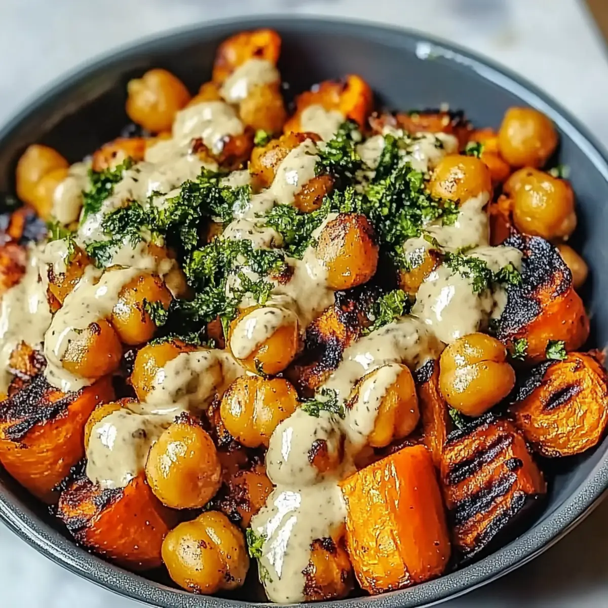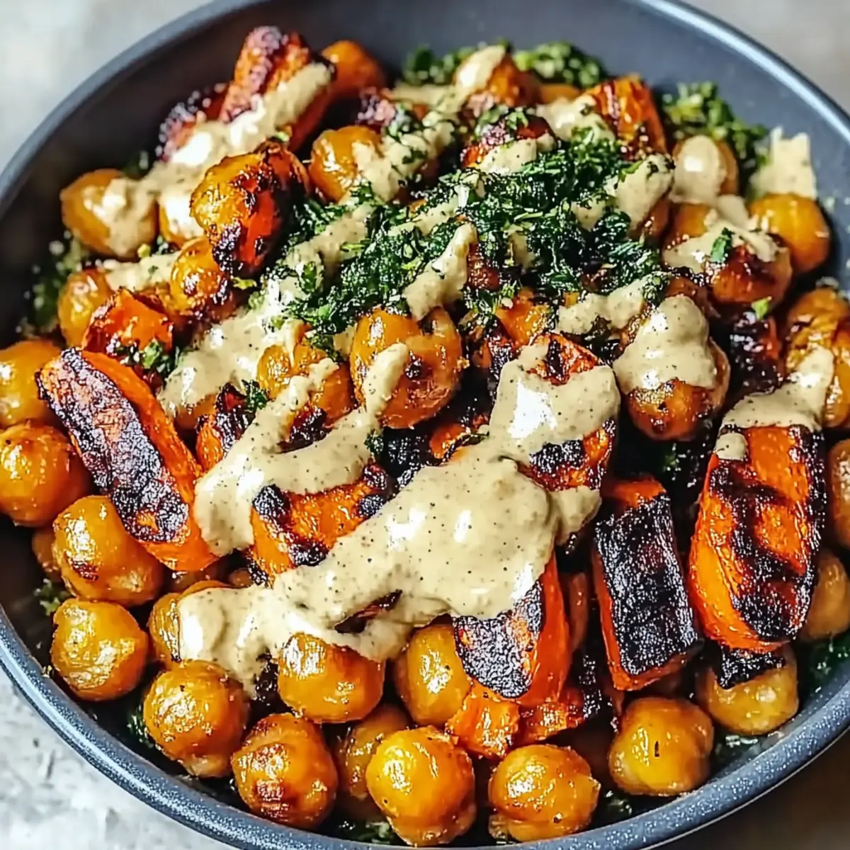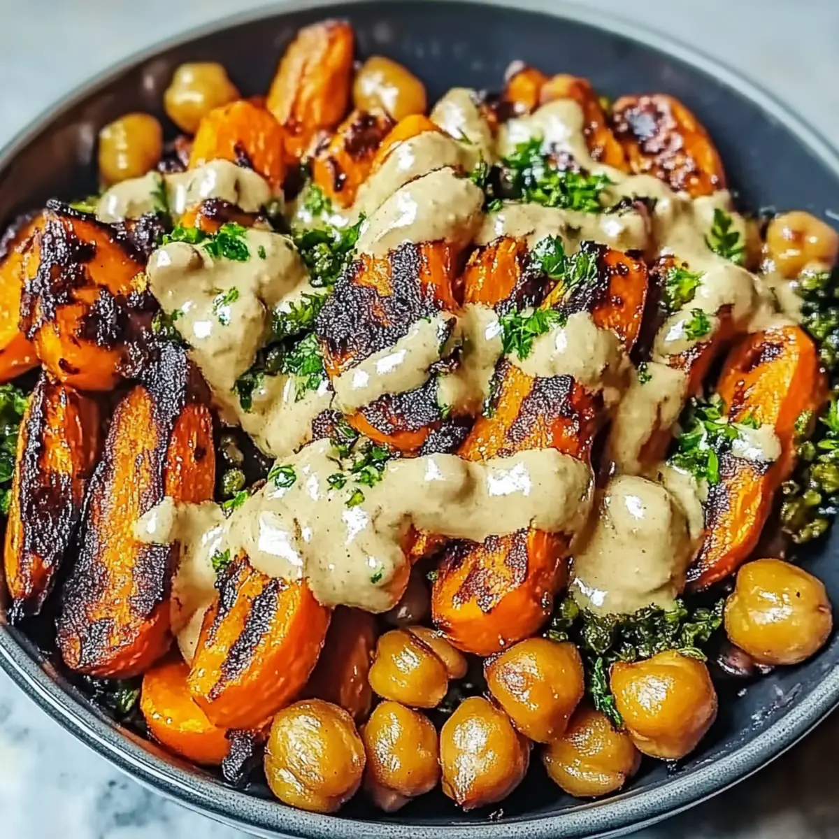 As I stood in my kitchen, I couldn’t help but breathe in the irresistible aroma of roasting vegetables that filled the air, a reminder of why I love cooking. Today, I’m excited to share my One-Pan Roasted Carrot and Chickpea Bowl, a vibrant dish that captures the essence of simple, wholesome meals. This recipe is not only vegan and gluten-free, but it also comes together with minimal effort—just toss everything on a baking sheet and let the oven do the magic. You’ll enjoy tender, caramelized carrots and crispy chickpeas that offer both nourishment and satisfying textures. Whether you’re looking for a quick weeknight dinner or a make-ahead lunch option, this bowl ticks all the boxes for flavor and convenience. Are you ready to bring your cooking game to the next level with this delicious recipe? Why is this dish a must-try? Simplicity in Preparation: Just toss all ingredients on a baking sheet and let the oven work its magic, making mealtime a breeze. Vibrant Flavors: The combination of sweet, roasted carrots and crispy chickpeas shines with a nutty tahini dressing that elevates the taste. Nutritionally Rich: Packed with vitamins and plant-based protein, this dish ensures you feel good about what you’re eating. Versatile Variations: Easily swap in different veggies or add grains like quinoa for a heartier meal that suits your cravings. Meal Prep Friendly: Prepare ahead and store in the fridge for easy grab-and-go lunches throughout the week. Pair with a fresh side salad or crusty bread for a complete meal! Crowd Pleaser: Whether serving family or entertaining friends, the colorful presentation and delicious flavors make this a standout dish. Don’t forget to check out my Smashed Carrots Bites for a fun side! Roasted Carrot and Chickpea Bowl Ingredients • To make your cooking experience a breeze, here’s what you’ll need! For the Bowl Carrots – Provide natural sweetness and texture; substitute with sweet potatoes for a different twist. Chickpeas – Add protein and texture, becoming crispy when roasted; dried chickpeas can be used but require soaking first. Olive Oil – Essential for roasting to ensure crispness; can be swapped with avocado oil if preferred. Spices (Cumin, Paprika, Salt, and Pepper) – Elevate the flavor profile; feel free to adjust according to your taste for the Roasted Carrot and Chickpea Bowl. For the Dressing Tahini – Creates a creamy dressing with a nutty flavor; almond butter can be used as a substitute for a unique taste. Maple Syrup – Adds a hint of sweetness to the dressing; honey is a great alternative if you’re not strictly vegan. Lemon Juice – Brightens the flavors and balances the dish; lime juice offers a zesty twist as a substitute. Step‑by‑Step Instructions for Roasted Carrot and Chickpea Bowl Step 1: Preheat the Oven Begin by preheating your oven to 425°F (220°C). This high temperature is essential for achieving beautifully caramelized carrots and crispy chickpeas. Let your oven fully heat up, which usually takes around 10-15 minutes, ensuring that the roasting process brings out maximum flavor in your One-Pan Roasted Carrot and Chickpea Bowl. Step 2: Prepare the Ingredients While the oven is heating, grab your carrots and chickpeas. Peel and slice the carrots into even sticks to promote uniform cooking. Drain and rinse the chickpeas, then pat them dry with a kitchen towel—this will help them get crispy when roasted. Having all ingredients ready makes it easier to assemble everything in the next step. Step 3: Season the Veggies In a large mixing bowl, combine the sliced carrots and dried chickpeas. Drizzle with olive oil, then sprinkle cumin, paprika, salt, and pepper over the top. Toss everything together using your hands or a spatula until each piece is evenly coated in oil and spices. This seasoning mix will enhance the flavors of your Roasted Carrot and Chickpea Bowl. Step 4: Roast the Mixture Spread the seasoned carrots and chickpeas on a large baking sheet in a single layer. This is crucial to ensure even roasting, allowing the veggies to caramelize rather than steam. Place the sheet in the oven and roast for 25-30 minutes, checking halfway through and giving them a good stir to promote even browning. They should come out golden and fragrant. Step 5: Whisk the Dressing While the veggies roast, prepare your dressing. In a small bowl, whisk together tahini, maple syrup, lemon juice, a pinch of salt, and enough water to create a creamy consistency. Continue whisking until smooth, adjusting the water as needed to reach your desired thickness. This flavorful dressing will complement the Roasted Carrot and Chickpea Bowl perfectly. Step 6: Assemble the Bowl Once the carrots and chickpeas are roasted to crispy perfection, remove them from the oven. Allow them to cool slightly before assembling your bowl. Place the warm roasted mixture in a serving bowl and drizzle with your homemade tahini dressing. You can serve it warm or let it cool for a refreshing salad twist—either way, it’s sure to delight! Roasted Carrot and Chickpea Bowl Variations Customize your Roasted Carrot and Chickpea Bowl with exciting flavors and textures for a uniquely satisfying dish! Veggie Swap: Replace carrots with sweet potatoes or butternut squash for a delightful twist in sweetness and texture. Spicy Kick: Add a pinch of cayenne or chili powder to your seasoning for an extra heat layer that’ll warm you up. Grain Base: Incorporate a hearty grain like quinoa or brown rice at the bottom of your bowl for added substance and satisfaction. Fresh Herbs: Top your bowl with fresh herbs like cilantro or parsley for a vibrant extra layer of freshness and color. Nutty Crunch: Sprinkle toasted sunflower or pumpkin seeds on top for a delightful crunch that complements the creaminess of the tahini dressing. Creamy Alternative: If you’re not a fan of tahini, try using almond butter for a unique twist that still brings richness. Bold Flavors: Mix in roas