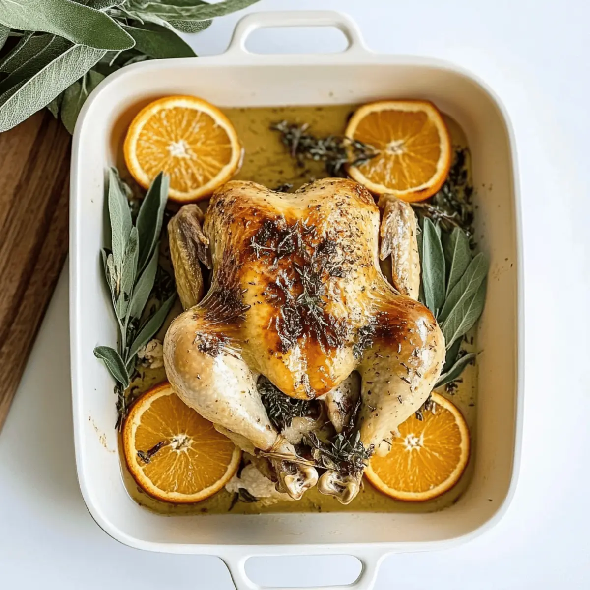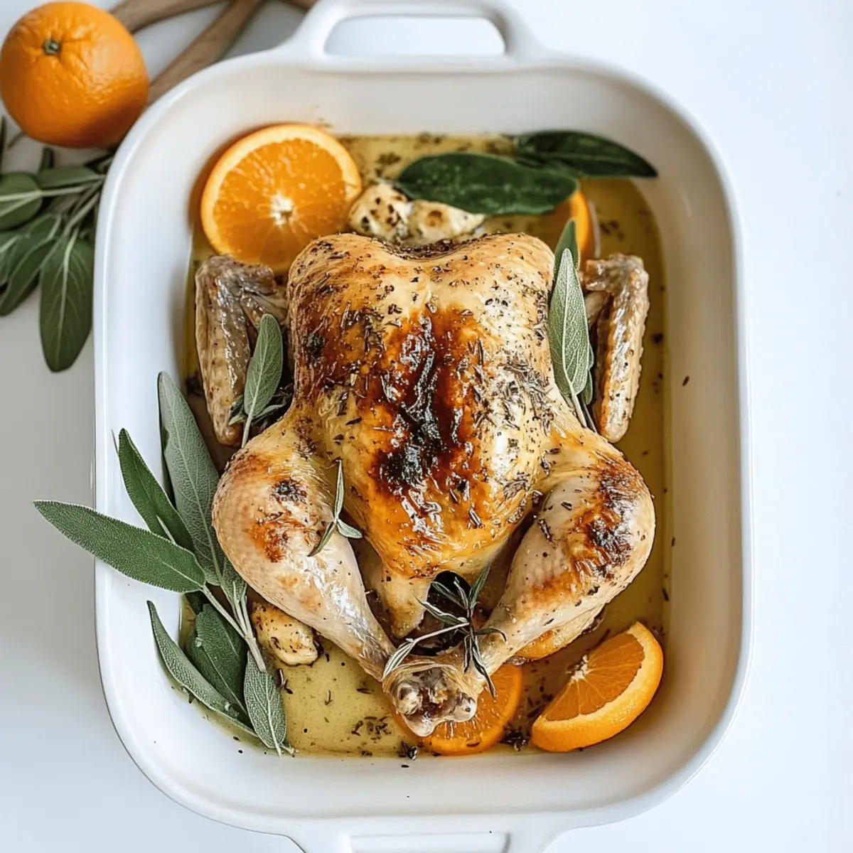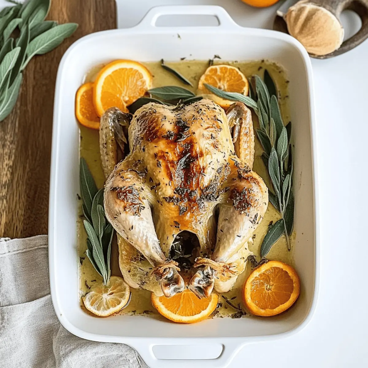 A savory aroma fills the air as I pull the Juicy Sage Orange Christmas Chicken from the oven, its golden skin glistening under the soft glow of holiday lights. This dish is not just a meal; it’s a celebration—infused with the vibrant zest of orange and fragrant herbs, it effortlessly elevates any festive gathering. What I adore most about this recipe is its simplicity; it requires minimal prep yet delivers maximum flavor with a rich, buttery pan sauce that makes my heart sing. It’s a perfect alternative to the usual turkey, creating a delicious centerpiece that leaves everyone satisfied and impressed. Curious about how to wow your guests this holiday season? Let’s dive into the magic of this incredible roast chicken! Why does this chicken steal the show? Simplicity at Its Best: This recipe requires minimal prep time, making it ideal for busy holiday seasons when you want to impress without the stress. Flavor Explosion: The combination of zesty orange, savory sage, and aromatic garlic elevates the traditional roast chicken to a new level of deliciousness. Crowd Pleaser: Perfect for festive gatherings, it guarantees happy faces around the dinner table, rivaling even classics like Honey Bourbon Chicken. Versatile: Easily adapt this dish by swapping in different citrus fruits or herbs, ensuring it fits perfectly into your seasonal menu. Buttery Sauce Magic: The rich pan sauce created during roasting is an absolute game changer—don’t forget to drizzle it over sides like creamy mashed potatoes for a full flavor experience! Sage Orange Christmas Chicken Ingredients • Discover the flavors behind this festive favorite! For the Chicken Whole Chicken (1.5 kg / 3 lb) – The star of the dish, providing delicious, juicy meat; always bring to room temperature before roasting for even cooking. Softened Butter (½ cup) – Adds richness and moisture; can substitute with olive oil for a lighter, dairy-free version. Olive Oil (2 tbsp) – Promotes browning and crisp skin; vegetable oil is a good substitute if needed. For the Herb Mixture Orange Zest (from 1 orange) – Infuses a bright, citrusy flavor; if not available, lemon zest can be used as an alternative. Lemon Zest (from 1 lemon) – Complements the orange and adds a depth of flavor; can be omitted if you prefer a simpler profile. Garlic (2 cloves, minced/crushed) – Enhances flavor with its aromatic essence; in a pinch, garlic powder can replace fresh garlic. Fresh Sage (1 tbsp, finely chopped) – Provides a fragrant herbal note essential to this chicken; dried sage may substitute at 1 tsp if fresh is not available. Fresh Thyme (2 tsp leaves) – Contributes a subtle earthiness; dried thyme works, but use about a third of the fresh amount. Salt (1 tsp) – Boosts overall flavor; adjust according to dietary preferences. Black Pepper (½ tsp) – Adds warmth and seasoning; for the best flavor, opt for freshly ground pepper. For Roasting Oranges (2, halved) – Used to infuse aroma and flavor during cooking; you can substitute with other citrus like clementines. Onion (1, quartered) – Brings sweetness and moisture; shallots provide a milder alternative. Garlic Bulbs (2, halved) – Enhances the aromatic base; pre-peeled garlic cloves can be a quick swap. Fresh Thyme Sprigs (10) – Included for roasting to enhance flavor profiles; can skip if fresh thyme leaves are already included in the mixture. Sage Leaves (6) – Optional garnish for taste and decoration; can be omitted if not on hand. For the Sauce White Wine (1 cup) – Adds acidity and depth to the pan sauce; for a non-alcoholic version, use chicken broth instead. This Sage Orange Christmas Chicken will not only satisfy your taste buds but also create an unforgettable holiday experience! Enjoy every bite! Step‑by‑Step Instructions for Sage Orange Christmas Chicken Step 1: Prepare the Butter Mixture In a mixing bowl, blend together ½ cup softened butter, the zest of one orange, zest of one lemon, two minced garlic cloves, one tablespoon finely chopped fresh sage, and two teaspoons of fresh thyme. Season generously with one teaspoon of salt and half a teaspoon of black pepper. This mixture will create a flavorful herby base for your Sage Orange Christmas Chicken, ensuring it’s succulent and aromatic. Step 2: Prepping the Chicken Let the whole chicken rest at room temperature for 45 minutes. Carefully loosen the skin over the breasts and drumsticks by gently sliding your fingers beneath it. Spread the seasoned butter mixture evenly under the skin, ensuring that the flavors deeply penetrate the meat for a rich taste. This crucial step helps keep the chicken moist while roasting. Step 3: Arrange Aromatics In a spacious roasting dish, scatter the halved oranges, quartered onion, and halved garlic bulbs. Add a few sprigs of fresh thyme and sage leaves to create a fragrant bed for roasting. This arrangement not only enhances the flavor of the chicken but also infuses the dish with delightful aromatic steam during cooking, elevating your Sage Orange Christmas Chicken to new heights. Step 4: Roasting Place the chicken on top of the aromatic layer in the roasting dish. Drizzle the chicken with two tablespoons of olive oil and generously season with salt and pepper. Pour one cup of white wine around the chicken to help create a rich, buttery pan sauce as it cooks. Prepare your oven by preheating it to 180°C (350°F) to ensure an even roast. Step 5: Oven Cooking With the oven at the right temperature, roast the chicken for 45-60 minutes. Keep an eye on it until the skin turns a beautiful golden brown and the chicken reaches an internal temperature of 72°C (165°F) in the thickest part. A meat thermometer will help ensure perfect doneness, guaranteeing that your Sage Orange Christmas Chicken is juicy and delicious. Step 6: Resting Once cooked, carefully take the roasting dish out of the oven and let the chicken rest for at least 10 minutes before carving. This resting period is es